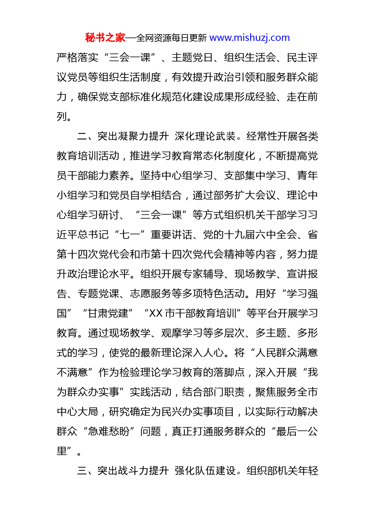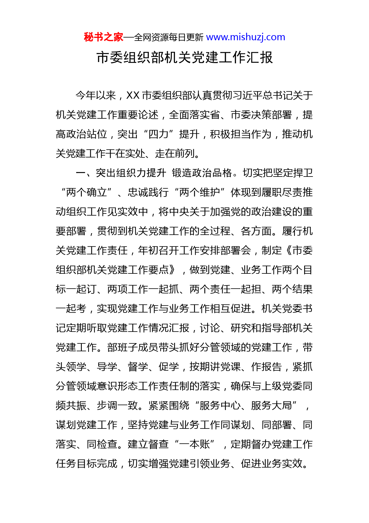 秘书之家—全网资源每日更新www.mishuzj.com市委组织部机关党建工作汇报今年以来,XX市委组织部认真贯彻习近平总书记关于机关党建工作重要论述,全面落实省、市委决策部署,提高政治站位,突出“四力”提升,积极担当作为,推动机关党建工作干在实处、走在前列。一、突出组织力提升锻造政治品格。切实把坚定捍卫“两个确立”、忠诚践行“两个维护”体现到履职尽责推动组织工作见实效中,将中央关于加强党的政治建设的重要部署,贯彻到机关党建工作的全过程、各方面。履行机关党建工作责任,年初召开工作安排部署会,制定《市委组织部机关党建工作要点》,做到党建、业务工作两个目标一起订、两项工作一起抓、两个责任一起担、两个结果一起考,实现党建工作与业务工作相互促进。机关党委书记定期听取党建工作情况汇报,讨论、研究和指导部机关党建工作。部班子成员带头抓好分管领域的党建工作,带头领学、导学、督学、促学,按期讲党课、作报告,紧抓分管领域意识形态工作责任制的落实,确保与上级党委同频共振、步调一致。紧紧围绕“服务中心、服务大局”,谋划党建工作,坚持党建与业务工作同谋划、同部署、同落实、同检查。建立督查“一本账”,定期督办党建工作任务目标完成,切实增强党建引领业务、促进业务实效。秘书之家—全网资源每日更新www.mishuzj.com严格落实“三会一课”、主题党日、组织生活会、民主评议党员等组织生活制度,有效提升政治引领和服务群众能力,确保党支部标准化规范化建设成果形成经验、走在前列。二、突出凝聚力提升深化理论武装。经常性开展各类教育培训活动,推进学习教育常态化制度化,不断提高党员干部能力素养。坚持中心组学习、支部集中学习、青年小组学习和党员自学相结合,通过部务扩大会议、理论中心组学习研讨、“三会一课”等方式组织机关干部学习习近平总书记“七一”重要讲话、党的十九届六中全会、省第十四次党代会和市第十四次党代会精神等内容,努力提升政治理论水平。组织开展专家辅导、现场教学、宣讲报告、专题党课、志愿服务等多项特色活动。用好“学习强国”“甘肃党建”“XX市干部教育培训”等平台开展学习教育。通过现场教学、观摩学习等多层次、多主题、多形式的学习,使党的最新理论深入人心。将“人民群众满意不满意”作为检验理论学习教育的落脚点,深入开展“我为群众办实事”实践活动,结合部门职责,聚焦服务全市中心大局,研究确定为民兴办实事项目,以实际行动解决群众“急难愁盼”问题,真正打通服务群众的“最后一公里”。三、突出战斗力提升强化队伍建设。组织部机关年轻秘书之家—全网资源每日更新www.mishuzj.com干部积极参加专题读书研讨、轮岗交流锻炼、下基层调研、主题演讲等活动、成立信息员队伍,推行信息工作积分制管理,扎实开展“岗位练兵”活动,锻炼组工干部调查研究、综合研判的能力,提升组工干部分析和解决问题的本领。依托“XX组工”平台,以视频、文字、图片等形式,定期推送党建知识,引导组工干部读原著、学原文、悟原理,不断锤炼组工干部政治品格和党性修养,全力锻造业务过硬组工干部队伍,激发组工干部干事创业的工作热情。坚持将纪律挺在前面,强化政治监督,常态化开展廉政警示教育,引导机关干部做到八小时之外严把生活圈、社交圈,严格遵守组织纪律和保密纪律,时刻以纪律规矩规范自身言行,树立组工干部良好形象。四、突出执行力提升推进工作落实。紧紧围绕中心、服务大局,与业务工作融合互促,做到业务工作推进到哪里,机关党建工作就跟进到哪里。在社区全覆盖组建“社工委”,挖掘整合辖区内机关企事业单位、“两代表一委员”、居民群众等多元主体的优势资源以及社会工作机构的专业资源,为社区居民提供法律援助、扶老济困、课后托管、健康义诊等精细化服务。组织机关干部到居住地社区常态化驻守,深入疫情防控一线、深入基层群众,守牢社区疫情防控安全防线,帮助解决群众急难愁盼问题。从教育培训上促进干部善于攻坚,坚定落实市委“用项目训秘书之家—全网资源每日更新www.mishuzj.com练干部”要求,把项目作为课题,把一线作为课堂,通过实战化培训提升干部攻坚能力。注重在疫情防控、项目建设、产业发展等重大斗争一线、重大任务实践中发现识别敢于担当、勇于攻坚的干部。实施农业专家结对帮扶、医疗专家“组团式”服务、名师“送教下乡”、“青年人才走基层”等实事项目,从全市领军人才、首席专家、青年专家中选派农业、医疗、教育等领域专家人才组成服务团,深入田间地头和基层生产一线开展政策宣讲、技术指导、技能培训、项目申报和村庄规划咨询等服务,办成了一批群众欢迎的实事好事。