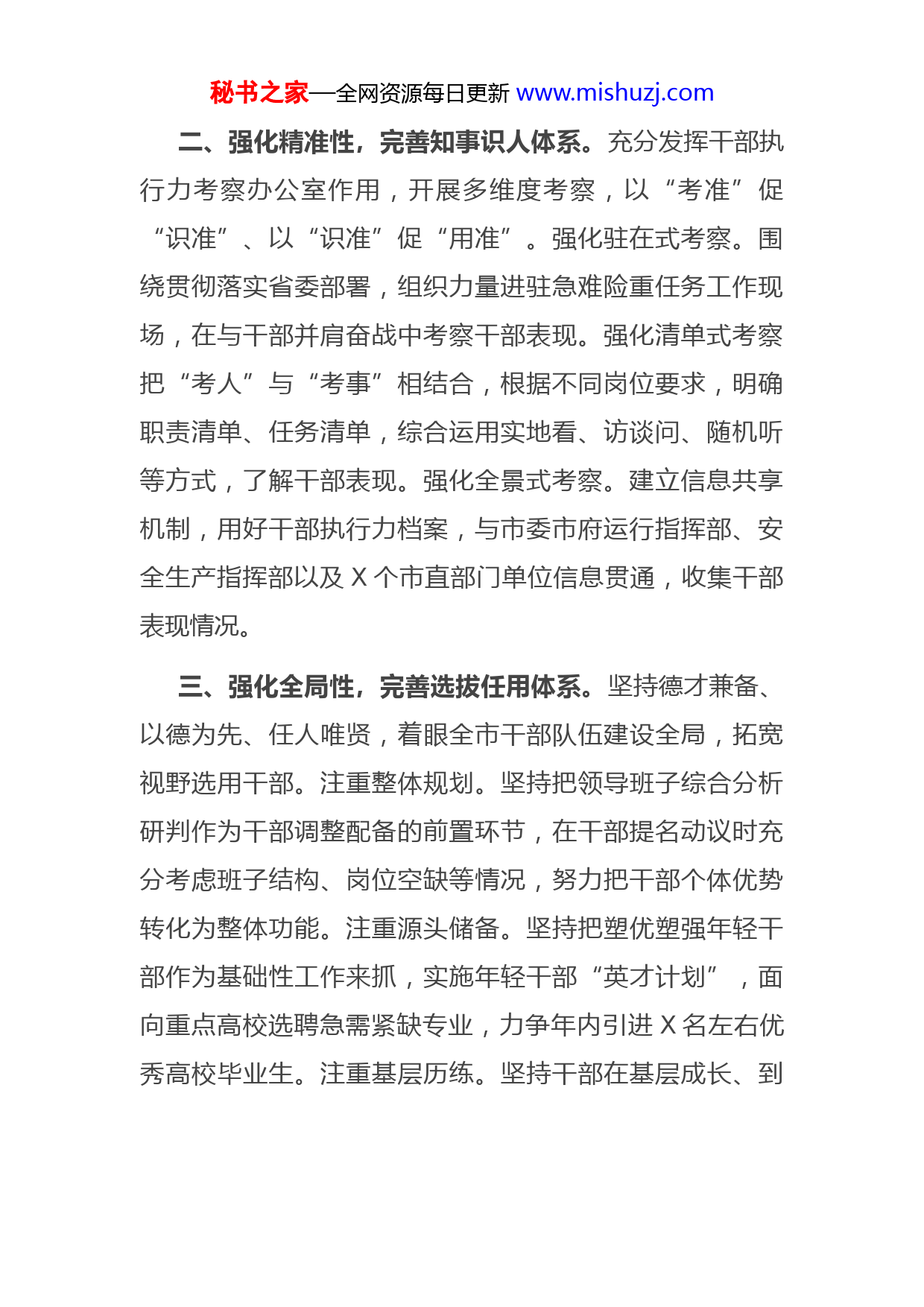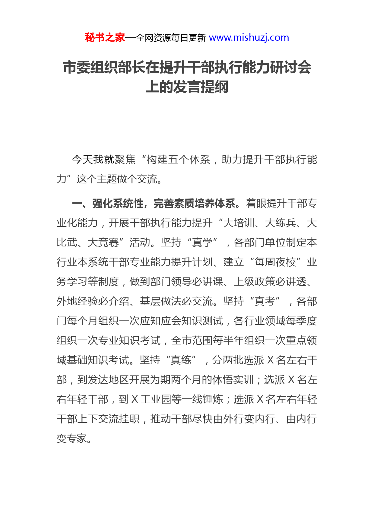 秘书之家—全网资源每日更新www.mishuzj.com市委组织部长在提升干部执行能力研讨会上的发言提纲今天我就聚焦“构建五个体系,助力提升干部执行能力”这个主题做个交流。一、强化系统性,完善素质培养体系。着眼提升干部专业化能力,开展干部执行能力提升“大培训、大练兵、大比武、大竞赛”活动。坚持“真学”,各部门单位制定本行业本系统干部专业能力提升计划、建立“每周夜校”业务学习等制度,做到部门领导必讲课、上级政策必讲透、外地经验必介绍、基层做法必交流。坚持“真考”,各部门每个月组织一次应知应会知识测试,各行业领域每季度组织一次专业知识考试,全市范围每半年组织一次重点领域基础知识考试。坚持“真练”,分两批选派X名左右干部,到发达地区开展为期两个月的体悟实训;选派X名左右年轻干部,到X工业园等一线锤炼;选派X名左右年轻干部上下交流挂职,推动干部尽快由外行变内行、由内行变专家。秘书之家—全网资源每日更新www.mishuzj.com二、强化精准性,完善知事识人体系。充分发挥干部执行力考察办公室作用,开展多维度考察,以“考准”促“识准”、以“识准”促“用准”。强化驻在式考察。围绕贯彻落实省委部署,组织力量进驻急难险重任务工作现场,在与干部并肩奋战中考察干部表现。强化清单式考察把“考人”与“考事”相结合,根据不同岗位要求,明确职责清单、任务清单,综合运用实地看、访谈问、随机听等方式,了解干部表现。强化全景式考察。建立信息共享机制,用好干部执行力档案,与市委市府运行指挥部、安全生产指挥部以及X个市直部门单位信息贯通,收集干部表现情况。三、强化全局性,完善选拔任用体系。坚持德才兼备、以德为先、任人唯贤,着眼全市干部队伍建设全局,拓宽视野选用干部。注重整体规划。坚持把领导班子综合分析研判作为干部调整配备的前置环节,在干部提名动议时充分考虑班子结构、岗位空缺等情况,努力把干部个体优势转化为整体功能。注重源头储备。坚持把塑优塑强年轻干部作为基础性工作来抓,实施年轻干部“英才计划”,面向重点高校选聘急需紧缺专业,力争年内引进X名左右优秀高校毕业生。注重基层历练。坚持干部在基层成长、到秘书之家—全网资源每日更新www.mishuzj.com基层培养、从基层选拔,把在基层踏实干事、经受考验、取得实绩的优秀干部,及时发现出来、合理使用起来。四、强化纪律性,完善从严管理体系。坚持严的主基调不动摇,从严从实加强领导班子和干部队伍监督管理。从严加强干部日常监督。认真落实“凡提四必”等制度,做到选人用人工作全程纪实。利用大数据手段管理干部档案提高干部信息精准度。从严加强关键节点监督。盯紧干部个人有关事项报告查核一致率,压紧压实分管领导、政工科长和干部本人责任。根据上级统一安排,对过去五年未查核过的干部全部核查一遍。从严用好监督成果。研究建立推动干部“能上能下”的具体措施,打通“下”的渠道对不担当、不作为、乱作为带来严重负面影响的干部,坚决予以调整,推动干部在其位、尽其责。五、强化导向性,完善正向激励体系。牢固树立实践实干实绩的选人用人导向,采取务实管用措施,激励干部提升执行力、狠抓工作落实。强化用人导向的激励作用。对任劳任怨、扛重活、打硬仗的干部,敢于善于斗争、积极应对风险挑战的干部,及时发现、大胆使用,以鲜明用人导向激励干部担当作为、创新实干。强化执行力考察的激励作用。把执行力考察结果与干部考核奖惩、职级晋升、选拔任用紧密挂钩,对执行成效明显的单位和个人进行组秘书之家—全网资源每日更新www.mishuzj.com织表彰奖励。强化综合考核的激励作用。严格执行“高质量发展承诺书考核奖惩办法”,对区市实行年度考核、“三年算总账”,对市直部门“一年一算账”,从综合考核、评先树优等方面,建立真奖真罚具体措施,真正考出精气神、考出执行力。“口头表态一千遍,不如实际做一次”,通过打造五个体系,不断提升干部执行力,为推动社会发展建设注入强劲动力,以优异成绩迎接党的二十大胜利召开。
