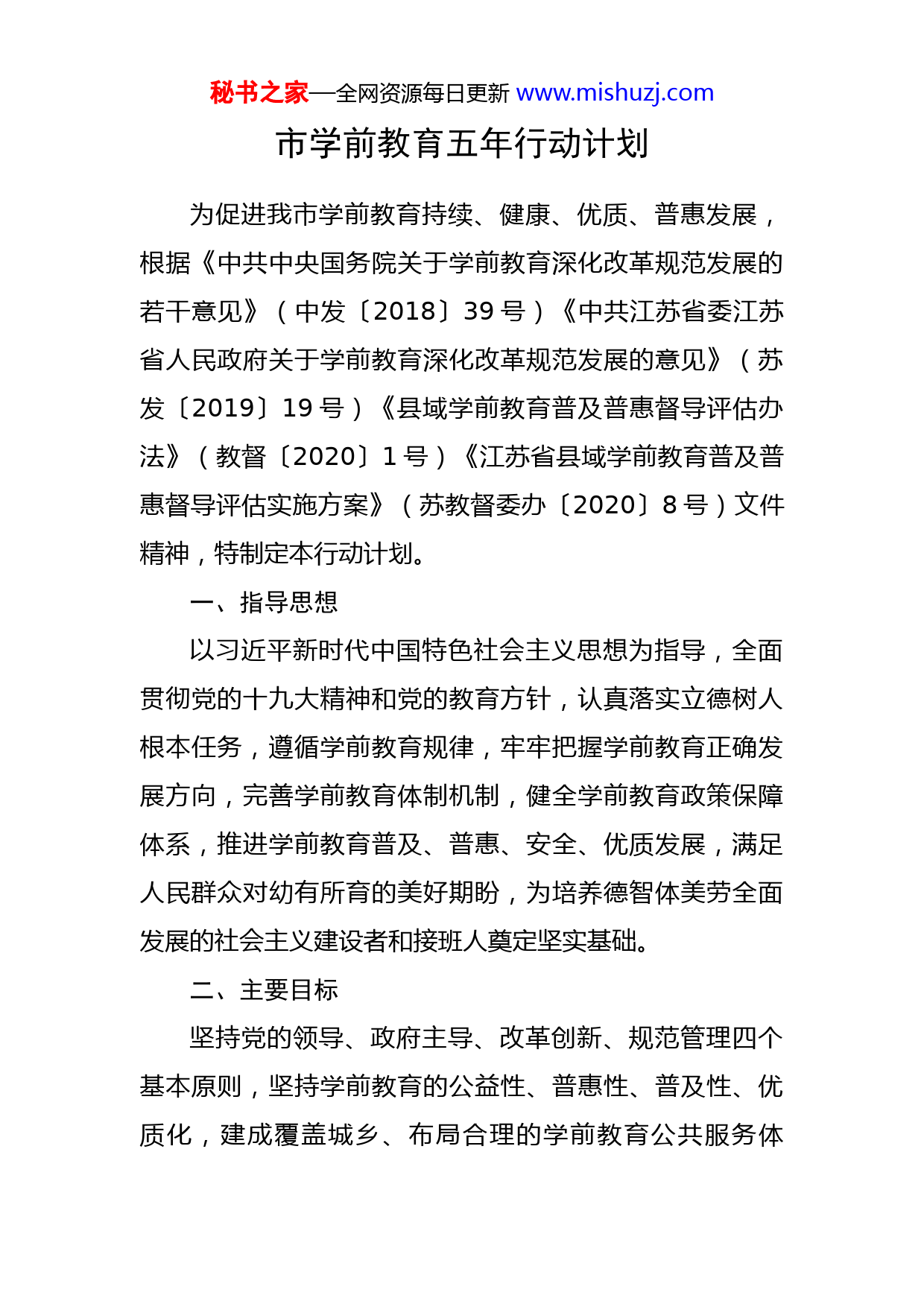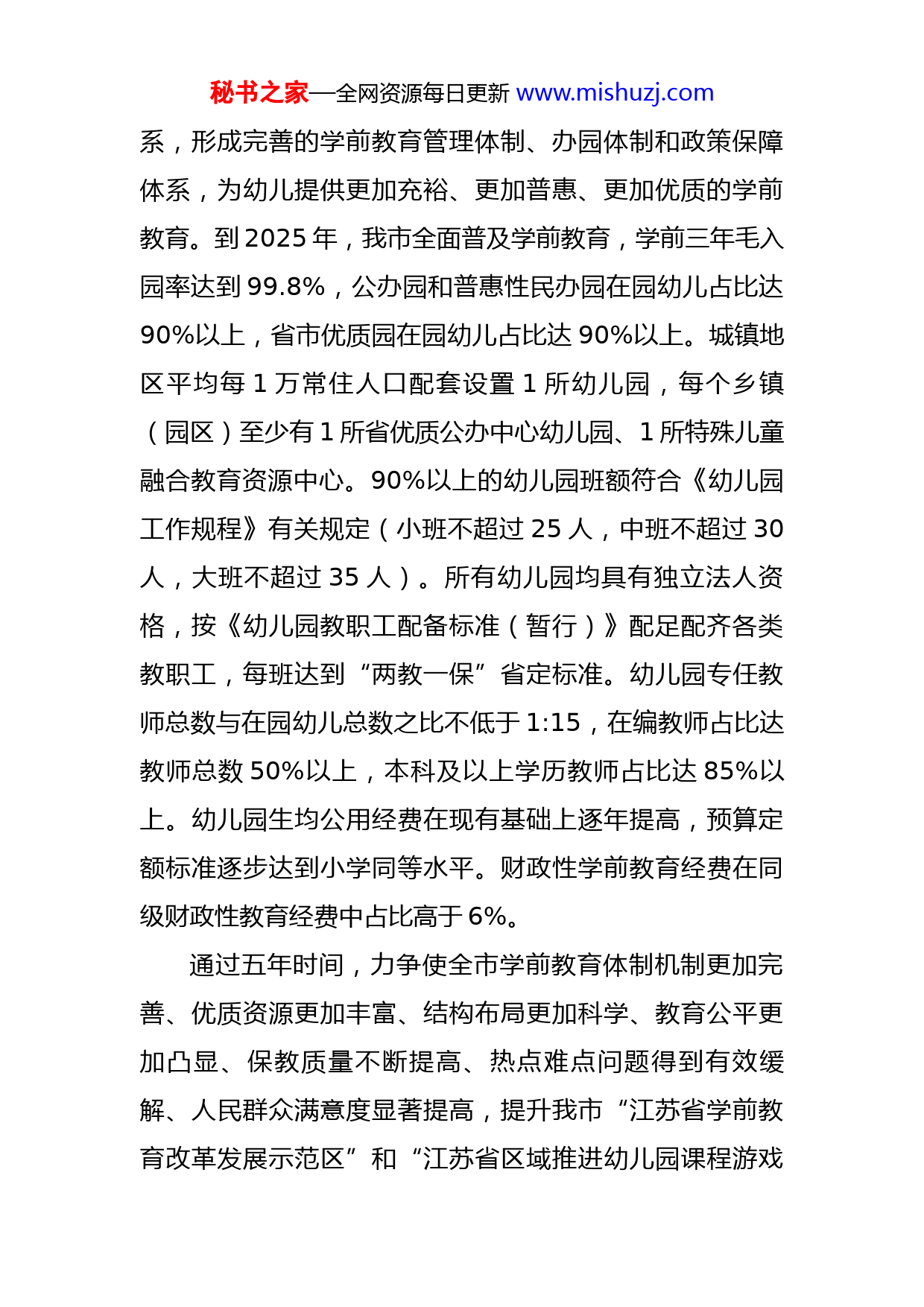 秘书之家—全网资源每日更新www.mishuzj.com市学前教育五年行动计划为促进我市学前教育持续、健康、优质、普惠发展,根据《中共中央国务院关于学前教育深化改革规范发展的若干意见》(中发〔2018〕39号)《中共江苏省委江苏省人民政府关于学前教育深化改革规范发展的意见》(苏发〔2019〕19号)《县域学前教育普及普惠督导评估办法》(教督〔2020〕1号)《江苏省县域学前教育普及普惠督导评估实施方案》(苏教督委办〔2020〕8号)文件精神,特制定本行动计划。一、指导思想以习近平新时代中国特色社会主义思想为指导,全面贯彻党的十九大精神和党的教育方针,认真落实立德树人根本任务,遵循学前教育规律,牢牢把握学前教育正确发展方向,完善学前教育体制机制,健全学前教育政策保障体系,推进学前教育普及、普惠、安全、优质发展,满足人民群众对幼有所育的美好期盼,为培养德智体美劳全面发展的社会主义建设者和接班人奠定坚实基础。二、主要目标坚持党的领导、政府主导、改革创新、规范管理四个基本原则,坚持学前教育的公益性、普惠性、普及性、优质化,建成覆盖城乡、布局合理的学前教育公共服务体秘书之家—全网资源每日更新www.mishuzj.com系,形成完善的学前教育管理体制、办园体制和政策保障体系,为幼儿提供更加充裕、更加普惠、更加优质的学前教育。到2025年,我市全面普及学前教育,学前三年毛入园率达到99.8%,公办园和普惠性民办园在园幼儿占比达90%以上,省市优质园在园幼儿占比达90%以上。城镇地区平均每1万常住人口配套设置1所幼儿园,每个乡镇(园区)至少有1所省优质公办中心幼儿园、1所特殊儿童融合教育资源中心。90%以上的幼儿园班额符合《幼儿园工作规程》有关规定(小班不超过25人,中班不超过30人,大班不超过35人)。所有幼儿园均具有独立法人资格,按《幼儿园教职工配备标准(暂行)》配足配齐各类教职工,每班达到“两教一保”省定标准。幼儿园专任教师总数与在园幼儿总数之比不低于1:15,在编教师占比达教师总数50%以上,本科及以上学历教师占比达85%以上。幼儿园生均公用经费在现有基础上逐年提高,预算定额标准逐步达到小学同等水平。财政性学前教育经费在同级财政性教育经费中占比高于6%。通过五年时间,力争使全市学前教育体制机制更加完善、优质资源更加丰富、结构布局更加科学、教育公平更加凸显、保教质量不断提高、热点难点问题得到有效缓解、人民群众满意度显著提高,提升我市“江苏省学前教育改革发展示范区”和“江苏省区域推进幼儿园课程游戏秘书之家—全网资源每日更新www.mishuzj.com化建设”的品牌影响力,创成国家“学前教育普及普惠县”,真正办人民群众满意的高邮学前教育。三、主要措施(一)健全学前教育管理体制1.加强党的领导,做好顶层设计。全面加强党对学前教育事业的领导,按照管党建与管业务相结合的原则,市委教育工作领导小组和教育行政部门党组织统一领导和指导幼儿园党建工作。认真落实全面从严治党要求,实现幼儿园党的组织和党的工作全覆盖。充分发挥幼儿园党组织作用,保障正确办园方向,认真做好教职工思想政治工作,厚植立德树人基础。完善学前教育联席会议制度,定期研究、统筹指导、协调推进学前教育改革发展重点工作,为城乡居民提供充足、均衡、普惠、健康的学前教育基本公共服务。2.健全以市为主、市镇共管体制。进一步落实市政府对学前教育发展的主体责任,全面负责制定学前教育发展规划和幼儿园布局、公办园建设、教师编制管理、教育经费落实,面向各类幼儿园进行监督管理,在土地划拨等方面对幼儿园予以优惠和支持,确保学前教育规范有序健康发展。在系统构建学前教育公共管理体系的基础上,重点推动各乡镇(园区)落实辖区内幼儿园硬件建设、运行保障、规范管理、安全防护等方面的相应责任,确保各乡镇秘书之家—全网资源每日更新www.mishuzj.com(园区)把学前教育发展摆上重要议事日程,结合地方实际制订工作目标,落实工作职责,细化工作方案。3.完善部门联动、协调共管机制。健全教育行政部门主管、有关部门分工负责的管理体制和工作机制,明晰各成员单位责任要求,强化责任落实。教育行政部门要完善政策,制定标准,加强学前教育的科学指导和监督管理;编制部门要结合实际合理核定公办园教职工编制;发展和改革部门要把学前教育纳入当地经济社会发展规划,支持幼儿园建设发展;财政部门要完善财政支持政策,支持扩大普惠性学前教育资源;自然资源和规划、住房和城乡建设等部门要将城镇小区配套幼儿园建设用地及时纳入相关规划,会同教育行政部门加强对配套幼儿园的建设、联合验收、移交等环节的监管落实;人力资源社会保障部门要制定完善幼儿园教职工人事(劳动)、工资待遇、社会保障和职称评聘政策;价格、财政、教育行政部门要根据职责分工,加强幼儿园收费管理;卫生健康、市场监管部门要监督指导幼儿园卫生保健、食堂安全工作;公安、司法等政法机关和有关部门要进一步加强幼儿园安全保卫工作的指导,依法严厉打击侵害幼儿人身安全的违法犯罪行为,推动幼儿园及周边社会治安综合治理。4.健全质量评估、督导问责机制。把学前教育五年行动计划的推进落实情况纳入对各乡镇(园区)的高质量发