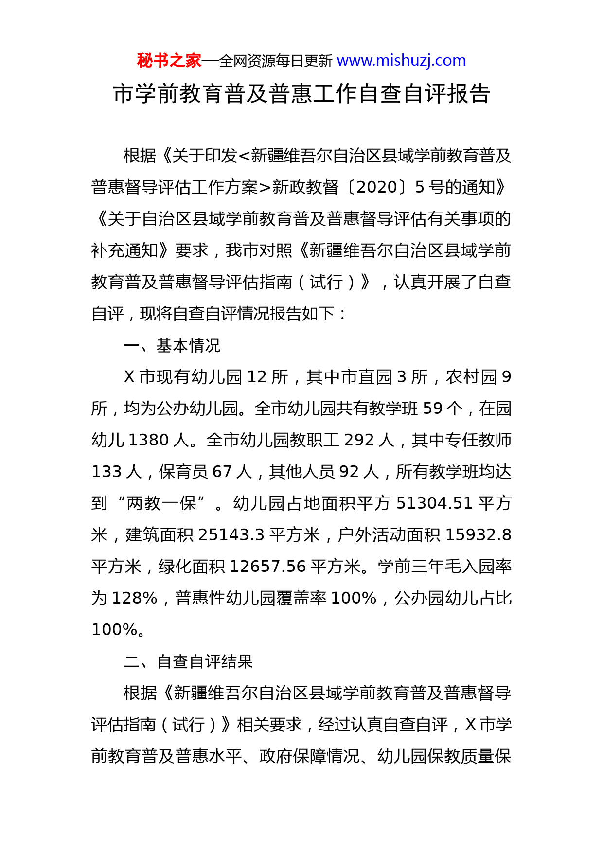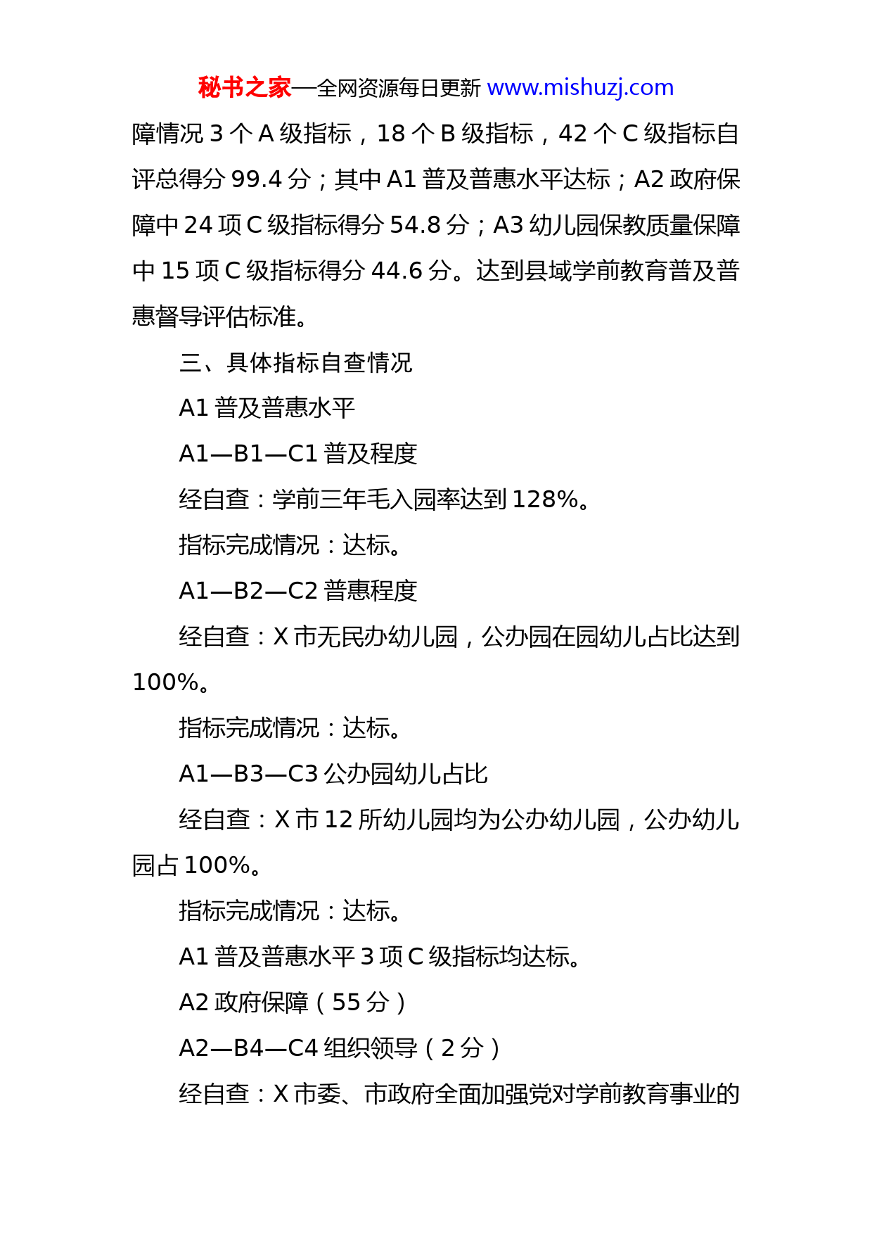 秘书之家—全网资源每日更新www.mishuzj.com市学前教育普及普惠工作自查自评报告根据《关于印发<新疆维吾尔自治区县域学前教育普及普惠督导评估工作方案>新政教督〔2020〕5号的通知》《关于自治区县域学前教育普及普惠督导评估有关事项的补充通知》要求,我市对照《新疆维吾尔自治区县域学前教育普及普惠督导评估指南(试行)》,认真开展了自查自评,现将自查自评情况报告如下:一、基本情况X市现有幼儿园12所,其中市直园3所,农村园9所,均为公办幼儿园。全市幼儿园共有教学班59个,在园幼儿1380人。全市幼儿园教职工292人,其中专任教师133人,保育员67人,其他人员92人,所有教学班均达到“两教一保”。幼儿园占地面积平方51304.51平方米,建筑面积25143.3平方米,户外活动面积15932.8平方米,绿化面积12657.56平方米。学前三年毛入园率为128%,普惠性幼儿园覆盖率100%,公办园幼儿占比100%。二、自查自评结果根据《新疆维吾尔自治区县域学前教育普及普惠督导评估指南(试行)》相关要求,经过认真自查自评,X市学前教育普及普惠水平、政府保障情况、幼儿园保教质量保秘书之家—全网资源每日更新www.mishuzj.com障情况3个A级指标,18个B级指标,42个C级指标自评总得分99.4分;其中A1普及普惠水平达标;A2政府保障中24项C级指标得分54.8分;A3幼儿园保教质量保障中15项C级指标得分44.6分。达到县域学前教育普及普惠督导评估标准。三、具体指标自查情况A1普及普惠水平A1—B1—C1普及程度经自查:学前三年毛入园率达到128%。指标完成情况:达标。A1—B2—C2普惠程度经自查:X市无民办幼儿园,公办园在园幼儿占比达到100%。指标完成情况:达标。A1—B3—C3公办园幼儿占比经自查:X市12所幼儿园均为公办幼儿园,公办幼儿园占100%。指标完成情况:达标。A1普及普惠水平3项C级指标均达标。A2政府保障(55分)A2—B4—C4组织领导(2分)经自查:X市委、市政府全面加强党对学前教育事业的秘书之家—全网资源每日更新www.mishuzj.com领导,出台《进一步加强和改进中小学校党建工作的实施方案》(霍市教党发【2020】4号文件),按照管党建与管业务相结合的原则,同安排同部署。落实党委政府领导包联学校制度,指导幼儿园党建工作。每年召开1次教育会议,研究部署教育工作,每季度对幼儿园党建工作进行指导检查。指标赋分:2分,此项得分:2分。A2—B4—C5党组织覆盖(2分)经自查:认真落实《关于加强中小学校党的建设工作的意见》,出台《关于调整中小学校党组织隶属关系及党员组织关系划转工作的通知》(霍市党组发【2018】66号)、《进一步加强和改进中小学校党建工作的实施方案》(霍市教党发【2020】4号)。目前,X市幼儿园共建立党支部6个,其中3个农村园党支部覆盖所负责的村办园点。12所幼儿园党的组织和党的工作实现全覆盖。高度重视党员发展,把党员发展纳入计划,严格落实“成熟一个,发展一个”的要求。2022年,幼儿园共发展党员8人。指标赋分:2分,此项得分:2分。A2—B4—C6幼儿园党建工作(2分)经自查:X市充分发挥幼儿园党组织领导核心作用,坚持党组织领导的园长负责制,坚持社会主义办园方向,落秘书之家—全网资源每日更新www.mishuzj.com实立德树人根本任务,将党组织建设纳入幼儿园章程,严格落实“三会一课”制度,常态化开展“5+X”工作,常态化开展“两学一做”,认真做好教职工思想政治工作,厚植立德树人基础。指标赋分:2分,此项得分:2分。A2—B5—C7责任落实(2分)经自查:X市将学前教育发展纳入“十四五”教育发展规划,制定了《X市学前教育三年发展规划(2023-2025年)》《X市学前教育普及普惠督导评估实施方案(2021-2023年)》,成立由政府主要领导任组长,分管领导任副组长,教育、发改、财政等行业部门为成员的学前教育普及普惠工作领导小组,形成了政府牵头抓总,部门密切配合,齐抓共管的良好工作机制。指标赋分:2分,此项得分:2分。A2—B5—C8布局规划(2分)经自查:我市能够根据人口变化和城乡发展趋势,科学制定幼儿园布局规划,出台了《X幼儿园布局规划实施方案(2023-2025年)》,并将幼儿园建设纳入城乡公共管理和公共服务设施统一规划,依据幼儿园建设布局规划,制定了推进普惠性幼儿园建设年度工作计划。目前新建小区配套幼儿园5所,其中2所幼儿园投入使用,有效解决了城区幼儿“入园难”问题,确保适龄儿童有学上。秘书之家—全网资源每日更新www.mishuzj.com指标赋分:2分,此项得分:2分。A2—B6—C9农村园建设(2分)经自查:2017年,根据自治区农村幼儿园“应建尽建”要求,1个乡场14个村(社区)新建、改扩建农村幼儿园13所,其中3所中心园,10所村级园。2022年因生源较少,经布局调整,关闭4所村级园。目前有3所中心园、6所村级园,做到了“应入尽入”。指标赋分:2分,此项得分:2分。A2—B7—C10配套园建设(3分)经自查:根据《关于印发自治区城镇小区配套幼儿园专项治理工作方案的通知》(新政办发〔2019〕45号)要求,X市严格落实新建小区依标配建幼儿园,做到了小区配套幼儿园与居民住宅区同步规划、同步设计、同步建设、同步验收、同步交付使用。目前,X市新建小区配套幼儿园5所全部完工,其中2所已投入使用。指标赋分:3分,此项得分:3分。A2—B7—C11配套园监管(3分)经自查:X市制定了《关于印发的通知》,落实小区配套幼儿园的监管制度,教育、财政、民政、发改等部门加强了对小区配
