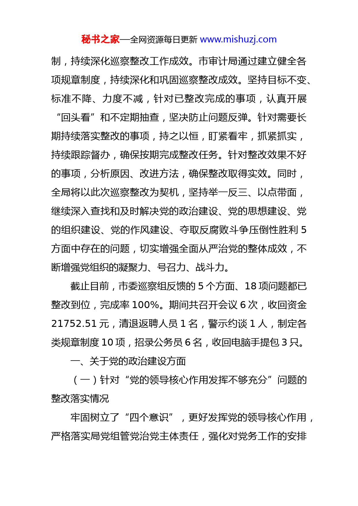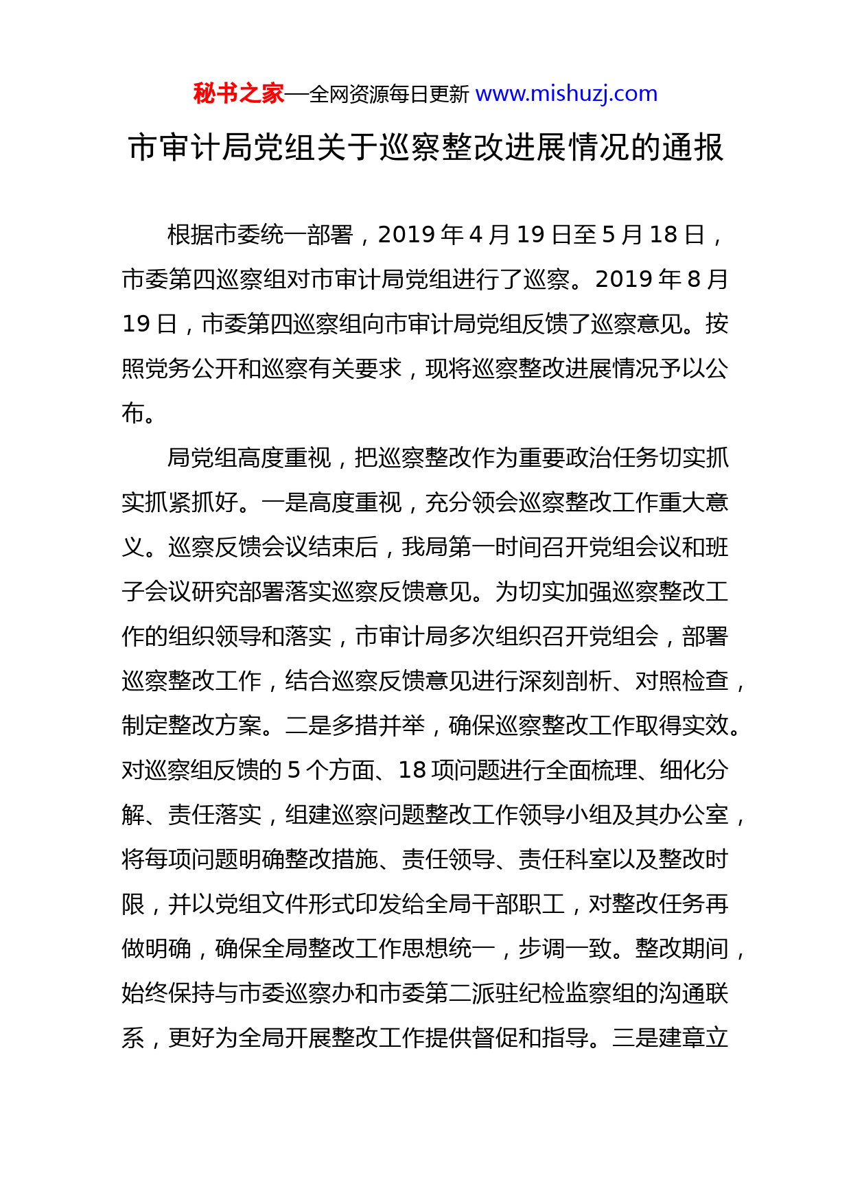 秘书之家—全网资源每日更新www.mishuzj.com市审计局党组关于巡察整改进展情况的通报根据市委统一部署,2019年4月19日至5月18日,市委第四巡察组对市审计局党组进行了巡察。2019年8月19日,市委第四巡察组向市审计局党组反馈了巡察意见。按照党务公开和巡察有关要求,现将巡察整改进展情况予以公布。局党组高度重视,把巡察整改作为重要政治任务切实抓实抓紧抓好。一是高度重视,充分领会巡察整改工作重大意义。巡察反馈会议结束后,我局第一时间召开党组会议和班子会议研究部署落实巡察反馈意见。为切实加强巡察整改工作的组织领导和落实,市审计局多次组织召开党组会,部署巡察整改工作,结合巡察反馈意见进行深刻剖析、对照检查,制定整改方案。二是多措并举,确保巡察整改工作取得实效。对巡察组反馈的5个方面、18项问题进行全面梳理、细化分解、责任落实,组建巡察问题整改工作领导小组及其办公室,将每项问题明确整改措施、责任领导、责任科室以及整改时限,并以党组文件形式印发给全局干部职工,对整改任务再做明确,确保全局整改工作思想统一,步调一致。整改期间,始终保持与市委巡察办和市委第二派驻纪检监察组的沟通联系,更好为全局开展整改工作提供督促和指导。三是建章立秘书之家—全网资源每日更新www.mishuzj.com制,持续深化巡察整改工作成效。市审计局通过建立健全各项规章制度,持续深化和巩固巡察整改成效。坚持目标不变、标准不降、力度不减,针对已整改完成的事项,认真开展“回头看”和不定期抽查,坚决防止问题反弹。针对需要长期持续落实整改的事项,持之以恒,盯紧看牢,抓紧抓实,持续跟踪督办,确保按期完成整改任务。针对整改效果不好的事项,分析原因、改进方法,确保整改取得实效。同时,全局将以此次巡察整改为契机,坚持举一反三、以点带面,继续深入查找和及时解决党的政治建设、党的思想建设、党的组织建设、党的作风建设、夺取反腐败斗争压倒性胜利5方面中存在的问题,切实增强全面从严治党的整体成效,不断增强党组织的凝聚力、号召力、战斗力。截止目前,市委巡察组反馈的5个方面、18项问题都已整改到位,完成率100%。期间共召开会议6次,收回资金21752.51元,清退返聘人员1名,警示约谈1人,制定各类规章制度10项,招录公务员6名,收回电脑手提包3只。一、关于党的政治建设方面(一)针对“党的领导核心作用发挥不够充分”问题的整改落实情况牢固树立了“四个意识”,更好发挥党的领导核心作用,严格落实局党组管党治党主体责任,强化对党务工作的安排秘书之家—全网资源每日更新www.mishuzj.com部署,明确局党组会和局长办公会的界限,严格执行党组议事制度,杜绝了以局长办公会代替党组会议现象。根据研究事项确定会议组织形式,按照组织原则和议事决策规定,组织安排决策程序、表决形式、参加人员、列席人员等。规范了人事变动会议形式,凡涉及研究人事变动事项的,严格按照要求召开局党组会或党组(扩大)会研究。(二)针对“没有严格落实资金层级管理制度”问题的整改落实情况2019年5月重新制定了《温岭市审计局财务管理制度》,规定了凡一次性开支在1万元(含1万元)以上的(不含正常性开支),以及福利发放、集体疗休养、编外人员奖励等经费支出,需经局长办公会议集体讨论决定后方可启动购买或发放,由分管财务局领导签批。(三)针对“没有严格执行中层干部任职调整有关规定”问题的整改落实情况局党组已于2019年5月20日召开党组(扩大)会,根据《三定方案》中各科室职能以及按照各中层人员的实际职责分工,作了全面调整。并于2019年5月22日,进行发文明确,再作强调。(四)针对“班子分工没有及时发文明确”问题的整改落实情况秘书之家—全网资源每日更新www.mishuzj.com局党组已于2019年7月1日根据局班子分工情况,进行发文明确。(五)针对“会议记录不规范”问题的整改落实情况根据会议性质不同,已落实专人分开记录会议内容。二、关于党的思想建设方面(一)针对“思想政治工作认识不够到位”问题的整改落实情况已通过充分了解审计干部思想政治状况,准确把握审计干部政治思想动态,深刻分析导致部分审计干部思想政治工作认识不到位产生的原因,并有针对性地加强思想政治理论教育,切实提升审计干部队伍思想政治水平。对外出审计人员要求通过成立临时党支部或学习小组,按照局年度学习计划,进行思想政治理论学习。(二)针对“思想教育手段方法不够丰富,学习形式单一,党组织对年轻干部吸引力不强”问题的整改落实情况已通过创新工作方法,借鉴好的工作经验,丰富了学习内容和形式,提升了党员干部的积极性和主动性,党组织已开展对部分非党员干部开展谈心谈话,并对如何开展形式多样的思想教育征求意见,提升组织吸引力。(三)针对“意识形态工作较为薄弱”问题的整改落实情况秘书之家—全网资源每日更新www.mishuzj.com积极传达上级关于意识形态会议精神,通过召开意识形态安全专题学习会,落实会议精神,开展意识形态和社会舆情专题分析,总结当年意识形态工作,部署下一年意识形态工作。根据市委要求,已制定党组理论中心组年度学习计划,并严格执行学习计划,积极开展形式多样的集体研讨交流,每次学习做好记录,完善台账资料。日常抓好监督管理,