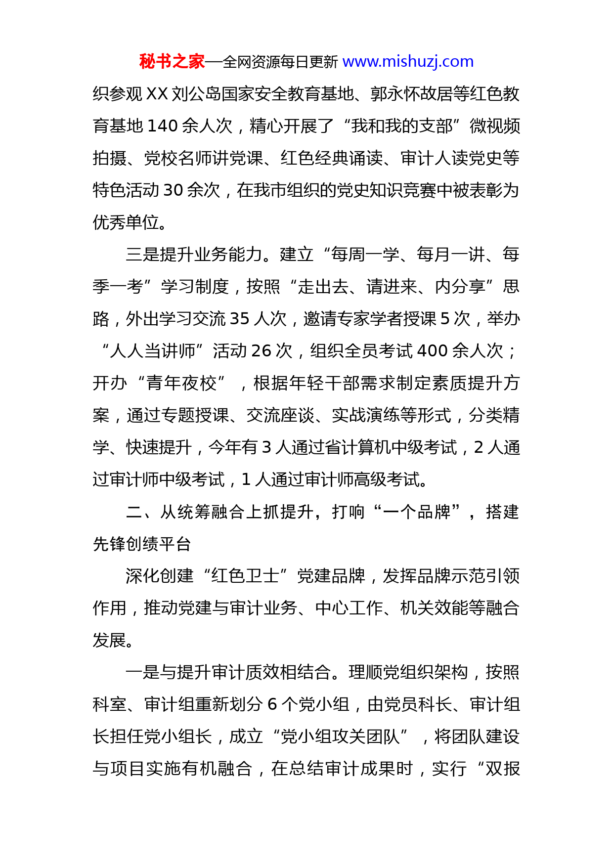 秘书之家—全网资源每日更新www.mishuzj.com市审计局搭建“三平台”锤炼高素质专业化审计队伍特色党建交流汇报市审计局党总支坚持以党建领航,紧扣“机关党建提升年”标准要求,积极探索聚焦“三个一”、搭建“三平台”的党员教育管理模式,锤炼高素质、专业化的审计干部队伍,为服务全市经济社会发展大局蓄足后劲,先后获评“全国审计机关先进集体”、“XX市先进基层党组织”等荣誉称号。一、从素质能力上抓提升,突出“一条主线”,搭建学习交流平台以建设“学习型党组织”为主线,不断提升党员干部政治素养和业务水平。一是唤醒初心意识。编印《党员知识手册》,人手一册,强化党员身份认同;加强党建阵地建设,打造集审计发展史、审计大事记、业绩荣誉、多媒体、图书阅读五大板块于一体的党建活动室,集党建、廉政、文明、法制、业务于一体的理念文化走廊,以软硬件升级提振审计干部使命感。二是强化理论武装。依托中心组学习、“三会一课”、主题党日等载体平台,组织党员干部开展政治理论学习50余次,同时创新自选动作,结合党史学习教育,组秘书之家—全网资源每日更新www.mishuzj.com织参观XX刘公岛国家安全教育基地、郭永怀故居等红色教育基地140余人次,精心开展了“我和我的支部”微视频拍摄、党校名师讲党课、红色经典诵读、审计人读党史等特色活动30余次,在我市组织的党史知识竞赛中被表彰为优秀单位。三是提升业务能力。建立“每周一学、每月一讲、每季一考”学习制度,按照“走出去、请进来、内分享”思路,外出学习交流35人次,邀请专家学者授课5次,举办“人人当讲师”活动26次,组织全员考试400余人次;开办“青年夜校”,根据年轻干部需求制定素质提升方案,通过专题授课、交流座谈、实战演练等形式,分类精学、快速提升,今年有3人通过省计算机中级考试,2人通过审计师中级考试,1人通过审计师高级考试。二、从统筹融合上抓提升,打响“一个品牌”,搭建先锋创绩平台深化创建“红色卫士”党建品牌,发挥品牌示范引领作用,推动党建与审计业务、中心工作、机关效能等融合发展。一是与提升审计质效相结合。理顺党组织架构,按照科室、审计组重新划分6个党小组,由党员科长、审计组长担任党小组长,成立“党小组攻关团队”,将团队建设与项目实施有机融合,在总结审计成果时,实行“双报秘书之家—全网资源每日更新www.mishuzj.com告”制度,将业务工作与党建工作一起总结、一起汇报,助推审计项目质效不断提升。近三年来,获评XX市级以上优秀审计项目6个。二是与推进重点工作相结合。将年度重点工作、比学赶超计划、改革创新事项、督查审计整改等,全部建立台账,责任到人,量化到岗。党员干部带头认领清单,带头公开承诺,带头推进落实,通过看板、公示栏等形式及时公开公示。在党员先锋引领下,全局亮点工作频现,完成审计项目20多个,揭示问题200多个,推进建立长效机制10多个,促进增收节支4亿多元。三是与服务中心工作相结合。围绕帮扶村、社区共建等工作,鼓励党员干部在深入基层、开展活动中接受党性教育,强化党性锻炼。今年以来,组织党员干部为社区、企业帮办实事15件,开展文明城市你我共创、民法典宣传、清理海滩垃圾、益路童行、情暖消防等志愿服务活动20余次,募集“慈心一日捐”善款2万元,营造了崇德向善的良好氛围。三、从考核激励上抓提升,用好“一把尺子”,搭建监督管理平台以强化党员动态管理为出发点,充分发挥考核“刻度尺”作用,最大限度调动党员干部干事创业积极性。一是建立全员绩效考核机制。结合上级业务主管部门秘书之家—全网资源每日更新www.mishuzj.com和市委、市政府的单项考核,将优秀项目、计算机应用、信息宣传、内审、统计、机关管理等单项纳入综合考核,每季度综合考核排名通报,考核结果与评先选优、绩效工资、职称评定、岗位调整挂钩。去年以来,根据考核结果调整交流干部3人,提拔重用5人,形成“以实绩论英雄”的工作导向。二是实行党员量化积分管理。出台党员管理考核办法,从党内组织生活、担当有为、遵规守纪三个层面量化赋分,设立“党员先锋岗”,每季度通报排名,评选4名优秀党员张榜公示;建立党员干部诚信档案,进行诚信等级累计赋分,设立“信用先锋岗”,每月通报,对信用积分位居前10%的,张榜公示,并颁发证书。今年累计公示先锋党员15人,带动形成对标先进、争先创优的良好氛围。三是用好监督执纪“第一种形态”。对内,设立督查考核小组,对机关制度执行情况等进行明察暗访、重点抽查检查;对外,成立廉政回访组,每半年开展1次廉政回访,向被审计单位了解审计组工作开展情况以及审计纪律执行情况,及时约谈提醒问题责任人。结合干部作风大改进行动,组织党员干部查摆问题70余项,开展谈心谈话35人次,警示约谈5人次。