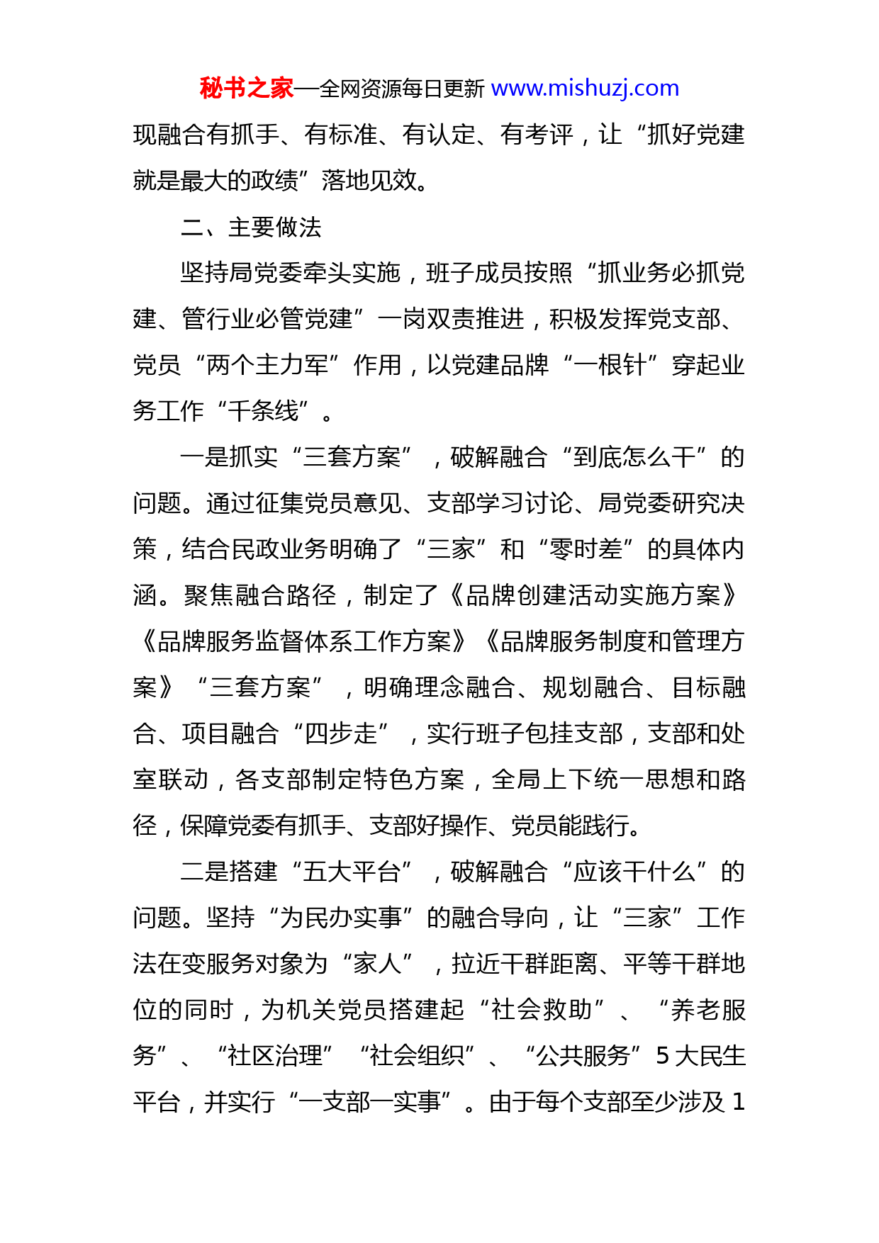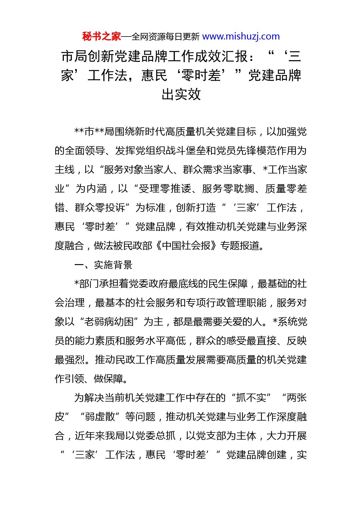 秘书之家—全网资源每日更新www.mishuzj.com市局创新党建品牌工作成效汇报:“‘三家’工作法,惠民‘零时差’”党建品牌出实效市局围绕新时代高质量机关党建目标,以加强党的全面领导、发挥党组织战斗堡垒和党员先锋模范作用为主线,以“服务对象当家人、群众需求当家事、工作当家业”为内涵,以“受理零推诿、服务零耽搁、质量零差错、群众零投诉”为标准,创新打造“‘三家’工作法,惠民‘零时差’”党建品牌,有效推动机关党建与业务深度融合,做法被民政部《中国社会报》专题报道。一、实施背景部门承担着党委政府最底线的民生保障,最基础的社会治理,最基本的社会服务和专项行政管理职能,服务对象以“老弱病幼困”为主,都是最需要关爱的人。系统党员的能力素质和服务水平高低,群众的感受最直接、反映最强烈。推动民政工作高质量发展需要高质量的机关党建作引领、做保障。为解决当前机关党建工作中存在的“抓不实”“两张皮”“弱虚散”等问题,推动机关党建与业务工作深度融合,近年来我局以党委总抓,以党支部为主体,大力开展“‘三家’工作法,惠民‘零时差’”党建品牌创建,实秘书之家—全网资源每日更新www.mishuzj.com现融合有抓手、有标准、有认定、有考评,让“抓好党建就是最大的政绩”落地见效。二、主要做法坚持局党委牵头实施,班子成员按照“抓业务必抓党建、管行业必管党建”一岗双责推进,积极发挥党支部、党员“两个主力军”作用,以党建品牌“一根针”穿起业务工作“千条线”。一是抓实“三套方案”,破解融合“到底怎么干”的问题。通过征集党员意见、支部学习讨论、局党委研究决策,结合民政业务明确了“三家”和“零时差”的具体内涵。聚焦融合路径,制定了《品牌创建活动实施方案》《品牌服务监督体系工作方案》《品牌服务制度和管理方案》“三套方案”,明确理念融合、规划融合、目标融合、项目融合“四步走”,实行班子包挂支部,支部和处室联动,各支部制定特色方案,全局上下统一思想和路径,保障党委有抓手、支部好操作、党员能践行。二是搭建“五大平台”,破解融合“应该干什么”的问题。坚持“为民办实事”的融合导向,让“三家”工作法在变服务对象为“家人”,拉近干群距离、平等干群地位的同时,为机关党员搭建起“社会救助”、“养老服务”、“社区治理”“社会组织”、“公共服务”5大民生平台,并实行“一支部一实事”。由于每个支部至少涉及1秘书之家—全网资源每日更新www.mishuzj.com个平台,使得支部党员人人与平台挂钩、与民生实事关联,推动“党员学业务、支部抓业务”和“业务处室抓党建、业务人员抓党建”双向深入互动,同心同向促融合。三是明确“六项制度”,破解融合“交给谁来干”的问题。为保障“三家”工作法的实施,局党委出台文件,建立了首问负责制、全程协办制、一次告知制、限时办结制、效能投诉制、追究问责制6项制度,细化工作流程、标准和约束措施,确立“党委班子带头、党支部跟进、党员全员参与”的制度落实模式。在效能投诉制度中,向社会公布驻局纪检监察组的电话,接受社会监督,24个党支部全部签定《服务创建承诺书》,打破党员的“鸵鸟心态”,提升人人参与党建的意识和能力。四是开展“三大行动”,破解融合“能不能干好”的问题。“定标赶超行动”,各支部对标先进地区,明确党建和业务追赶目标和计划,开展“定期讲党课、每月一讲堂、周有支部会、天天学典型”党建活动,全面补短缩差。“党建先锋行动”,编发《党支部工作规范》,开展“双强”标兵和“红旗支部”评选,明规范、塑典型;开展“赛马活动”,在机关支部试行书记轮值和跨支部交流,党员在对比中争先创优,收效显著。“正风肃纪行动”,重点整治“表态多、落实少,推脱多、担当少,检查多、指导少,应付多、钻研少”四种情形,为“三家”秘书之家—全网资源每日更新www.mishuzj.com工作法提供了作风保障。五是实施“四项评议”,破解融合“干的怎么样”的问题。针对党建和业务融合成效,内部开展开展党支部自评和党委班子点评,对不同支部设置个性化评议指标,既实事求是,又突出针对性;外部开展群众测评和第三方评估,定期邀请民政服务对象集中评议,并聘请社会第三方进行专项评议。通过“四项评议”,改进民政服务,提高党建实效。同时,在市级媒体开辟“三家”工作法专栏,每周一篇工作报道,民政微信公众号、官方微博及时推送,群众对“三家”党建品牌的知晓度显著增强。三、取得的成效“‘三家’工作法,惠民‘零时差’”以易记易懂的品牌提炼、清单式的实施方案、针对性的活动设计和有效的制度机制,推动机关党建与业务融合取得了积极成效,在绩效考核和全省综合业务评估中均获优秀等次。一是摆脱“独角戏”,拧成“一股绳”,提高了党建工作地位。“机关党建走在前、抓好党建促发展”的认识不断深化,局党委年度研究党建工作占党委会比例达60%,班子带头落实“三会一课”、组织生活、民主评议等制度,党建向心力凝聚力显著提高。“三家”品牌创建纳入了民政考核,党支部的战斗堡垒作用发挥更明显,各支部书记比学赶超抓融合更积极、更有力,形成了“围绕秘书之家—全网资源每日更新www.mishuzj.com党建规范化,