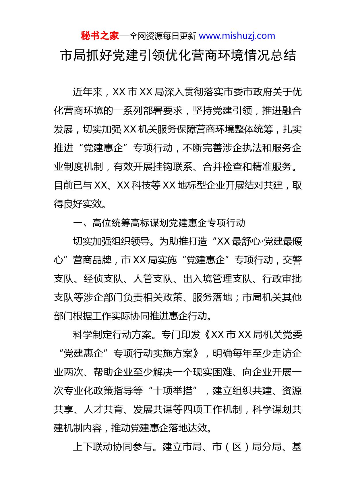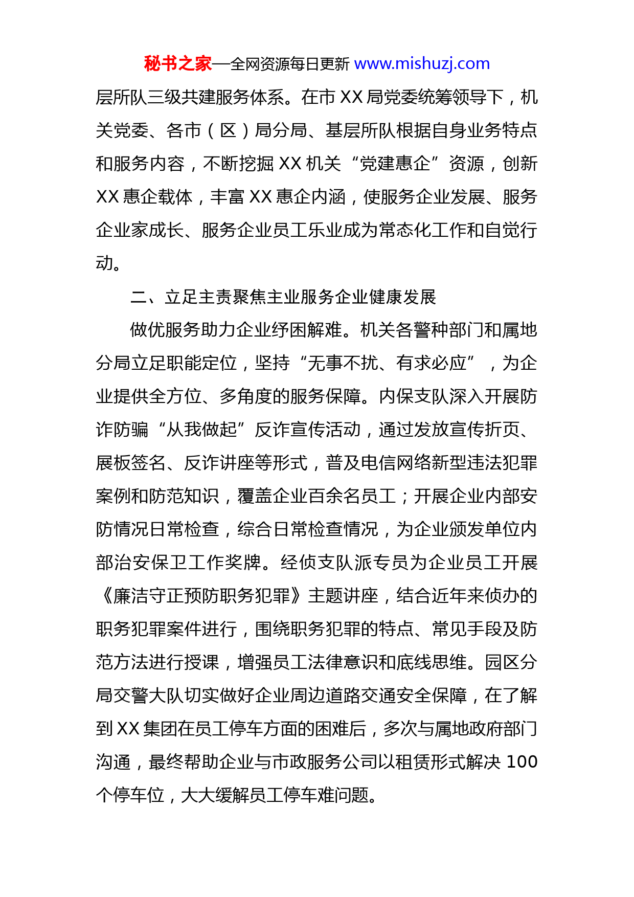 秘书之家—全网资源每日更新www.mishuzj.com市局抓好党建引领优化营商环境情况总结近年来,XX市XX局深入贯彻落实市委市政府关于优化营商环境的一系列部署要求,坚持党建引领,推进融合发展,切实加强XX机关服务保障营商环境整体统筹,扎实推进“党建惠企”专项行动,不断完善涉企执法和服务企业制度机制,有效开展挂钩联系、合并检查和精准服务。目前已与XX、XX科技等XX地标型企业开展结对共建,取得良好实效。一、高位统筹高标谋划党建惠企专项行动切实加强组织领导。为助推打造“XX最舒心·党建最暖心”营商品牌,市XX局实施“党建惠企”专项行动,交警支队、经侦支队、人管支队、出入境管理支队、行政审批支队等涉企部门负责相关政策、服务落地;市局机关其他部门根据工作实际协同推进惠企行动。科学制定行动方案。专门印发《XX市XX局机关党委“党建惠企”专项行动实施方案》,明确每年至少走访企业两次、帮助企业至少解决一个现实困难、向企业开展一次专业化政策指导等“十项举措”,建立组织共建、资源共享、人才共育、发展共谋等四项工作机制,科学谋划共建机制内容,推动党建惠企落地达效。上下联动协同参与。建立市局、市(区)局分局、基秘书之家—全网资源每日更新www.mishuzj.com层所队三级共建服务体系。在市XX局党委统筹领导下,机关党委、各市(区)局分局、基层所队根据自身业务特点和服务内容,不断挖掘XX机关“党建惠企”资源,创新XX惠企载体,丰富XX惠企内涵,使服务企业发展、服务企业家成长、服务企业员工乐业成为常态化工作和自觉行动。二、立足主责聚焦主业服务企业健康发展做优服务助力企业纾困解难。机关各警种部门和属地分局立足职能定位,坚持“无事不扰、有求必应”,为企业提供全方位、多角度的服务保障。内保支队深入开展防诈防骗“从我做起”反诈宣传活动,通过发放宣传折页、展板签名、反诈讲座等形式,普及电信网络新型违法犯罪案例和防范知识,覆盖企业百余名员工;开展企业内部安防情况日常检查,综合日常检查情况,为企业颁发单位内部治安保卫工作奖牌。经侦支队派专员为企业员工开展《廉洁守正预防职务犯罪》主题讲座,结合近年来侦办的职务犯罪案件进行,围绕职务犯罪的特点、常见手段及防范方法进行授课,增强员工法律意识和底线思维。园区分局交警大队切实做好企业周边道路交通安全保障,在了解到XX集团在员工停车方面的困难后,多次与属地政府部门沟通,最终帮助企业与市政服务公司以租赁形式解决100个停车位,大大缓解员工停车难问题。秘书之家—全网资源每日更新www.mishuzj.com互学互鉴共推警企良性互动。一方面,市XX局政治部多次与企业管理层和部分党员进行交流,共同举办主题党日,分享XXXX党建特色亮点做法;邀请企业党员参加“XX八点半·非凡夜‘警’色”喜迎“七·一”党员先锋志愿服务日活动;邀请企业高管参加XXXX警察节庆祝活动、先进典型事迹报告会等;新闻中心组织书协、文联参加XX“迎国庆书画展”,邀请员工代表参加警营开放日,全面展示XXXX在服务中心和党建队建上的经验成效;警校联合举办XX股东雪松培训班,介绍分享XX队伍建设经验做法,出入境、政务服务支队等部门进行专项政策解读。另一方面,XX安排首席科学家XX博士先后至警校司升督培训班和园区分局进行授课,围绕肿瘤的预防、发现和治疗开设主题讲座,关心关爱警员身心健康,邀请XX民警走进信达了解生物制药行业现状。三、常态推进长效赋能擦亮党建惠企品牌专项服务放大效应。在与XX、XX科技等地标企业党建共建成功经验的基础上,市XX局扩大服务范围,实施“党建惠企”专项政策和服务。对全市200余家获得过市级及以上“先进基层党组织”荣誉的非公有制企业和社会组织党组织提供窗口绿色通道、企业用工服务、上门防范指导和企业权益维护等方面5大类20条“约惠”措施,真正释放XX机关“党建红利”,凝聚“跟党一起创业、跟党秘书之家—全网资源每日更新www.mishuzj.com一起奋斗、跟党一起圆梦”的共识,不断将“支持礼包”转化为“产出红包”。持续完善提升效能。市XX局政治部多次会同经侦、法制、内保等警种部门负责人走访企业,商议共建工作和重点合作事项;专门组织上门问诊,听取结对企业对专项行动的意见建议,并请结对企业对市局机关部门惠企政策和服务进行评议,充分掌握惠企政策和服务的落实落地情况。根据企业反馈,每年6月底前对惠企政策和服务进行一次集中优化,对效果不佳的政策和服务进行及时调整,对惠企力度不够、吸引力不强的举措进行升级,对办理繁琐、体验感差的惠企流程进行整改,不断提升惠企力度和实效。做好示范扩大影响。XXXX党建惠企经验做法先后被《XX法制报》头版刊载,同时入选市委组织部《XX最舒心党建最暖心》专项行动案例集;高新区分局“创新实施‘狮山汇·党旗红’党建惠企行动计划”获评2021年全省XX基层党建“优秀创新项目”。此外,市XX局还利用XX网站、微信公众号等信息载体,加强“党建惠企”政策宣传,同时扩大宣传力度,让未建立党组织的企业和未获得荣誉的企业党组织充分知晓“党建惠企”专项行动,激发他们建立党组织、争当先进基层党组织的内生动力。