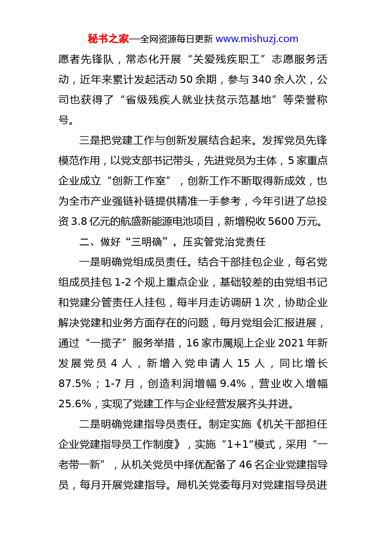秘书之家—全网资源每日更新www.mishuzj.com市工信局全面提升基层党组织组织力汇报发言工信局机关党委下设42个党支部,共有党员1747人。其中企业党组织24个、党员1261人;机关党支部2个、党员84人;离退休党支部10个,党员153人。面对党员人数多、党组织类型复杂、管理难度大等实际情况,我们坚持多措并举、务实创新,抓实抓细工信系统党建工作,力促党建工作水平整体提档升级。一、做好“三结合”,抓好党建基础工作一是把党建工作与企业生产经营结合起来。组织生活召开时间不搞一刀切,各企业支部可结合实际,在每月20日前自主选择召开时间,还可结合自身需要,自主开展“我为企业发展建言献策”“技术比武”等与生产经营相结合的主题党日活动,企业支部和党员参与组织生活的积极性明显提升,从4月份以来,企业党员月均参会率达90%以上。二是把党建工作与员工关爱结合起来。常态化开展困难员工摸排行动,依托主题党日,组织党员干部开展捐款、走访慰问等活动,建立企业党员与困难员工“一对一”帮扶,为困难员工送温暖。化工总厂党总支残疾职工比例高达44%,针对这一实际,公司党总支成立了党员志秘书之家—全网资源每日更新www.mishuzj.com愿者先锋队,常态化开展“关爱残疾职工”志愿服务活动,近年来累计发起活动50余期,参与340余人次,公司也获得了“省级残疾人就业扶贫示范基地”等荣誉称号。三是把党建工作与创新发展结合起来。发挥党员先锋模范作用,以党支部书记带头,先进党员为主体,5家重点企业成立“创新工作室”,创新工作不断取得新成效,也为全市产业强链补链提供精准一手参考,今年引进了总投资3.8亿元的航盛新能源电池项目,新增税收5600万元。二、做好“三明确”,压实管党治党责任一是明确党组成员责任。结合干部挂包企业,每名党组成员挂包1-2个规上重点企业,基础较差的由党组书记和党建分管责任人挂包,每半月走访调研1次,协助企业解决党建和业务方面存在的问题,每月党组会汇报进展,通过“一揽子”服务举措,16家市属规上企业2021年新发展党员4人,新增入党申请人15人,同比增长87.5%;1-7月,创造利润增幅9.4%,营业收入增幅25.6%,实现了党建工作与企业经营发展齐头并进。二是明确党建指导员责任。制定实施《机关干部担任企业党建指导员工作制度》,实施“1+1”模式,采用“一老带一新”,从机关党员中择优配备了46名企业党建指导员,每月开展党建指导。局机关党委每月对党建指导员进秘书之家—全网资源每日更新www.mishuzj.com行业务培训,组织企业每半年对党建指导员工作开展一次评议,评议结果与机关干部年终评先选优挂钩,确保党建指导工作真正落实到位。三是明确企业负责人职责。探索建立企业党建工作考核办法,每月线上抽查、每季度实地检查、年终集中考评,结合民主测评和日常检查情况,进行评星定级,评星定级结果直接与评先选优、项目申报、挂包服务、政策扶持等挂钩,倒逼企业重视党建工作。除了严格督查考核外,还组织企业开展党员先锋比武活动,让企业感受到党员的作用、党建的成效,让企业主要负责人树立起抓党建就是抓生产力的意识,在内心真正重视党建工作。三、做好“三强化”,促进党建全面提升一是强化典型示范引领。结合党支部标准化、规范化建设,开展企业过硬支部建设活动,围绕活动场所达标、组织生活规范、党员队伍过硬等方面,打造制药、集团、橡胶等7个过硬党组织,其中,达因制药今年荣获省先进基层党组织荣誉称号,凯丽造纸荣获市先进基层党组织称号。围绕对标先进,“学典型、促发展”活动,我们先后组织16家企业党组织负责人实地观摩学习。二是强化党员分类管理。制定《非公企业党员分类管理工作方案》,在8家重点企业试点推行管理层(厂级)、中层技术骨干、普通职工党员分类管理工作,设立秘书之家—全网资源每日更新www.mishuzj.com不同的培养侧重点,制定不同的考核标准,增强了“比学赶超”的针对性。比如,制药党支部通过实行“履职+争先”体系化积分管理,将“推动科技创新”列入考核项,并与“评先选优”挂钩,进一步激发了技术带头人的积极性。2021年申请专利10项,已获批4项。三是强化离退休党员作用。投资4万元,在局机关一楼修建离退休党员活动室,配备好硬件设施供离退休党员学习交流使用。依托主题党日,今年组织退休高工党员到企业开展经验交流会4次,发挥离退休党支部的传帮带作用。
