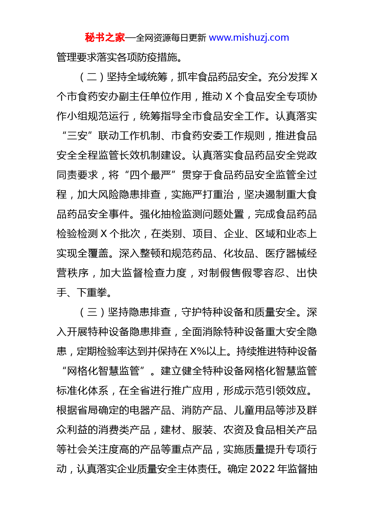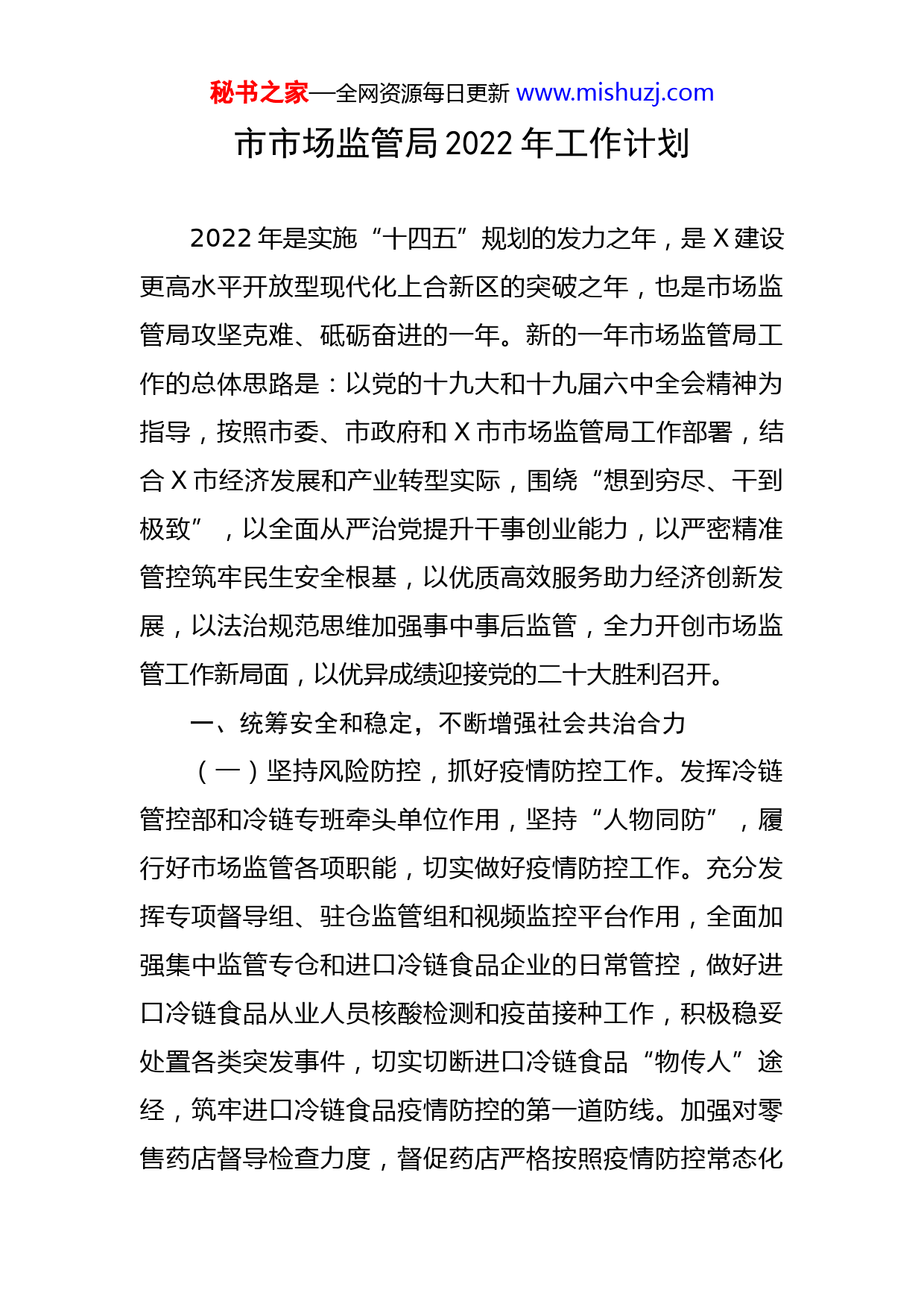 秘书之家—全网资源每日更新www.mishuzj.com市市场监管局2022年工作计划2022年是实施“十四五”规划的发力之年,是X建设更高水平开放型现代化上合新区的突破之年,也是市场监管局攻坚克难、砥砺奋进的一年。新的一年市场监管局工作的总体思路是:以党的十九大和十九届六中全会精神为指导,按照市委、市政府和X市市场监管局工作部署,结合X市经济发展和产业转型实际,围绕“想到穷尽、干到极致”,以全面从严治党提升干事创业能力,以严密精准管控筑牢民生安全根基,以优质高效服务助力经济创新发展,以法治规范思维加强事中事后监管,全力开创市场监管工作新局面,以优异成绩迎接党的二十大胜利召开。一、统筹安全和稳定,不断增强社会共治合力(一)坚持风险防控,抓好疫情防控工作。发挥冷链管控部和冷链专班牵头单位作用,坚持“人物同防”,履行好市场监管各项职能,切实做好疫情防控工作。充分发挥专项督导组、驻仓监管组和视频监控平台作用,全面加强集中监管专仓和进口冷链食品企业的日常管控,做好进口冷链食品从业人员核酸检测和疫苗接种工作,积极稳妥处置各类突发事件,切实切断进口冷链食品“物传人”途经,筑牢进口冷链食品疫情防控的第一道防线。加强对零售药店督导检查力度,督促药店严格按照疫情防控常态化秘书之家—全网资源每日更新www.mishuzj.com管理要求落实各项防疫措施。(二)坚持全域统筹,抓牢食品药品安全。充分发挥X个市食药安办副主任单位作用,推动X个食品安全专项协作小组规范运行,统筹指导全市食品安全工作。认真落实“三安”联动工作机制、市食药安委工作规则,推进食品安全全程监管长效机制建设。认真落实食品药品安全党政同责要求,将“四个最严”贯穿于食品药品安全监管全过程,加大风险隐患排查,实施严打重治,坚决遏制重大食品药品安全事件。强化抽检监测问题处置,完成食品药品检验检测X个批次,在类别、项目、企业、区域和业态上实现全覆盖。深入整顿和规范药品、化妆品、医疗器械经营秩序,加大监督检查力度,对制假售假零容忍、出快手、下重拳。(三)坚持隐患排查,守护特种设备和质量安全。深入开展特种设备隐患排查,全面消除特种设备重大安全隐患,定期检验率达到并保持在X%以上。持续推进特种设备“网格化智慧监管”。建立健全特种设备网格化智慧监管标准化体系,在全省进行推广应用,形成示范引领效应。根据省局确定的电器产品、消防产品、儿童用品等涉及群众利益的消费类产品,建材、服装、农资及食品相关产品等社会关注度高的产品等重点产品,实施质量提升专项行动,认真落实企业质量安全主体责任。确定2022年监督抽秘书之家—全网资源每日更新www.mishuzj.com查产品目录,严格抽检计划的制定和执行,加大对不合格企业的后处理力度,加大对已完成后处理企业的跟踪监督力度。二、统筹创新和保护,赋能全市经济高质量发展(一)坚持品牌引领,强化知识产权创造运用。组织开展地理标志专项整治行动,严厉打击地理标志侵权假冒行为。加强地理标志发掘培育工作,深入发掘地理标志资源及产品。深入开展知识产权“入园惠企”活动,支持指导企业开展知识产权质押融资,充分释放知识产权资源的创新价值、经济效益和社会效应,形成“优化增量、转化存量”的工作路径和发展局面。开展知识产权行政执法专项行动,进一步加大侵犯知识产权行为的查处力度,对群众反映强烈、社会舆论关注度高、侵权假冒多发的商品领域集中整治。(二)坚持质量强市,推广卓越绩效管理模式。深入开展质量提升行动,充分发挥质量工作领导小组办公室的职能,强化联络协调工作机制,提高质量工作社会影响。加大X省省长质量奖、X市市长质量奖等政府质量奖培育力度,发挥质量奖励引领作用。推广卓越绩效管理模式,树立质量管理标杆和典型。强化企业质量主体责任意识,督促企业履行产品质量和服务质量承诺,自觉履行社会责任。组织开展质量技术服务活动,开展质量帮扶和培训,秘书之家—全网资源每日更新www.mishuzj.com提升企业质量管理能力。通过小微企业质量管理体系认证提升行动,切实发挥认证在加强全面质量管理中的基础作用,运用先进管理工具和方法,促进认证质量水平提升。(三)坚持标准提升,打造改革发展“X样板”。推进“标准领跑者”建设,深入走访企业,获取企业需求,解答企业疑虑,着力促进宣传培训效果落地,做大做强战略性新兴产业和高技术产业,推动技术创新与标准研制同步,鼓励掌握自主创新技术的企业将关键共性技术、专用性技术和产品技术转化为先进标准,推动提升为国际标准或国家标准。积极引导有能力的企业参与制修订各类标准X项。积极加强与X市局、省相关协会以及相关标准化专业技术组织、科研院所、驻胶高校的沟通与协调,努力争取相关部门的支持,掌握相关行业动向,促进企业对接,提升市场监管队伍的标准化服务水平。三、统筹活力和秩序,切实加强事中事后监管(一)坚持包容审慎,完善市场营商环境。大力推行“沙盒监管”新模式,按照包容审慎监管原则,落实容错机制,优化营商环境。立足智慧市场监管,按照“管行业就要管信用、管业务就要管信用”的原则,建立健全重点领域事前、事中、事后全流程信用监管机制,提高重点领域监管的
