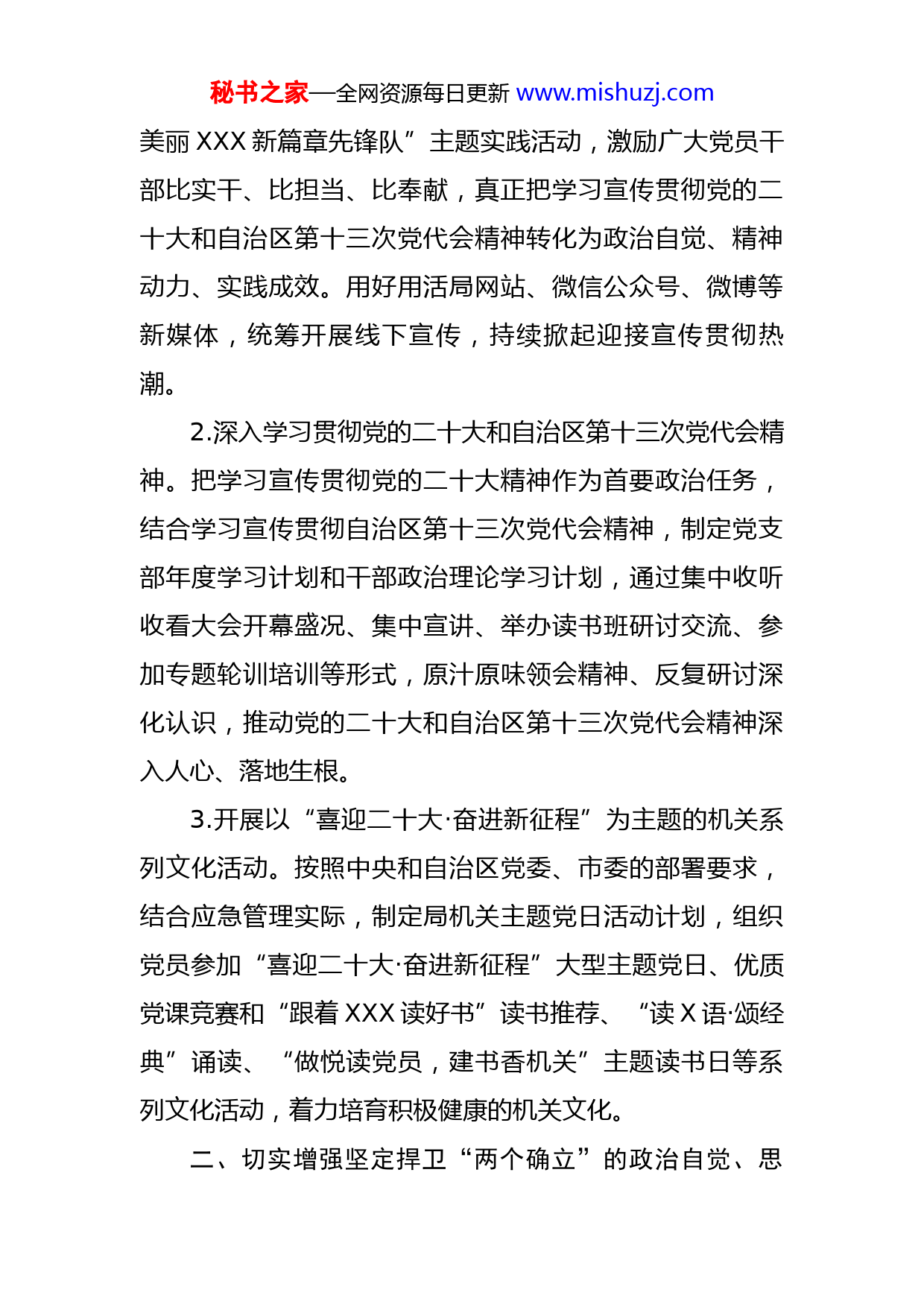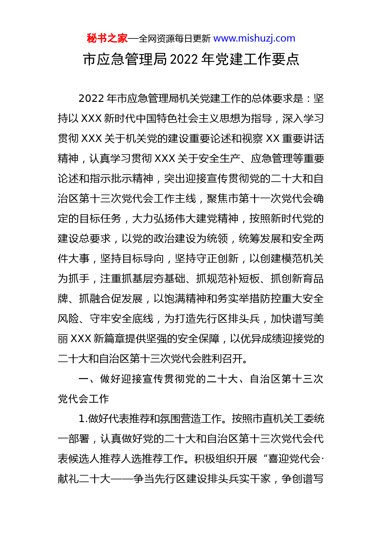秘书之家—全网资源每日更新www.mishuzj.com市应急管理局2022年党建工作要点2022年市应急管理局机关党建工作的总体要求是:坚持以XXX新时代中国特色社会主义思想为指导,深入学习贯彻XXX关于机关党的建设重要论述和视察XX重要讲话精神,认真学习贯彻XXX关于安全生产、应急管理等重要论述和指示批示精神,突出迎接宣传贯彻党的二十大和自治区第十三次党代会工作主线,聚焦市第十一次党代会确定的目标任务,大力弘扬伟大建党精神,按照新时代党的建设总要求,以党的政治建设为统领,统筹发展和安全两件大事,坚持目标导向,坚持守正创新,以创建模范机关为抓手,注重抓基层夯基础、抓规范补短板、抓创新育品牌、抓融合促发展,以饱满精神和务实举措防控重大安全风险、守牢安全底线,为打造先行区排头兵,加快谱写美丽XXX新篇章提供坚强的安全保障,以优异成绩迎接党的二十大和自治区第十三次党代会胜利召开。一、做好迎接宣传贯彻党的二十大、自治区第十三次党代会工作1.做好代表推荐和氛围营造工作。按照市直机关工委统一部署,认真做好党的二十大和自治区第十三次党代会代表候选人推荐人选推荐工作。积极组织开展“喜迎党代会·献礼二十大——争当先行区建设排头兵实干家,争创谱写秘书之家—全网资源每日更新www.mishuzj.com美丽XXX新篇章先锋队”主题实践活动,激励广大党员干部比实干、比担当、比奉献,真正把学习宣传贯彻党的二十大和自治区第十三次党代会精神转化为政治自觉、精神动力、实践成效。用好用活局网站、微信公众号、微博等新媒体,统筹开展线下宣传,持续掀起迎接宣传贯彻热潮。2.深入学习贯彻党的二十大和自治区第十三次党代会精神。把学习宣传贯彻党的二十大精神作为首要政治任务,结合学习宣传贯彻自治区第十三次党代会精神,制定党支部年度学习计划和干部政治理论学习计划,通过集中收听收看大会开幕盛况、集中宣讲、举办读书班研讨交流、参加专题轮训培训等形式,原汁原味领会精神、反复研讨深化认识,推动党的二十大和自治区第十三次党代会精神深入人心、落地生根。3.开展以“喜迎二十大·奋进新征程”为主题的机关系列文化活动。按照中央和自治区党委、市委的部署要求,结合应急管理实际,制定局机关主题党日活动计划,组织党员参加“喜迎二十大·奋进新征程”大型主题党日、优质党课竞赛和“跟着XXX读好书”读书推荐、“读X语·颂经典”诵读、“做悦读党员,建书香机关”主题读书日等系列文化活动,着力培育积极健康的机关文化。二、切实增强坚定捍卫“两个确立”的政治自觉、思秘书之家—全网资源每日更新www.mishuzj.com想自觉、行动自觉4.深入实施XXX新时代中国特色社会主义思想铸魂工程。坚持把党的政治建设摆在首位,深刻领会“两个确立”的决定性意义,强化政治机关意识教育,引导机关党员干部以正确的认识和行动,坚定捍卫“两个确立”,坚决做到“两个维护”。把XXX新时代中国特色社会主义思想列为党委理论学习中心组学习“第一议题”,党支部、党小组学习“第一内容”,党员干部学习“第一任务”,建立健全局党委会议及时传达和学习贯彻XXX重要讲话、重要指示批示精神制度,注重把研究解决改革发展稳定和党的建设面临的突出问题作为学习的着力点,自觉主动学、及时跟进学、联系实际学、笃信笃行学,切实用党的创新理论武装头脑、指导实践、推动工作。探索建立评学、考学、督学、述学机制,积极参加市直机关理论学习中心组学习经验交流座谈会,不断提高理论学习中心组制度化规范化水平。深入开展“青年大学习”活动,建强青年理论学习小组,开设青年干部论坛,评选青年学习标兵。5.加强政治建设监督检查。聚焦“两个维护”,深入开展政治机关建设,以开展“工作落实年”活动为契机,教育引导党员坚决贯彻落实党中央决策部署、履行职责使命、扎实推进重点工作、严格执行纪律要求,督促国家、自治区以及全市重大战略各项任务落实落地。严格执行重秘书之家—全网资源每日更新www.mishuzj.com大事项请示报告制度,加强对党员“八小时以外”和网上政治言行监督,及时发现纠正并解决问题。6.巩固拓展党史学习教育成果。持续开展党的XX届X中X会精神学习教育,与XXX关于学习党的历史的重要论述、重要指示和在庆祝中国共产党成立100周年大会上的重要讲话一体学习理解、一体贯彻落实。突出坚定历史自信深化“四史”教育,自觉运用党的百年奋斗历史经验,引导广大党员干部聚焦学史明理再深化、围绕学史增信再锤炼、着眼学史崇德再提升、立足学史力行再出发,以强烈的历史主动精神奋进新征程、建功新时代。深化“我为群众办实事”实践活动成果,把“办好人民群众的操心事、烦心事、揪心事”作为办实事的出发点和落脚点,号召全市应急系统,重点围绕依法行政、行政审批等工作,高度关注信访举报、“书记、市长信箱”和社情民意,以“我为群众办实事”为引领,本着设身处地为老百姓办事,推出一系列“快办、速办”措施,做到件件有落实、件件有回音。继续开展“传承党的百年光辉史基因铸牢中华民族共同体意识”主题教育活动。7.加强意识形态和宣传教育工作。持续抓好意识形态工作责任制的落实,定期专题研究意识形态工作,定期