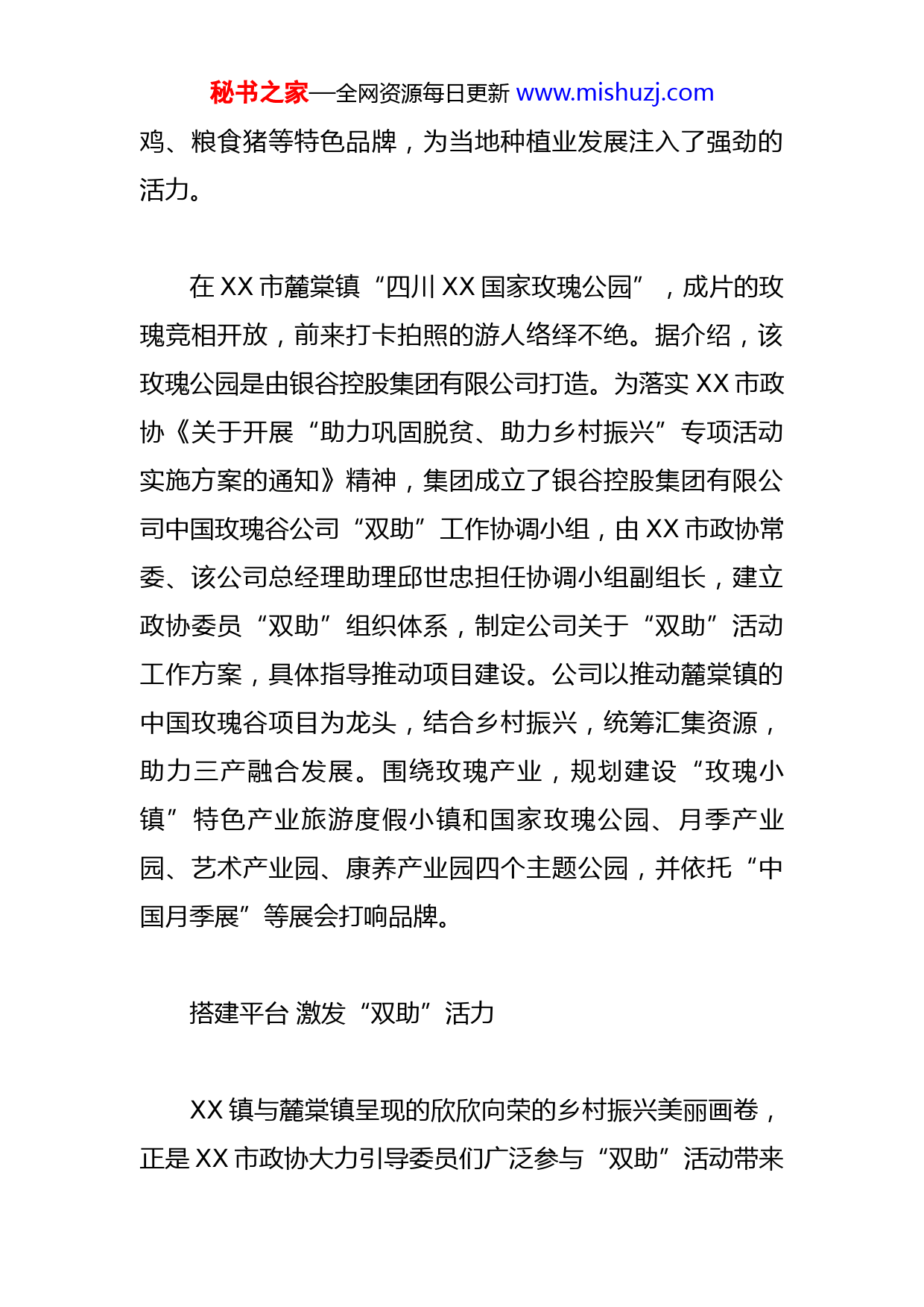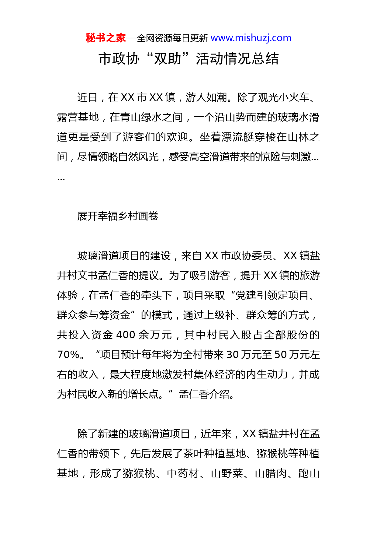 秘书之家—全网资源每日更新www.mishuzj.com市政协“双助”活动情况总结近日,在XX市XX镇,游人如潮。除了观光小火车、露营基地,在青山绿水之间,一个沿山势而建的玻璃水滑道更是受到了游客们的欢迎。坐着漂流艇穿梭在山林之间,尽情领略自然风光,感受高空滑道带来的惊险与刺激……展开幸福乡村画卷玻璃滑道项目的建设,来自XX市政协委员、XX镇盐井村文书孟仁香的提议。为了吸引游客,提升XX镇的旅游体验,在孟仁香的牵头下,项目采取“党建引领定项目、群众参与筹资金”的模式,通过上级补、群众筹的方式,共投入资金400余万元,其中村民入股占全部股份的70%。“项目预计每年将为全村带来30万元至50万元左右的收入,最大程度地激发村集体经济的内生动力,并成为村民收入新的增长点。”孟仁香介绍。除了新建的玻璃滑道项目,近年来,XX镇盐井村在孟仁香的带领下,先后发展了茶叶种植基地、猕猴桃等种植基地,形成了猕猴桃、中药材、山野菜、山腊肉、跑山秘书之家—全网资源每日更新www.mishuzj.com鸡、粮食猪等特色品牌,为当地种植业发展注入了强劲的活力。在XX市麓棠镇“四川XX国家玫瑰公园”,成片的玫瑰竞相开放,前来打卡拍照的游人络绎不绝。据介绍,该玫瑰公园是由银谷控股集团有限公司打造。为落实XX市政协《关于开展“助力巩固脱贫、助力乡村振兴”专项活动实施方案的通知》精神,集团成立了银谷控股集团有限公司中国玫瑰谷公司“双助”工作协调小组,由XX市政协常委、该公司总经理助理邱世忠担任协调小组副组长,建立政协委员“双助”组织体系,制定公司关于“双助”活动工作方案,具体指导推动项目建设。公司以推动麓棠镇的中国玫瑰谷项目为龙头,结合乡村振兴,统筹汇集资源,助力三产融合发展。围绕玫瑰产业,规划建设“玫瑰小镇”特色产业旅游度假小镇和国家玫瑰公园、月季产业园、艺术产业园、康养产业园四个主题公园,并依托“中国月季展”等展会打响品牌。搭建平台激发“双助”活力XX镇与麓棠镇呈现的欣欣向荣的乡村振兴美丽画卷,正是XX市政协大力引导委员们广泛参与“双助”活动带来秘书之家—全网资源每日更新www.mishuzj.com的成效。近年来,该市广大政协委员快速响应,立足职能发挥优势,用心用情书写“人民政协为人民”的生动实践,为助力乡村振兴增动力、添助力、聚合力。围绕做好“双助”工作。市政协成立了以政协主席为组长的“双助”活动领导小组,领导小组下设活动指导组;按照XX市委关于市级领导联系镇(街道)的工作方案,由副主席分别牵头联系几个镇(街道),指导协调“双助”工作。指导组定期组织政协专委会成员及所联系界别委员以调研视察、定点帮扶、走访讨论等方式深入到联系镇(街道)开展“双助”活动,收集信息,挖掘典型。为掌握“双助”工作动态,广泛收集意见需求,市政协下发了政协委员参与“双助”活动摸底调查表,充分了解政协委员参与“双助”活动动态,收集政协委员参与“双助”活动信息,及时掌握政协委员参与“双助”活动情况。同时召集有关镇(街道)、市级部门负责人、部分政协委员参加的“双助”活动座谈会,充分听取各方意见,梳理汇总各种建议,为“双助”活动有效开展提供决策参考;市政协领导带领各专委会成员深入到联系界别政协委员中间进行沟通交流,了解政协委员参与“双助”活秘书之家—全网资源每日更新www.mishuzj.com动的情况,充分听取委员们对“双助”活动开展的意见和建议,广泛汇聚委员智慧,凝聚委员力量。为促进“双助”工作落到实处,市政协一方面结合全市干部开展的基层“大走访”活动,扎实开展对脱贫户的联系帮扶,通过常态化监测、协调解决就业问题、资助活动等方式了解脱贫户动态,帮助解决他们的实际困难,协助增收致富;一方面引导企业界政协委员通过自己的企业积极开展“万企兴万村”活动,重点参与农村产业发展,镇村公共服务和农业基础设施建设工作,助推“大美乡村”建设,助力乡村全面振兴;围绕XX市推进“产村融合发展,助力乡村振兴”的主题,市政协开展专项视察,通过现场参观视察、听取汇报、专题座谈等方式,对XX市产村融合发展工作进行讨论和交流,并形成了许多具有高质量、高水平的意见建议,经梳理后报市委、市政府作决策参考,得到市领导的高度评价和充分肯定;市政协领导班子先后深入到政协委员所在的农业龙头企业、农民专合社、家庭农场等进行走访调研,了解委员们在“双助”活动中的先进事迹,帮助协调解决委员们自身发展面临的困难和问题,进一步激发了政协委员参与“双助”活动的热情。