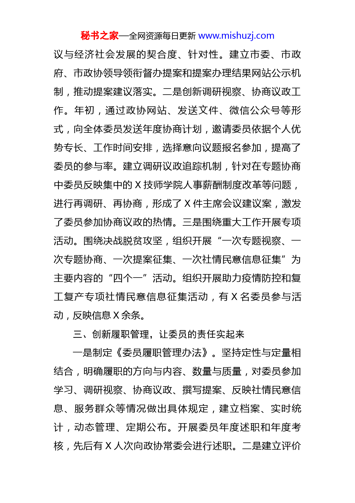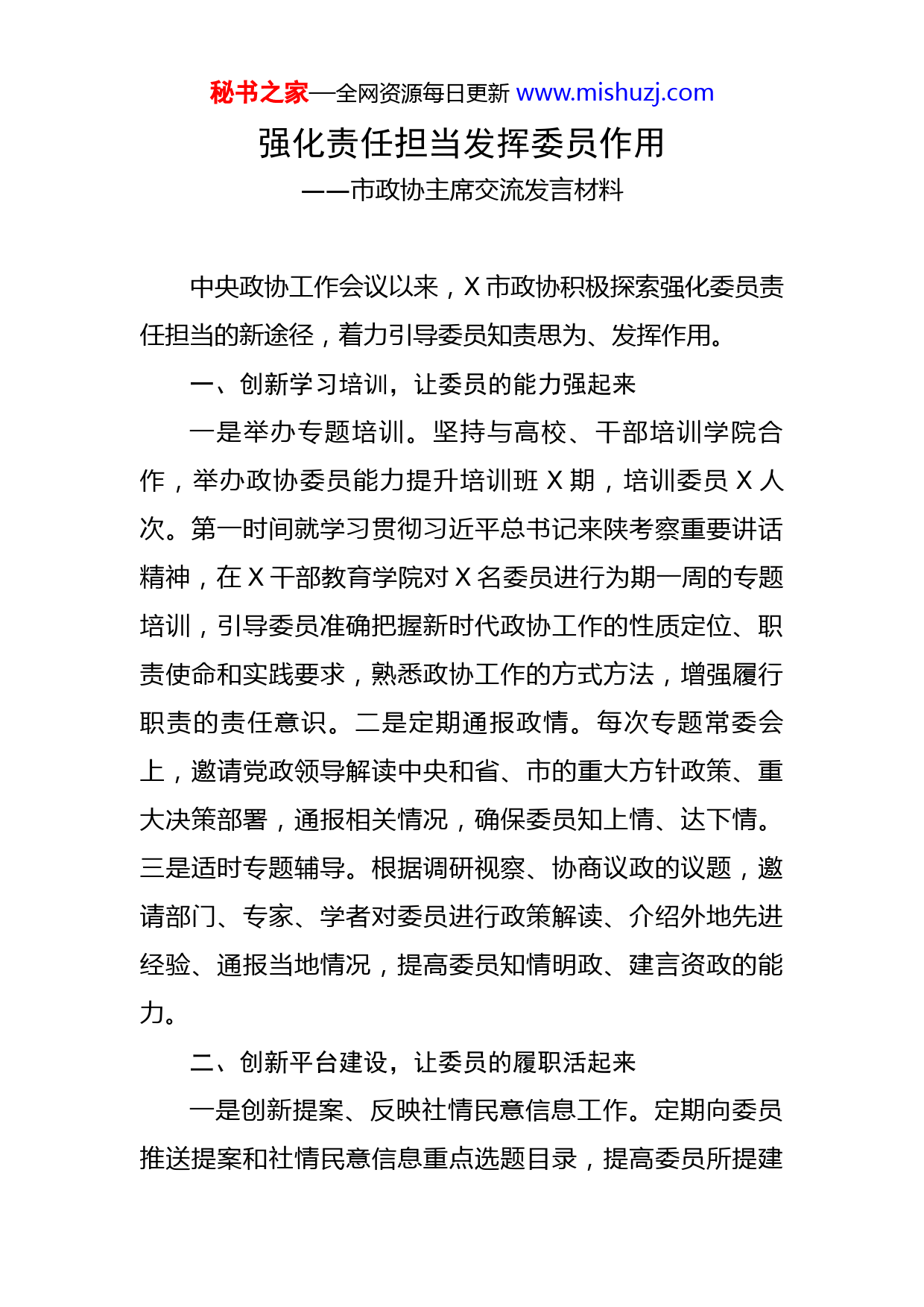秘书之家—全网资源每日更新www.mishuzj.com强化责任担当发挥委员作用——市政协主席交流发言材料中央政协工作会议以来,X市政协积极探索强化委员责任担当的新途径,着力引导委员知责思为、发挥作用。一、创新学习培训,让委员的能力强起来一是举办专题培训。坚持与高校、干部培训学院合作,举办政协委员能力提升培训班X期,培训委员X人次。第一时间就学习贯彻习近平总书记来陕考察重要讲话精神,在X干部教育学院对X名委员进行为期一周的专题培训,引导委员准确把握新时代政协工作的性质定位、职责使命和实践要求,熟悉政协工作的方式方法,增强履行职责的责任意识。二是定期通报政情。每次专题常委会上,邀请党政领导解读中央和省、市的重大方针政策、重大决策部署,通报相关情况,确保委员知上情、达下情。三是适时专题辅导。根据调研视察、协商议政的议题,邀请部门、专家、学者对委员进行政策解读、介绍外地先进经验、通报当地情况,提高委员知情明政、建言资政的能力。二、创新平台建设,让委员的履职活起来一是创新提案、反映社情民意信息工作。定期向委员推送提案和社情民意信息重点选题目录,提高委员所提建秘书之家—全网资源每日更新www.mishuzj.com议与经济社会发展的契合度、针对性。建立市委、市政府、市政协领导领衔督办提案和提案办理结果网站公示机制,推动提案建议落实。二是创新调研视察、协商议政工作。年初,通过政协网站、发送文件、微信公众号等形式,向全体委员发送年度协商计划,邀请委员依据个人优势专长、工作时间安排,选择意向议题报名参加,提高了委员的参与率。建立调研议政追踪机制,针对在专题协商中委员反映集中的X技师学院人事薪酬制度改革等问题,进行再调研、再协商,形成了X件主席会议建议案,激发了委员参加协商议政的热情。三是围绕重大工作开展专项活动。围绕决战脱贫攻坚,组织开展“一次专题视察、一次专题协商、一次提案征集、一次社情民意信息征集”为主要内容的“四个一”活动。组织开展助力疫情防控和复工复产专项社情民意信息征集活动,有X名委员参与活动,反映信息X余条。三、创新履职管理,让委员的责任实起来一是制定《委员履职管理办法》。坚持定性与定量相结合,明确履职的方向与内容、数量与质量,对委员参加学习、调研视察、协商议政、撰写提案、反映社情民意信息、服务群众等情况做出具体规定,建立档案、实时统计,动态管理、定期公布。开展委员年度述职和年度考核,先后有X人次向政协常委会进行述职。二是建立评价秘书之家—全网资源每日更新www.mishuzj.com激励机制。制定优秀调研报告、优秀提案、优秀社情民意信息评选和奖励制度,对优秀履职成果在全委会上表彰奖励,对获奖情况通过媒体进行通报。通过“委员风采”报纸专栏、X政协微信公众号等,对委员履职情况、先进事迹即时报道,提升委员的社会影响力。三是强化考核结果运用。加强与党委组织、统战部门和委员所在单位的工作衔接,把委员履职情况纳入组织部门、委员单位对委员个人年度考核的重要内容,作为统战部门推荐下届委员人选的重要依据。及时对不合格委员实行约谈提醒和组织处理,今年以来,约谈委员X人次,请辞X人、撤销X人,让委员队伍始终充满朝气和正气。