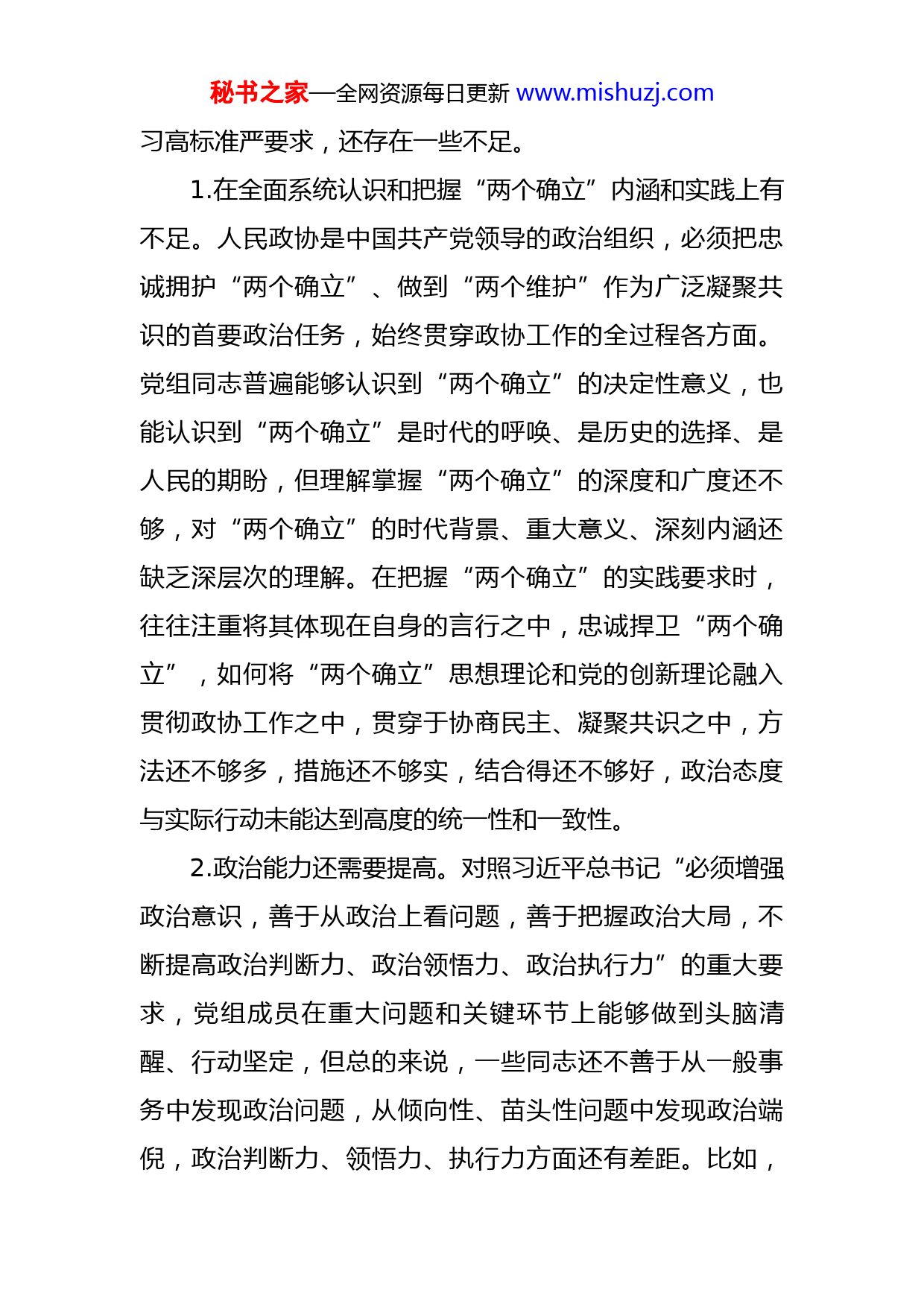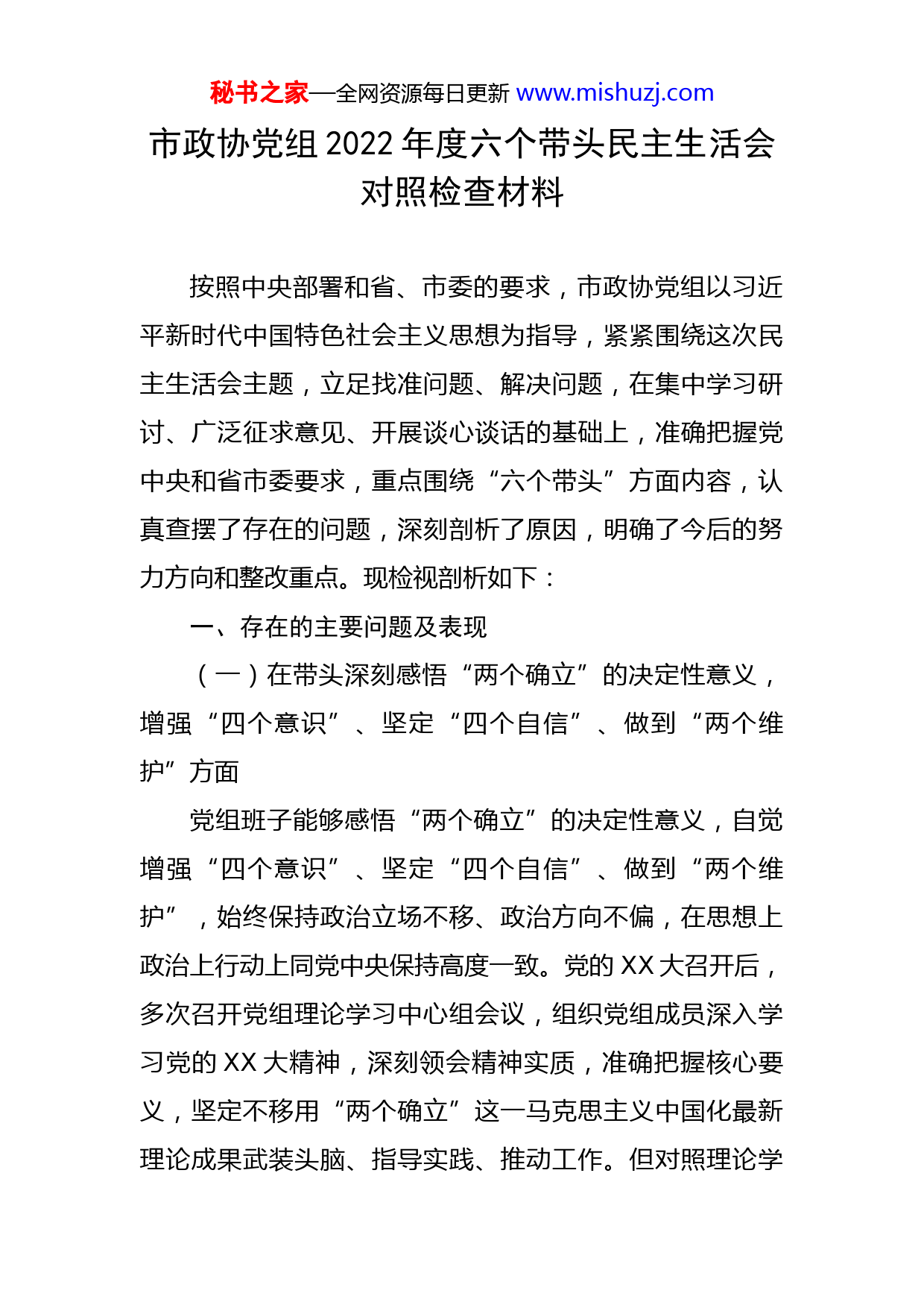 秘书之家—全网资源每日更新www.mishuzj.com市政协党组2022年度六个带头民主生活会对照检查材料按照中央部署和省、市委的要求,市政协党组以习近平新时代中国特色社会主义思想为指导,紧紧围绕这次民主生活会主题,立足找准问题、解决问题,在集中学习研讨、广泛征求意见、开展谈心谈话的基础上,准确把握党中央和省市委要求,重点围绕“六个带头”方面内容,认真查摆了存在的问题,深刻剖析了原因,明确了今后的努力方向和整改重点。现检视剖析如下:一、存在的主要问题及表现(一)在带头深刻感悟“两个确立”的决定性意义,增强“四个意识”、坚定“四个自信”、做到“两个维护”方面党组班子能够感悟“两个确立”的决定性意义,自觉增强“四个意识”、坚定“四个自信”、做到“两个维护”,始终保持政治立场不移、政治方向不偏,在思想上政治上行动上同党中央保持高度一致。党的XX大召开后,多次召开党组理论学习中心组会议,组织党组成员深入学习党的XX大精神,深刻领会精神实质,准确把握核心要义,坚定不移用“两个确立”这一马克思主义中国化最新理论成果武装头脑、指导实践、推动工作。但对照理论学秘书之家—全网资源每日更新www.mishuzj.com习高标准严要求,还存在一些不足。1.在全面系统认识和把握“两个确立”内涵和实践上有不足。人民政协是中国共产党领导的政治组织,必须把忠诚拥护“两个确立”、做到“两个维护”作为广泛凝聚共识的首要政治任务,始终贯穿政协工作的全过程各方面。党组同志普遍能够认识到“两个确立”的决定性意义,也能认识到“两个确立”是时代的呼唤、是历史的选择、是人民的期盼,但理解掌握“两个确立”的深度和广度还不够,对“两个确立”的时代背景、重大意义、深刻内涵还缺乏深层次的理解。在把握“两个确立”的实践要求时,往往注重将其体现在自身的言行之中,忠诚捍卫“两个确立”,如何将“两个确立”思想理论和党的创新理论融入贯彻政协工作之中,贯穿于协商民主、凝聚共识之中,方法还不够多,措施还不够实,结合得还不够好,政治态度与实际行动未能达到高度的统一性和一致性。2.政治能力还需要提高。对照习近平总书记“必须增强政治意识,善于从政治上看问题,善于把握政治大局,不断提高政治判断力、政治领悟力、政治执行力”的重大要求,党组成员在重大问题和关键环节上能够做到头脑清醒、行动坚定,但总的来说,一些同志还不善于从一般事务中发现政治问题,从倾向性、苗头性问题中发现政治端倪,政治判断力、领悟力、执行力方面还有差距。比如,秘书之家—全网资源每日更新www.mishuzj.com党组主动更新思想观念不够及时,在决策层面对一些重难点问题研究不够透彻,在落实请示报告、督促检查等机制上,能够严肃认真地贯彻执行,但在日常工作中,还存在沟通协调不到位、情况反馈不及时等现象。在学习贯彻党的XX大精神方面,看得多思考少,不能从更深层次去研究、理解和运用,特别是对党的XX大报告中提出的“完善人民政协民主监督和委员联系界别群众制度机制”,党组成员没有深入的理解和研究,也没有在集中学习讨论时提出改进的办法和措施。3.服务大局、把握大势、着眼大事的意识不够。党组作决策时能够站在全市的角度去考虑工作,紧紧围绕全市中心部署政协工作,但在思想认识上缺少从全国和全省的高度去看问题、找差距。在如何利用政协人才荟萃、智力密集的优势,为市委、市政府科学民主决策方面,做得还不够。比如,在制定政协年度协商计划时,虽然也考虑到全市工作大局和市委、市政府的重点工作,但在议题的选择上也考虑协商的议题好不好调研、有没有难度,对事关全市高质量发展的全局性问题和长期制约我市发展的深层次问题思考得不深、研究得不透,从制度、宏观、政策层面建言献策不够充分和深入。(二)在带头用习近平新时代中国特色社会主义思想凝心铸魂方面秘书之家—全网资源每日更新www.mishuzj.com1.学习不够深入,在“学懂”上有差距。有的同志能够及时跟进学习习近平总书记考察调研XX重要讲话重要指示精神、习近平总书记关于加强和改进人民政协工作的重要思想等,但对于习近平总书记在其他工作领域的最新讲话最新指示,还未做到第一时间深入学习、系统领会,理论学习浅尝辄止、不求甚解,对党的创新理论跟进不及时、关注不连续、学习不系统、研究不透彻,有时还习惯于听听新闻、看看报纸等碎片化、局部性的阅读和理解,精研深思少,照本宣科多,在理解、掌握和运用总书记最新指示精神方面还做得不够。2.领会不够到位,在“弄通”上有差距。虽然注重持续用习近平新时代中国特色社会主义思想武装党员干部头脑,但学习照本宣科、浮于表面比较多,对机关干部职工思想政治工作缺乏针对性、实效性,造成有的同志对习近平新时代中国特色社会主义思想的形成、发展历程,缺少系统性的思考研究,深入领悟其核心要义还不够。在引领政协委员学习领会习近平新时代中国特色社会主义思想方面做得也不够,虽然各专委会都建立了习近平新时代中国特色社会主义思想学习座谈小组,但每年仅开展一到两次学习活动,还存在只学习不座谈的情况,委员们被动地听一听,主动思考、交流体会比较少,特别是对习近平总书记