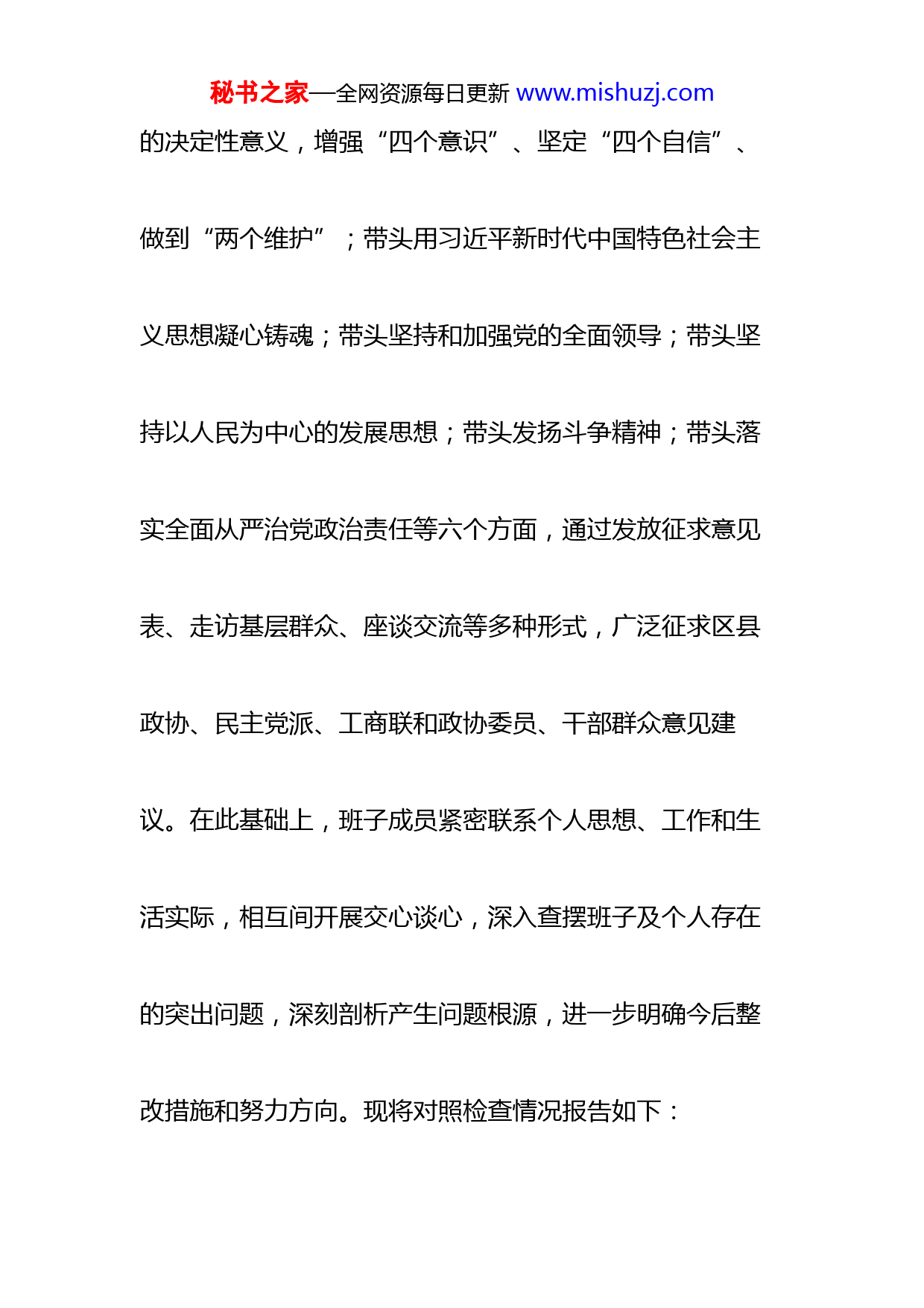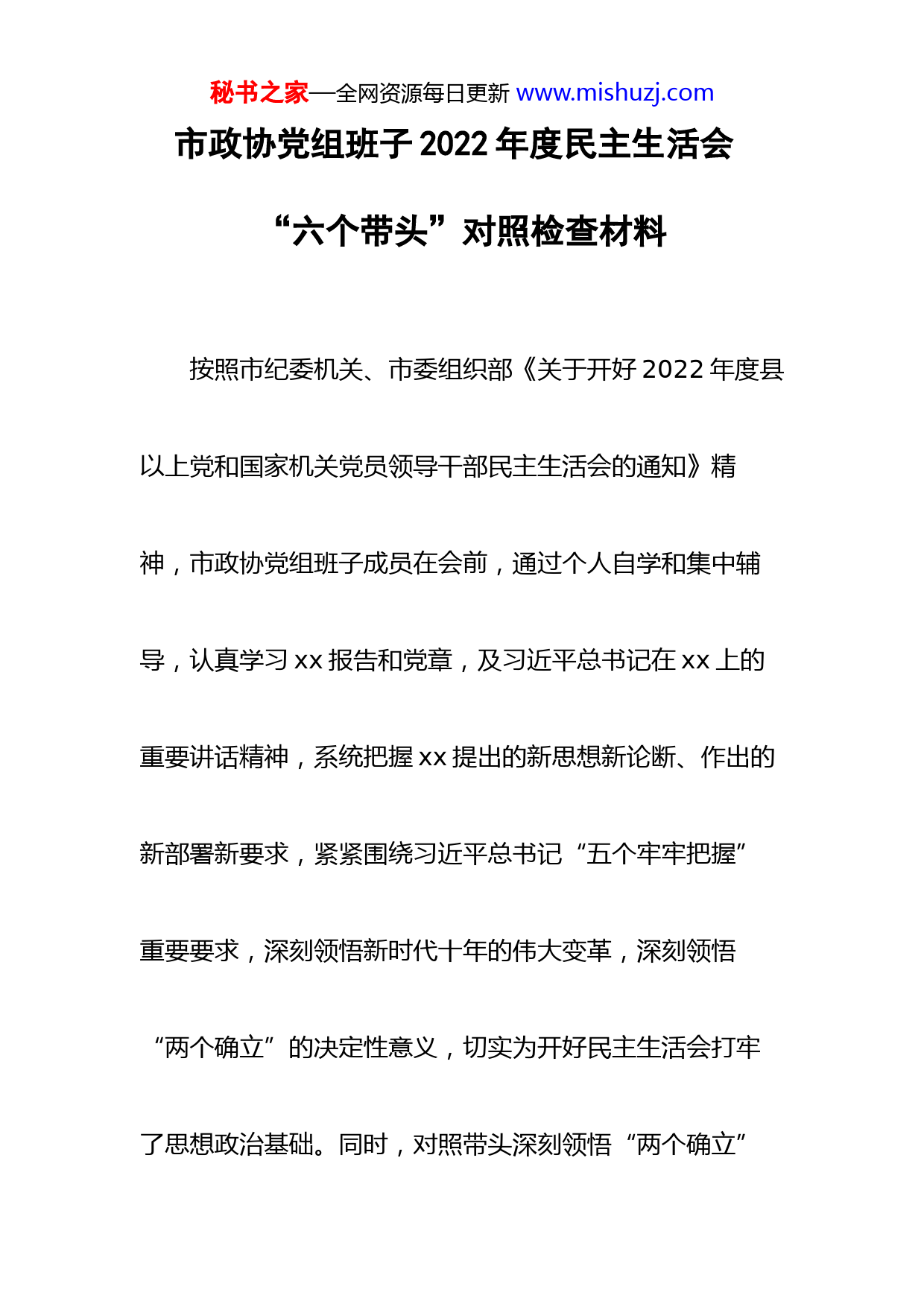 秘书之家—全网资源每日更新www.mishuzj.com市政协党组班子2022年度民主生活会“六个带头”对照检查材料按照市纪委机关、市委组织部《关于开好2022年度县以上党和国家机关党员领导干部民主生活会的通知》精神,市政协党组班子成员在会前,通过个人自学和集中辅导,认真学习xx报告和党章,及习近平总书记在xx上的重要讲话精神,系统把握xx提出的新思想新论断、作出的新部署新要求,紧紧围绕习近平总书记“五个牢牢把握”重要要求,深刻领悟新时代十年的伟大变革,深刻领悟“两个确立”的决定性意义,切实为开好民主生活会打牢了思想政治基础。同时,对照带头深刻领悟“两个确立”秘书之家—全网资源每日更新www.mishuzj.com的决定性意义,增强“四个意识”、坚定“四个自信”、做到“两个维护”;带头用习近平新时代中国特色社会主义思想凝心铸魂;带头坚持和加强党的全面领导;带头坚持以人民为中心的发展思想;带头发扬斗争精神;带头落实全面从严治党政治责任等六个方面,通过发放征求意见表、走访基层群众、座谈交流等多种形式,广泛征求区县政协、民主党派、工商联和政协委员、干部群众意见建议。在此基础上,班子成员紧密联系个人思想、工作和生活实际,相互间开展交心谈心,深入查摆班子及个人存在的突出问题,深刻剖析产生问题根源,进一步明确今后整改措施和努力方向。现将对照检查情况报告如下:秘书之家—全网资源每日更新www.mishuzj.com一、存在的主要问题通过开门征求意见、班子集中查摆等方式,党组对“六个带头”方面的短板和不足,进行了认真梳理归纳,主要问题有:(一)带头深刻领悟“两个确立”的决定性意义,增强“四个意识”、坚定“四个自信”、做到“两个维护”方面。一是对“两个确立”的决定性意义理解不深。党组班子在组织开展理论中心组集中学习时,班子成员领学多,组织讨论少,对“两个确立”停留在“知道了”的层面,没有精准、科学地理解“两个确立”在推进民族复兴征程中所蕴涵的实践伟力思想伟力,对其深厚的时代内涵、必然的历史选择、丰富的中国智慧知之不秘书之家—全网资源每日更新www.mishuzj.com深、知之不全。二是对“两个维护”的政治标准理解不深。在“两个维护”上站位不高、格局不大,平时口号喊得多,对如何引导全市政协组织、各参加单位、全体委员和干部忠诚践行“两个维护”还有短板,部分委员和干部认为“两个维护”离自己很远,没能很好把“两个维护”铭记在大脑中,落实到行动上。三是对政协之政的本质要求理解不深。有时缺少从政治的高度想问题、作决策、办事情,思想和行动没能时时刻刻同党的基本理论、基本路线、基本方略对标对表,在制定协商计划、开展协商工作、落实协商责任时,主观认为助力落实好省市重大决策部署就行了,没有较好结合政协实际,深入系统思考分析秘书之家—全网资源每日更新www.mishuzj.com党中央所关心的、所强调的、所要求的,从大局、长远、战略上看问题的能力水平还需进⼀步加强。(二)带头用习近平新时代中国特色社会主义思想凝心铸魂方面。一是学习意识不浓不厚。对政治理论学习重要性的认识不深,存在管什么学什么、用什么学什么的实用主义倾向,与工作关系密切就学,与工作关系稍微疏远的就少学或不学。有的同志存在重工作、轻学习的思想,常以工作忙工作急工作重为由,自我学习缺乏系统性、计划性,缺少挤劲、钻劲。或认为自己即将“船到码头车到站”,学与不学都一个样,在思想上产生松懈情绪,不愿学习、不善学习。二是学习方式单一呆板。在理论中心组秘书之家—全网资源每日更新www.mishuzj.com学习和党组集体学习上,时有“照本宣科”,对一些理论文章和政策文件只是“泛泛而谈”,对xx报告中的新思想新战略新部署,缺乏深层次的互动和思想交流。三是理论联系实际不紧不实。由于学习不够深入、不够细致、不够全面,消化吸收不够透彻,运用不够熟练,对习近平新时代中国特色社会主义思想所展现的原创性成果、历史性贡献、理论性意义、实践性变革存在所其然不知其所以然的现象,在用党的理论创新成果武装头脑,特别是用习近平新时代中国特色社会主义思想指导工作上,与政协工作结合还不够紧密,为学习而学习,为理论而理论,运用理论秘书之家—全网资源每日更新www.mishuzj.com指导实践不足,不太善于从理论的高度进行分析研究,存在学用两张皮、甚至两不干的问题。(三)带头坚持和加强党的全面领导方面。一是执行力还需要强化。在贯彻落实中央大政方针、省委战略决策和市委安排部署上,习惯于看省政协怎么干、其他部门怎么做,有时行动慢落实少。对党组研究决定的事项,有的同志不注重全程督导、跟踪问效,按照文件、会议精神布置工作多,现场调研督促较少。对一些分管工作仅满足于安排了、推动了,缺乏步步为营、环环相扣的抓落实招数;对一些紧事难事、烦事愁事,还有放一放、等一等的畏难情绪。二是抓党建还需要用力。抓好党建是本职、不秘书之家—全网资源每日更新www.mishuzj.com抓党建是失职、抓不好党建是不称职的责任意识还不牢固,平时对机关党建研究得多、过问得多,对专委会党组织建设、落实委员队伍“两个全覆盖”要求缺少办法举措,“说起来重要、干起来次要、忙起来
