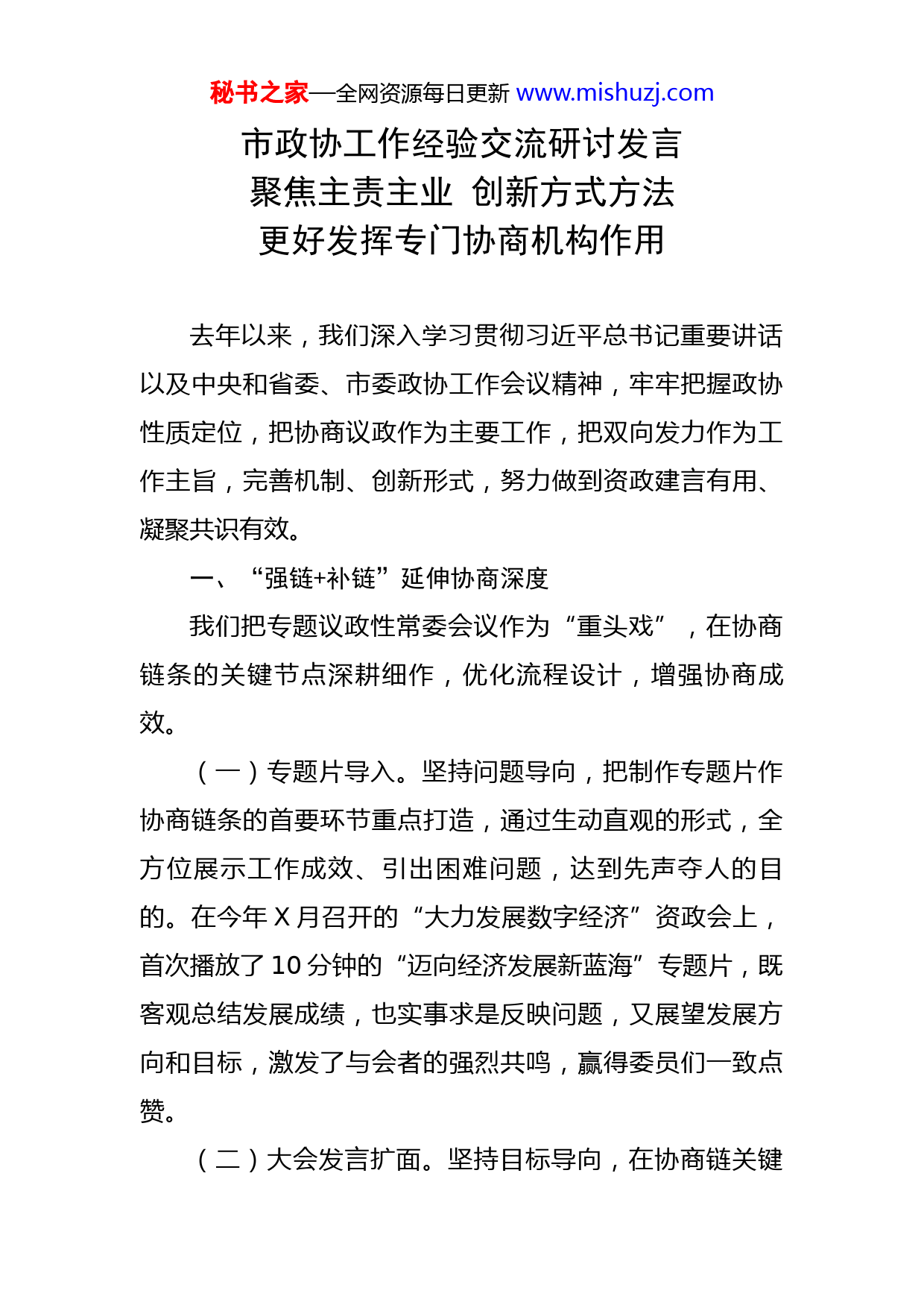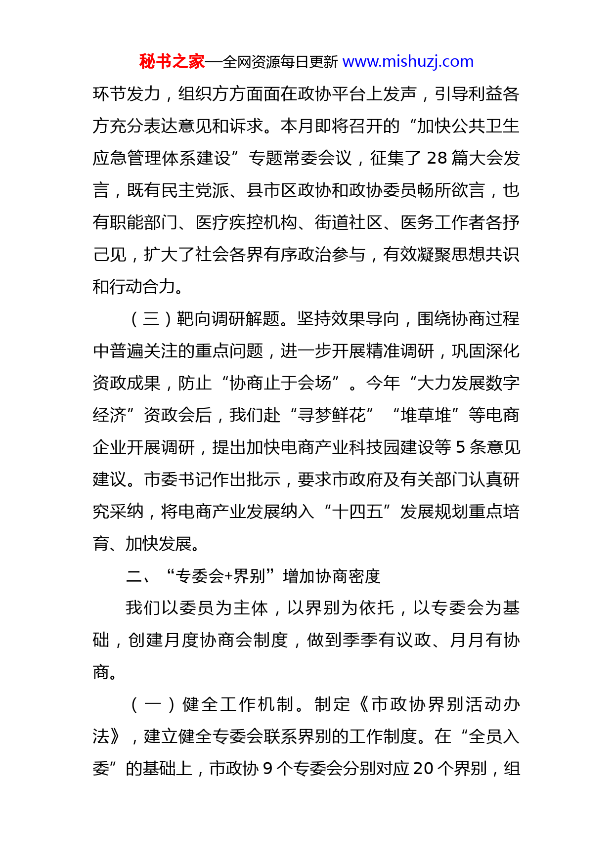 秘书之家—全网资源每日更新www.mishuzj.com市政协工作经验交流研讨发言聚焦主责主业创新方式方法更好发挥专门协商机构作用去年以来,我们深入学习贯彻习近平总书记重要讲话以及中央和省委、市委政协工作会议精神,牢牢把握政协性质定位,把协商议政作为主要工作,把双向发力作为工作主旨,完善机制、创新形式,努力做到资政建言有用、凝聚共识有效。一、“强链+补链”延伸协商深度我们把专题议政性常委会议作为“重头戏”,在协商链条的关键节点深耕细作,优化流程设计,增强协商成效。(一)专题片导入。坚持问题导向,把制作专题片作协商链条的首要环节重点打造,通过生动直观的形式,全方位展示工作成效、引出困难问题,达到先声夺人的目的。在今年X月召开的“大力发展数字经济”资政会上,首次播放了10分钟的“迈向经济发展新蓝海”专题片,既客观总结发展成绩,也实事求是反映问题,又展望发展方向和目标,激发了与会者的强烈共鸣,赢得委员们一致点赞。(二)大会发言扩面。坚持目标导向,在协商链关键秘书之家—全网资源每日更新www.mishuzj.com环节发力,组织方方面面在政协平台上发声,引导利益各方充分表达意见和诉求。本月即将召开的“加快公共卫生应急管理体系建设”专题常委会议,征集了28篇大会发言,既有民主党派、县市区政协和政协委员畅所欲言,也有职能部门、医疗疾控机构、街道社区、医务工作者各抒己见,扩大了社会各界有序政治参与,有效凝聚思想共识和行动合力。(三)靶向调研解题。坚持效果导向,围绕协商过程中普遍关注的重点问题,进一步开展精准调研,巩固深化资政成果,防止“协商止于会场”。今年“大力发展数字经济”资政会后,我们赴“寻梦鲜花”“堆草堆”等电商企业开展调研,提出加快电商产业科技园建设等5条意见建议。市委书记作出批示,要求市政府及有关部门认真研究采纳,将电商产业发展纳入“十四五”发展规划重点培育、加快发展。二、“专委会+界别”增加协商密度我们以委员为主体,以界别为依托,以专委会为基础,创建月度协商会制度,做到季季有议政、月月有协商。(一)健全工作机制。制定《市政协界别活动办法》,建立健全专委会联系界别的工作制度。在“全员入委”的基础上,市政协9个专委会分别对应20个界别,组秘书之家—全网资源每日更新www.mishuzj.com建9个界别联组,由专委会主任担任界别联组第一召集人,牵头开展界别履职活动,形成了“专委会+界别”工作机制,每年选取课题开展调研协商活动,推动专委会专业优势和界别特色优势相互叠加、相得益彰,着力打造特色履职品牌,形成“一委一品”。(二)健全组织机制。除提案委常态化开展提案办理协商外,其他8个专委会依据职能定位、自身特点,结合所联系的界别实际,从年度界别履职课题中,研究提出月度协商议题,经专委会会议讨论,报请市政协主席会议审定后,由分管主席牵头实施,各专委会具体承办。今年,确定的“提高招商引资质量”“沙石资源保护和利用”等8个协商议题,都是事关发展大局、深受群众关注的大事要事。(三)健全推进机制。各专委会强化履职质量意识,精心实施每项议题,力求“专”出特色、“商”出水平。在“家禽产业转型升级”月度协商活动中,农业农村委做细做深实地调研、分析论证、座谈交流等各环节,分别组织龙头企业、养殖农户、职能部门等各层面开展协商,形成的专题报告,市委书记作出大篇幅批示。目前,已开展的5次月度协商活动都达到了预期效果,得到市委市政府和社会各界的广泛认可。三、“课题+平台”拓展协商广度秘书之家—全网资源每日更新www.mishuzj.com我们深化和完善市县政协联动协商、基层协商、网络协商工作机制,推动政协协商向基层延伸、向网络拓展。(一)联动协商聚合力。制定市县政协联动协商实施办法,以课题为纽带,有效整合市县政协系统资源,协同开展调研协商、提案督办、委员基层行等活动,共建履职网络,共享履职成果。去年,我们围绕“一地六县”产业集中合作区建设,与郎溪县、X市政协开展联合调研,召开专题常委会议联动协商,形成综合调研报告,得到市委肯定。提炼协商成果,形成有关提案,通过省政协在全国“两会”上提交。(二)搭建平台促善治。按照不建机构建机制的思路,鼓励支持县市区政协在委员之家、委员工作室基础上,试点建立协商议事平台,围绕教育医疗、健康养老、创业就业等基层社会治理难事、群众切身利益实事,开展切口小、关联广的协商活动,着力把政协制度优势转化为参与基层治理的实际效能。目前,市政协正与X区政协共建“敬亭协商汇”平台,立足实际、积极探索,力争形成可复制可推广的鲜活经验。(三)网络议政增共识。制定市政协网络协商实施办法,探索网上主题议政、委员在线访谈、网络民意征集等“互联网+”履职新模式,积极运用网络信息技术传播共识、凝聚人心。上半年“大力发展数字经济”资政秘书之家—全网资源每日更新www.mishuzj.com会,XXX余人次参加网上议政,XXX多人发表意见。X月份发布的“加快公共卫生应急管理体系建设”网络问卷,仅医疗卫生系统就有XXX余人填写。近期,还将围绕“十四五”规划编制开展网络协商,问需于民、问计于民,为加快X发展凝心聚智。