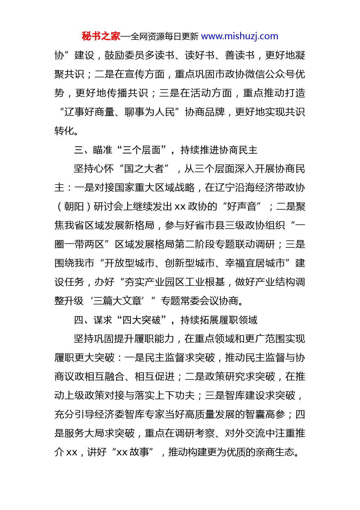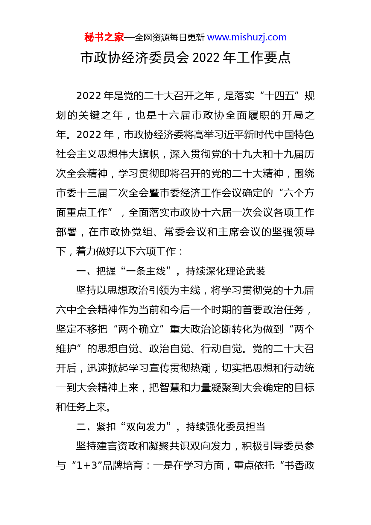 秘书之家—全网资源每日更新www.mishuzj.com市政协经济委员会2022年工作要点2022年是党的二十大召开之年,是落实“十四五”规划的关键之年,也是十六届市政协全面履职的开局之年。2022年,市政协经济委将高举习近平新时代中国特色社会主义思想伟大旗帜,深入贯彻党的十九大和十九届历次全会精神,学习贯彻即将召开的党的二十大精神,围绕市委十三届二次全会暨市委经济工作会议确定的“六个方面重点工作”,全面落实市政协十六届一次会议各项工作部署,在市政协党组、常委会议和主席会议的坚强领导下,着力做好以下六项工作:一、把握“一条主线”,持续深化理论武装坚持以思想政治引领为主线,将学习贯彻党的十九届六中全会精神作为当前和今后一个时期的首要政治任务,坚定不移把“两个确立”重大政治论断转化为做到“两个维护”的思想自觉、政治自觉、行动自觉。党的二十大召开后,迅速掀起学习宣传贯彻热潮,切实把思想和行动统一到大会精神上来,把智慧和力量凝聚到大会确定的目标和任务上来。二、紧扣“双向发力”,持续强化委员担当坚持建言资政和凝聚共识双向发力,积极引导委员参与“1+3”品牌培育:一是在学习方面,重点依托“书香政秘书之家—全网资源每日更新www.mishuzj.com协”建设,鼓励委员多读书、读好书、善读书,更好地凝聚共识;二是在宣传方面,重点巩固市政协微信公众号优势,更好地传播共识;三是在活动方面,重点推动打造“辽事好商量、聊事为人民”协商品牌,更好地实现共识转化。三、瞄准“三个层面”,持续推进协商民主坚持心怀“国之大者”,从三个层面深入开展协商民主:一是对接国家重大区域战略,在辽宁沿海经济带政协(朝阳)研讨会上继续发出xx政协的“好声音”;二是聚焦我省区域发展新格局,参与好省市县三级政协组织“一圈一带两区”区域发展格局第二阶段专题联动调研;三是围绕我市“开放型城市、创新型城市、幸福宜居城市”建设任务,办好“夯实产业园区工业根基,做好产业结构调整升级‘三篇大文章’”专题常委会议协商。四、谋求“四大突破”,持续拓展履职领域坚持巩固提升履职能力,在重点领域和更广范围实现履职更大突破:一是民主监督求突破,推动民主监督与协商议政相互融合、相互促进;二是政策研究求突破,在推动上级政策对接与落实上下功夫;三是智库建设求突破,充分引导经济委智库专家当好高质量发展的智囊高参;四是服务大局求突破,重点在调研考察、对外交流中注重推介xx,讲好“xx故事”,推动构建更为优质的亲商生态。秘书之家—全网资源每日更新www.mishuzj.com五、实施“五项创新”,持续激发工作活力坚持与时俱进、求新求变,一是创新党建工作,用好“党建+”的“源头活水”;二是创新调研考察,积极开展“企业百日大调研”活动,密集开展小分队调研;三是创新协商民主,积极探索网络议政、远程协商,邀请优秀商(协)会会长参与市政协相关协商活动;四是创新多元联动,有效串联相关职能部门、各民主党派和工商联、各县(市)区政协经济委,辐射广大经济界别委员;五是创新委员活动,重点丰富和活跃委员志愿服务活动和文化生活。六、立足“六方面工作”,持续汇聚发展合力坚持紧紧围绕市委决策部署,为我市项目建设、园区发展、扩大开放、营商环境建设、工作作风建设、从政环境建设“六个方面重点工作”提供政协“加速度”。重点放在项目建设上,一方面调研议政“规定动作”到位,另一方面引凤来栖“自选动作”出彩,努力营造“人人进入角色、人人置身项目建设主战场、人人成为项目建设行家里手”的浓厚氛围。