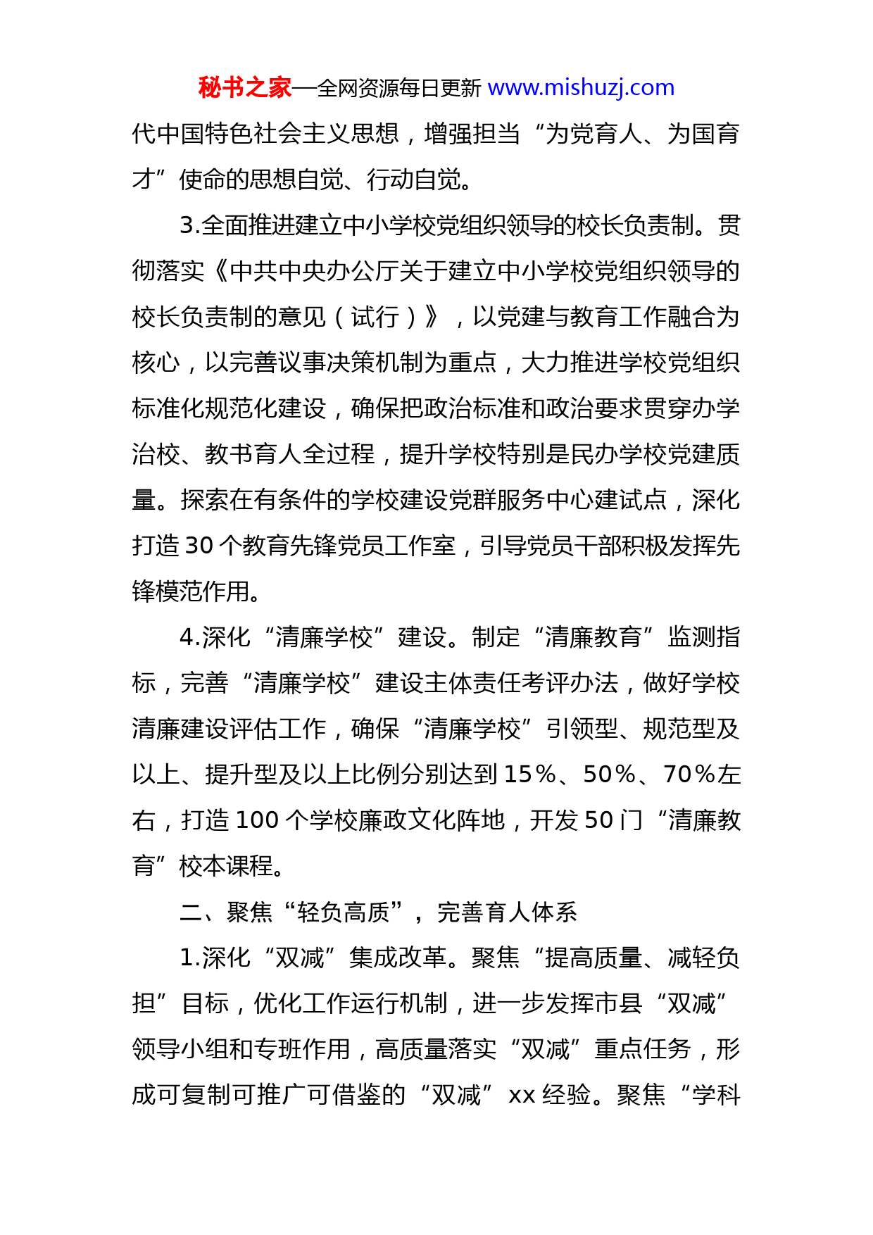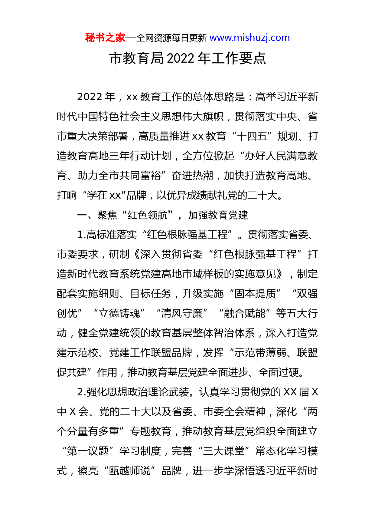 秘书之家—全网资源每日更新www.mishuzj.com市教育局2022年工作要点2022年,xx教育工作的总体思路是:高举习近平新时代中国特色社会主义思想伟大旗帜,贯彻落实中央、省市重大决策部署,高质量推进xx教育“十四五”规划、打造教育高地三年行动计划,全方位掀起“办好人民满意教育、助力全市共同富裕”奋进热潮,加快打造教育高地、打响“学在xx”品牌,以优异成绩献礼党的二十大。一、聚焦“红色领航”,加强教育党建1.高标准落实“红色根脉强基工程”。贯彻落实省委、市委要求,研制《深入贯彻省委“红色根脉强基工程”打造新时代教育系统党建高地市域样板的实施意见》,制定配套实施细则、目标任务,升级实施“固本提质”“双强创优”“立德铸魂”“清风守廉”“融合赋能”等五大行动,健全党建统领的教育基层整体智治体系,深入打造党建示范校、党建工作联盟品牌,发挥“示范带薄弱、联盟促共建”作用,推动教育基层党建全面进步、全面过硬。2.强化思想政治理论武装。认真学习贯彻党的XX届X中X会、党的二十大以及省委、市委全会精神,深化“两个分量有多重”专题教育,推动教育基层党组织全面建立“第一议题”学习制度,完善“三大课堂”常态化学习模式,擦亮“瓯越师说”品牌,进一步学深悟透习近平新时秘书之家—全网资源每日更新www.mishuzj.com代中国特色社会主义思想,增强担当“为党育人、为国育才”使命的思想自觉、行动自觉。3.全面推进建立中小学校党组织领导的校长负责制。贯彻落实《中共中央办公厅关于建立中小学校党组织领导的校长负责制的意见(试行)》,以党建与教育工作融合为核心,以完善议事决策机制为重点,大力推进学校党组织标准化规范化建设,确保把政治标准和政治要求贯穿办学治校、教书育人全过程,提升学校特别是民办学校党建质量。探索在有条件的学校建设党群服务中心建试点,深化打造30个教育先锋党员工作室,引导党员干部积极发挥先锋模范作用。4.深化“清廉学校”建设。制定“清廉教育”监测指标,完善“清廉学校”建设主体责任考评办法,做好学校清廉建设评估工作,确保“清廉学校”引领型、规范型及以上、提升型及以上比例分别达到15%、50%、70%左右,打造100个学校廉政文化阵地,开发50门“清廉教育”校本课程。二、聚焦“轻负高质”,完善育人体系1.深化“双减”集成改革。聚焦“提高质量、减轻负担”目标,优化工作运行机制,进一步发挥市县“双减”领导小组和专班作用,高质量落实“双减”重点任务,形成可复制可推广可借鉴的“双减”xx经验。聚焦“学科秘书之家—全网资源每日更新www.mishuzj.com类、非学科类培训”两类管理,推动校外培训机构纳入基层治理四平台和网格化管理,压实学科类培训机构公益属性,强化学科类培训时间、培训价格、预收费监管等工作,严厉打击隐形变异培训行为,积极稳妥推进学科类培训机构压减工作;推动非学科类培训机构归口业务主管部门管理,完善审批流程,强化日常监管;迭代升级xx民办教育智治应用,落实风险防范化解闭环化管理,及时发现和处置不稳定因素。聚焦学校“作业管理、教学质量、课后服务”等三个提高,深化实施中小学课堂变革第三轮行动,研制《素养课堂教学新设计》《中小学素养评价指南》等教学指导政策,健全作业全过程精准研究机制,探索跨学科、项目化、实践型作业,进一步减轻学生作业负担;推进全国基础教育教学优秀成果推广应用示范区、“指向核心素养”项目学习改革示范区建设,完成100个教育教学质量提升课题研究应用,升级“xx智慧教学系统应用分析”平台,提升教育科研、考试管理质效,推进精准教学,确保xx教育教学质量稳居全省第一方阵;健全家校社协同育人机制,举办全市课后服务工作现场推进会,推广共享课后服务优秀案例,遴选非学科类校外培训资源参与学校课后服务,联动提供更多课后公益服务、优质服务、特色服务。2.强化思政育人。以“价值观引领未来”工程为主载秘书之家—全网资源每日更新www.mishuzj.com体,健全青少年理想信念教育齐抓共管机制,进一步加强大中小幼思政育人一体化体系建设,广泛深入开展“四史”和中华传统优秀文化教育,引导学生厚植爱国主义情怀,深入打造新时代思政育人区域样板。完善“三全四课五育”评价机制,建设xx德育数字化平台,构建“互联网+德育”评价体系,持续加强班主任等德育教师队伍建设。推进高校“思政云”建设,扩大优质线上思政资源共享面。推动高校建强思政课专任教师、辅导员队伍,打造10支市级思政课教学创新团队,立项建设20个高校市级名班主任工作室,培育35个高校市级思政工作室。聚焦思政协同,推进数字家长学校建设,完善家庭教育指导服务体系,擦亮“新雨”家庭教育公益品牌,广泛宣传学习《未成年人保护法》《家庭教育促进法》等法律法规,保障儿童青少年健康成长。3.实施“强身健心育美”工程。聚焦“强身”,升级学生健康管理信息平台,精准分析市、县、校、生四级数据,督促各校刚性落实中小学生校内校外体育锻炼要求,确保中小学生、温籍高校新生体质健康合格率稳中有进;结合北京冬奥会、杭州亚运会等国际运动盛会,加强体教融合教育,进一步普及阳光体育运动,全面营造强身健体浓厚氛围;推进全国儿童青少年视力