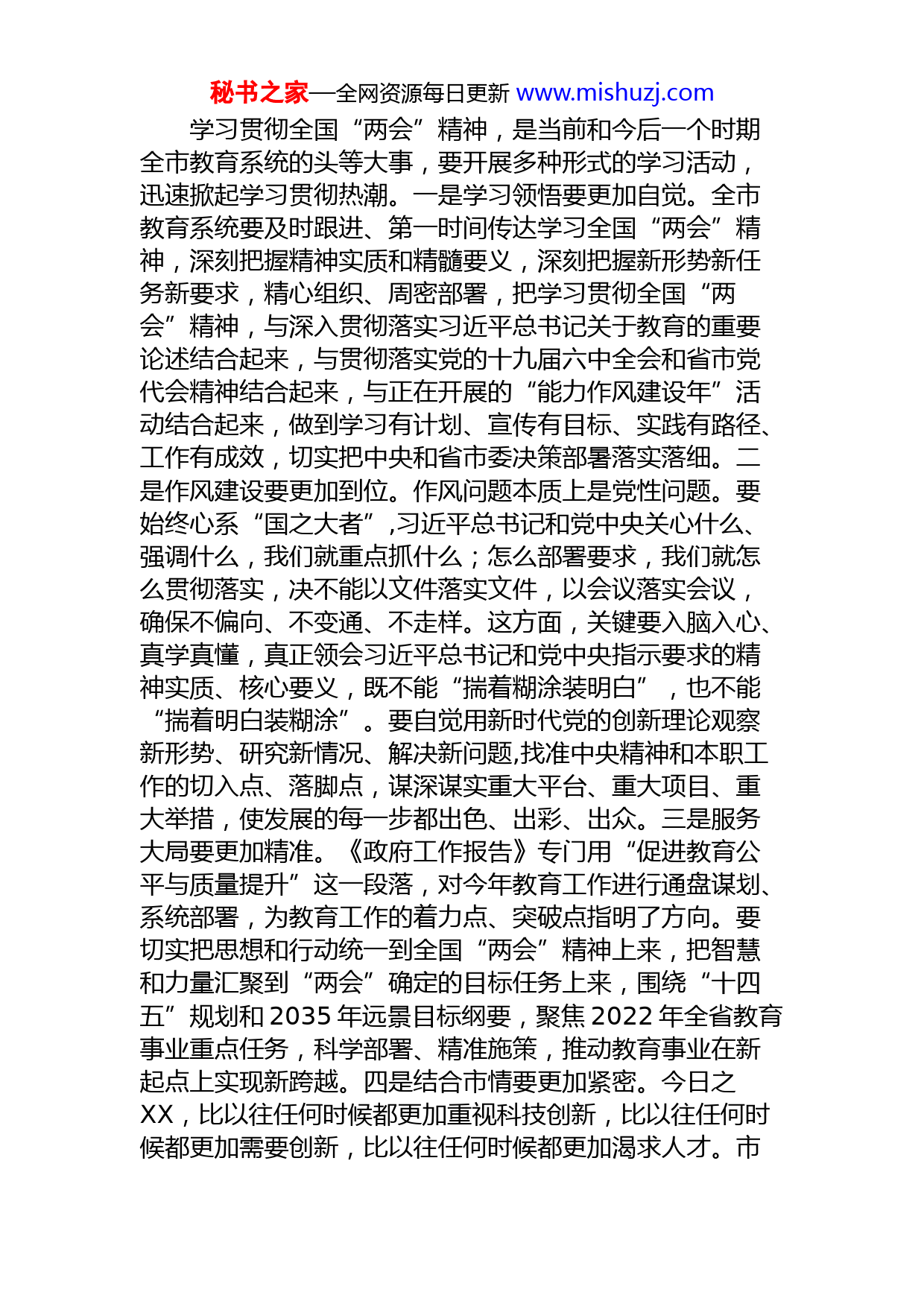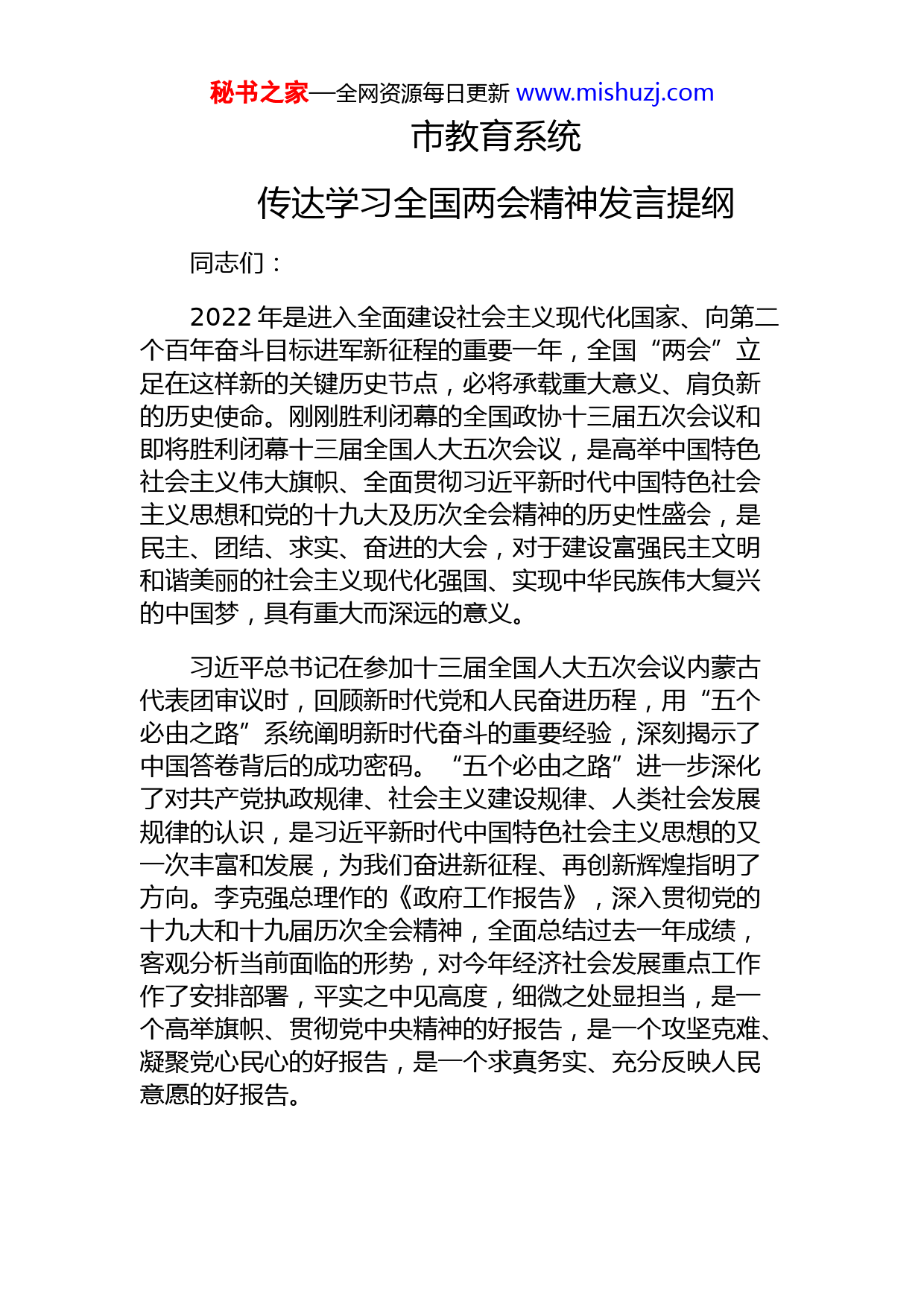 秘书之家—全网资源每日更新www.mishuzj.com市教育系统传达学习全国两会精神发言提纲同志们:2022年是进入全面建设社会主义现代化国家、向第二个百年奋斗目标进军新征程的重要一年,全国“两会”立足在这样新的关键历史节点,必将承载重大意义、肩负新的历史使命。刚刚胜利闭幕的全国政协十三届五次会议和即将胜利闭幕十三届全国人大五次会议,是高举中国特色社会主义伟大旗帜、全面贯彻习近平新时代中国特色社会主义思想和党的十九大及历次全会精神的历史性盛会,是民主、团结、求实、奋进的大会,对于建设富强民主文明和谐美丽的社会主义现代化强国、实现中华民族伟大复兴的中国梦,具有重大而深远的意义。习近平总书记在参加十三届全国人大五次会议内蒙古代表团审议时,回顾新时代党和人民奋进历程,用“五个必由之路”系统阐明新时代奋斗的重要经验,深刻揭示了中国答卷背后的成功密码。“五个必由之路”进一步深化了对共产党执政规律、社会主义建设规律、人类社会发展规律的认识,是习近平新时代中国特色社会主义思想的又一次丰富和发展,为我们奋进新征程、再创新辉煌指明了方向。李克强总理作的《政府工作报告》,深入贯彻党的十九大和十九届历次全会精神,全面总结过去一年成绩,客观分析当前面临的形势,对今年经济社会发展重点工作作了安排部署,平实之中见高度,细微之处显担当,是一个高举旗帜、贯彻党中央精神的好报告,是一个攻坚克难、凝聚党心民心的好报告,是一个求真务实、充分反映人民意愿的好报告。秘书之家—全网资源每日更新www.mishuzj.com学习贯彻全国“两会”精神,是当前和今后一个时期全市教育系统的头等大事,要开展多种形式的学习活动,迅速掀起学习贯彻热潮。一是学习领悟要更加自觉。全市教育系统要及时跟进、第一时间传达学习全国“两会”精神,深刻把握精神实质和精髓要义,深刻把握新形势新任务新要求,精心组织、周密部署,把学习贯彻全国“两会”精神,与深入贯彻落实习近平总书记关于教育的重要论述结合起来,与贯彻落实党的十九届六中全会和省市党代会精神结合起来,与正在开展的“能力作风建设年”活动结合起来,做到学习有计划、宣传有目标、实践有路径、工作有成效,切实把中央和省市委决策部暑落实落细。二是作风建设要更加到位。作风问题本质上是党性问题。要始终心系“国之大者”,习近平总书记和党中央关心什么、强调什么,我们就重点抓什么;怎么部署要求,我们就怎么贯彻落实,决不能以文件落实文件,以会议落实会议,确保不偏向、不变通、不走样。这方面,关键要入脑入心、真学真懂,真正领会习近平总书记和党中央指示要求的精神实质、核心要义,既不能“揣着糊涂装明白”,也不能“揣着明白装糊涂”。要自觉用新时代党的创新理论观察新形势、研究新情况、解决新问题,找准中央精神和本职工作的切入点、落脚点,谋深谋实重大平台、重大项目、重大举措,使发展的每一步都出色、出彩、出众。三是服务大局要更加精准。《政府工作报告》专门用“促进教育公平与质量提升”这一段落,对今年教育工作进行通盘谋划、系统部署,为教育工作的着力点、突破点指明了方向。要切实把思想和行动统一到全国“两会”精神上来,把智慧和力量汇聚到“两会”确定的目标任务上来,围绕“十四五”规划和2035年远景目标纲要,聚焦2022年全省教育事业重点任务,科学部署、精准施策,推动教育事业在新起点上实现新跨越。四是结合市情要更加紧密。今日之XX,比以往任何时候都更加重视科技创新,比以往任何时候都更加需要创新,比以往任何时候都更加渴求人才。市秘书之家—全网资源每日更新www.mishuzj.com委市政府以前所未有的力度和举措谋划推动教育事业发展,我市教育事业迎来了难得的历史机遇期。全市教育系统要真正知责于心、担责于身、履责于行,以时不我待的紧迫感和只争朝夕的使命感,努力把全国“两会”的“规划图”变成干事创业的“施工图”,实现高等教育起高峰、职业教育建高地、基础教育促优质。五是政治本色要更加清廉。在为谁执政、为谁用权、为谁谋利这个根本问题上,头脑要特别清醒、立场要特别坚定。要严守党纪国法的红线,坚持权由法定、权依法使,经常对照党的理论和路线方针政策、对照党章党规党纪保、对照初心使命反思自我、检视言行,以内无妄思保证外无妄动。要把握“亲”“清”;有度的界线。严把公私标尺;坦荡真诚同企业接触交往,积极主动、依法依规解决企业合理诉求,做到有交集不交换、有交往不交易,不能亲近而不清楚,或清楚而不亲近,只要一心为民为企,“亲”“清”就能坦坦荡荡。要筑牢修身正已的防线。牢记“清廉是福、贪欲是祸”的道理,坚决克服特权思想,看重职责,看轻职位,工作多向高标准看,生活多向困难群众看,比干事不比待遇,比奉献不比职务,比业绩不比排场,比作风不比享受,严格教育管理亲属子女和身边工作人员,保持共产党人的风骨、气节、操守。六是宣传贯彻要更加有力。下一步,要持续深入学习全国“两会”精神,督促教育系统各级党组织,采取党委(党组)会、中心组学习会、干部职工会等多种形式,把全国“两会”精神传达到每一级领导班子、每一名党员干部、每一位师生员