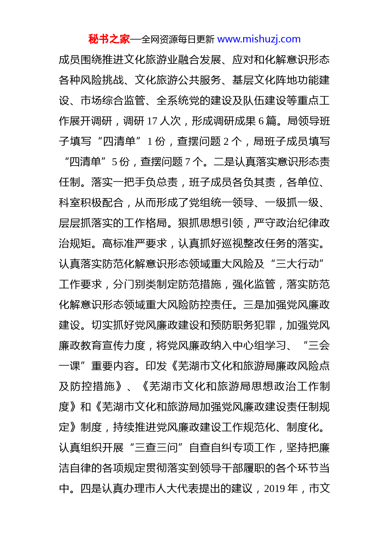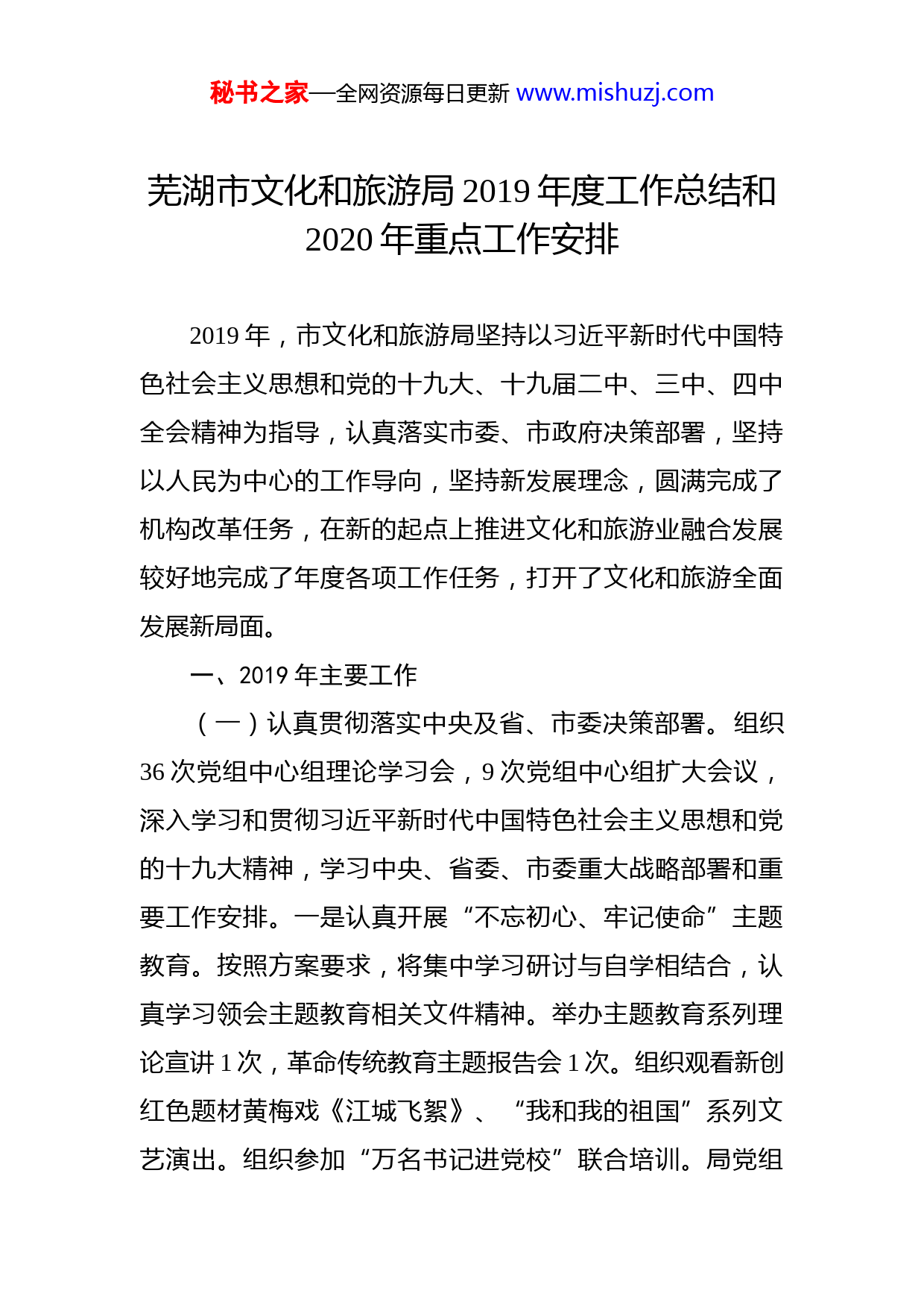 秘书之家—全网资源每日更新www.mishuzj.com芜湖市文化和旅游局2019年度工作总结和2020年重点工作安排2019年,市文化和旅游局坚持以习近平新时代中国特色社会主义思想和党的十九大、十九届二中、三中、四中全会精神为指导,认真落实市委、市政府决策部署,坚持以人民为中心的工作导向,坚持新发展理念,圆满完成了机构改革任务,在新的起点上推进文化和旅游业融合发展较好地完成了年度各项工作任务,打开了文化和旅游全面发展新局面。一、2019年主要工作(一)认真贯彻落实中央及省、市委决策部署。组织36次党组中心组理论学习会,9次党组中心组扩大会议,深入学习和贯彻习近平新时代中国特色社会主义思想和党的十九大精神,学习中央、省委、市委重大战略部署和重要工作安排。一是认真开展“不忘初心、牢记使命”主题教育。按照方案要求,将集中学习研讨与自学相结合,认真学习领会主题教育相关文件精神。举办主题教育系列理论宣讲1次,革命传统教育主题报告会1次。组织观看新创红色题材黄梅戏《江城飞絮》、“我和我的祖国”系列文艺演出。组织参加“万名书记进党校”联合培训。局党组秘书之家—全网资源每日更新www.mishuzj.com成员围绕推进文化旅游业融合发展、应对和化解意识形态各种风险挑战、文化旅游公共服务、基层文化阵地功能建设、市场综合监管、全系统党的建设及队伍建设等重点工作展开调研,调研17人次,形成调研成果6篇。局领导班子填写“四清单”1份,查摆问题2个,局班子成员填写“四清单”5份,查摆问题7个。二是认真落实意识形态责任制。落实一把手负总责,班子成员各负其责,各单位、科室积极配合,从而形成了党组统一领导、一级抓一级、层层抓落实的工作格局。狠抓思想引领,严守政治纪律政治规矩。高标准严要求,认真抓好巡视整改任务的落实。认真落实防范化解意识形态领域重大风险及“三大行动”工作要求,分门别类制定防范措施,强化监管,落实防范化解意识形态领域重大风险防控责任。三是加强党风廉政建设。切实抓好党风廉政建设和预防职务犯罪,加强党风廉政教育宣传力度,将党风廉政纳入中心组学习、“三会一课”重要内容。印发《芜湖市文化和旅游局廉政风险点及防控措施》、《芜湖市文化和旅游局思想政治工作制度》和《芜湖市文化和旅游局加强党风廉政建设责任制规定》制度,持续推进党风廉政建设工作规范化、制度化。认真组织开展“三查三问”自查自纠专项工作,坚持把廉洁自律的各项规定贯彻落实到领导干部履职的各个环节当中。四是认真办理市人大代表提出的建议,2019年,市文秘书之家—全网资源每日更新www.mishuzj.com化和旅游局共办理人大代表建议16件,均按时办理回复。(二)加快文化旅游业融合发展。根据市委统一部署,迅速启动并圆满完成机构改革各项工作任务,加强政策研究和工作谋划,厘清工作思路。组织召开了全市旅游业发展大会暨“一体两翼”工作推进会,进一步明确了文化和旅游业产城融合、产业融合发展新思路、新举措。成立了全市文化旅游业发展联盟,制定印发《芜湖市人民政府关于促进旅游业高质量发展打造长三角文旅新热点的意见》《关于推动文化旅游产业高质量发展工作方案》,完成了《芜湖市乡村旅游聚集区发展专项规划》,印发《芜湖市促进乡村旅游提升发展的意见》、《关于促进乡村民宿发展实施意见》和《芜湖市休闲农业与乡村旅游示范镇村的评比办法》,全面系统推进全域旅游发展,积极打造长三角区域文化旅游新热点。积极参与“十里江湾”夜景工程组织指导方特旅游区、新华联文化旅游公司等重点景区策划夜游项目,推出文化旅游演艺、音乐节、冰雪世界、灯光秀等多种形式的夜游旅游产品,其中方特1895音乐节,单日接待游客量达9.8万人次,掀起了芜湖夜游经济发展新篇章,打造“欢乐芜湖”旅游新亮点。助力芜湖夜间经济发展,积极对接国家文化和旅游部、中国旅游研究院、省文化和旅游厅,配合市政府成功组织举办了中国首届夜间经济论坛,进一步提升了“欢乐芜湖”城市影响力。推进秘书之家—全网资源每日更新www.mishuzj.com乡村旅游扶贫。争取省旅游发展专项资金30万元,用于无为县3个国家乡村旅游扶贫重点村“八个一”旅游基础设施建设,完成三个村的旅游规划编制工作。组织全市重点AAAA级以上旅游景区、五星级农家乐及其它旅游企业、单位与贫困村结对共建,助推旅游扶贫工作取得实效。(三)组织庆祝新中国成立70周年文化和旅游庆典活动。一是策划开展丰富多彩的文化活动。在“渡江第一船”登陆地繁昌县举办了纪念渡江战役胜利70周年大型音诗舞专题“永远的风帆”文艺演出;组织“我和我的祖国”芜湖市庆祝中华人民共和国成立70周年大型音舞诗画专场演出;组织“我和我的祖国”第六届芜湖市新剧目展演,组织“我和我的祖国”第十一届芜湖市社区文艺展演在市美术馆举办“建国70周年系列书画展”;联合芜湖传媒集团组织开展“我和我的祖国”芜湖市广场舞大赛等。全市开展庆祝活动近300场。二是加强文艺精品打造。黄梅戏《江城飞絮》入选2019年度安徽省戏曲孵化计划新创大戏项目(全省共9部),黄梅戏《巧帮扶》入选新创小戏项目。芜湖县黄梅戏剧团入选2018-2019年度全省民营艺术院团“十大