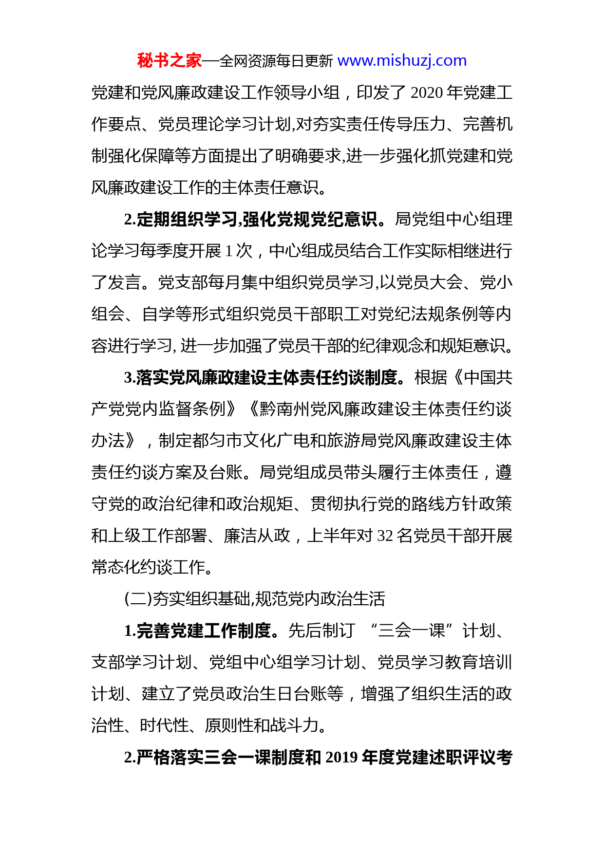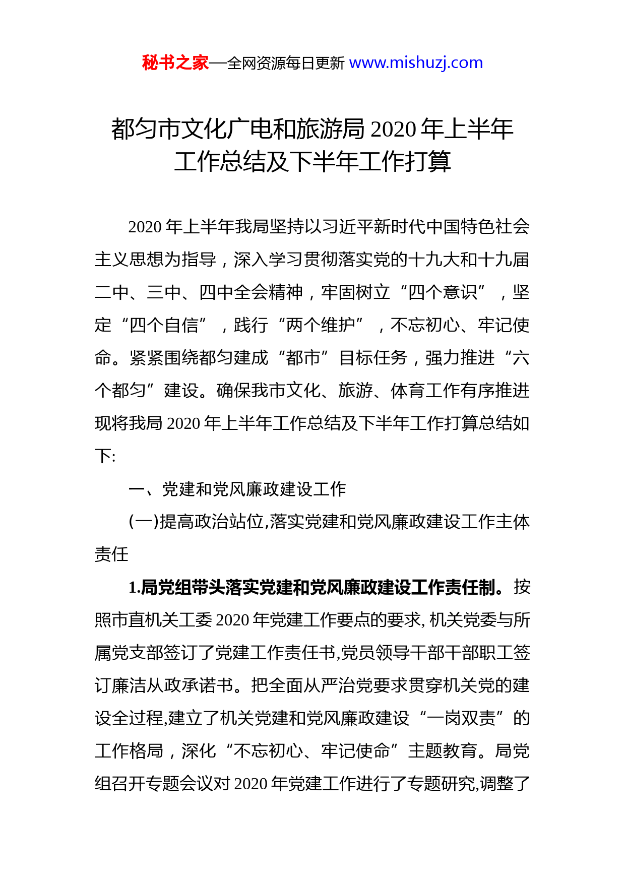 秘书之家—全网资源每日更新www.mishuzj.com都匀市文化广电和旅游局2020年上半年工作总结及下半年工作打算2020年上半年我局坚持以习近平新时代中国特色社会主义思想为指导,深入学习贯彻落实党的十九大和十九届二中、三中、四中全会精神,牢固树立“四个意识”,坚定“四个自信”,践行“两个维护”,不忘初心、牢记使命。紧紧围绕都匀建成“都市”目标任务,强力推进“六个都匀”建设。确保我市文化、旅游、体育工作有序推进现将我局2020年上半年工作总结及下半年工作打算总结如下:一、党建和党风廉政建设工作(一)提高政治站位,落实党建和党风廉政建设工作主体责任1.局党组带头落实党建和党风廉政建设工作责任制。按照市直机关工委2020年党建工作要点的要求,机关党委与所属党支部签订了党建工作责任书,党员领导干部干部职工签订廉洁从政承诺书。把全面从严治党要求贯穿机关党的建设全过程,建立了机关党建和党风廉政建设“一岗双责”的工作格局,深化“不忘初心、牢记使命”主题教育。局党组召开专题会议对2020年党建工作进行了专题研究,调整了秘书之家—全网资源每日更新www.mishuzj.com党建和党风廉政建设工作领导小组,印发了2020年党建工作要点、党员理论学习计划,对夯实责任传导压力、完善机制强化保障等方面提出了明确要求,进一步强化抓党建和党风廉政建设工作的主体责任意识。2.定期组织学习,强化党规党纪意识。局党组中心组理论学习每季度开展1次,中心组成员结合工作实际相继进行了发言。党支部每月集中组织党员学习,以党员大会、党小组会、自学等形式组织党员干部职工对党纪法规条例等内容进行学习,进一步加强了党员干部的纪律观念和规矩意识。3.落实党风廉政建设主体责任约谈制度。根据《中国共产党党内监督条例》《黔南州党风廉政建设主体责任约谈办法》,制定都匀市文化广电和旅游局党风廉政建设主体责任约谈方案及台账。局党组成员带头履行主体责任,遵守党的政治纪律和政治规矩、贯彻执行党的路线方针政策和上级工作部署、廉洁从政,上半年对32名党员干部开展常态化约谈工作。(二)夯实组织基础,规范党内政治生活1.完善党建工作制度。先后制订“三会一课”计划、支部学习计划、党组中心组学习计划、党员学习教育培训计划、建立了党员政治生日台账等,增强了组织生活的政治性、时代性、原则性和战斗力。2.严格落实三会一课制度和2019年度党建述职评议考秘书之家—全网资源每日更新www.mishuzj.com核等工作。(1)局党组成员按“一岗双责”制度抓好所分管科室、馆(中心、队)党的基层组织建设工作,按时开展党内组织生活会。局长龙磊同志联系文化馆支部,副局长肖文红同志联系图书馆支部,副局长徐仕敏同志联系机关支部,执法队队长李发荣同志联系离退休支部。各基层组织在上半年已召开6次支委会、2次党员大会、6次党小组会、6次主题党日活动,局党组书记、局长龙磊同志上党课1次,与党员普遍开展谈心谈话活动。(2)组织召开2019年度市文广旅局党建述职评议考核工作会议。局党组班子成员、各支部书记、各科室负责人、了解基层党建工作情况的“两代表一委员”和基层党员干部群众代表参加了会议。会上党委书记和各支部书记对2019年度抓党建工作情况进行了述职,局党委书记根据平时掌握和会前调研了解的情况,逐一进行了点评,与会人员进行了现场测评,分为好、较好、一般、较差4个等次作出了评价。(3)抓好党费收缴和管理工作。严格按照党费收缴管理制度的有关规定,重新计算每个党员应缴纳的党费,按月收缴党费并及时公开。(三)党员干部主动走到前台,站到一线,作表率,尽职尽责抗击疫情秘书之家—全网资源每日更新www.mishuzj.com各基层党组织和党员干部在坚决打赢疫情防控阻击战“走前列、作表率”,深化“三亮一创”充分组织在职党员和国家公职人员全力投入城市社区做好疫情防控工作。党员干部讲政治顾大局、讲规矩守纪律、讲奉献作示范,面对新型冠状病毒感染的肺炎疫情,各基层党组织和广大党员干部深入学习贯彻习近平总书记对新型冠状病毒感染的肺炎疫情作出的重要指示精神,按照党中央决策部署和省州市工作安排,在市委市政府的统一领导下,充分认识做好疫情防控工作的极端重要性和紧迫性,以对人民高度负责的工作态度,充分发挥好基层党组织的政治优势、组织优势和密切联系群众优势,真正担负起组织动员群众、群策群力防控疫情的重大政治责任,有效配合各职能部门落细落实防控要求,全力以赴、科学有效做好各项工作,在坚决打赢疫情防控攻坚战中践行初心使命、体现责任担当。二、文化工作(一)非物质文化遗产保护工作情况1.积极开展日常保护工作。根据《中华人民共和国非物质文化遗产法》《贵州省非物质文化遗产保护条例》,对都匀市非物质文化遗产的项目和传承人进行核对梳理,进一步完善我市非物质文化遗产项目档案数据。2.认真筛选项目和传承人,做好推行上报工作。积极开秘书之家—全网资源每日更新www.mishuzj.com展申报第五批省级非物质文化遗产代表性传承人申报工作目前完成6人的申报材料提交给州级审核,目前等待上报评审中。3.开展第五批市级非遗代表性项目和传承人调查申报工作。对全市现有的非遗项