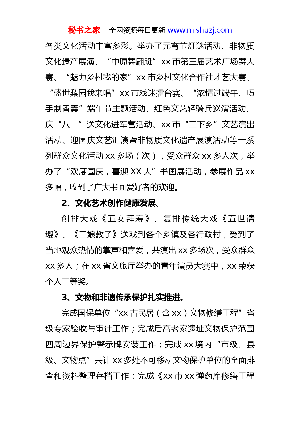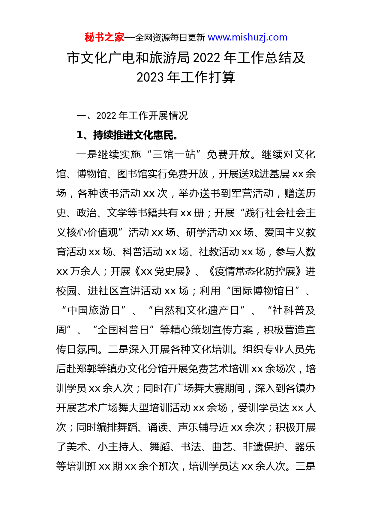 秘书之家—全网资源每日更新www.mishuzj.com市文化广电和旅游局2022年工作总结及2023年工作打算一、2022年工作开展情况1、持续推进文化惠民。一是继续实施“三馆一站”免费开放。继续对文化馆、博物馆、图书馆实行免费开放,开展送戏进基层xx余场,各种读书活动xx次,举办送书到军营活动,赠送历史、政治、文学等书籍共有xx册;开展“践行社会社会主义核心价值观”活动xx场、研学活动xx场、爱国主义教育活动xx场、科普活动xx场、社教活动xx场,参与人数xx万余人;开展《xx党史展》、《疫情常态化防控展》进校园、进社区宣讲活动xx场;利用“国际博物馆日”、“中国旅游日”、“自然和文化遗产日”、“社科普及周”、“全国科普日”等精心策划宣传方案,积极营造宣传日氛围。二是深入开展各种文化培训。组织专业人员先后赴郑郭等镇办文化分馆开展免费艺术培训xx余场次,培训学员xx余人次;同时在广场舞大赛期间,深入到各镇办开展艺术广场舞大型培训活动xx余场,受训学员达xx人次;同时编排舞蹈、诵读、声乐辅导近xx余次;积极开展了美术、小主持人、舞蹈、书法、曲艺、非遗保护、器乐等培训班xx期xx余个班次,培训学员达xx余人次。三是秘书之家—全网资源每日更新www.mishuzj.com各类文化活动丰富多彩。举办了元宵节灯谜活动、非物质文化遗产展演、“中原舞翩跹”xx市第三届艺术广场舞大赛、“魅力乡村我的家”xx市乡村文化合作社才艺大赛、“盛世梨园我来唱”xx市戏迷擂台赛、“浓情过端午、巧手制香囊”端午节主题活动、红色文艺轻骑兵巡演活动、庆“八一”送文化进军营活动、xx市“三下乡”文艺演出活动、迎国庆文艺汇演暨非物质文化遗产展演活动等一系列群众文化活动xx多场(次),受众群众xx多人次,举办了“欢度国庆,喜迎XX大”书画展活动,参展作品xx多幅,收到了广大书画爱好者的欢迎。2、文化艺术创作健康发展。创排大戏《五女拜寿》、复排传统大戏《五世请缨》、《三娘教子》送戏到各个乡镇及各行政村,受到了当地观众热情的掌声和喜爱,共演出xx多场次,受众群众xx多人;在xx省文旅厅举办的青年演员大赛中,xx荣获个人二等奖。3、文物和非遗传承保护扎实推进。完成国保单位“xx古民居(含xx)文物修缮工程”省级专家验收与审计工作;完成后高老家遗址文物保护范围四周边界保护警示牌安装工作;完成xx境内“市级、县级、文物点”共计xx多处不可移动文物保护单位的全面排查和资料整理存档工作;完成《xx市xx弹药库修缮工程秘书之家—全网资源每日更新www.mishuzj.com设计方案》编制和《xx安防设计方案》编制与系统上传工作;完成了xx省红色标语革命类文物资源专项调查工作;完成“xx墓”第五批xx市文物保护单位申报工作;新增市公安局移交文物xx件、社会人士捐赠藏品xx件;完成xx县级文物保护单位xx处石碑标识牌和xx处安全责任公示牌安装工作;组织人员参与各级文物专业知识培训xx次。开展非物质文化遗产展演活动xx次,举办各类非遗培训班xx余次,参加培训学习近千人;印发宣传单xx万份;积极开展了我市范围内非物质文化遗产资源的挖掘整理工作,截止目前,新普查非遗线索xx余条。4、细化文旅文创融合战略,文化旅游产业事业稳步发展。一是按照市委、市政府提出“三城两高地一家园”发展定位,把建设历史文化名城作为重要战略目标,政府工作报告把文旅文创工作作为重要环节进行安排部署,重点谋划了投资xx亿元的xx片区建设项目、投资xx亿元的xx片区建设项目、投资xx亿元的xx1983科创小镇建设项目、投资xx亿元的群众文化艺术中心项目、投资xx亿元的xx古民居综合建设提升项目、投资xx亿元的南北大街仿古商业改造项目等xx个文旅项目;成立了xx市融合文化旅游发展有限公司;总投资xx万元的“xx市杂技艺秘书之家—全网资源每日更新www.mishuzj.com术发展中心”建设项目主体工程已完成,对发扬xx省非物质文化遗产“xx杂技”文化、打造xx杂技品牌、提升城市文化品位具有重要意义。二是为推进文旅文创融合战略的实施,xx市把战略写进了“十四五”规划纲要和党代会、人代会报告,作为推动经济社会发展的重要抓手,编制文旅文创融合战略六部分xx项,明确了责任单位和具体实施内容。目前,各项工作正在细化和有序实施,如文创产品研发迈出了大步伐,并向全产业深入性展开,把xx的民间传统工艺、非遗等统筹起来,围绕“礼遇xx”、“重瞳之韵”品牌研发了文房四宝、书签、香具套装、音响礼盒等xx余种文创产品和xx多种农业、工业产品,产生了良好的经济和社会效益。5、抓好省重点项目沙颍河生态经济带建设,快速推进项目进展。我市沙颍河生态经济带建设自去年10月份启动以来,按照xx市提出的把xx河打造成经济河、文化河、生态河、开放河、幸福河的要求,结合我市实际,进一步提出通城区、通乡镇、通景区、融产业“三通一融”发展目标,制定了xx段建设总体规划,计划总投资xx亿元,已完成投资xx万元。已完成了xx登岸处建设,堤顶道路建设、路灯安装、绿化和红高粱种植等工作。规划了游客服务中心、旅游公厕、驿站、儿童游乐中心等xx个节点,计秘书之家—全网资源每日更新www.mishuzj.com划通过引入社会资本和申请政府专项债的方式进行建设。同时持续完善景观带与城区、乡镇和景区的交通连接、产业融合
