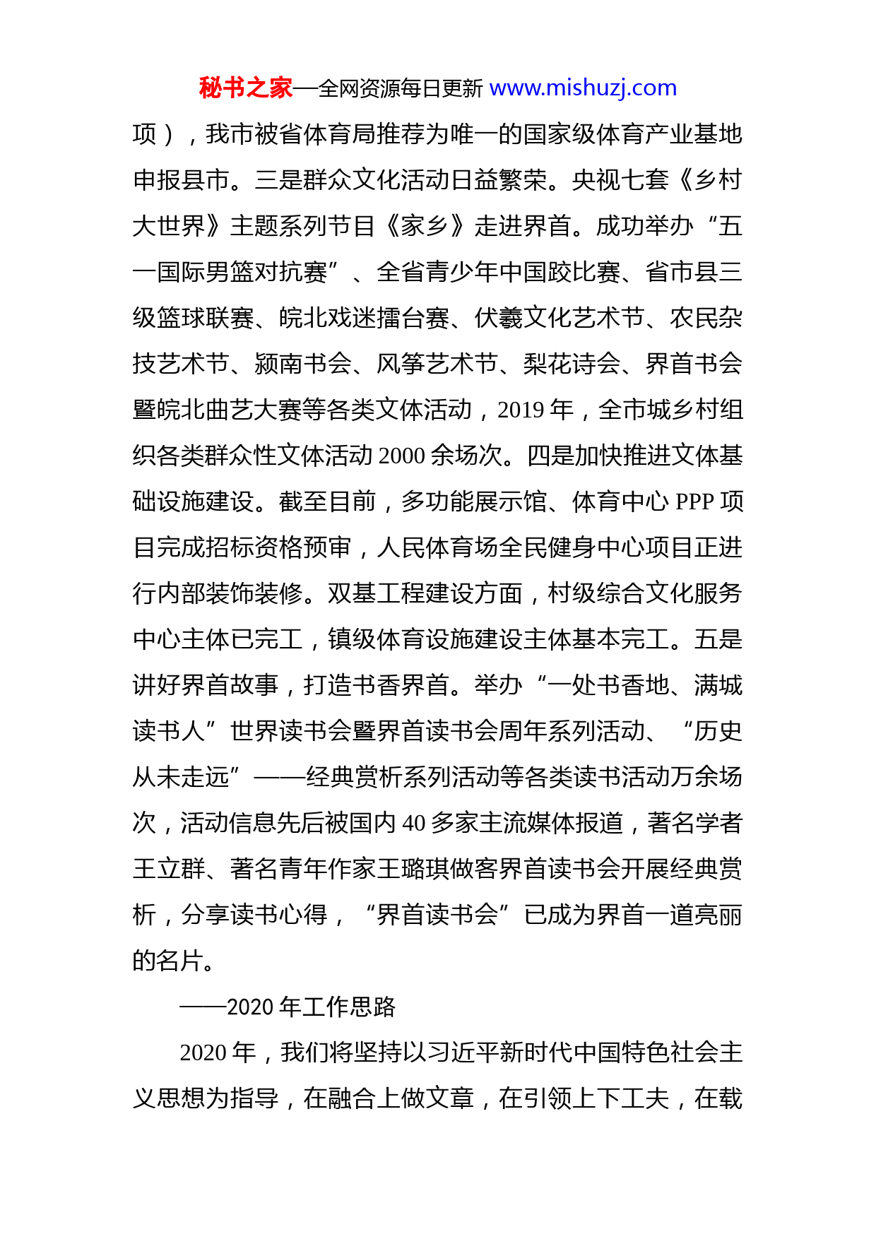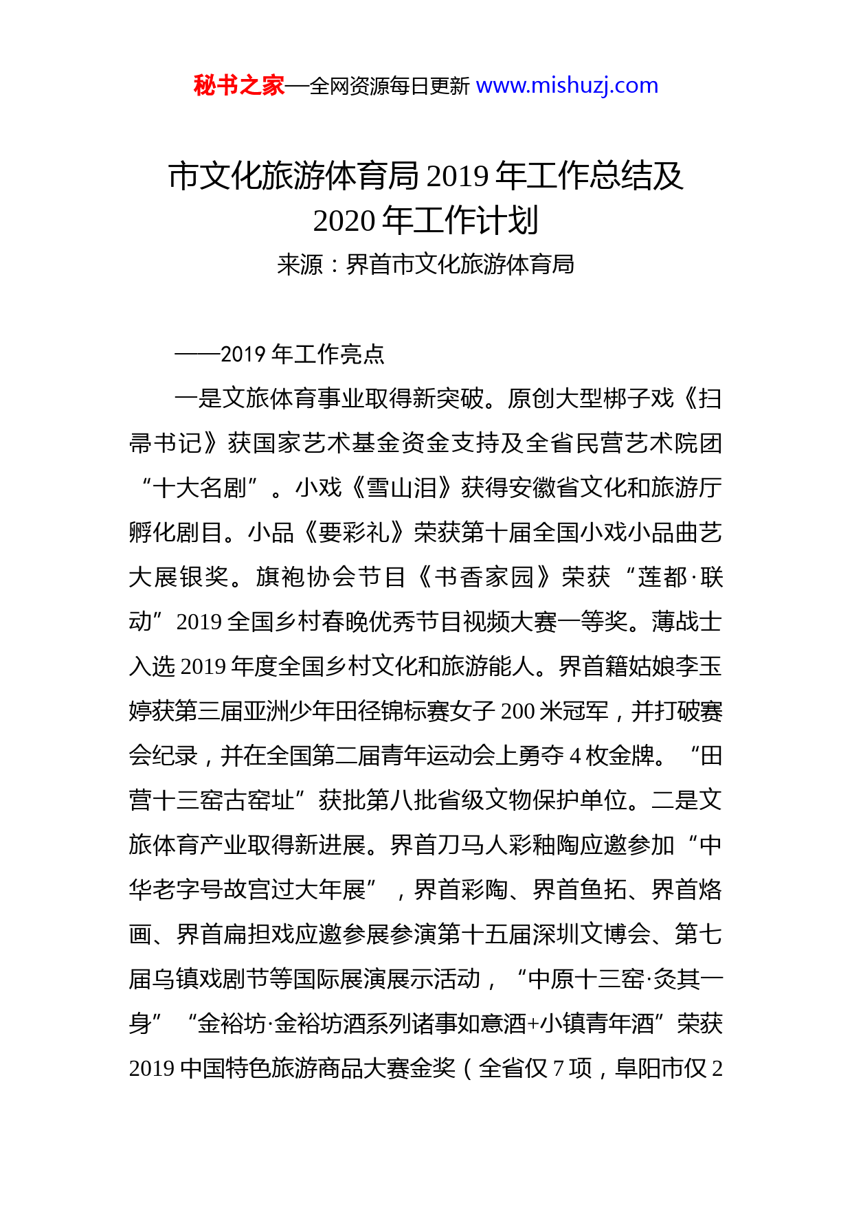 秘书之家—全网资源每日更新www.mishuzj.com市文化旅游体育局2019年工作总结及2020年工作计划来源:界首市文化旅游体育局——2019年工作亮点一是文旅体育事业取得新突破。原创大型梆子戏《扫帚书记》获国家艺术基金资金支持及全省民营艺术院团“十大名剧”。小戏《雪山泪》获得安徽省文化和旅游厅孵化剧目。小品《要彩礼》荣获第十届全国小戏小品曲艺大展银奖。旗袍协会节目《书香家园》荣获“莲都·联动”2019全国乡村春晚优秀节目视频大赛一等奖。薄战士入选2019年度全国乡村文化和旅游能人。界首籍姑娘李玉婷获第三届亚洲少年田径锦标赛女子200米冠军,并打破赛会纪录,并在全国第二届青年运动会上勇夺4枚金牌。“田营十三窑古窑址”获批第八批省级文物保护单位。二是文旅体育产业取得新进展。界首刀马人彩釉陶应邀参加“中华老字号故宫过大年展”,界首彩陶、界首鱼拓、界首烙画、界首扁担戏应邀参展参演第十五届深圳文博会、第七届乌镇戏剧节等国际展演展示活动,“中原十三窑·灸其一身”“金裕坊·金裕坊酒系列诸事如意酒+小镇青年酒”荣获2019中国特色旅游商品大赛金奖(全省仅7项,阜阳市仅2秘书之家—全网资源每日更新www.mishuzj.com项),我市被省体育局推荐为唯一的国家级体育产业基地申报县市。三是群众文化活动日益繁荣。央视七套《乡村大世界》主题系列节目《家乡》走进界首。成功举办“五一国际男篮对抗赛”、全省青少年中国跤比赛、省市县三级篮球联赛、皖北戏迷擂台赛、伏羲文化艺术节、农民杂技艺术节、颍南书会、风筝艺术节、梨花诗会、界首书会暨皖北曲艺大赛等各类文体活动,2019年,全市城乡村组织各类群众性文体活动2000余场次。四是加快推进文体基础设施建设。截至目前,多功能展示馆、体育中心PPP项目完成招标资格预审,人民体育场全民健身中心项目正进行内部装饰装修。双基工程建设方面,村级综合文化服务中心主体已完工,镇级体育设施建设主体基本完工。五是讲好界首故事,打造书香界首。举办“一处书香地、满城读书人”世界读书会暨界首读书会周年系列活动、“历史从未走远”——经典赏析系列活动等各类读书活动万余场次,活动信息先后被国内40多家主流媒体报道,著名学者王立群、著名青年作家王璐琪做客界首读书会开展经典赏析,分享读书心得,“界首读书会”已成为界首一道亮丽的名片。——2020年工作思路2020年,我们将坚持以习近平新时代中国特色社会主义思想为指导,在融合上做文章,在引领上下工夫,在载秘书之家—全网资源每日更新www.mishuzj.com体上求创新,在产业上争突破,继续实施文化涵养工程,不断构建更优质的现代公共文化服务体系。(一)以项目建设为平台,建好群众精神家园。加强市乡村三级公共文化体育场所基础设施建设,加强双基项目建设,加快体育公园、多功能馆PPP项目的推进,积极筹建界首市美术馆、中国古陶都展示馆,推进文创小镇、文旅研学体验区试点示范。(二)以增强群众幸福感、获得感为己任,繁荣群众文体生活。围绕非遗保护、传统文化、乡村振兴、创建国家级高新区等主题,策划举办第二届阜阳民俗文化——界首彩陶文化博览会、送戏进校园、扫黑除恶文艺巡演、乡村振兴战略文艺乡村行巡演、全省小戏展演、界首书会暨全国曲艺艺术优秀作品展演等活动,品涵养城市品味,提升市民气质。(三)以界首读书会为依托,推动全民阅读。持续推动书香界首建设,以“界首读书会”为平台,邀请全国知名作家、学术领头人开展“书香有约”、“高端访谈”、“高端讲座”等读书活动。搭建全民阅读推广平台,健全城乡阅读服务体系,促进我市公共文化服务均等化。(四)以传承优秀文化为导向,留住界首文化根脉。开展界首历史文化挖掘和利用,加快推进界首涉古建筑抢救工程,落实东风剧场建筑维修项目。启动“界首窑彩陶秘书之家—全网资源每日更新www.mishuzj.com精品全国巡展”工程,争取在国内一线城市博物馆或美术馆展出。举办全省非遗精品博览会,宣传推介界首非遗文化。(五)以服务时代为主题,激发界首人民干事创业热情。创作一批反映界首人民进取精神、高尚情怀的文艺作品,如创作歌颂朴实的农民历尽坎坷走上致富道路的大型现代戏《幸福谣》、歌颂基层优秀共产党员柳西周的大型现代戏《最后的十八天》,创作小戏、小品10个,让“养城文化”深入人心。(六)以加强体育赛事为契机,推进全民健身常态化。成功创建国家级体育产业基地。培养优秀体育后备人才,积极组队参加全国、省、市举办的各类各项运动赛事。场馆常态化运营,积极承办各级各类体育赛事,扩大界首影响力。(七)以“无业不文化”为理念,推动旅游与全业态的融合发展。设立旅游业发展专项资金,编制《界首市全域旅游规划》、《界首市公共空间艺术规划》,推动全域旅游“四级联建”项目建设。围绕臧家公馆、抗日纪念、伏羲文化、彩陶文化、两湾湿地等,重点谋划红色旅游基地、文旅小镇、生态旅游等文旅产业项目。(八)以市场监督检查为抓手,加强意识形态建设。深入开展文化、旅游、体育、广播电视、新闻出版市场专秘书之家—全网资源每日更新www.mishuzj.com项整治及“扫黄打非”专项行动。深入开展文化、旅游、体育市场经营场所安全生产隐