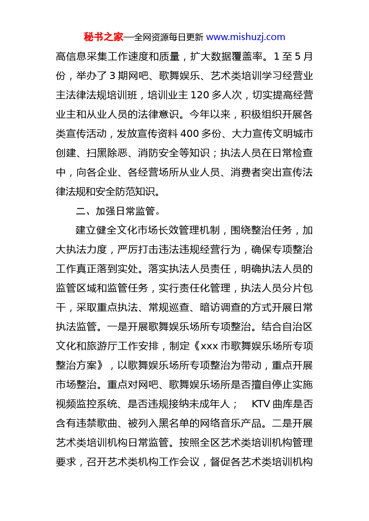 秘书之家—全网资源每日更新www.mishuzj.com市文化旅游体育广电局上半年文化市场综合执法工作总结今年以来,文化市场综合执法大队紧紧围绕市委、市政府关于文化工作的安排部署,切实加强组织领导,采取有力措施,狠抓文化市场管理,各项工作有序开展。现将2022年上半年工作总结如下:一、加强组织领导。执法大队依法履行文化旅游体育综合执法职责,统一行使文化、文物、出版、体育、广播电视、电影、旅游市场领域的行政执法职责,并承担“扫黄打非”执法检查工作任务。严格落实xxx市文化旅游体育广电局“行政执法公示制度”“执法全过程记录制度”“重大执法决定法制审核制度”,全面在文化旅游体育广电领域的行政许可、行政处罚、行政检查三类行政执法行为中推行行政执法“三项制度”,切实规范行政执法行为。规范行政执法程序、推行各项法律工作制度、实行行政执法人员持证上岗和资格管理制度等相结合。进一步完善“全国文化市场监管平台”,严格按照《全国文化市场技术监管与服务平台应用规范》,明确管理员,坚持各项执法工作实现平台操作,在平台上办理业务,实现资源互通、信息共享。全面推进“互联网+监管”平台数据系统建设工作,进一步提秘书之家—全网资源每日更新www.mishuzj.com高信息采集工作速度和质量,扩大数据覆盖率。1至5月份,举办了3期网吧、歌舞娱乐、艺术类培训学习经营业主法律法规培训班,培训业主120多人次,切实提高经营业主和从业人员的法律意识。今年以来,积极组织开展各类宣传活动,发放宣传资料400多份、大力宣传文明城市创建、扫黑除恶、消防安全等知识;执法人员在日常检查中,向各企业、各经营场所从业人员、消费者突出宣传法律法规和安全防范知识。二、加强日常监管。建立健全文化市场长效管理机制,围绕整治任务,加大执法力度,严厉打击违法违规经营行为,确保专项整治工作真正落到实处。落实执法人员责任,明确执法人员的监管区域和监管任务,实行责任化管理,执法人员分片包干,采取重点执法、常规巡查、暗访调查的方式开展日常执法监管。一是开展歌舞娱乐场所专项整治。结合自治区文化和旅游厅工作安排,制定《xxx市歌舞娱乐场所专项整治方案》,以歌舞娱乐场所专项整治为带动,重点开展市场整治。重点对网吧、歌舞娱乐场所是否擅自停止实施视频监控系统、是否违规接纳未成年人;KTV曲库是否含有违禁歌曲、被列入黑名单的网络音乐产品。二是开展艺术类培训机构日常监管。按照全区艺术类培训机构管理要求,召开艺术类机构工作会议,督促各艺术类培训机构秘书之家—全网资源每日更新www.mishuzj.com积极适应政策调整,服从市文化市场综合执法大队的日常监管。三是出版印刷日常监管。为进一步加强出版物市场监管,执法人员深入到全市出版物经营单位、中小学周边、商城等经营场所,开展出版物市场专项检查,确保出版物市场安全稳定。重点对辖区内各出版物经营单场所是否存在不符合国家政策法规的出版物,是否存在危害青少年身心健康的出版物,是否存在宣传邪教、不法传播的出版物;中小学周边文具商店、商城小商品经销店、流动摊点是否违规销售出版物、销售不健康内容儿童卡片等进行重点检查。四是整治校园周边环境专项整治。为了维护校园周边文化市场的安全,开展校园周边专项整治行动,严厉查处中小学校周边200米范围内的网吧、游戏厅、歌舞厅等娱乐经营场所,加大对印刷、发行盗版教材、教辅读物行为的打击力度,营造健康的校园周边文化环境。三、狠抓疫情防控。认真落实中央、自治区、吴忠市和我市疫情防控指挥部最新要求,抓紧抓实抓细疫情防控工作,积极应对文旅市场消费人群增多,疫情防控的严峻形势的特点,进一步加大人员密集场所执法巡查力度,持续不间断的开展疫情防控隐患排查整治,做到“全覆盖、无死角”,全面提升疫情防控管控能力,杜绝疫情隐患发生,确保全市文化旅游体育广电领域市场安全稳定。压实文化市场经营主体责秘书之家—全网资源每日更新www.mishuzj.com任,明确了疫情防控责任人,进一步压实了疫情防控工作责任,执法大队加强巡查坚决防范网吧、KTV、影剧院等文化娱乐场所疫情防控措施不到位等违规问题。严格执行吴忠市、xxx市疫情防控政策,于4月6日发布“文化市场临时关停公告”,紧急停止网吧、歌舞娱乐、电影院等文化市场人员密集场所。执法人员积极行动,连夜持续排查,做到全市按时按规停业。按照疫情防控要求,于4月16日安排歌舞娱乐场所营业,执法人员分头行动,检查各场所营业前场所消毒、口罩佩戴、人员测温、登记、扫码、落实预约、错峰、限量等防控措施。紧盯“全国中高风险区”疫情防控动态信息,及时利用工作群做好风险提示,积极排查上海、吉林等地区返青人员。督促各经营场所做好疫苗接种工作,排查从业人员疫苗接种情况。四、狠抓文化市场安全管理。建立了对文化市场安全生产定期巡查制度,重大隐患排查制度,保持高度戒备,采取积极有效的措施,确保市场的安全规范有序。强化了安全生产责任制,和网吧、歌舞娱乐场所经营业主签订“安全生产承诺书”,明确了企业安全生产主体责任,细化了目标任务。建立文化市场经营场所安全生产“一户一档”工作台账,从经营场所