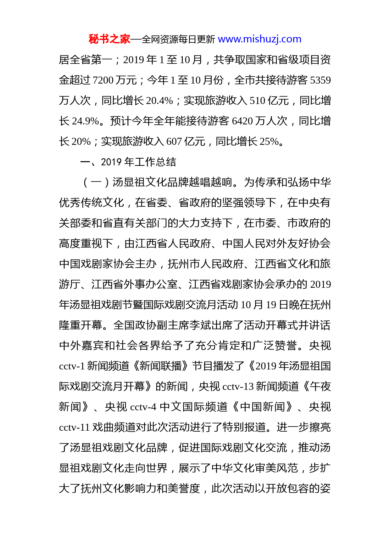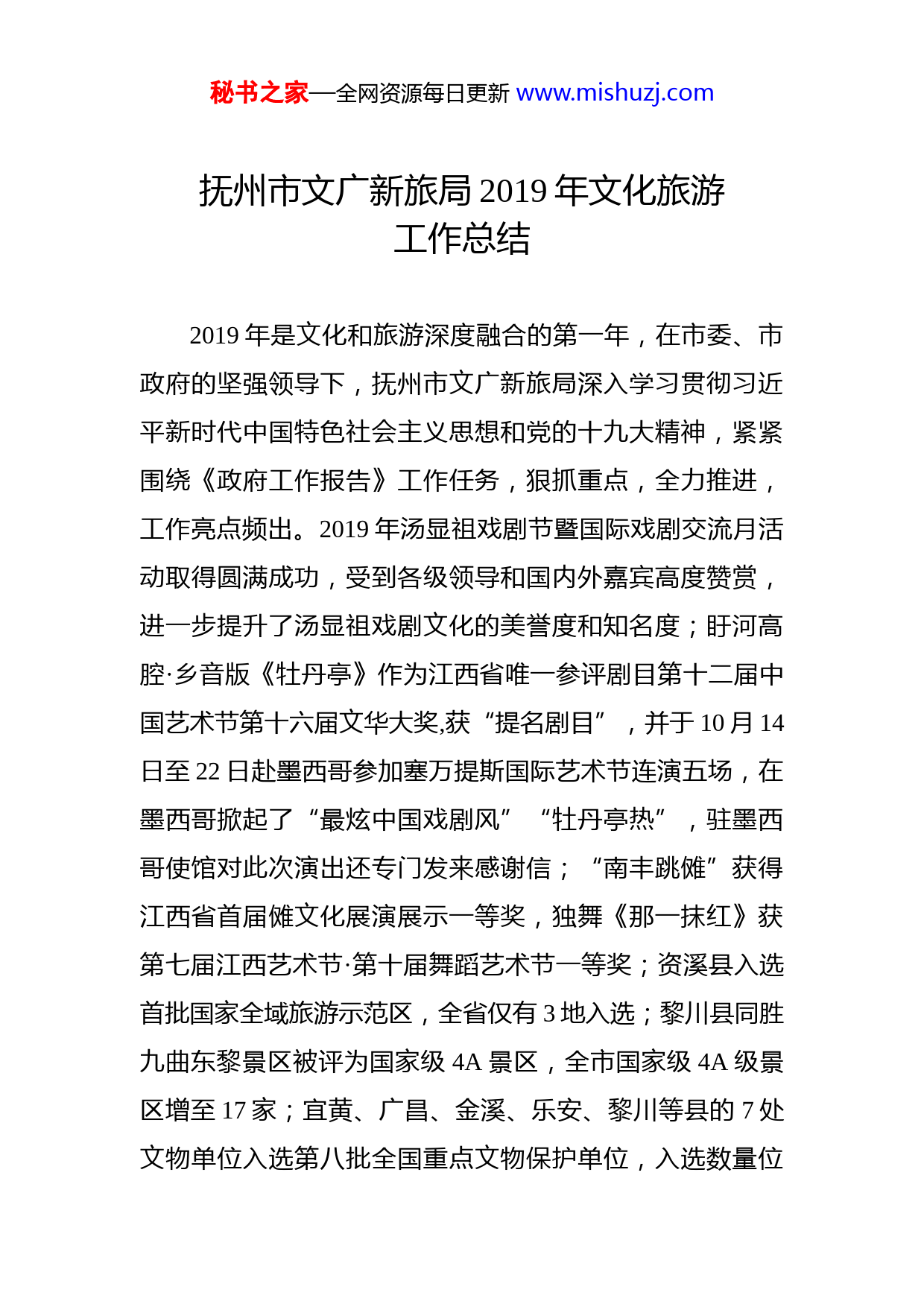 秘书之家—全网资源每日更新www.mishuzj.com抚州市文广新旅局2019年文化旅游工作总结2019年是文化和旅游深度融合的第一年,在市委、市政府的坚强领导下,抚州市文广新旅局深入学习贯彻习近平新时代中国特色社会主义思想和党的十九大精神,紧紧围绕《政府工作报告》工作任务,狠抓重点,全力推进,工作亮点频出。2019年汤显祖戏剧节暨国际戏剧交流月活动取得圆满成功,受到各级领导和国内外嘉宾高度赞赏,进一步提升了汤显祖戏剧文化的美誉度和知名度;盱河高腔·乡音版《牡丹亭》作为江西省唯一参评剧目第十二届中国艺术节第十六届文华大奖,获“提名剧目”,并于10月14日至22日赴墨西哥参加塞万提斯国际艺术节连演五场,在墨西哥掀起了“最炫中国戏剧风”“牡丹亭热”,驻墨西哥使馆对此次演出还专门发来感谢信;“南丰跳傩”获得江西省首届傩文化展演展示一等奖,独舞《那一抹红》获第七届江西艺术节·第十届舞蹈艺术节一等奖;资溪县入选首批国家全域旅游示范区,全省仅有3地入选;黎川县同胜九曲东黎景区被评为国家级4A景区,全市国家级4A级景区增至17家;宜黄、广昌、金溪、乐安、黎川等县的7处文物单位入选第八批全国重点文物保护单位,入选数量位秘书之家—全网资源每日更新www.mishuzj.com居全省第一;2019年1至10月,共争取国家和省级项目资金超过7200万元;今年1至10月份,全市共接待游客5359万人次,同比增长20.4%;实现旅游收入510亿元,同比增长24.9%。预计今年全年能接待游客6420万人次,同比增长20%;实现旅游收入607亿元,同比增长25%。一、2019年工作总结(一)汤显祖文化品牌越唱越响。为传承和弘扬中华优秀传统文化,在省委、省政府的坚强领导下,在中央有关部委和省直有关部门的大力支持下,在市委、市政府的高度重视下,由江西省人民政府、中国人民对外友好协会中国戏剧家协会主办,抚州市人民政府、江西省文化和旅游厅、江西省外事办公室、江西省戏剧家协会承办的2019年汤显祖戏剧节暨国际戏剧交流月活动10月19日晚在抚州隆重开幕。全国政协副主席李斌出席了活动开幕式并讲话中外嘉宾和社会各界给予了充分肯定和广泛赞誉。央视cctv-1新闻频道《新闻联播》节目播发了《2019年汤显祖国际戏剧交流月开幕》的新闻,央视cctv-13新闻频道《午夜新闻》、央视cctv-4中文国际频道《中国新闻》、央视cctv-11戏曲频道对此次活动进行了特别报道。进一步擦亮了汤显祖戏剧文化品牌,促进国际戏剧文化交流,推动汤显祖戏剧文化走向世界,展示了中华文化审美风范,步扩大了抚州文化影响力和美誉度,此次活动以开放包容的姿秘书之家—全网资源每日更新www.mishuzj.com态,用戏剧与世界对话,邀请了乌克兰、俄罗斯、哈萨克斯坦、意大利、古巴、奥地利等20个国家的200余名知名艺术家相聚抚州,主要开展了中外经典剧目展演、汤显祖国际学术研讨会、驻华使领馆官员江西行、中英文化旅游周、第七届江西艺术节·第十一届江西玉茗花戏剧节、全国高腔优秀剧目展演、戏曲研讨会以及群众性文化活动、原中央苏区振兴(抚州)恳谈会等11项活动,充分展现了“经典、创新、多元、活力”,呈现了国际范更浓、专业性更高、互动性更强、影响力更广的四大特点,向世界传播“中国戏都”好声音。其中汤显祖国际学术研讨会聚集了境内外106位文化专家、学者,收到论文46篇、近百万言,推出了《原谱考》《万历二十年的汤显祖》《汤显祖祖宅之推考》等一批新的汤学研究成果,扩大了抚州在汤学研究领域的核心影响。同时,中外经典剧目展演、第七届江西艺术节·第十一届江西玉茗花戏剧节、全国高腔优秀剧目展演,集中展演来自国内外及江西省各设区市的采茶戏、京剧、黄梅戏、越剧、音乐剧、话剧、默剧等81台大、小戏剧目(大戏36台、小戏45台),优惠票、免费观摩票吸引广大群众主动走进剧场,充分享受跨度近3个月的戏剧大餐。还邀请国内著名戏曲专家学者围绕“戏曲文化如何更好走出去”和“古老剧种如何焕发新时代光彩”开展学术研讨会,进一步推动抚州地方戏曲文化发展,助力打造秘书之家—全网资源每日更新www.mishuzj.com“中国戏都”。(二)全域旅游顶层设计持续强化。一是编制《抚州市全域旅游发展规划(2019-2030年)》。按照全域化、“多规合一”理念,对照《国家全域旅游示范区验收细则》,重点围绕旅游空间、旅游产品、旅游产业、旅游服务、旅游营销、旅游管理等6个全域化进行编制,该规划已通过专家评审,待修改完善后报市政府颁布实施。资溪、南丰、南城、东乡、金溪等县也都按照创建全域旅游示范区的要求编制了全域旅游发展规划,抓好顶层设计,统筹开发旅游资源。二是印发《抚州市旅游产业高质量发展三年行动计划(2019-2021年)》。紧扣全域旅游发展和“旅游+”深入融合的时代要求,以推进景区市场化运营为主线,做大做强做精做美景区,创新创优旅游发展体制机制,加快推进我市旅游资源优势向旅游产业优势转化,全面提升旅游产业整体实力和水平。全市18家国家4A级以上旅游景区,其中目前仍由政府管理运营的有4家、由民营企业投资运营的有5家、引进战略合作进行托管运营的有9家,全市4A级以上旅游景区市场化率达77.78%。三是推进《抚州市旅游产业发展奖励办法》贯彻实施。对旅游品牌创建、旅游专列、旅游大巴