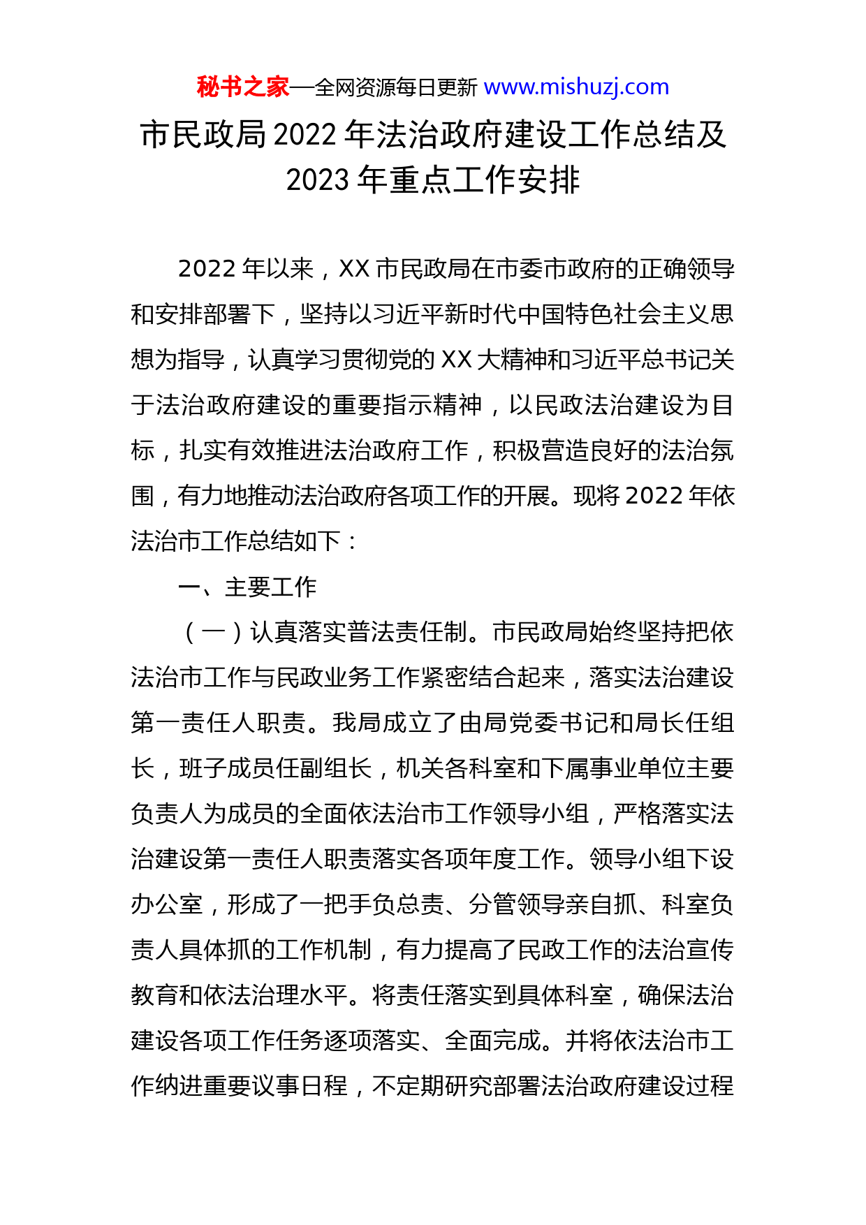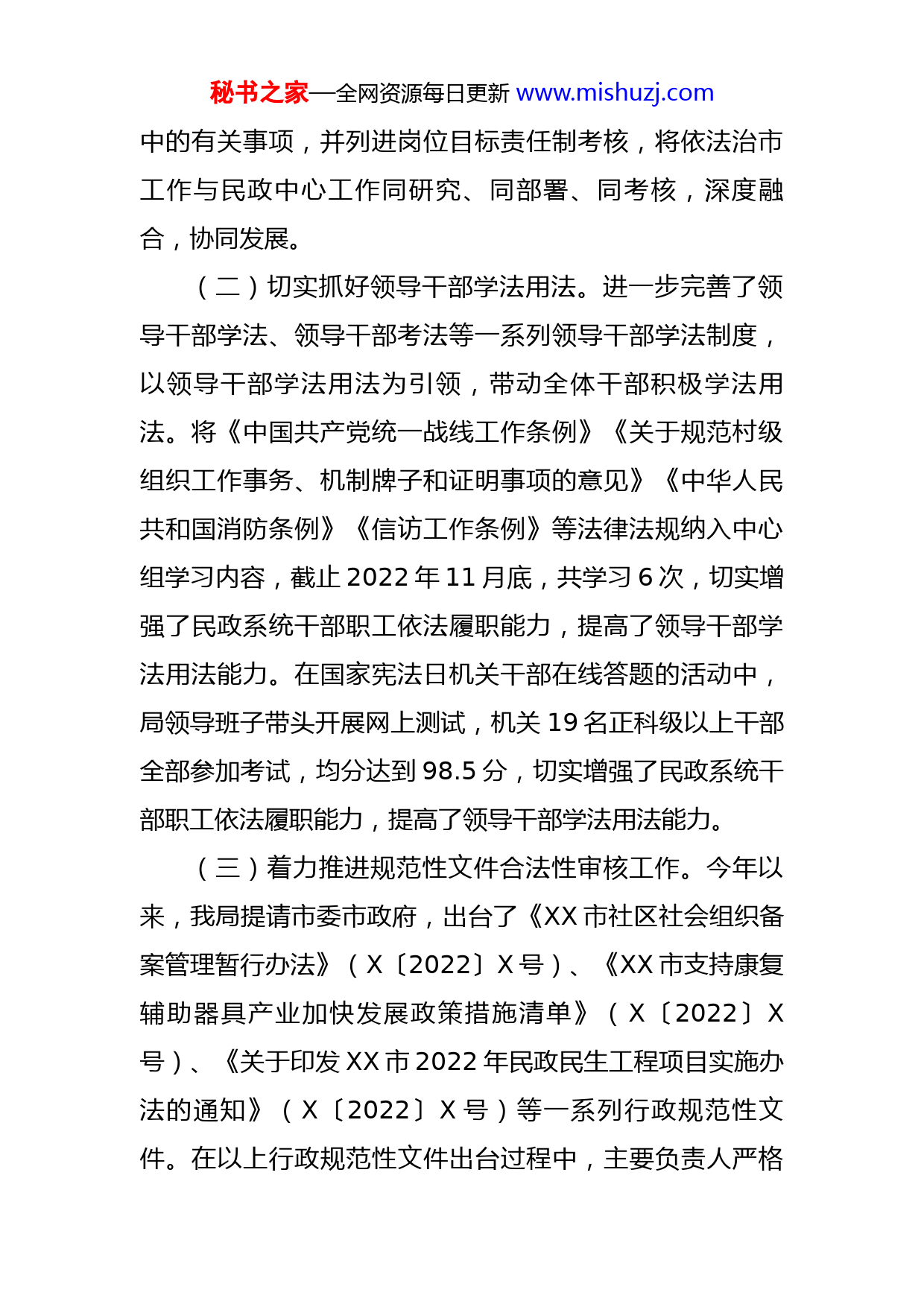 秘书之家—全网资源每日更新www.mishuzj.com市民政局2022年法治政府建设工作总结及2023年重点工作安排2022年以来,XX市民政局在市委市政府的正确领导和安排部署下,坚持以习近平新时代中国特色社会主义思想为指导,认真学习贯彻党的XX大精神和习近平总书记关于法治政府建设的重要指示精神,以民政法治建设为目标,扎实有效推进法治政府工作,积极营造良好的法治氛围,有力地推动法治政府各项工作的开展。现将2022年依法治市工作总结如下:一、主要工作(一)认真落实普法责任制。市民政局始终坚持把依法治市工作与民政业务工作紧密结合起来,落实法治建设第一责任人职责。我局成立了由局党委书记和局长任组长,班子成员任副组长,机关各科室和下属事业单位主要负责人为成员的全面依法治市工作领导小组,严格落实法治建设第一责任人职责落实各项年度工作。领导小组下设办公室,形成了一把手负总责、分管领导亲自抓、科室负责人具体抓的工作机制,有力提高了民政工作的法治宣传教育和依法治理水平。将责任落实到具体科室,确保法治建设各项工作任务逐项落实、全面完成。并将依法治市工作纳进重要议事日程,不定期研究部署法治政府建设过程秘书之家—全网资源每日更新www.mishuzj.com中的有关事项,并列进岗位目标责任制考核,将依法治市工作与民政中心工作同研究、同部署、同考核,深度融合,协同发展。(二)切实抓好领导干部学法用法。进一步完善了领导干部学法、领导干部考法等一系列领导干部学法制度,以领导干部学法用法为引领,带动全体干部积极学法用法。将《中国共产党统一战线工作条例》《关于规范村级组织工作事务、机制牌子和证明事项的意见》《中华人民共和国消防条例》《信访工作条例》等法律法规纳入中心组学习内容,截止2022年11月底,共学习6次,切实增强了民政系统干部职工依法履职能力,提高了领导干部学法用法能力。在国家宪法日机关干部在线答题的活动中,局领导班子带头开展网上测试,机关19名正科级以上干部全部参加考试,均分达到98.5分,切实增强了民政系统干部职工依法履职能力,提高了领导干部学法用法能力。(三)着力推进规范性文件合法性审核工作。今年以来,我局提请市委市政府,出台了《XX市社区社会组织备案管理暂行办法》(X〔2022〕X号)、《XX市支持康复辅助器具产业加快发展政策措施清单》(X〔2022〕X号)、《关于印发XX市2022年民政民生工程项目实施办法的通知》(X〔2022〕X号)等一系列行政规范性文件。在以上行政规范性文件出台过程中,主要负责人严格秘书之家—全网资源每日更新www.mishuzj.com履行行政规范性文件合法性审核工作第一责任人职责,为提升规范性文件工作水平提供了保障。根据实际情况确定行政规范性文件合法性审核程序,明确起草科室及办公室审核职责权限,明确岗位职责和工作标准,制定了行政规范性文件合法性审核具体实施意见以及相关制度,做到“应审必审”。建立协调配合机制,形成职责明晰、运转流畅、配合有序的工作机制。(四)强化执法监管,推动民政法治政府建设进程。落实行政执法“三项制度”。按要求落实执法公示、全过程记录制度、执法人员公示、执法事项和目录公示、重大执法决定目录公示等。认真开展案卷评查,行政许可、行政处罚有法律法规依据,无自行设定项目,基本达到执法主体正确、执法依据充分、认定事实清楚、执法程序合规、案卷装订规范的基本要求。在XX市民政局通过官网及政务公开网及时公示公开行政许可、行政处罚、权责清单以及“双随机一公开”事项清单、依据、程序等,并通过官网及政务公开网定期公示行政许可事项和行政处罚情况,接受群众监督。(五)对外开展形式多样的普法宣传教育活动。一是在日常工作中立足民政职能积极开展普法宣传,结合日常走访、调研工作、下访接访等活动,通过讲解相关法律法规、行政指导、以案释法等多种形式向民政服务对象进行秘书之家—全网资源每日更新www.mishuzj.com普法宣传。二是利用大型活动日,积极宣传相关法律法规。在“未成年人保护工作宣传月”活动中,市民政局联合镜湖区政府选取在市中心繁华地段开展了丰富多彩的集中宣传活动,大力宣传《未成年人保护法》、儿童福利和未成年人保护政策、儿童防溺水等安全自护知识等;在“中华慈善日”“XX慈善周”宣传活动中,在赭山公园法治广场开展了以“携手做慈善,传播真善美”为主题的宣传活动;结合“3·15”消费者权益日、“4·15”国家安全日、未成年人保护月、国家宪法日等时间节点,利用局政务微博、微信公众号、门户网站等宣传方式广泛开展法律宣传。不断提高全社会法治意识,创造良好的社会氛围和执法环境。(六)加快智慧社区建设,打造“网络+网格”基层社会治理升级版。建设XX市智慧社区项目。深化以“互联网+”为创新引擎,以促进信息和资源共享为重点,着力构建便捷高效的智慧化社区治理和民生服务体系。根据数字XX、现代社区建设思路和“1+1+1+6+X”智慧社区总体架构,建成了1套智能基础设施、1套数据资源体系和1个“社区智脑”平台,实现社区党建、社区安全、社区政务、社区管理、社区共治、社区服务六大核心领域的X项智慧化场景应用,打造了3个示范样板社区、3个试点小区和10个平安小