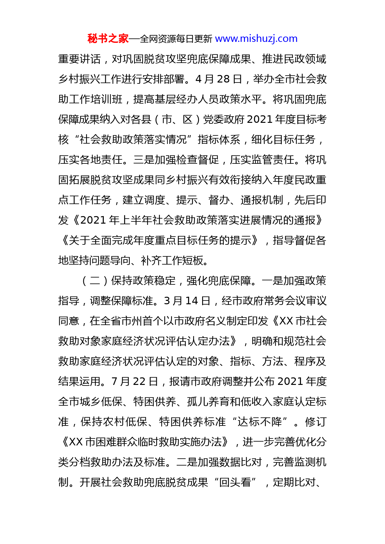 秘书之家—全网资源每日更新www.mishuzj.com市民政局巩固拓展脱贫攻坚成果同乡村振兴有效衔接工作总结今年以来,在市委、市政府的坚强领导下,在市乡村振兴办的精心指导下,我局认真贯彻落实党中央关于巩固拓展脱贫攻坚成果同乡村振兴有效衔接的决策部署和省委、市委有关工作要求,聚焦农村低收入人口,坚持“兜底线、固成果、建机制”,着力织密兜牢基本民生保障网。现将有关情况总结如下:一、主要做法及成效(一)加强组织领导,扛牢政治责任。一是深入学习领会,提高政治站位。局党组从树牢“四个意识”、践行“两个维护”的政治高度,及时传达学习习近平总书记关于巩固拓展脱贫攻坚成果同乡村振兴有效衔接的重要论述和指示批示精神、中央和省、市有关文件及会议精神,坚持在乡村振兴的大局中谋划和推进基本民生保障工作,进一步增强做好民政领域乡村振兴工作的政治自觉、思想自觉和行动自觉。二是及时研究部署,明确目标任务。3月8日,报请市政府印发《关于健全完善全市困难群众基本生活保障工作协调机制的通知》,指导各地加强县级困难群众基本生活保障工作统筹协调。3月10日,以市政府名义召开全市民政会议,市长XXX、副市长XXX出席会议并作秘书之家—全网资源每日更新www.mishuzj.com重要讲话,对巩固脱贫攻坚兜底保障成果、推进民政领域乡村振兴工作进行安排部署。4月28日,举办全市社会救助工作培训班,提高基层经办人员政策水平。将巩固兜底保障成果纳入对各县(市、区)党委政府2021年度目标考核“社会救助政策落实情况”指标体系,细化目标任务,压实各地责任。三是加强检查督促,压实监管责任。将巩固拓展脱贫攻坚成果同乡村振兴有效衔接纳入年度民政重点工作任务,建立调度、提示、督办、通报机制,先后印发《2021年上半年社会救助政策落实进展情况的通报》《关于全面完成年度重点目标任务的提示》,指导督促各地坚持问题导向、补齐工作短板。(二)保持政策稳定,强化兜底保障。一是加强政策指导,调整保障标准。3月14日,经市政府常务会议审议同意,在全省市州首个以市政府名义制定印发《XX市社会救助对象家庭经济状况评估认定办法》,明确和规范社会救助家庭经济状况评估认定的对象、指标、方法、程序及结果运用。7月22日,报请市政府调整并公布2021年度全市城乡低保、特困供养、孤儿养育和低收入家庭认定标准,保持农村低保、特困供养标准“达标不降”。修订《XX市困难群众临时救助实施办法》,进一步完善优化分类分档救助办法及标准。二是加强数据比对,完善监测机制。开展社会救助兜底脱贫成果“回头看”,定期比对、秘书之家—全网资源每日更新www.mishuzj.com全面排查未纳入兜底保障范围的“三类人口”,及时将XXXX名符合条件的对象纳入农村低保或特困供养范围,确保“应兜尽兜、不漏一人”。加大与乡村振兴、医保、残联等部门信息共享和数据比对力度,在全省率先建立全市低收入人口监测平台,初步汇集形成全市困难群众数据库,建立完善线上监测预警、线下核查反馈的防返贫致贫动态监测机制,做到“早发现、早救助、早帮扶”。三是加强分类施策,提高救助水平。指导督促各地精准落实农村低保、特困供养、临时救助、残疾人“两项补贴”、孤儿保障等兜底保障政策,加大“重点救助”“单人施保”“特困扩围”“分类救助”力度,不断提高农村低收入人口救助水平。截至12月底,全市现有农村低保对象XXXX万人,其中脱贫人口XXX万人,月人均补助标准XXX元;农村特困供养对象XXX万人,其中脱贫人口XXX万人,月人均供养标准XXX元;临时救助XXXXX人次,其中脱贫人口XXXX人次,人均救助标准XXXX元;困难残疾人生活补贴标准由每人每月50元提高到70元,XXXX万残疾人纳入“两项补贴”范围;XXXX名孤儿(事实无人抚养儿童)得到基本生活保障,累计发放各类救助补助资金XXX亿元。(三)落实帮扶责任,加大帮扶力度。一是选优配强力量,加强支持保障。今年上半年,按照“四个不摘”要秘书之家—全网资源每日更新www.mishuzj.com求,我局继续驻村帮扶XX县花X乡群力村、星光村、宝山村,共派驻工作队员X人,其中X名党组成员、副局长、X名局属事业单位副职分别担任工作队长。今年下半年,根据市委市政府统一部署,选派3名工作队员(其中1名二级调研员担任工作队长)进驻XX县东X乡万X村,开展新一轮驻村帮扶工作。二是坚持党建引领,夯实组织基础。严格履行“第一书记”职责,健全村级组织,落实三会一课。协助抓好村“两委”换届选举有关工作。规范村级基础台账资料、重点问题台账、政策落实台账,紧盯动态信息变化,加强信息核查更新。抓好常态化疫情防控,认真组织开展疫苗接种、返乡人员排查、重点人员核酸检测及管控。三是加大资金投入,推动产业发展。用好专项扶贫资金,投入XX万元完成村级扶贫基本设施建设,拓宽硬化原同乐村温李湾X00米通湾路,整修加固原界河村官塘水库堤坝。积极谋划村级产业发展项目,拟投入XX余万元在东X乡万X村新建一座100KW的光伏发电站,其中我局扶持资金XX万元,建成后每年可增加村集体收入X万元。四是链接整合资源,加强关爱帮扶。协调市慈善总会安排资金X万元走访慰问困难群众XX户,为X名贫困家庭大学生分别提供助学金XXXX元。组织市康复医院有关专家医生到村对XX名