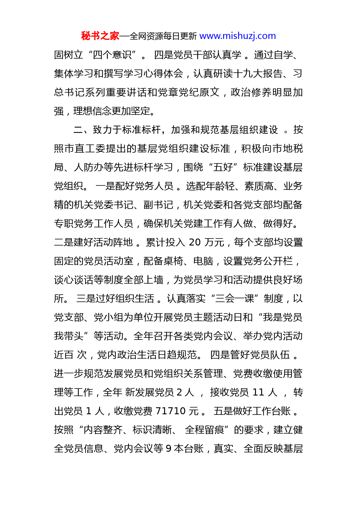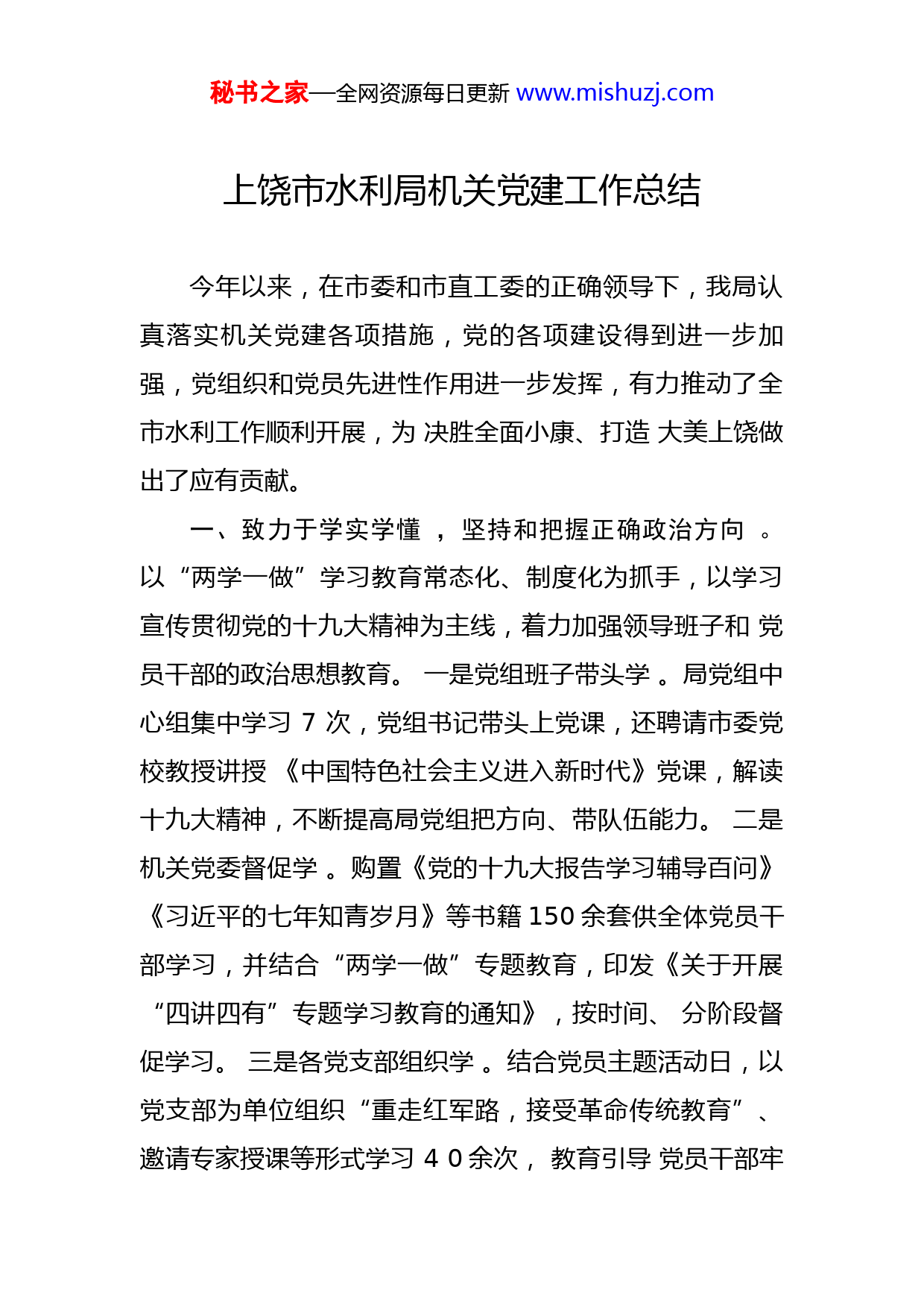 秘书之家—全网资源每日更新www.mishuzj.com上饶市水利局机关党建工作总结今年以来,在市委和市直工委的正确领导下,我局认真落实机关党建各项措施,党的各项建设得到进一步加强,党组织和党员先进性作用进一步发挥,有力推动了全市水利工作顺利开展,为决胜全面小康、打造大美上饶做出了应有贡献。一、致力于学实学懂,坚持和把握正确政治方向。以“两学一做”学习教育常态化、制度化为抓手,以学习宣传贯彻党的十九大精神为主线,着力加强领导班子和党员干部的政治思想教育。一是党组班子带头学。局党组中心组集中学习7次,党组书记带头上党课,还聘请市委党校教授讲授《中国特色社会主义进入新时代》党课,解读十九大精神,不断提高局党组把方向、带队伍能力。二是机关党委督促学。购置《党的十九大报告学习辅导百问》《习近平的七年知青岁月》等书籍150余套供全体党员干部学习,并结合“两学一做”专题教育,印发《关于开展“四讲四有”专题学习教育的通知》,按时间、分阶段督促学习。三是各党支部组织学。结合党员主题活动日,以党支部为单位组织“重走红军路,接受革命传统教育”、邀请专家授课等形式学习40余次,教育引导党员干部牢秘书之家—全网资源每日更新www.mishuzj.com固树立“四个意识”。四是党员干部认真学。通过自学、集体学习和撰写学习心得体会,认真研读十九大报告、习总书记系列重要讲话和党章党纪原文,政治修养明显加强,理想信念更加坚定。二、致力于标准标杆,加强和规范基层组织建设。按照市直工委提出的基层党组织建设标准,积极向市地税局、人防办等先进标杆学习,围绕“五好”标准建设基层党组织。一是配好党务人员。选配年龄轻、素质高、业务精的机关党委书记、副书记,机关党委和各党支部均配备专职党务工作人员,确保机关党建工作有人做、做得好。二是建好活动阵地。累计投入20万元,每个支部均设置固定的党员活动室,配备桌椅、电脑,设置党务公开栏,谈心谈话等制度全部上墙,为党员学习和活动提供良好场所。三是过好组织生活。认真落实“三会一课”制度,以党支部、党小组为单位开展党员主题活动日和“我是党员我带头”等活动。全年召开各类党内会议、举办党内活动近百次,党内政治生活日趋规范。四是管好党员队伍。进一步规范发展党员和党组织关系管理、党费收缴使用管理等工作,全年新发展党员2人,接收党员11人,转出党员1人,收缴党费71710元。五是做好工作台账。按照“内容整齐、标识清晰、全程留痕”的要求,建立健全党员信息、党内会议等9本台账,真实、全面反映基层秘书之家—全网资源每日更新www.mishuzj.com组织活动。三、致力于纪律效率,巩固和提升机关作风形象。坚持挺纪在前,持之以恒反“四风”、转作风、提效率。一是注重责任落实。制定《2017年党风廉政建设工作要点》《落实全面从严治党主体责任和监督责任清单保障措施和责任追究办法(试行)》,局党组书记与班子成员、下属单位和科室负责人签订《党风廉政建设目标责任书》,构建局党组统一领导、逐级落实的工作格局。二是注重纪律教育。通过听党课、到廉政教育基地参观等方式,深入学习《准则》《条例》等党内法规,及时学习纪委“四风”和侵害群众利益不正之风案件通报,引导党员干部牢记党纪党规,严守纪律,不越雷池,不碰红线。三是注重抓早抓小。正确运用“四种形态”的第一种形态,对党员干部身上苗头性、倾向性问题通过谈心谈话及时提醒、帮助纠正。如:城防处处长吴某外出未履行请假手续,局党组发现后予以通报批评,防止干部积小错成大错。四是注重效能提升。制定推行《上饶市水利局机关上下班电子打卡考勤制度(试行)》,要求工作人员上下班必须打卡,外出必须告知,请假必须报备,联系方式必须公开,确保群众办事方便,促进效能提升。四、致力于实践实战,锻炼和提高干部队伍素质。着力促进党建与发展、与民生整合,在聚力抓发展、务实改秘书之家—全网资源每日更新www.mishuzj.com民生实践中锻炼提高干部。一是在脱贫攻坚战中拉练队伍。按照基层党建与脱贫攻坚双推进的思路,下发《关于在脱贫攻坚中开展“机关联系基层、干部联系贫困群众”活动的通知》,选派优秀年轻干部到扶贫挂点村中山村担任第一书记,投资178万元帮助119户贫困户发展菌菇、油茶等产业,确保贫困户可持续增收。二是在服务基层中拉练队伍。全局14名市管领导干部全部到社区报到服务,志愿服务者队伍扩大到45人,组织党员志愿者到结对共建的北门街道龙芽亭社区开展“安全教育进社区,平安幸福伴你行”为主题的宣传活动。三是在业务工作中拉练队伍。在抗洪抢险、水利工程建设、清河行动、水资源管理一线,鼓励引导党员走在前列,践行“我是党员我带头”。如:今年7月,鄱阳、余干等地圩堤出现泡泉、渗漏险情,已退休的副总工程师龚建新,第一时间赶赴圩堤指挥抢险,直到险情排除后才离开,用实际行动回应“全省优秀共产党员”殊荣。四是在团体活动中拉练队伍。举办全市“节约保护水资源、全面推行河长制”朗诵歌咏比赛、第五届“饶禹·降龙杯”羽毛球比赛,并派员参加省第十一届水利桂花节、市第四届运动会和第二届趣味运动会、全市“我是党员我带头”演讲比赛等