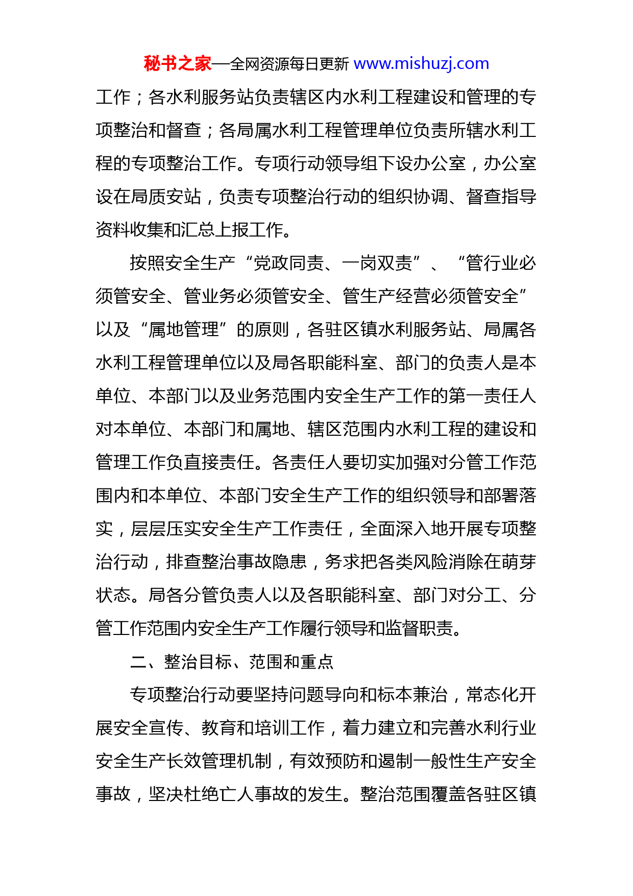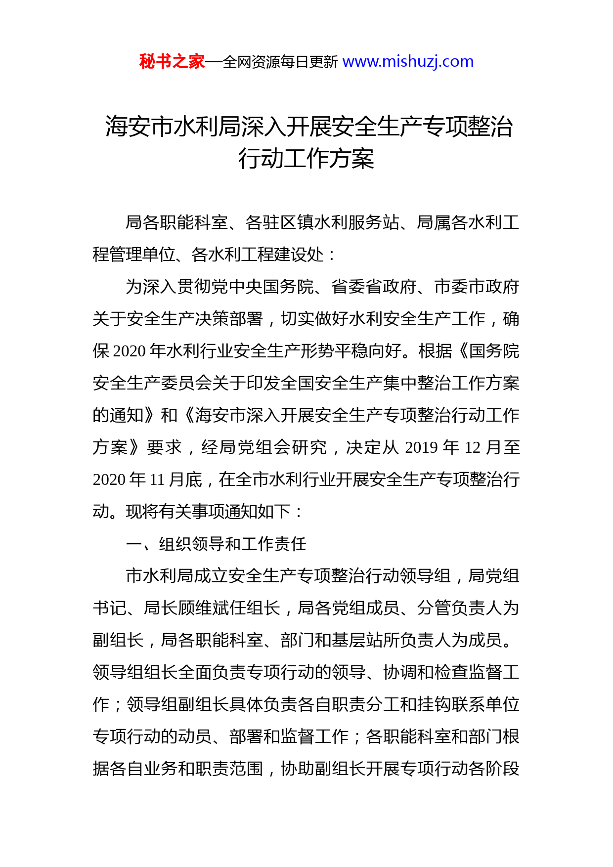 秘书之家—全网资源每日更新www.mishuzj.com海安市水利局深入开展安全生产专项整治行动工作方案局各职能科室、各驻区镇水利服务站、局属各水利工程管理单位、各水利工程建设处:为深入贯彻党中央国务院、省委省政府、市委市政府关于安全生产决策部署,切实做好水利安全生产工作,确保2020年水利行业安全生产形势平稳向好。根据《国务院安全生产委员会关于印发全国安全生产集中整治工作方案的通知》和《海安市深入开展安全生产专项整治行动工作方案》要求,经局党组会研究,决定从2019年12月至2020年11月底,在全市水利行业开展安全生产专项整治行动。现将有关事项通知如下:一、组织领导和工作责任市水利局成立安全生产专项整治行动领导组,局党组书记、局长顾维斌任组长,局各党组成员、分管负责人为副组长,局各职能科室、部门和基层站所负责人为成员。领导组组长全面负责专项行动的领导、协调和检查监督工作;领导组副组长具体负责各自职责分工和挂钩联系单位专项行动的动员、部署和监督工作;各职能科室和部门根据各自业务和职责范围,协助副组长开展专项行动各阶段秘书之家—全网资源每日更新www.mishuzj.com工作;各水利服务站负责辖区内水利工程建设和管理的专项整治和督查;各局属水利工程管理单位负责所辖水利工程的专项整治工作。专项行动领导组下设办公室,办公室设在局质安站,负责专项整治行动的组织协调、督查指导资料收集和汇总上报工作。按照安全生产“党政同责、一岗双责”、“管行业必须管安全、管业务必须管安全、管生产经营必须管安全”以及“属地管理”的原则,各驻区镇水利服务站、局属各水利工程管理单位以及局各职能科室、部门的负责人是本单位、本部门以及业务范围内安全生产工作的第一责任人对本单位、本部门和属地、辖区范围内水利工程的建设和管理工作负直接责任。各责任人要切实加强对分管工作范围内和本单位、本部门安全生产工作的组织领导和部署落实,层层压实安全生产工作责任,全面深入地开展专项整治行动,排查整治事故隐患,务求把各类风险消除在萌芽状态。局各分管负责人以及各职能科室、部门对分工、分管工作范围内安全生产工作履行领导和监督职责。二、整治目标、范围和重点专项整治行动要坚持问题导向和标本兼治,常态化开展安全宣传、教育和培训工作,着力建立和完善水利行业安全生产长效管理机制,有效预防和遏制一般性生产安全事故,坚决杜绝亡人事故的发生。整治范围覆盖各驻区镇秘书之家—全网资源每日更新www.mishuzj.com水利服务站、局属水利工程管理单位、在建水利工程项目河道保洁、局属集体资产管理等。各单位、各部门负责人要结合各自工作实际,对所属、所辖范围内的在建水利工程和办公场所、出租资产、人员密集场所、河道保洁段、水上交通等开展全面的安全检查和专项整治,打击非法、违法生产,治理违规、违章作为,清理“三合一”、“多合一”和危房居住,重点对有深基坑、高边坡、高大模板高处作业及围堰施工等危险性较大的在建水利工程,涉及危化品存储、使用的企业,以及各重点水利工程运行管理等方面开展检查。重点检查以下几个方面:1、安全生产组织保障。安全管理机构设立和人员配备、全员安全生产责任制落实和考核、安全生产管理制度和技术操作规程建立和执行、安全生产投入资金保障等情况。2、安全生产教育培训。教育培训制度建立、施工单位安全生产“三类人员”教育培训和考核、作业人员三级安全教育培训和考核、新上岗人员教育培训和考核、其他施工管理人员年度安全教育培训、以及特种作业人员持证上岗等情况。3、专项施工方案落实。项目法人安全生产措施方案、工程度汛方案,施工单位施工组织设计中安全技术措施专篇及基坑支护和降水工程、土方和石方开挖工程、模板工程及支撑体系、起重吊装及安装拆卸工程、脚手架工程、秘书之家—全网资源每日更新www.mishuzj.com围堰工程、高空作业工程等危险性较大工程专项施工方案的编制、管理和落实情况。4、安全技术交底。按照有关技术规范要求,在工程开工前、单项工程或专项施工方案施工前、工种施工前、交叉作业时以及施工过程中作业环境或施工条件发生变化时等,组织相关管理人员及施工作业人员安全技术交底等情况。5、危险源识别和风险管控。危险源识别及控制方案、安全风险评估、高风险工点实时监测及预警、逃生通道设置等情况。6、隐患排查治理。安全检查及隐患排查治理制度的建立和执行、事故隐患治理“五落实”及闭环管理、重大事故隐患治理、因自然灾害可能导致事故隐患预防措施等情况。7、现场安全生产管理。施工区域安全管理、设备设施(尤其是特种设备)安全管理、水上水下作业、洞口及临边防护、安全警示标志设置、安全及劳动保护用品配置和使用、特种作业人员持证上岗等情况。8、应急管理。生产安全事故应急救援预案、超标准洪水应急预案、现场处置方案等应急预案体系建立情况,应急救援组织及人员、应急救援器材和设备、定期应急演练等情况。秘书之家—全网资源每日更新www.mishuzj.com三、整治行动各阶段时间安排此次专项整治行动,从2019年12月起至2020年11月底结束,分为三