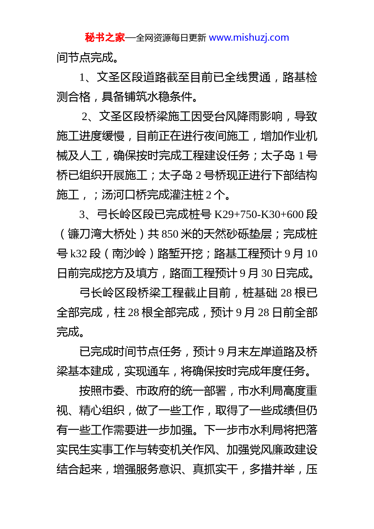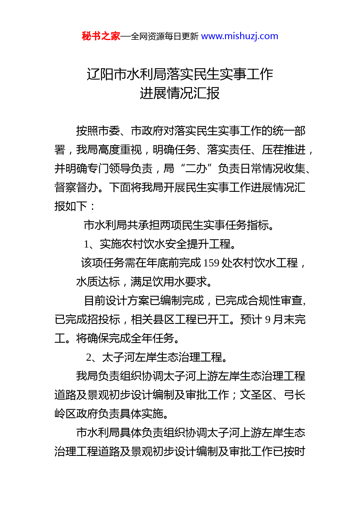 秘书之家—全网资源每日更新www.mishuzj.com辽阳市水利局落实民生实事工作进展情况汇报按照市委、市政府对落实民生实事工作的统一部署,我局高度重视,明确任务、落实责任、压茬推进,并明确专门领导负责,局“二办”负责日常情况收集、督察督办。下面将我局开展民生实事工作进展情况汇报如下:市水利局共承担两项民生实事任务指标。1、实施农村饮水安全提升工程。该项任务需在年底前完成159处农村饮水工程,水质达标,满足饮用水要求。目前设计方案已编制完成,已完成合规性审查,已完成招投标,相关县区工程已开工。预计9月末完工。将确保完成全年任务。2、太子河左岸生态治理工程。我局负责组织协调太子河上游左岸生态治理工程道路及景观初步设计编制及审批工作;文圣区、弓长岭区政府负责具体实施。市水利局具体负责组织协调太子河上游左岸生态治理工程道路及景观初步设计编制及审批工作已按时秘书之家—全网资源每日更新www.mishuzj.com间节点完成。1、文圣区段道路截至目前已全线贯通,路基检测合格,具备铺筑水稳条件。2、文圣区段桥梁施工因受台风降雨影响,导致施工进度缓慢,目前正在进行夜间施工,增加作业机械及人工,确保按时完成工程建设任务;太子岛1号桥已组织开展施工;太子岛2号桥现正进行下部结构施工,;汤河口桥完成灌注桩2个。3、弓长岭区段已完成桩号K29+750-K30+600段(镰刀湾大桥处)共850米的天然砂砾垫层;完成桩号k32段(南沙岭)路堑开挖;路基工程预计9月10日前完成挖方及填方,路面工程预计9月30日完成。弓长岭区段桥梁工程截止目前,桩基础28根已全部完成,柱28根全部完成,预计9月28日前全部完成。已完成时间节点任务,预计9月末左岸道路及桥梁基本建成,实现通车,将确保按时完成年度任务。按照市委、市政府的统一部署,市水利局高度重视、精心组织,做了一些工作,取得了一些成绩但仍有一些工作需要进一步加强。下一步市水利局将把落实民生实事工作与转变机关作风、加强党风廉政建设结合起来,增强服务意识、真抓实干,多措并举,压秘书之家—全网资源每日更新www.mishuzj.com茬推进项目建设,保质保量完成各项工作任务。