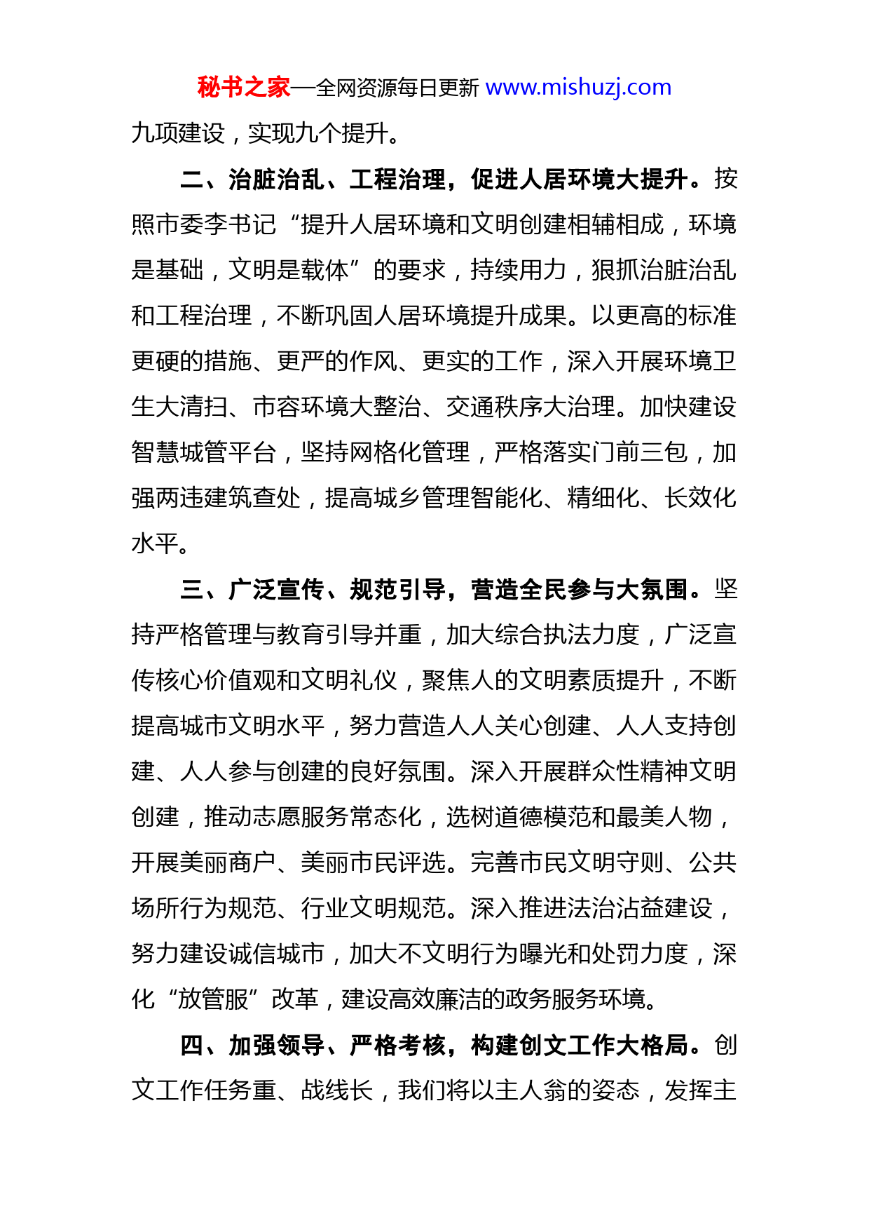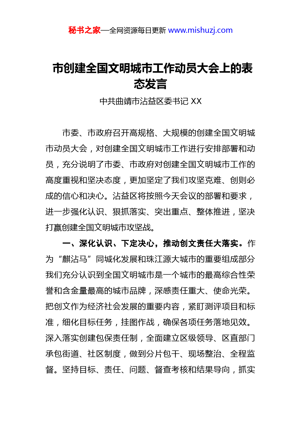 秘书之家—全网资源每日更新www.mishuzj.com市创建全国文明城市工作动员大会上的表态发言中共曲靖市沾益区委书记XX市委、市政府召开高规格、大规模的创建全国文明城市动员大会,对创建全国文明城市工作进行安排部署和动员,充分说明了市委、市政府对创建全国文明城市工作的高度重视和坚决态度,更加坚定了我们攻坚克难、创则必成的信心和决心。沾益区将按照今天会议的部署和要求,进一步强化认识、狠抓落实、突出重点、整体推进,坚决打赢创建全国文明城市攻坚战。一、深化认识、下定决心,推动创文责任大落实。作为“麒沾马”同城化发展和珠江源大城市的重要组成部分我们充分认识到全国文明城市是一个城市的最高综合性荣誉和含金量最高的城市品牌,深感责任重大、使命光荣。把创文作为经济社会发展的重要内容,紧盯测评项目和标准,细化目标任务,挂图作战,确保各项任务落地见效。深入落实创建包保责任制,全面建立区级领导、区直部门承包街道、社区制度,做到分片包干、现场整治、全程监督。坚持目标、责任、问题、督查考核和结果导向,抓实秘书之家—全网资源每日更新www.mishuzj.com九项建设,实现九个提升。二、治脏治乱、工程治理,促进人居环境大提升。按照市委李书记“提升人居环境和文明创建相辅相成,环境是基础,文明是载体”的要求,持续用力,狠抓治脏治乱和工程治理,不断巩固人居环境提升成果。以更高的标准更硬的措施、更严的作风、更实的工作,深入开展环境卫生大清扫、市容环境大整治、交通秩序大治理。加快建设智慧城管平台,坚持网格化管理,严格落实门前三包,加强两违建筑查处,提高城乡管理智能化、精细化、长效化水平。三、广泛宣传、规范引导,营造全民参与大氛围。坚持严格管理与教育引导并重,加大综合执法力度,广泛宣传核心价值观和文明礼仪,聚焦人的文明素质提升,不断提高城市文明水平,努力营造人人关心创建、人人支持创建、人人参与创建的良好氛围。深入开展群众性精神文明创建,推动志愿服务常态化,选树道德模范和最美人物,开展美丽商户、美丽市民评选。完善市民文明守则、公共场所行为规范、行业文明规范。深入推进法治沾益建设,努力建设诚信城市,加大不文明行为曝光和处罚力度,深化“放管服”改革,建设高效廉洁的政务服务环境。四、加强领导、严格考核,构建创文工作大格局。创文工作任务重、战线长,我们将以主人翁的姿态,发挥主秘书之家—全网资源每日更新www.mishuzj.com力军作用,举全区之力强力推进。进一步明确领导责任和具体工作,落实一把手负责制,确保各项工作有人抓、各项指标有人担、各块区域有人管。把创文工作打造成聚民心、顺民意、惠民生的幸福工程。尊敬的各位领导,我们将坚决贯彻落实今天的会议精神,勇于担当、奋发有为、追求卓越,以时不我待的精神志在必得的决心,千方百计抓重点、攻难点,确保圆满完成全国文明城市创建任务,向市委、市政府和全区人民交上一份满意的答卷。