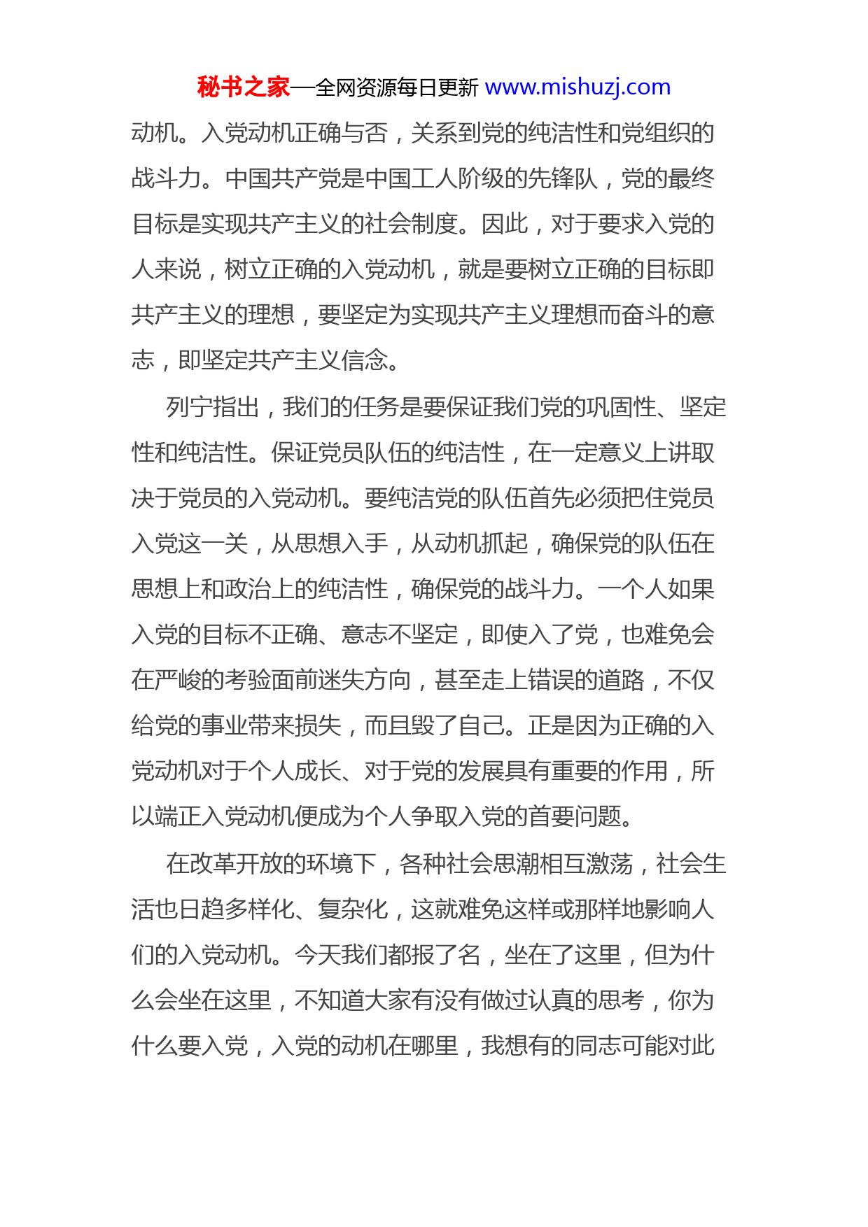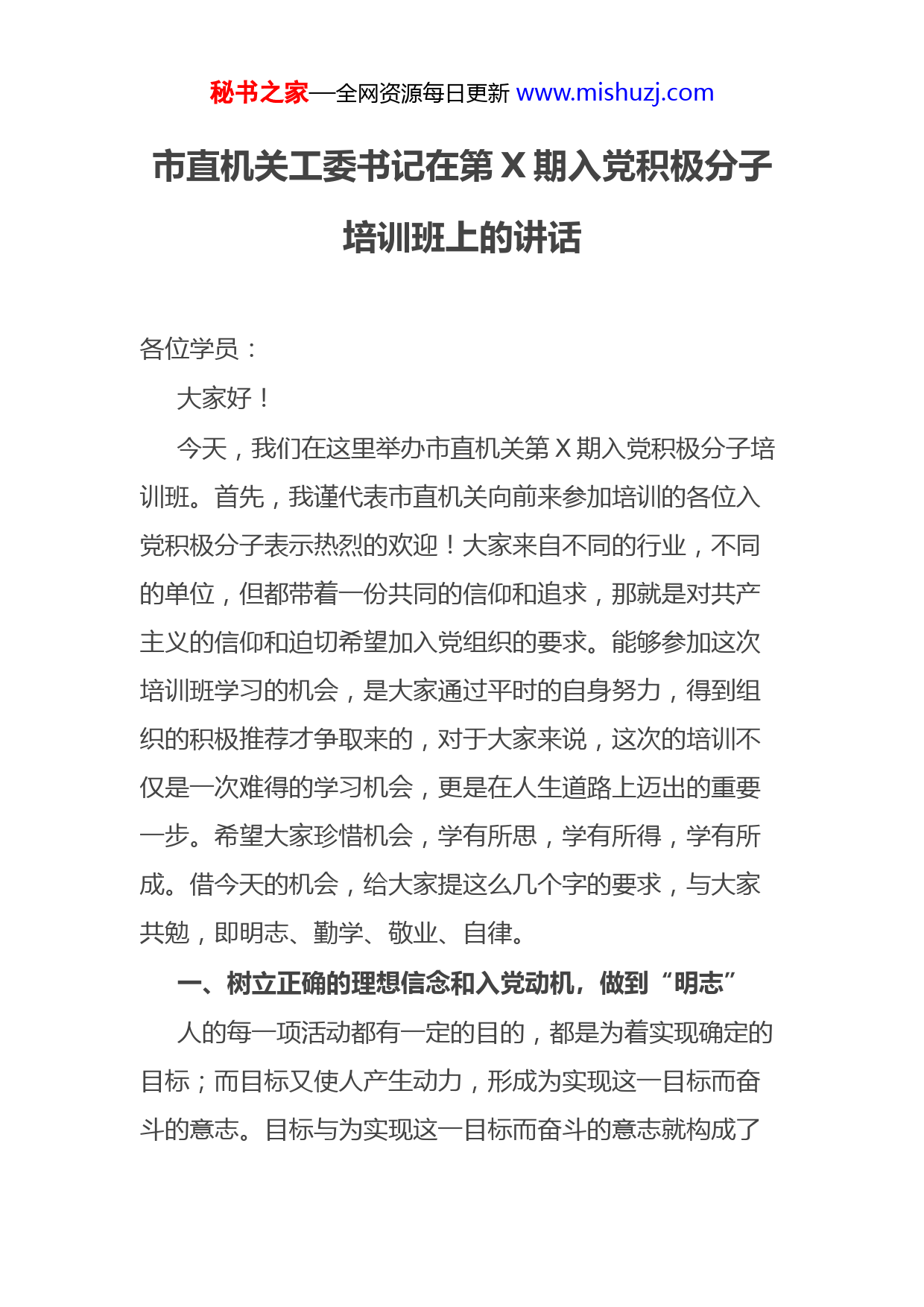 秘书之家—全网资源每日更新www.mishuzj.com市直机关工委书记在第X期入党积极分子培训班上的讲话各位学员:大家好!今天,我们在这里举办市直机关第X期入党积极分子培训班。首先,我谨代表市直机关向前来参加培训的各位入党积极分子表示热烈的欢迎!大家来自不同的行业,不同的单位,但都带着一份共同的信仰和追求,那就是对共产主义的信仰和迫切希望加入党组织的要求。能够参加这次培训班学习的机会,是大家通过平时的自身努力,得到组织的积极推荐才争取来的,对于大家来说,这次的培训不仅是一次难得的学习机会,更是在人生道路上迈出的重要一步。希望大家珍惜机会,学有所思,学有所得,学有所成。借今天的机会,给大家提这么几个字的要求,与大家共勉,即明志、勤学、敬业、自律。一、树立正确的理想信念和入党动机,做到“明志”人的每一项活动都有一定的目的,都是为着实现确定的目标;而目标又使人产生动力,形成为实现这一目标而奋斗的意志。目标与为实现这一目标而奋斗的意志就构成了秘书之家—全网资源每日更新www.mishuzj.com动机。入党动机正确与否,关系到党的纯洁性和党组织的战斗力。中国共产党是中国工人阶级的先锋队,党的最终目标是实现共产主义的社会制度。因此,对于要求入党的人来说,树立正确的入党动机,就是要树立正确的目标即共产主义的理想,要坚定为实现共产主义理想而奋斗的意志,即坚定共产主义信念。列宁指出,我们的任务是要保证我们党的巩固性、坚定性和纯洁性。保证党员队伍的纯洁性,在一定意义上讲取决于党员的入党动机。要纯洁党的队伍首先必须把住党员入党这一关,从思想入手,从动机抓起,确保党的队伍在思想上和政治上的纯洁性,确保党的战斗力。一个人如果入党的目标不正确、意志不坚定,即使入了党,也难免会在严峻的考验面前迷失方向,甚至走上错误的道路,不仅给党的事业带来损失,而且毁了自己。正是因为正确的入党动机对于个人成长、对于党的发展具有重要的作用,所以端正入党动机便成为个人争取入党的首要问题。在改革开放的环境下,各种社会思潮相互激荡,社会生活也日趋多样化、复杂化,这就难免这样或那样地影响人们的入党动机。今天我们都报了名,坐在了这里,但为什么会坐在这里,不知道大家有没有做过认真的思考,你为什么要入党,入党的动机在哪里,我想有的同志可能对此秘书之家—全网资源每日更新www.mishuzj.com认识比较模糊,有的认为,共产党是执政党,如果自己不是党员,将来会在使用、提拔上受影响;有的是随大流,看到别人写入党申请,如果自己不写,怕组织认为自己不要求进步;有的受家庭和亲朋好友的推动才递交申请书。这些不端正的入党动机都不同程度地带有功利化的倾向。怀着这种入党动机,即使加入了党组织,也不可能真正成为有党性有奉献精神的先锋战士。入党的确是个人追求进步的途径,但是这种进步不应是为了面子和狭隘的个人目的,而是为了党的事业,为了个人能在历史进程中正确发挥作用,实现最大的人生价值。X在谈共产党员的修养时,说到了这样一段话:……。这段话朴实无华,又真实感人,在我们教材的第135页大家可以看到。可见,坚定的信仰对一个人人生价值、社会价值的实现有着多么重要的作用。由此,我们可以得出结论,正确的入党动机应该是:对社会主义祖国和人民充满热爱,信仰和坚持马克思主义科学真理,愿意全心全意为人民服务,在建设有中国特色社会主义、实现中华民族伟大复兴、服务祖国的过程中实现人生价值,积极学习科学文化知识和共产主义的理论,不断从思想上丰富提高自己,坚定为共产主义奋斗的信念,由此而提出入党的要求。每一名企盼入党的同志都要时刻秘书之家—全网资源每日更新www.mishuzj.com提醒自己,入党是为了什么,入党以后要干什么,严格以党员标准要求自己,成为名副其实的共产党员。只有这样,我们的党才是一个充满希望的党。二、准确把握的学习内容和学习方法,做到“勤学”这期培训班第一期,机关工委对办好这次培训班,非常重视,作了大量的前期工作。希望大家端正态度,集中时间精力,静下心来认真学习,确保学有所获。一是要通过培训系统学习党的基本知识。党的基本知识是每个要求入党的积极分子必须掌握的最起码知识。每一个要求加入中国共产党的同志,都要首先掌握党的基本知识,对党有全面的了解。参加培训班的同志,虽然平时也参加过党组织召集的一些活动,也学习过党的知识,但内容往往比较零散,比较单一,没有形成系统。而集中培训,可以让大家对党的基本知识有一个全面、系统的了解,启发一些应有的思考。我们这次培训班,不仅要进行党的性质的教育,而且要进行党员标准教育,不仅要进行理想教育,而且要进行端正入党动机教育。在课程设置上,我们突出了以党的基础知识为重点,安排了……,同时,我们适当扩大了学习的视角,请到了……为大家解读当前国际国内的形势,……讲授《责任的力量》,这些老师既有着深厚的理论水平,又具备丰富的实践经验,此前都做了精心的准秘书之家—全网资源每日更新www.mishuzj.com备,希望能够通过这些课程教育,帮助大家从思想上解决入党问题。二是要在学习过程中讲究方法。具体做到“三个结合”。一是要坚持集中学习与个人自学相结合。这次
