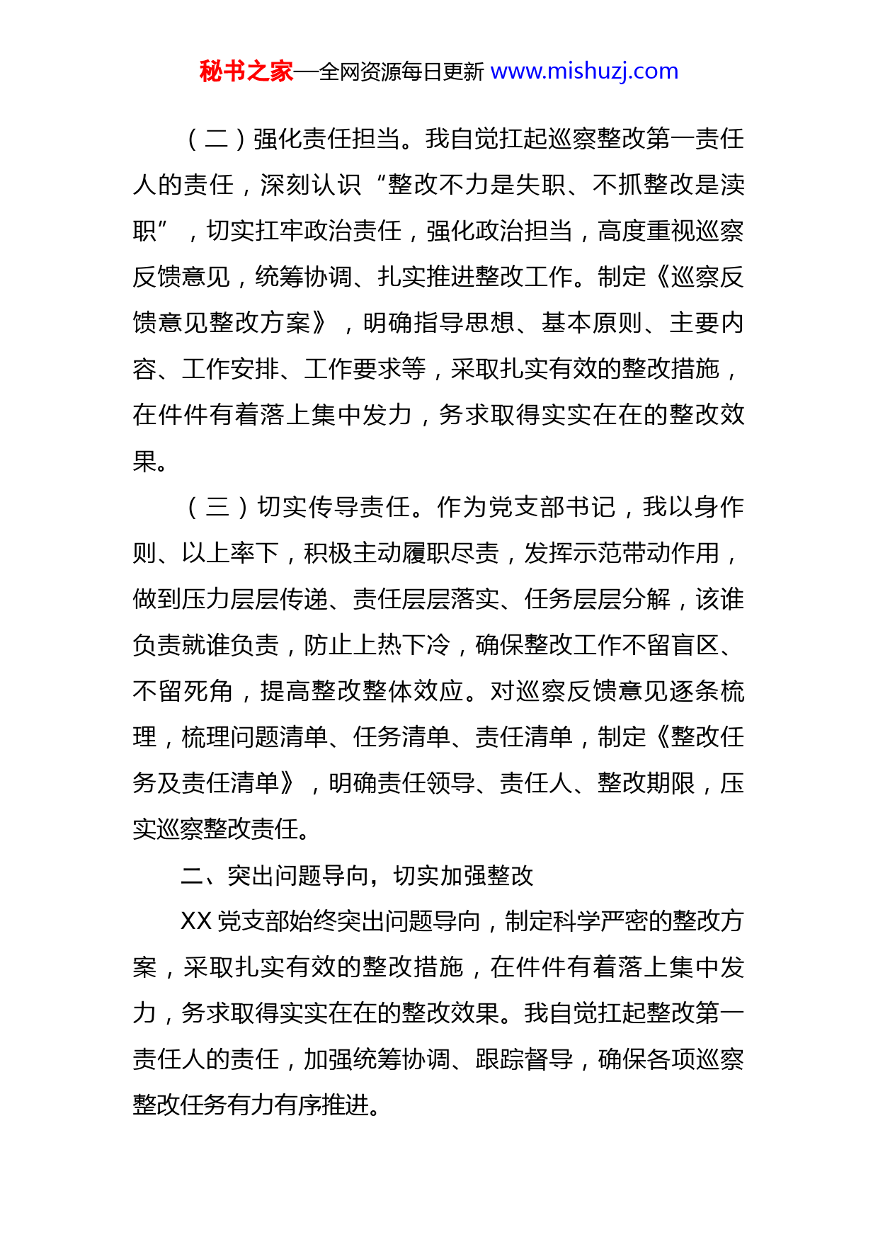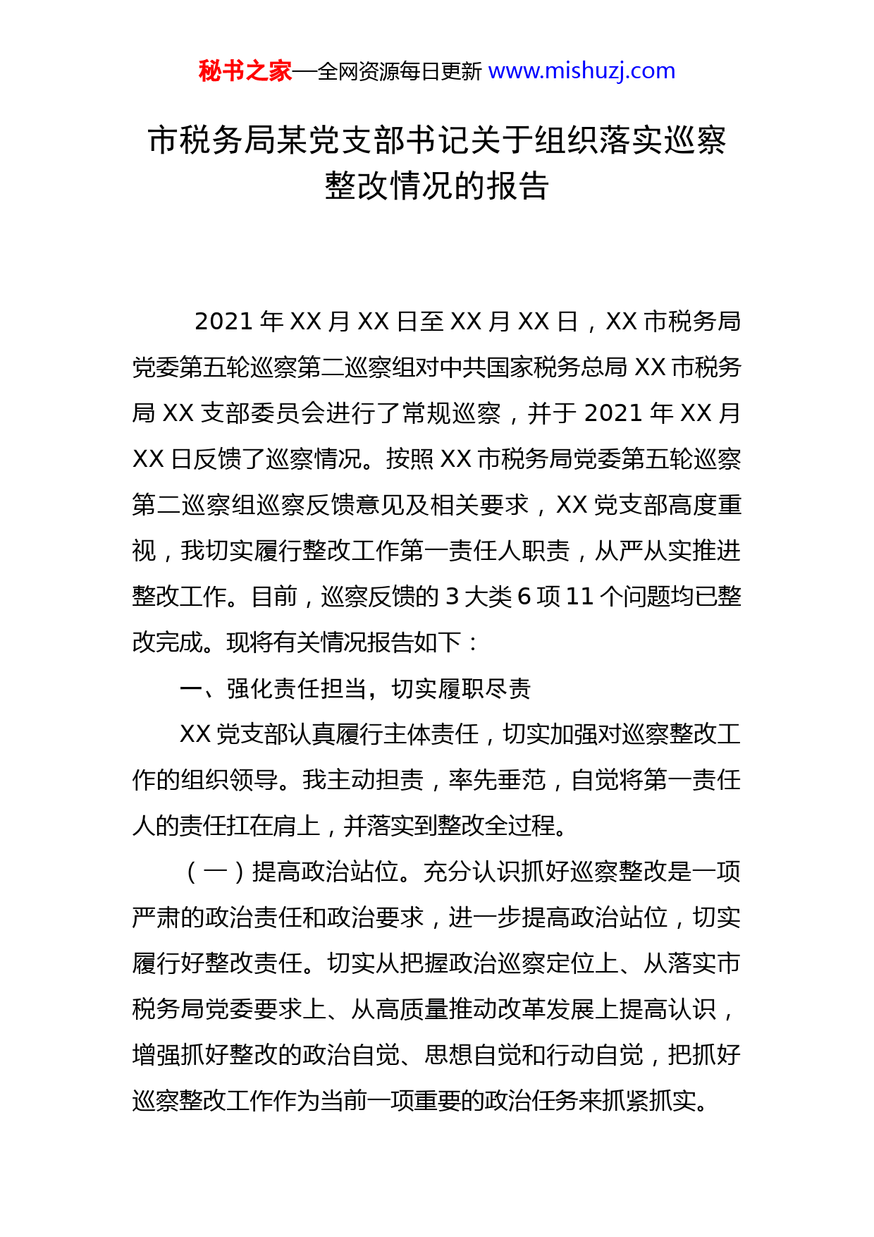 秘书之家—全网资源每日更新www.mishuzj.com市税务局某党支部书记关于组织落实巡察整改情况的报告2021年XX月XX日至XX月XX日,XX市税务局党委第五轮巡察第二巡察组对中共国家税务总局XX市税务局XX支部委员会进行了常规巡察,并于2021年XX月XX日反馈了巡察情况。按照XX市税务局党委第五轮巡察第二巡察组巡察反馈意见及相关要求,XX党支部高度重视,我切实履行整改工作第一责任人职责,从严从实推进整改工作。目前,巡察反馈的3大类6项11个问题均已整改完成。现将有关情况报告如下:一、强化责任担当,切实履职尽责XX党支部认真履行主体责任,切实加强对巡察整改工作的组织领导。我主动担责,率先垂范,自觉将第一责任人的责任扛在肩上,并落实到整改全过程。(一)提高政治站位。充分认识抓好巡察整改是一项严肃的政治责任和政治要求,进一步提高政治站位,切实履行好整改责任。切实从把握政治巡察定位上、从落实市税务局党委要求上、从高质量推动改革发展上提高认识,增强抓好整改的政治自觉、思想自觉和行动自觉,把抓好巡察整改工作作为当前一项重要的政治任务来抓紧抓实。秘书之家—全网资源每日更新www.mishuzj.com(二)强化责任担当。我自觉扛起巡察整改第一责任人的责任,深刻认识“整改不力是失职、不抓整改是渎职”,切实扛牢政治责任,强化政治担当,高度重视巡察反馈意见,统筹协调、扎实推进整改工作。制定《巡察反馈意见整改方案》,明确指导思想、基本原则、主要内容、工作安排、工作要求等,采取扎实有效的整改措施,在件件有着落上集中发力,务求取得实实在在的整改效果。(三)切实传导责任。作为党支部书记,我以身作则、以上率下,积极主动履职尽责,发挥示范带动作用,做到压力层层传递、责任层层落实、任务层层分解,该谁负责就谁负责,防止上热下冷,确保整改工作不留盲区、不留死角,提高整改整体效应。对巡察反馈意见逐条梳理,梳理问题清单、任务清单、责任清单,制定《整改任务及责任清单》,明确责任领导、责任人、整改期限,压实巡察整改责任。二、突出问题导向,切实加强整改XX党支部始终突出问题导向,制定科学严密的整改方案,采取扎实有效的整改措施,在件件有着落上集中发力,务求取得实实在在的整改效果。我自觉扛起整改第一责任人的责任,加强统筹协调、跟踪督导,确保各项巡察整改任务有力有序推进。秘书之家—全网资源每日更新www.mishuzj.com(一)坚持问题导向。紧紧围绕“三个聚焦”,针对巡察反馈的3大类6项11个问题,深入剖析根源,制定扎实有效的整改措施,一件一件抓、一件一件改,真抓真改、严改实改,确保整改无死角、不漏项,按时按质完成巡察整改任务。结合XX党支部实际,对存在问题认真研究梳理,集中力量对其中的重点问题、具有普遍性的突出问题开展整改整治,确保取得实效。(二)注重分类处置。全面分析和综合研判巡察反馈意见,对于近期能够整改到位的,抓紧落实,掌控进度,完成一个,销号一个,尽快形成一批整改成果。对于需要一段时间才能解决的问题,制定整改时间表、任务书,明确专人负责,分期分批整改。(三)务求整改实效。发扬求真务实作风,坚持以巡察整改工作推动改革、促进发展,敢于动真碰硬,坚决反对形式主义、官僚主义,杜绝表面整改、虚假整改、纸上整改,用严格的标准、严明的纪律、严实的作风推动整改走深走实。三、坚持抓常抓长,切实巩固成效XX党支部将以此次巡察整改为契机,举一反三,确保整改工作持续推进,切实巩固整改成效。我作为党支部书记,认真履职尽责,以此次巡察整改为契机,补齐短板,夯实基础,不断推动各项工作迈上新台阶。秘书之家—全网资源每日更新www.mishuzj.com(一)深入对照查摆。召开巡察整改专题组织生活会,推动巡察整改工作走深走实。会前认真组织学习,深入学习《巡视工作“双闭环”管理办法》等相关文件,普遍开展谈心谈话,诚恳听取意见建议,深刻对照巡察情况查摆问题,找出存在差距和不足,形成《支部委员会对照检视剖析材料》;会上组织党员结合巡察情况深入开展批评和自我批评,并在会上起到示范带头作用;会后针对查摆和评议出来的问题列出整改清单,明确整改事项和整改措施、整改时限,据巡察反馈问题整改台帐,对整改事项进行再对照再推进,带头抓好整改落实。(二)突出标本兼治。处理好“当下改”和“长久立”的关系,把解决共性问题、突出问题与完善制度、规范管理结合起来,坚持以点带面、举一反三,坚持纠建结合、破立并举,结合“三化”建设,着力完善打基础、管长远、固根本的制度机制。(三)抓好举一反三。坚持系统思维,围绕巡察反馈的问题,统筹结合总局、省局党委巡视巡察发现问题,举一反三、自查自纠。对照税务总局党委第六轮、第七轮巡视通报问题进行自查整改,促进相关领域共性问题的解决。特此报告。