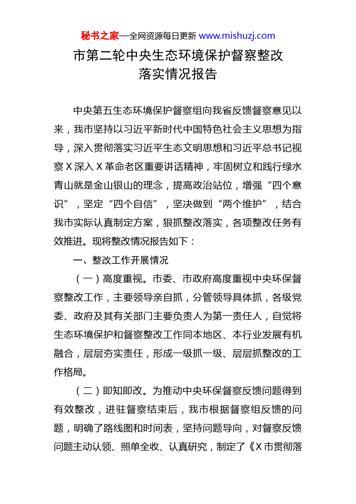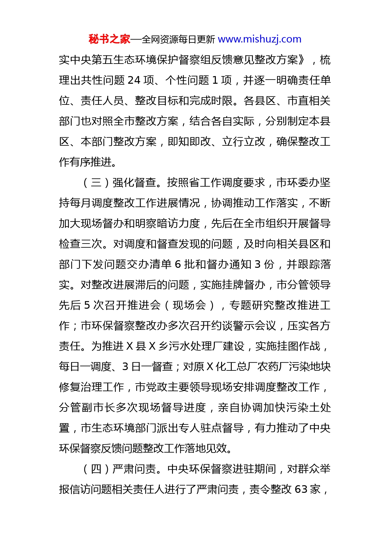 秘书之家—全网资源每日更新www.mishuzj.com市第二轮中央生态环境保护督察整改落实情况报告中央第五生态环境保护督察组向我省反馈督察意见以来,我市坚持以习近平新时代中国特色社会主义思想为指导,深入贯彻落实习近平生态文明思想和习近平总书记视察X深入X革命老区重要讲话精神,牢固树立和践行绿水青山就是金山银山的理念,提高政治站位,增强“四个意识”,坚定“四个自信”,坚决做到“两个维护”,结合我市实际认真制定方案,狠抓整改落实,各项整改任务有效推进。现将整改情况报告如下:一、整改工作开展情况(一)高度重视。市委、市政府高度重视中央环保督察整改工作,主要领导亲自抓,分管领导具体抓,各级党委、政府及其有关部门主要负责人为第一责任人,自觉将生态环境保护和督察整改工作同本地区、本行业发展有机融合,层层夯实责任,形成一级抓一级、层层抓整改的工作格局。(二)即知即改。为推动中央环保督察反馈问题得到有效整改,进驻督察结束后,我市根据督察组反馈的问题,明确了路线图和时间表,坚持问题导向,对督察反馈问题主动认领、照单全收、认真研究,制定了《X市贯彻落秘书之家—全网资源每日更新www.mishuzj.com实中央第五生态环境保护督察组反馈意见整改方案》,梳理出共性问题24项、个性问题1项,并逐一明确责任单位、责任人员、整改目标和完成时限。各县区、市直相关部门也对照全市整改方案,结合各自实际,分别制定本县区、本部门整改方案,即知即改、立行立改,确保整改工作有序推进。(三)强化督查。按照省工作调度要求,市环委办坚持每月调度整改工作进展情况,协调推动工作落实,不断加大现场督办和明察暗访力度,先后在全市组织开展督导检查三次。对调度和督查发现的问题,及时向相关县区和部门下发问题交办清单6批和督办通知3份,并跟踪落实。对整改进展滞后的问题,实施挂牌督办,市分管领导先后5次召开推进会(现场会),专题研究整改推进工作;市环保督察整改办多次召开约谈警示会议,压实各方责任。为推进X县X乡污水处理厂建设,实施挂图作战,每日一调度、3日一督查;对原X化工总厂农药厂污染地块修复治理工作,市党政主要领导现场安排调度整改工作,分管副市长多次现场督导进度,亲自协调加快污染土处置,市生态环境部门派出专人驻点督导,有力推动了中央环保督察反馈问题整改工作落地见效。(四)严肃问责。中央环保督察进驻期间,对群众举报信访问题相关责任人进行了严肃问责,责令整改63家,秘书之家—全网资源每日更新www.mishuzj.com立案处罚36家,罚款201万元。全市先后问责44人次,其中,行政记过处分1人,政务警告处分2人,党内警告处分4人,诫勉谈话17人,约谈20人。(五)加大宣传。综合运用电视、电台、报纸、网络等媒体,及时广泛深入宣传生态环境保护方面的先进事迹、典型人物和宝贵经验,曝光各类环境违法行为,在X日报对X市环境污染防治工作进行了全面报道;在X日报一版、二版和民生版分别开设了“坚决打赢大气污染防治攻坚战”、“防治大气污染,全力攻坚冲刺”、“曝光台”等栏目,采用评论、通讯、消息和照片的方式对全市大气污染防治工作进行全方位报道;在X广播电视台开设“特别关注”专栏报道我市环保攻坚工作;在X日报和X电视台定期投放专题报道,大容量、多视角、全方位宣传全市生态环境保护工作及环保督察反馈问题整改情况,曝光环境违法行为,营造了“保护环境,人人有责”的良好氛围。二、整改工作取得的主要成效(一)环境质量持续改善。环境空气质量持续领先。2022年,我市环境空气质量主要指标稳居全省第一,PM10平均浓度为60.43微克/立方米,PM2.5平均浓度为39.66微克/立方米,优良天数为297天,综合指数为3.871;环境空气质量常规监测6项因子中5项已实秘书之家—全网资源每日更新www.mishuzj.com现二级达标,其中PM10平均浓度优于省定目标任务5微克/立方米,PM2.5平均浓度优于省定目标1微克/立方米,得补生态补偿金6000余万元;辖区8个县实现全县域二级达标,空气质量排名全部进入全省前15位,其中X县、X县稳居全省前两位。水环境质量稳中向好。2022年,全市45个地表水考核断面水质均值全部达到Ⅲ类及以上标准,同比上升8.89%。其中,Ⅱ类及以上断面25个,占比55.56%,创我市有监控数据以来最好水平,得补生态补偿金1000余万元。10个县级及以上集中式饮用水水源地水质达标率为100%。土壤环境质量保持安全。土壤环境改良“五大任务”全部完成年度计划,全市建设用地安全利用率和受污染耕地安全利用率达到100%,土壤环境实现总体稳定、持续向好。(二)生态文明示范创建成效明显。X县创成国家生态文明建设示范县和全国“绿水青山就是金山银山”实践创新基地,成为全省两个“双创”成功县区之一;X创成全国“绿水青山就是金山银山”实践创新基地;X县成功创建为“国家生态文明建设示范县”;X区、X县、X县、X县成功创建为“省级生态县”;X县荣获“中国天然氧吧”称号。(三)企业绩效引领和VOCs治理快速推进。工业企业全面达标行动顺利推进,完成全市533家排放高、污染秘书之家—全网资源每日更新www.mishuzj.com重、影响大的工业企业排查整治,整改问题企业83家。推进企业绩效分级提升,6家企业达到A级标准、59家企业达到B级标准、10家企业达到绩效引领性标准,绿色发