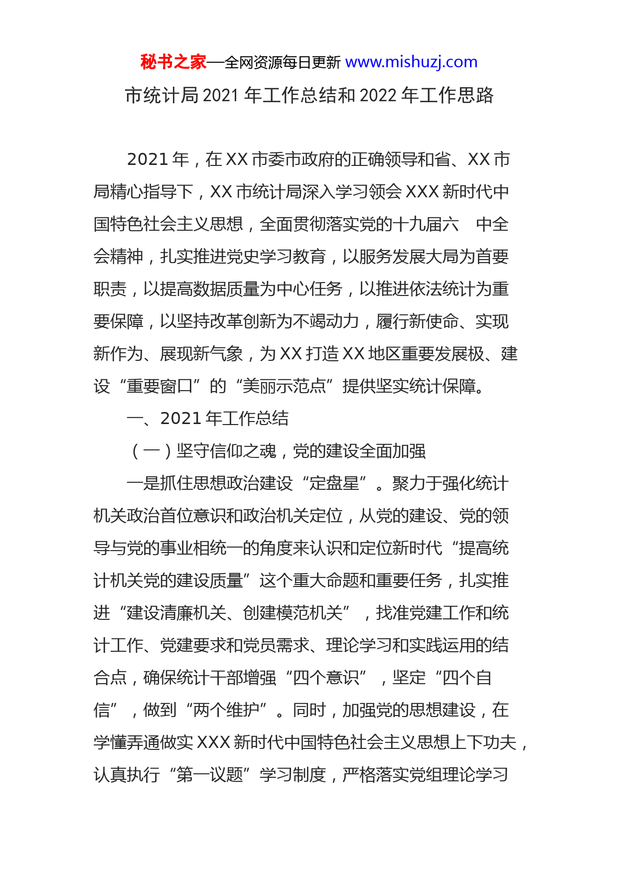 秘书之家—全网资源每日更新www.mishuzj.com市统计局2021年工作总结和2022年工作思路2021年,在XX市委市政府的正确领导和省、XX市局精心指导下,XX市统计局深入学习领会XXX新时代中国特色社会主义思想,全面贯彻落实党的十九届六中全会精神,扎实推进党史学习教育,以服务发展大局为首要职责,以提高数据质量为中心任务,以推进依法统计为重要保障,以坚持改革创新为不竭动力,履行新使命、实现新作为、展现新气象,为XX打造XX地区重要发展极、建设“重要窗口”的“美丽示范点”提供坚实统计保障。一、2021年工作总结(一)坚守信仰之魂,党的建设全面加强一是抓住思想政治建设“定盘星”。聚力于强化统计机关政治首位意识和政治机关定位,从党的建设、党的领导与党的事业相统一的角度来认识和定位新时代“提高统计机关党的建设质量”这个重大命题和重要任务,扎实推进“建设清廉机关、创建模范机关”,找准党建工作和统计工作、党建要求和党员需求、理论学习和实践运用的结合点,确保统计干部增强“四个意识”,坚定“四个自信”,做到“两个维护”。同时,加强党的思想建设,在学懂弄通做实XXX新时代中国特色社会主义思想上下功夫,认真执行“第一议题”学习制度,严格落实党组理论学习秘书之家—全网资源每日更新www.mishuzj.com中心组示范学、党支部“三会一课”制度学、青年干部带动学、党员干部自觉学的“四级联动”学习机制,切实做到应学必学、应学尽学、应学即学。2021年,共开展各类学习会近XX次,确保用党的最新理论来武装头脑,做到思想上对标对表、行动上紧跟紧随、执行上坚定坚决。二是打出党史学习教育“组合拳”。严格按照党中央决策部署和各级党委工作要求,将党史学习教育作为重要政治任务抓紧抓好,强化组织领导,成立工作专班,精心谋划推进,高标准高质量地完成学习教育各项任务,努力把学习成果转化为工作动力和成效,做到党史学习教育和推动统计事业新发展同向提质、螺旋上升。一方面,突出党史学习教育“学习”焦点,坚持分类施策,积极制定每月学习计划和每周工作要点,积极构建网上网下“双线”学习模式。线上,利用微信公众号,开展“看电影学党史”、“百年党史天天学”、“学习名言100句,回顾党史100年”等活动,促使统计干部在日常工作、生活中潜移默化接受熏陶。线下,在组织集中学习必学书目书籍和XXX系列重要讲话精神的基础上,通过举办“红色经典诵读”、“学党史跟党走”青年座谈会、“听老党员讲党史”等活动,引导统计干部从党的百年伟大奋斗历程中汲取继续前进的智慧力量。另一方面,突出党史学习教育“红色”特点,统筹安排开展“红色百年行·我来讲党史”、秘书之家—全网资源每日更新www.mishuzj.com“跟着红色地图学党史”、“向党说说心里话”、“唱支山歌给党听”等各类教育活动,扎实开展“我为群众办实事、我为企业解难题、我为基层减负担”专题实践活动,组织主题志愿服务活动XX余场,解决企业工作难题XX余项,积极发挥基层党组织战斗堡垒和党员先锋模范作用。三是细耕全面从严治党“责任田”。坚持把落实党组主体责任作为推动全面从严治党工作的核心,及时制定《2021年党风廉政建设和反腐败工作组织领导与责任分工》,细化量化局党组书记、党组成员、科室负责人具体责任清单和工作任务清单,并把全面从严治党工作纳入目标管理考核办法,实行一票否决制。坚持每季度召开党风廉政建设工作例会,及时传达学习上级重要决策部署、各类通报等党风廉政建设有关内容,总结工作,分析形势,切实做到年初有计划部署,年中有检查推进,年底有考核总结。同时,积极推进“学史力行扬正气”主题实践活动,实施作风建设“四讲”运动,加强对“庸懒散拖混”等突出作风问题的监督整治,召开警示教育学习会X场次,开展廉政约谈XX余次,全面梳理排查全局内部管理中的廉政风险点XX余条,引导统计干部持之以恒落实中央八项规定及实施细则精神,强化“人廉数实”的统计廉政理念,营造风清气正的干事创业环境。(二)筑牢成事之基,服务水平持续进步秘书之家—全网资源每日更新www.mishuzj.com一是“助”发展,着力提升预警能力。在扎实做好定报年报等常规统计工作和专项调查工作基础上,围绕xx市委市政府“打造发展极、建设示范市,争当先行者”的部署要求,结合xx发展特色和中长期发展目标,紧盯经济发展、文化建设、社会民生、绿色生态、科技创新等领域,突出共同富裕、乡村振兴、节能降耗、数字经济等主题,积极挖掘具有先行意义的统计指标,进一步强化对xx宏观经济运行的监测预警,形成每日要讯、每周简析、每月专报的分析解读模式,全年共撰写经济形势分析报告和专题汇报材料XX余篇,以“每日要讯”的形式向党委政府领导呈送统计最新数据资料XX余次。同时,坚持每月组织业务骨干深入5家以上企业、项目开展走访调研、座谈交流,深化苗头性、规律性、趋势性问题研究,切实提高对经济形势的科学研判能力和预警频率,延伸统计分析广度,切实把统计服务的价值体现在反映经济社会发展形势的准确性上,体现在服务党委政府科学决策的支撑性上,体现在助力xx经济社会持续健康发展上。二是“谋”创新,着力推进核算改革。巩固地区生产总值统一核算改革成果,探