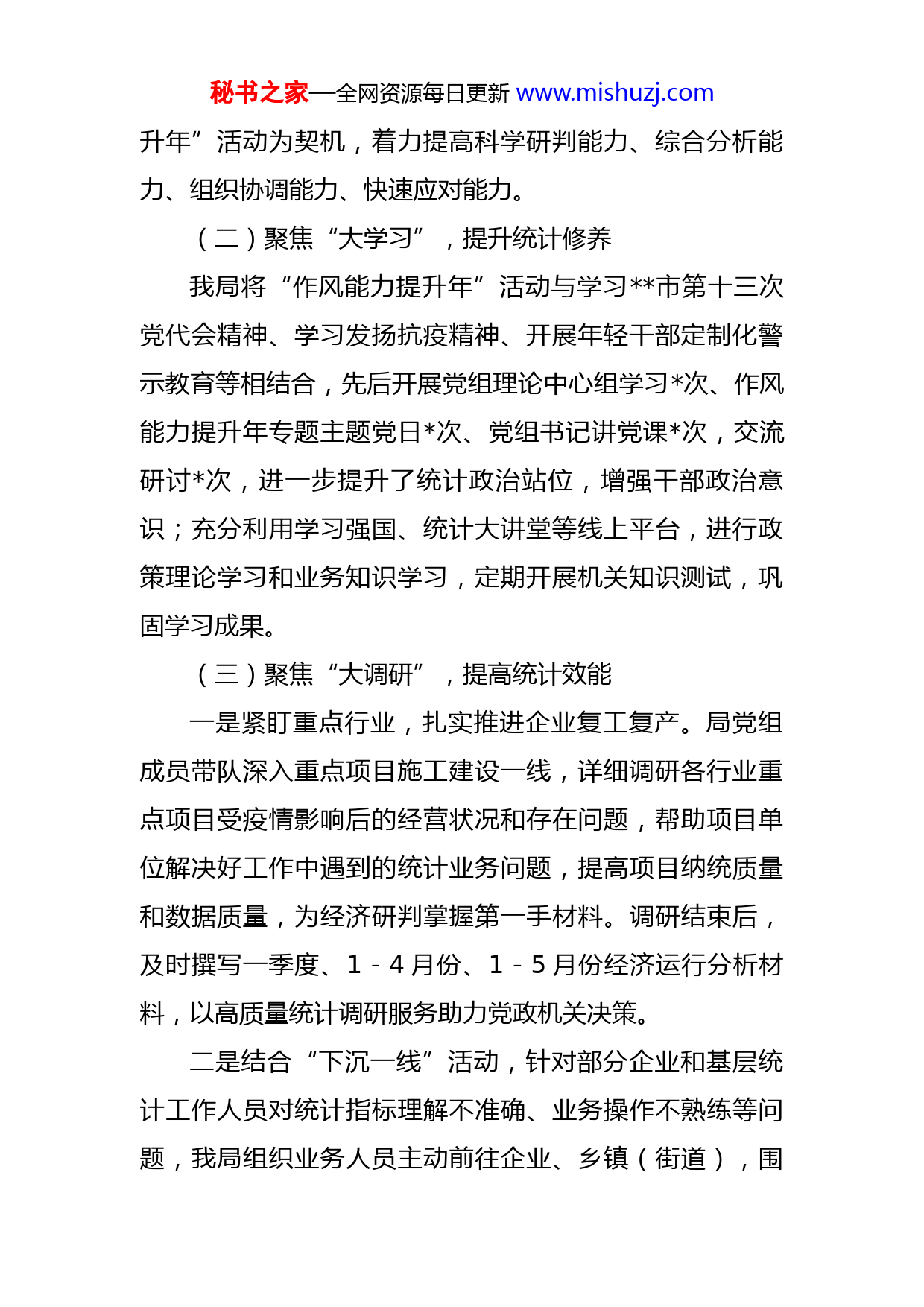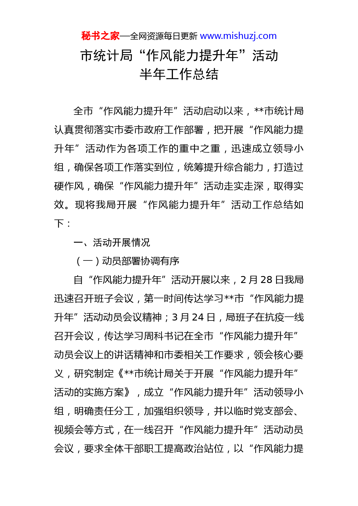 秘书之家—全网资源每日更新www.mishuzj.com市统计局“作风能力提升年”活动半年工作总结全市“作风能力提升年”活动启动以来,市统计局认真贯彻落实市委市政府工作部署,把开展“作风能力提升年”活动作为各项工作的重中之重,迅速成立领导小组,确保各项工作落实到位,统筹提升综合能力,打造过硬作风,确保“作风能力提升年”活动走实走深,取得实效。现将我局开展“作风能力提升年”活动工作总结如下:一、活动开展情况(一)动员部署协调有序自“作风能力提升年”活动开展以来,2月28日我局迅速召开班子会议,第一时间传达学习市“作风能力提升年”活动动员会议精神;3月24日,局班子在抗疫一线召开会议,传达学习周科书记在全市“作风能力提升年”动员会议上的讲话精神和市委相关工作要求,领会核心要义,研究制定《市统计局关于开展“作风能力提升年”活动的实施方案》,成立“作风能力提升年”活动领导小组,明确责任分工,加强组织领导,并以临时党支部会、视频会等方式,在一线召开“作风能力提升年”活动动员会议,要求全体干部职工提高政治站位,以“作风能力提秘书之家—全网资源每日更新www.mishuzj.com升年”活动为契机,着力提高科学研判能力、综合分析能力、组织协调能力、快速应对能力。(二)聚焦“大学习”,提升统计修养我局将“作风能力提升年”活动与学习市第十三次党代会精神、学习发扬抗疫精神、开展年轻干部定制化警示教育等相结合,先后开展党组理论中心组学习次、作风能力提升年专题主题党日次、党组书记讲党课次,交流研讨次,进一步提升了统计政治站位,增强干部政治意识;充分利用学习强国、统计大讲堂等线上平台,进行政策理论学习和业务知识学习,定期开展机关知识测试,巩固学习成果。(三)聚焦“大调研”,提高统计效能一是紧盯重点行业,扎实推进企业复工复产。局党组成员带队深入重点项目施工建设一线,详细调研各行业重点项目受疫情影响后的经营状况和存在问题,帮助项目单位解决好工作中遇到的统计业务问题,提高项目纳统质量和数据质量,为经济研判掌握第一手材料。调研结束后,及时撰写一季度、1-4月份、1-5月份经济运行分析材料,以高质量统计调研服务助力党政机关决策。二是结合“下沉一线”活动,针对部分企业和基层统计工作人员对统计指标理解不准确、业务操作不熟练等问题,我局组织业务人员主动前往企业、乡镇(街道),围秘书之家—全网资源每日更新www.mishuzj.com绕统计业务,讲解统计方法,面对面交流、手把手指导,对具有发展潜力、准备达到升规入统条件的企业做好培育工作,对新纳统企业在统计报表中遇到的各类问题做出详实解答,并指导企业进一步规范好统计台账、财务数据、报表工作,切实提升统计基层工作水平,确保数据的真实性和有效性。三是以“一线蹲点调研体悟”活动为抓手,定期前往包联新村,了解群众急难愁盼,宣传惠民惠农政策,并提出一些有建设性的意见和建议,着力锻造一支实字当头、干字为先的统计干部队伍。四是举办局统计调研分析作品评比活动,通过公平、公开、公正的原则,综合评议,并对最终评选结果进行通报,进一步调动撰写统计调研分析的积极性,提升统计人员把握经济运行的变化趋势,提高监测分析的针对性、预见性和科学性。(四)聚焦“大讨论”,争做统计先锋一是充分利用理论中心组学习、“早晚学”、主题党日等活动,围绕“提高数据质量”“强化形势研判和监测评价质效”“夯实统计基层基础”等领域开展研讨,进一步解放思想;二是聚焦数据采集、企业上报、项目新开工建设、入库纳统、统计法律法规、统计基层基础规范化建设、统计监测,等重点工作形成细化量化可操作的目标清秘书之家—全网资源每日更新www.mishuzj.com单、问题清单、创新突破项目清单;三是开展业务轮讲活动,全面梳理重点工作、重点任务,实现统计服务提速、提质、提效。二、“事要解决”事项开展情况目前我局正结合我市工作实际,在科技研发企业开展研发和劳动工资电子统计台账调研,并征求企业的有关意见。三、存在问题及下步打算“作风能力提升年”虽然已取得阶段性成绩,但是还存在理论学习提升不足、行动执行力、落实还有些滞后、整改提高仍需持续推进的问题。一是提高政治站位,强化思想建设。持续深化理论武装,发扬“挤”和“钻”的精神,将个人学和集中学相结合,制定学习计划,做到季度有计划、月月有专题,确保学习的系统性和计划性,进一步凝聚共识、拓宽思路。二是改进工作作风,强化服务意识。坚持问题导向,深化拓展“我为群众办实事”实践活动,持续开展走访服务企业活动,积极发挥统计部门作用,为实现我市高质量发展贡献统计力量。三是坚持督察整改,强化责任落实。坚持“边督查边整改、边整改边督查”,通过日常督查和随机抽查相结合的方式,确保各项问题整改落实到位,对整改过程中发现秘书之家—全网资源每日更新www.mishuzj.com的新问题,进一步明确整改重点,确保“作风能力提升年”活动取得实效。