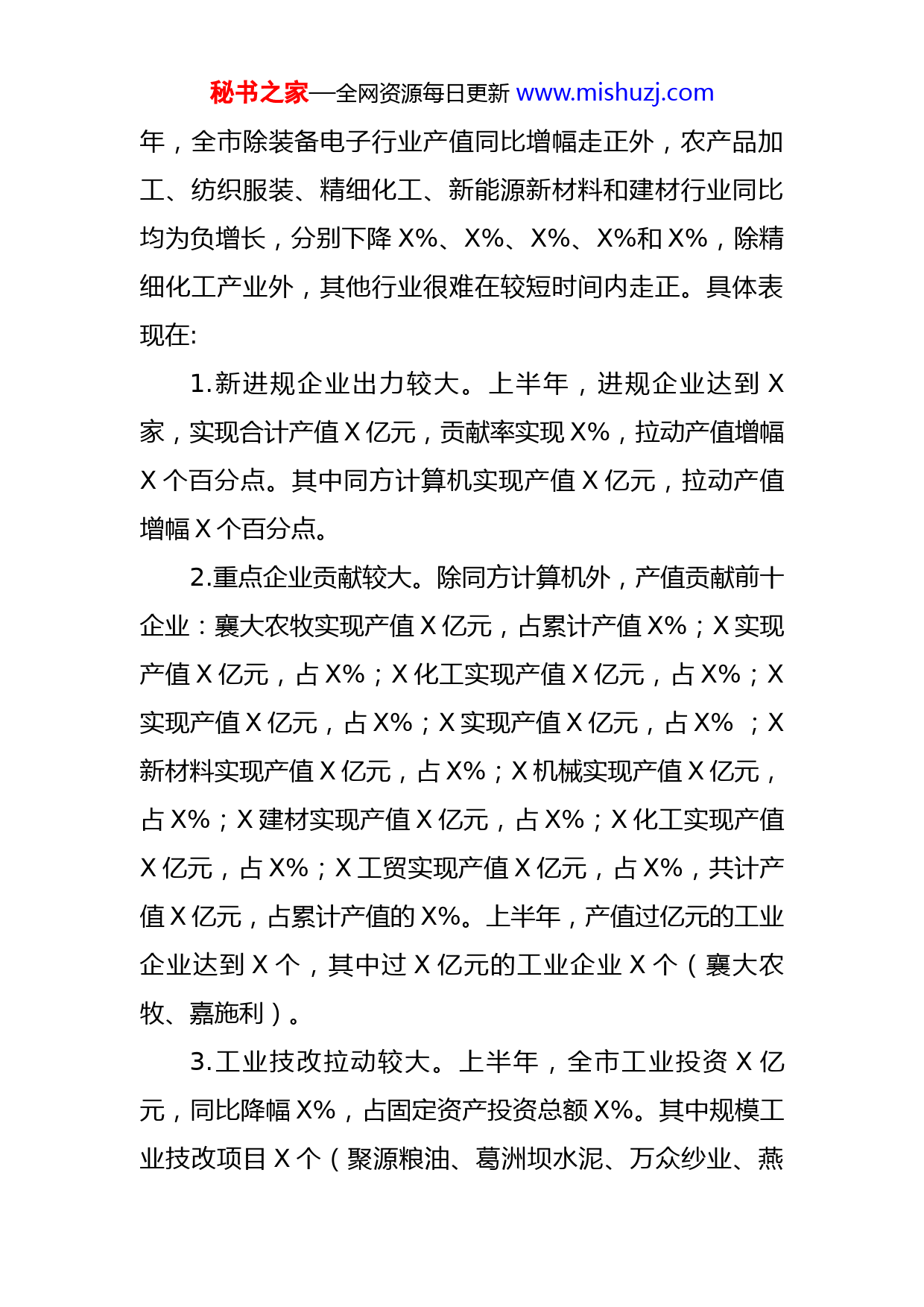 秘书之家—全网资源每日更新www.mishuzj.com市统计局上半年工业经济运行情况的报告今年,市统计局按照市委年初确定的工作目标,及时与科经局对接,划定了月度指标进度,为能够顺利完成指标任务打好了提前量。现汇报以下几点工作:一、围绕目标,做到“三个结合”1.坚持盯上与盯下相结合。精准掌握上级部门对经济发展总体态势的研判,及时对我市经济发展特点进行及时预估分析,做到紧跟趋势不走偏。2.坚持盯左与盯右相结合。一方面做好与周边七县市区的经济对比分析,找出经济发展差距,找准改进工作方式方法,另一方面做好与科经局、镇(办区)对接,及时提出统计方法制度范围内改进措施和办法,做到精准指导。3.坚持盯面与盯点相结合。一方面及时掌握全市工作经济发展指标的运行态势,做到目标清楚、进度清楚、措施清楚;另一方面盯规下企业、盯产值波动大的企业,做好向规上企业的推荐和对产值波动大企业的核查分析,为进一步在总量和体量上做大做强挖掘空间。二、工业经济指标完成情况上半年,全市X家工业企业累计完成工业产值X亿元,同比下降X%,比上半年降幅收窄X个百分点。其中X月份完成产值X亿元,同比增长X%。从分行业来看,上半秘书之家—全网资源每日更新www.mishuzj.com年,全市除装备电子行业产值同比增幅走正外,农产品加工、纺织服装、精细化工、新能源新材料和建材行业同比均为负增长,分别下降X%、X%、X%、X%和X%,除精细化工产业外,其他行业很难在较短时间内走正。具体表现在:1.新进规企业出力较大。上半年,进规企业达到X家,实现合计产值X亿元,贡献率实现X%,拉动产值增幅X个百分点。其中同方计算机实现产值X亿元,拉动产值增幅X个百分点。2.重点企业贡献较大。除同方计算机外,产值贡献前十企业:襄大农牧实现产值X亿元,占累计产值X%;X实现产值X亿元,占X%;X化工实现产值X亿元,占X%;X实现产值X亿元,占X%;X实现产值X亿元,占X%;X新材料实现产值X亿元,占X%;X机械实现产值X亿元,占X%;X建材实现产值X亿元,占X%;X化工实现产值X亿元,占X%;X工贸实现产值X亿元,占X%,共计产值X亿元,占累计产值的X%。上半年,产值过亿元的工业企业达到X个,其中过X亿元的工业企业X个(襄大农牧、嘉施利)。3.工业技改拉动较大。上半年,全市工业投资X亿元,同比降幅X%,占固定资产投资总额X%。其中规模工业技改项目X个(聚源粮油、葛洲坝水泥、万众纱业、燕秘书之家—全网资源每日更新www.mishuzj.com京啤酒、禾丰米业和生升纺织),累计投资X亿元,同比下降X%,占工业投资X%,共计实现产值X亿元,占累计产值X%三、存在的问题1.产值增长提速较慢。一方面受环保治理、企业注销和统计核查双重影响,全市有X家企业从X、X月份开始在平台上停止报数。X家企业月平减少产值X亿元,至少拉低月增速X个百分点。另一方面,新入规企业块头较小。绿鑫生态、吉人涂料、东葳科技从年初进规到现在累计产值仅实现X亿元。2.部分企业质量不优。X月份,按照上级业务部门要求对不达标的规上企业进行清库,而从摸底结果来看,有X家企业存在不达标情况,直接拉低了产值增速。3.价格因素影响较大。如棉纱,今年上半年全市生产棉纱X万吨,产值X亿元,与同期产量、产值相比,分别增长同比增长X%和下降X%。合成氨吨产品下降X元以上、硫酸价格下跌幅度超过X%等,预计影响全年产值超过X亿元。(X月份财务表还在报送)4.部分重点企业生产不佳。截止X月份,累计产值实现与同期持平及以上的仅有X家企业。其中一部分重点企业负增长较大,如襄大农牧累计产值同比下降X%,大山合农业下降X%,雅新家纺下降X%,天舒纺织下降X%,新秘书之家—全网资源每日更新www.mishuzj.com鄂西下降X%,共同药业下降X%,葛洲坝下降X%,安达水泥下降X%,华润风电下降X%。5.匹配性指标支撑不足。X月份,工业用电量为X万千瓦时,同比增长X%,在X县(市区)排名第X,与全市平均增幅相比,相差X个百分点;上半年,工业用电量累计为X万千瓦时,同比下降X%,比全市平均增幅下降X个百分点,在X县(市区)排名第X。X月份工业增值税X万元,同比下降X%,与X县(市区)平均增幅相差X个百分点,排第X;上半年份工业增值税累计X万元,同比下降X%,与X县(市区)平均增幅相差X个百分点,排第X。(X月份指标数据未出来)四、建议1.加快市场主体培育。充分调动各行业主管部门对照年初的制定新进企业个数和年度工作目标,开展倒排工序、强化施工,及时发现、培育、壮大一批市场主体,让他们及时入库报数。2.做实企业退库工作。X月份,不达标企业清退工作正在实施,如果今年不能对不达标企业进行有序退库,特别是一些僵尸企业、“三无”(无厂房、无人员、无设备)企业不能实现有效退库,不仅今后要背负较大的同期基数,影响明年的经济运行态势,而且也会给后续统计核查和统计执法检查埋下隐患。这项工作难度较大,主要存秘书之家—全网资源每日更新www.mishuzj.com在:一是前期平台锁定的X家企业面对不能报数、不能退库的问题,二是新摸底的企业平台报数已经超过X万元,也面对难于退库问题。3.做好市场主体服务。对生产下滑较大的重点企业,如新鄂西、共同药业、华润风电和华恒达等,各项目服务单位应安排专人进行蹲点服务,帮助企业打通资金链、产业链、人才链、物流链和原料端,为企业发展站台唱戏,尽快实现企业满负荷生产。4.加大工作调度力度。落实各