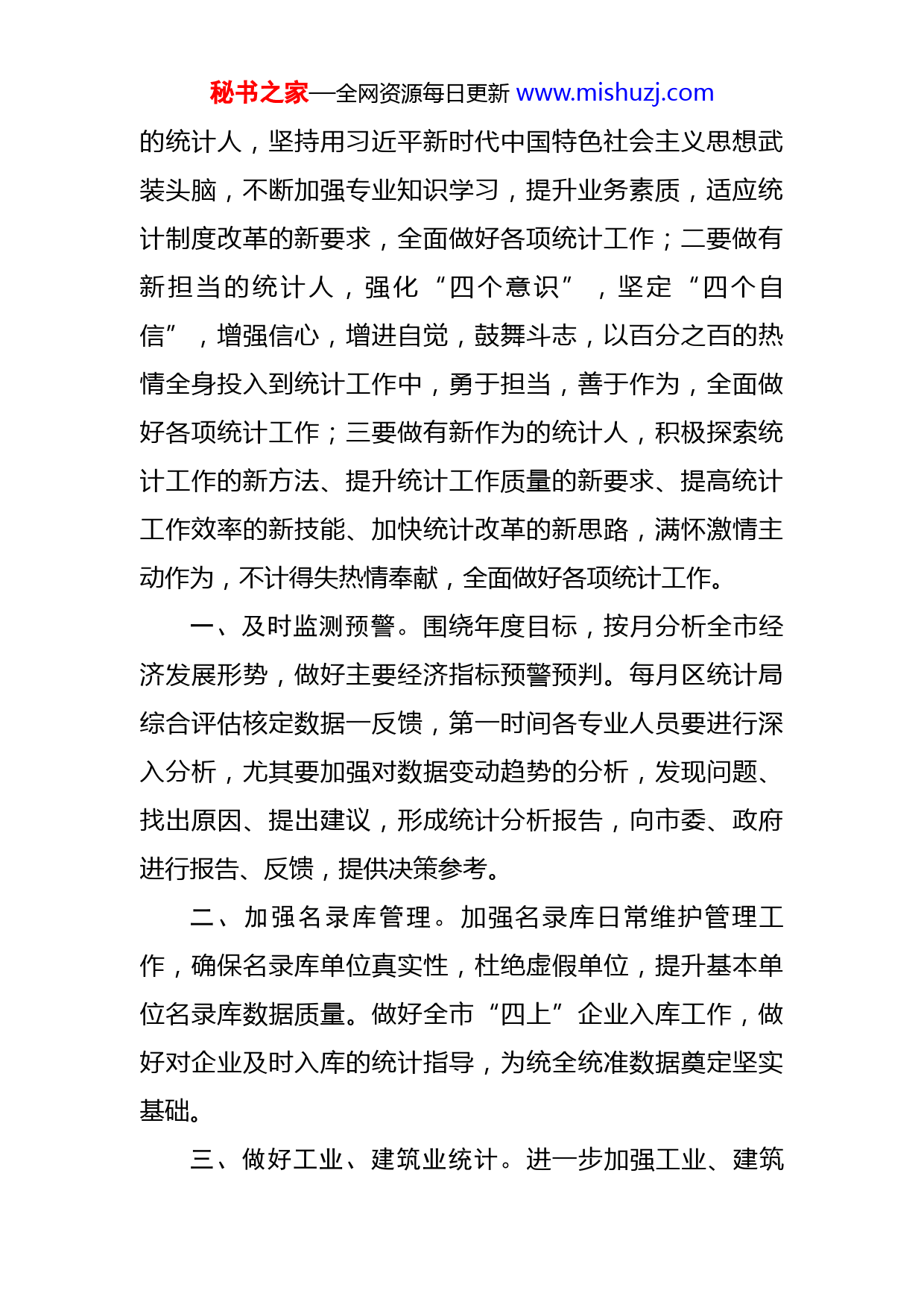 秘书之家—全网资源每日更新www.mishuzj.com市统计局长“七一”党课按照市委统一安排,今天由我为市统计局全体干部讲一堂专题党课。重点是围绕拥护“两个确立”、做到“两个维护”。拥护“两个确立”、做到“两个维护”是讲政治的最根本要求、最基本体现,但有些同志感觉“两个确立”、“两个维护”太宏观,不知道具体的实践路径,作为我们统计人,拥护“两个确立”、做到“两个维护”最基本的是要做到五点:一要保持统计数据真实。坚持数据质量第一,切实把提高统计数据质量作为统计工作的生命线,坚决杜绝数据造假。二要坚持统计服务发展。反映经济社会发展状况,提供服务要做到快精准、快速。三要坚持为民服务。以企业、调查对象为中心,及时反映企业、人民心声和期盼,反映民生实事的满意度、获得感。四要不忘改革创新。围绕建立现代化统计体系的新要求,勇于担当,开阔思路,以新视野、新思路、新方法解决统计发展中的难题。五要不忘廉洁自律。牢记自律的基本要求,自觉践行廉洁自律各项纪律规定,自觉接受监督,永葆先进性和纯洁性,不断把党的建设伟大工程向前推进。作为我们统计局的全体干部职工以后要形成以担当为荣、以发展为重、以奋斗为乐的浓厚氛围:一要做新时代秘书之家—全网资源每日更新www.mishuzj.com的统计人,坚持用习近平新时代中国特色社会主义思想武装头脑,不断加强专业知识学习,提升业务素质,适应统计制度改革的新要求,全面做好各项统计工作;二要做有新担当的统计人,强化“四个意识”,坚定“四个自信”,增强信心,增进自觉,鼓舞斗志,以百分之百的热情全身投入到统计工作中,勇于担当,善于作为,全面做好各项统计工作;三要做有新作为的统计人,积极探索统计工作的新方法、提升统计工作质量的新要求、提高统计工作效率的新技能、加快统计改革的新思路,满怀激情主动作为,不计得失热情奉献,全面做好各项统计工作。一、及时监测预警。围绕年度目标,按月分析全市经济发展形势,做好主要经济指标预警预判。每月区统计局综合评估核定数据一反馈,第一时间各专业人员要进行深入分析,尤其要加强对数据变动趋势的分析,发现问题、找出原因、提出建议,形成统计分析报告,向市委、政府进行报告、反馈,提供决策参考。二、加强名录库管理。加强名录库日常维护管理工作,确保名录库单位真实性,杜绝虚假单位,提升基本单位名录库数据质量。做好全市“四上”企业入库工作,做好对企业及时入库的统计指导,为统全统准数据奠定坚实基础。三、做好工业、建筑业统计。进一步加强工业、建筑秘书之家—全网资源每日更新www.mishuzj.com业等专业的统计调查工作,加强数据质量的分析评审工作,提升各专业的统计调查质量。四、抓好服务业统计。加大对服务业企业特别是重点服务业企业的督导检查,加强与企业沟通和联系,提高企业对统计工作的重视程度,规范企业统计工作,做到数出有据,确保全面真实反映全市服务业发展情况。五、加强投资统计。加强与市发改、工信等相关部门沟通和配合,认真做好全市固定资产投资和房地产开发新开工项目的入库管理工作,认真梳理、密切跟踪新上项目和规模以上项目,关注新上项目、规模以上项目发展动态,尽快形成新的投资增量,及时纳入统计范围,确保“应统尽统”。六、加强农业统计工作。由于区县统计员变更频繁,统计档案移交不到位或根本就没有统计档案,加之统计员同时担负着多项其他工作,又对农业方面的具体情况不熟悉,致使农业统计方面存在好多问题,一是统计数据收集难,区县统计数据质量不高;二是区县统计人员部门横向联系少,数据来源渠道单一;三是统计人员不稳定,业务不熟练;四是统计台账不健全,原始数据采集不规范等等,直接造成了统计数据的来源和质量存在一定的问题。最近一段时间,爱红局长和马媛股长为了提高农业统计数据的质量,加班加点,成效还是明显的,农业统计报表体秘书之家—全网资源每日更新www.mishuzj.com系初步建立起来了。今后还要做好以下四方面的工作:一是加强培训,从源头上抓好统计工作。农业统计人员更换频繁且大多是半路出家,缺少专业技术培训和指导,因此要加强农村统计基础工作和业务培训,提高农业统计人员的业务素质。二是加强审核,确保农业统计工作数据质量。农业报表表多、指标多、表间逻辑关系多,这就要求我们要严把数据质量,对不合逻辑、变化过大的数据及时查找原因,做好数据评估工作,确保上报数据质量。三是加强农业台账审核工作,结合年报报表数据,对统计台账进行核对、检查,夯实区县统计基础工作。四是加强沟通,及时衡量农业统计各项数据。各项数据上报前,及时和农牧、林业、调查队等相关单位协调沟通农业报表中的有关数据,横向比对,衡量农业统计数据与其他单位数据的关联性。七、加强经济指标的上报把关工作。坚持“应统尽统”原则,确保统计数据上报全面、准确、客观。抓源头统计数据,抓统计数据上报,抓重点考核统计指标数据。对统计数据上报前实行专业人员初审,分管领导复审,局主要领导终审。通过“三抓”和“三审”来保证统计数据的质量。八、强化对接协调。纵向积极与区、市统计部门联系沟通,及时了解相关专业数据和考核动向。横向密切联系