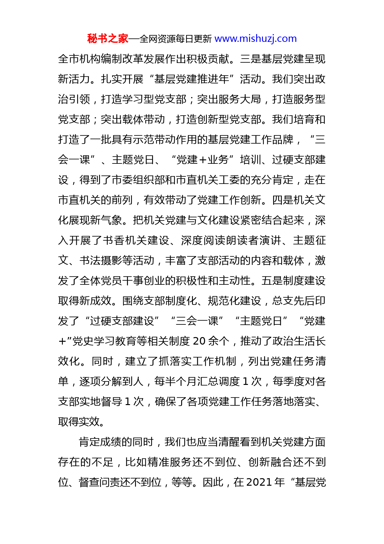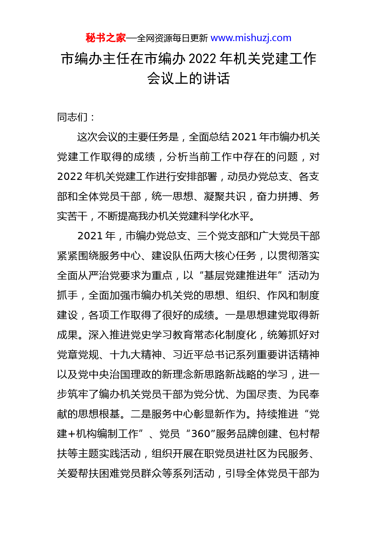 秘书之家—全网资源每日更新www.mishuzj.com市编办主任在市编办2022年机关党建工作会议上的讲话同志们:这次会议的主要任务是,全面总结2021年市编办机关党建工作取得的成绩,分析当前工作中存在的问题,对2022年机关党建工作进行安排部署,动员办党总支、各支部和全体党员干部,统一思想、凝聚共识,奋力拼搏、务实苦干,不断提高我办机关党建科学化水平。2021年,市编办党总支、三个党支部和广大党员干部紧紧围绕服务中心、建设队伍两大核心任务,以贯彻落实全面从严治党要求为重点,以“基层党建推进年”活动为抓手,全面加强市编办机关党的思想、组织、作风和制度建设,各项工作取得了很好的成绩。一是思想建党取得新成果。深入推进党史学习教育常态化制度化,统筹抓好对党章党规、十九大精神、习近平总书记系列重要讲话精神以及党中央治国理政的新理念新思路新战略的学习,进一步筑牢了编办机关党员干部为党分忧、为国尽责、为民奉献的思想根基。二是服务中心彰显新作为。持续推进“党建+机构编制工作”、党员“360”服务品牌创建、包村帮扶等主题实践活动,组织开展在职党员进社区为民服务、关爱帮扶困难党员群众等系列活动,引导全体党员干部为秘书之家—全网资源每日更新www.mishuzj.com全市机构编制改革发展作出积极贡献。三是基层党建呈现新活力。扎实开展“基层党建推进年”活动。我们突出政治引领,打造学习型党支部;突出服务大局,打造服务型党支部;突出载体带动,打造创新型党支部。我们培育和打造了一批具有示范带动作用的基层党建工作品牌,“三会一课”、主题党日、“党建+业务”培训、过硬支部建设,得到了市委组织部和市直机关工委的充分肯定,走在市直机关的前列,有效带动了党建工作创新。四是机关文化展现新气象。把机关党建与文化建设紧密结合起来,深入开展了书香机关建设、深度阅读朗读者演讲、主题征文、书法摄影等活动,丰富了支部活动的内容和载体,激发了全体党员干事创业的积极性和主动性。五是制度建设取得新成效。围绕支部制度化、规范化建设,总支先后印发了“过硬支部建设”“三会一课”“主题党日”“党建+”党史学习教育等相关制度20余个,推动了政治生活长效化。同时,建立了抓落实工作机制,列出党建任务清单,逐项分解到人,每半个月汇总调度1次,每季度对各支部实地督导1次,确保了各项党建工作任务落地落实、取得实效。肯定成绩的同时,我们也应当清醒看到机关党建方面存在的不足,比如精准服务还不到位、创新融合还不到位、督查问责还不到位,等等。因此,在2021年“基层党秘书之家—全网资源每日更新www.mishuzj.com建推进年”的基础上,我们把2022年定为市编办机关党建工作“升级提质年”。关于今年的工作,我强调五点意见。第一,把握一条主线,全面贯彻落实党的十九大精神。牢牢把握全面学习宣传贯彻党的十九大精神这条主线,把学习贯彻党的十九大精神作为首要政治任务,结合党史学习教育、“三会一课”、主题党日、理论中心组学习等载体,组织广大党员干部深刻领会把握精神实质和丰富内涵,努力在学懂弄通做实上下功夫,切实把思想和行动统一到党的十九大精神上来。组织开展“大学习、大培训、大实践”活动,继续推进机构编制系统“党建+业务”培训三年规划,通过支部书记轮训、党务干部培训、普通党员集训、邀请专家授课等形式,开展党的十九大精神集中学习活动;通过开展党建测试、知识竞赛、主题征文、演讲比赛等形式,调动党员干部参与积极性,营造浓厚学习氛围。围绕学习贯彻党的十九大精神,每月开展党建知识选学,每季度进行党建知识测试,确保党的十九大精神入心入脑。第二,增强“四个意识”,矢志不渝把政治建设摆在首位。一要加强政治理论学习,切实增强“四个意识”。认真学习贯彻《中共中央政治局关于加强和维护党中央集中统一领导的若干规定》精神,牢固树立“四个意识”,秘书之家—全网资源每日更新www.mishuzj.com坚定维护习近平同志的核心地位、领袖权威,坚定执行党的政治路线,在政治立场、政治方向、政治原则、政治道路上同党中央保持高度一致。坚持以正确的意识形态为引领,严格落实党委(党组)意识形态工作责任制,充分发挥思想教育引领示范的重要作用。二要严肃党内政治生活,不断营造良好政治生态。认真落实“三会一课”、民主生活会和组织生活会等制度,党总支定期对各支部开展党内政治生活专项督查。积极开展主题党日活动,坚持党员领导干部参加双重组织生活,推动党内政治生活经常、严肃、认真地开展。全面推广灯塔-党建在线平台,运用“编办”微信公众号、市编办党史学习教育微信群等新媒体新技术创新方式方法,丰富党内政治生活的形式和载体,增强党内政治生活的吸引力和感染力。三要强化党性锻炼,认真抓好“不忘初心、牢记使命”主题教育。按照中央和省、市委统一部署,以县处级以上领导干部为重点,深入扎实开展“不忘初心、牢记使命”主题教育,引导全体党员干部强化党性锻炼,尊崇党章,强化党员意识,筑牢宗旨观念,着力解决好思想不纯、组织不纯、作风不纯等问题,切实打造忠诚干净担当的机构编制党员干部队伍。第三,突出政治功能,坚持不懈推进组织建设。主要在“五