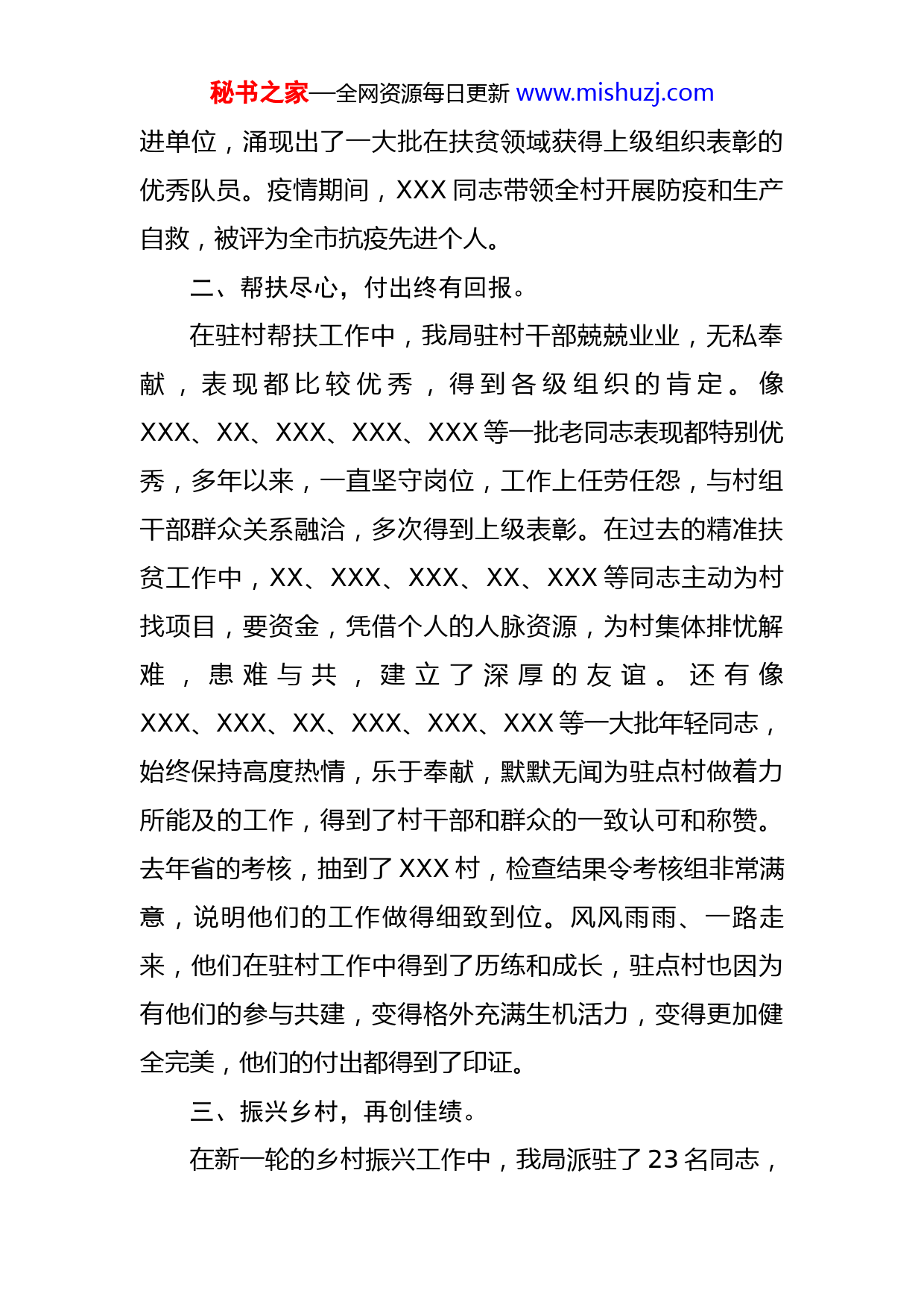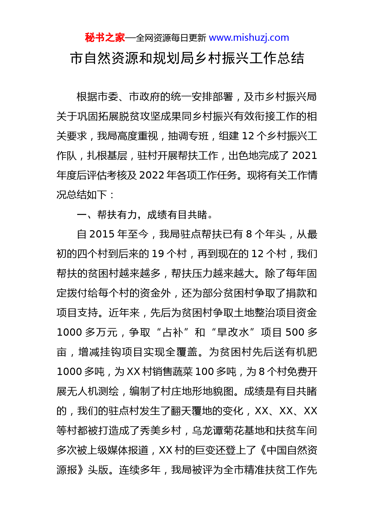 秘书之家—全网资源每日更新www.mishuzj.com市自然资源和规划局乡村振兴工作总结根据市委、市政府的统一安排部署,及市乡村振兴局关于巩固拓展脱贫攻坚成果同乡村振兴有效衔接工作的相关要求,我局高度重视,抽调专班,组建12个乡村振兴工作队,扎根基层,驻村开展帮扶工作,出色地完成了2021年度后评估考核及2022年各项工作任务。现将有关工作情况总结如下:一、帮扶有力,成绩有目共睹。自2015年至今,我局驻点帮扶已有8个年头,从最初的四个村到后来的19个村,再到现在的12个村,我们帮扶的贫困村越来越多,帮扶压力越来越大。除了每年固定拨付给每个村的资金外,还为部分贫困村争取了捐款和项目支持。近年来,先后为贫困村争取土地整治项目资金1000多万元,争取“占补”和“旱改水”项目500多亩,增减挂钩项目实现全覆盖。为贫困村先后送有机肥1000多吨,为XX村销售蔬菜100多吨,为8个村免费开展无人机测绘,编制了村庄地形地貌图。成绩是有目共睹的,我们的驻点村发生了翻天覆地的变化,XX、XX、XX等村都被打造成了秀美乡村,乌龙谭菊花基地和扶贫车间多次被上级媒体报道,XX村的巨变还登上了《中国自然资源报》头版。连续多年,我局被评为全市精准扶贫工作先秘书之家—全网资源每日更新www.mishuzj.com进单位,涌现出了一大批在扶贫领域获得上级组织表彰的优秀队员。疫情期间,XXX同志带领全村开展防疫和生产自救,被评为全市抗疫先进个人。二、帮扶尽心,付出终有回报。在驻村帮扶工作中,我局驻村干部兢兢业业,无私奉献,表现都比较优秀,得到各级组织的肯定。像XXX、XX、XXX、XXX、XXX等一批老同志表现都特别优秀,多年以来,一直坚守岗位,工作上任劳任怨,与村组干部群众关系融洽,多次得到上级表彰。在过去的精准扶贫工作中,XX、XXX、XXX、XX、XXX等同志主动为村找项目,要资金,凭借个人的人脉资源,为村集体排忧解难,患难与共,建立了深厚的友谊。还有像XXX、XXX、XX、XXX、XXX、XXX等一大批年轻同志,始终保持高度热情,乐于奉献,默默无闻为驻点村做着力所能及的工作,得到了村干部和群众的一致认可和称赞。去年省的考核,抽到了XXX村,检查结果令考核组非常满意,说明他们的工作做得细致到位。风风雨雨、一路走来,他们在驻村工作中得到了历练和成长,驻点村也因为有他们的参与共建,变得格外充满生机活力,变得更加健全完美,他们的付出都得到了印证。三、振兴乡村,再创佳绩。在新一轮的乡村振兴工作中,我局派驻了23名同志,秘书之家—全网资源每日更新www.mishuzj.com继续驻点12个贫困村。值得一提的是,这次乡村振兴工作,有些同志主动提出到边远的乡村开展工作,表现了能吃苦耐劳的良好品质。绝大多数同志是从精准扶贫工作岗位调换到乡村振兴工作队伍中,特别是一些年纪大的同志,有的带病坚持工作,驻村了多年,体现了服从组织、大公无私、为局分忧的大局意识。去年至今,各村驻村队员都在为帮扶村出谋划策找资金,尽自己所能帮扶驻点村。如XX村工作队长XXX主动为村争取社会捐款3万多元,爱心人士捐赠有机肥8吨,为该村争取水管1000米,花坛大理石砖1000多块,将村部花坛和下水道进行了改建。半道城村驻村队长XX为该村争取交通项目资金,硬化通村路1.5公里,主动同市农村公路管理局对接,完成进村8.3公里主干道硬化工程,他还邀请市局勘测队,设计院技术人员到半道城开展无人机航拍,制定切合本村实际的村庄规划,为绘制XXX村美好蓝图做好铺垫。四、下一步工作要求:一是要加强理论学习,提高政治站位。党中央决定,从2021年至2025年,每年开展一次脱贫成果后评估工作,全过程各环节坚持从严从实、较真碰硬,比脱贫攻坚成效考核要求更高,标准更严。所以我们要持之以恒加强理论学习,认真领会贯彻落实上级重要讲话精神,研究上级的重要政策部署和工作要求,切实把做好后评估工作作秘书之家—全网资源每日更新www.mishuzj.com为当前最大政治任务、最大政治责任、最大民生工程,不断提高政治站位,增强责任感、紧迫感,才能做好当前的工作。问渠那得清如许,唯有源头活水来。只有我们的思想不落伍,行动才不会掉队。二是要继续坚守岗位,思想不能动摇。巩固拓展脱贫攻坚成果同乡村振兴有效衔接是今后一个时期农村工作的第一任务,上级要求必须保持扶贫工作机构、队伍、帮扶力量的稳定。乡村振兴局和乡镇也总在不定期开展暗访督查,各驻村工作队务必继续严格落实“五天四夜”的工作制度,不得擅自脱岗,有事要向乡镇分管领导和局分管领导请假报告,确保在岗在位,履职尽责。三是继续做好迎检的相关准备工作。我们要认清形势,知责于心,担责于身,履责于行,全面查缺补漏,清仓见底整改问题,将各项工作落到实处,以更高的标准、过硬的工作,过硬的成效来接受评估。千万不能心存侥幸心理,这一次如果谁在考核中拖了全市的后腿,影响了大局,上级部门都要从严从重进行追责问责。所以我们要加强与乡镇和乡村振兴局的信息对接和沟通,要全面掌握贫困户的信息,入户走访,要做到全覆盖,工作要做细致,政策要铭记于心,迎检资料要准备充分,确保不出任何问题,力争在年终考核工作中取得优异成绩。