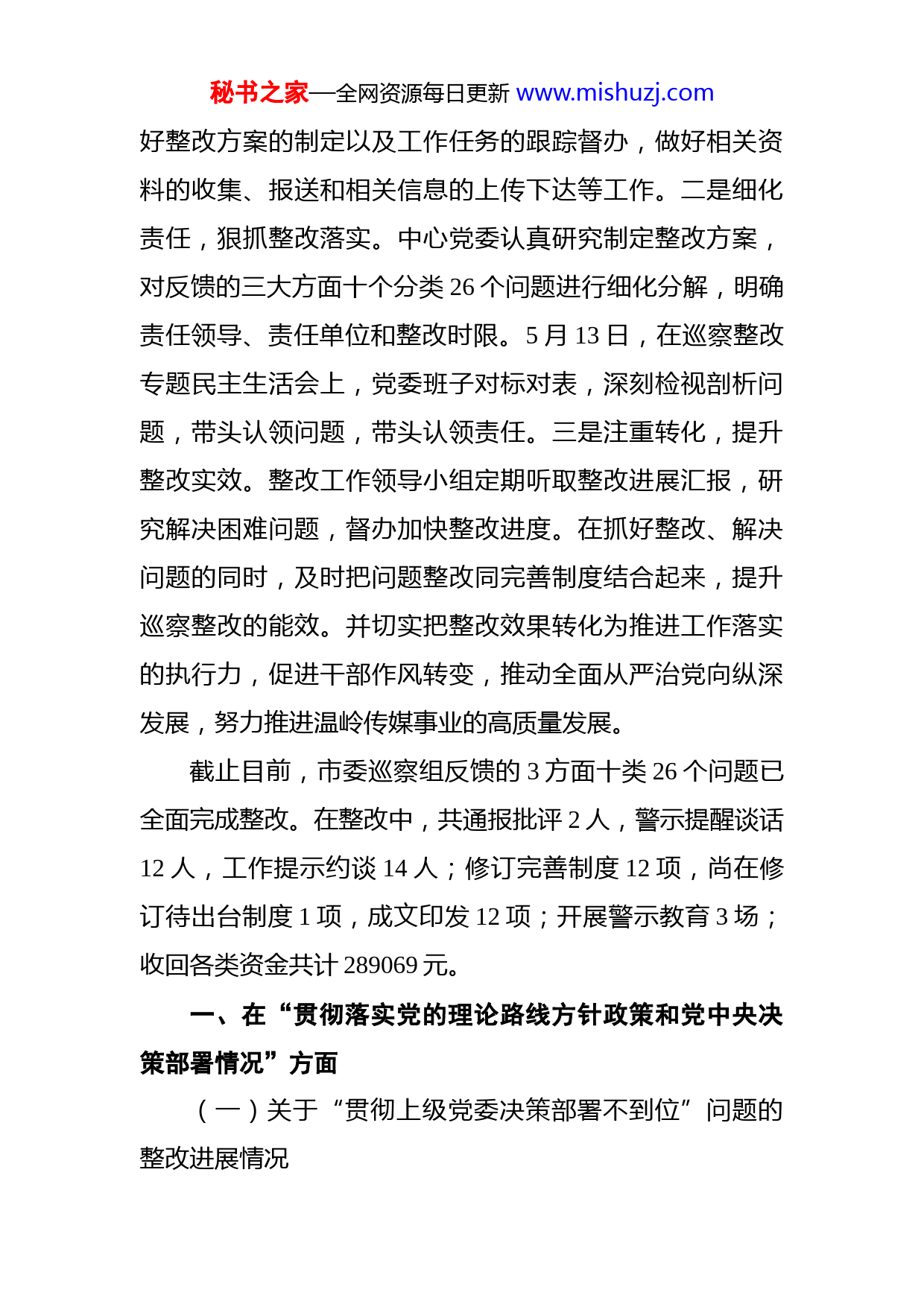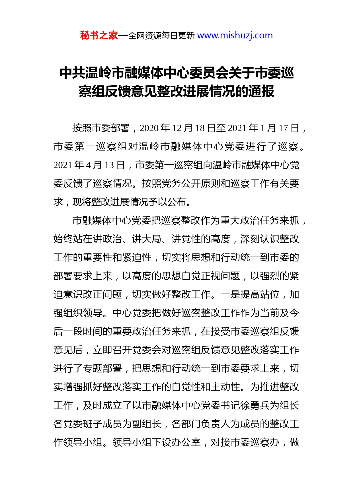 秘书之家—全网资源每日更新www.mishuzj.com中共温岭市融媒体中心委员会关于市委巡察组反馈意见整改进展情况的通报按照市委部署,2020年12月18日至2021年1月17日,市委第一巡察组对温岭市融媒体中心党委进行了巡察。2021年4月13日,市委第一巡察组向温岭市融媒体中心党委反馈了巡察情况。按照党务公开原则和巡察工作有关要求,现将整改进展情况予以公布。市融媒体中心党委把巡察整改作为重大政治任务来抓,始终站在讲政治、讲大局、讲党性的高度,深刻认识整改工作的重要性和紧迫性,切实将思想和行动统一到市委的部署要求上来,以高度的思想自觉正视问题,以强烈的紧迫意识改正问题,切实做好整改工作。一是提高站位,加强组织领导。中心党委把做好巡察整改工作作为当前及今后一段时间的重要政治任务来抓,在接受市委巡察组反馈意见后,立即召开党委会对巡察组反馈意见整改落实工作进行了专题部署,把思想和行动统一到市委要求上来,切实增强抓好整改落实工作的自觉性和主动性。为推进整改工作,及时成立了以市融媒体中心党委书记徐勇兵为组长各党委班子成员为副组长,各部门负责人为成员的整改工作领导小组。领导小组下设办公室,对接市委巡察办,做秘书之家—全网资源每日更新www.mishuzj.com好整改方案的制定以及工作任务的跟踪督办,做好相关资料的收集、报送和相关信息的上传下达等工作。二是细化责任,狠抓整改落实。中心党委认真研究制定整改方案,对反馈的三大方面十个分类26个问题进行细化分解,明确责任领导、责任单位和整改时限。5月13日,在巡察整改专题民主生活会上,党委班子对标对表,深刻检视剖析问题,带头认领问题,带头认领责任。三是注重转化,提升整改实效。整改工作领导小组定期听取整改进展汇报,研究解决困难问题,督办加快整改进度。在抓好整改、解决问题的同时,及时把问题整改同完善制度结合起来,提升巡察整改的能效。并切实把整改效果转化为推进工作落实的执行力,促进干部作风转变,推动全面从严治党向纵深发展,努力推进温岭传媒事业的高质量发展。截止目前,市委巡察组反馈的3方面十类26个问题已全面完成整改。在整改中,共通报批评2人,警示提醒谈话12人,工作提示约谈14人;修订完善制度12项,尚在修订待出台制度1项,成文印发12项;开展警示教育3场;收回各类资金共计289069元。一、在“贯彻落实党的理论路线方针政策和党中央决策部署情况”方面(一)关于“贯彻上级党委决策部署不到位”问题的整改进展情况秘书之家—全网资源每日更新www.mishuzj.com1、针对“落实广播电视广告专项整治工作不力,违法违规广告审核监管不够到位”问题的整改进展情况一是加强法规学习。由分管领导牵头,专题学习了《广告法》、《广告管理条例》,针对广告审查中常见问题进行了归纳分析,对当前全媒体发布的新形势新情况,着重做了分类要求,要求广告经营人员要坚决落实好习近平总书记关于广告宣传也要讲导向的重要论述精神,履行好主流媒体社会责任,发挥好主流媒体宣传优势,不断提高自身传播力、引导力、影响力及公信力。二是强化内部管理。加强对广告播出(刊登)管理、审查把关等制度建设。出台了广告审核办法,建立了广告三级审核制度。完善了播出(刊登)审核流程,充实了广告审核管理队伍。三是开展约谈。中心党委书记对分管领导进行了工作提示约谈,要求要把媒体的政治属性放在第一位,加强广告播出审查。分管领导分别与当前广告经营团队相关负责人进行工作提示约谈,就广告法规学习、广告播出(刊登)审核制度进行逐项学习提醒,要求在广告承接、播出(刊登)环节层层设防,杜绝违规现象再次发生。2、针对“落实统计数据防腐专项工作不力,上报数据失实”问题的整改进展情况一是认真查找问题原因。经查,2017年财务人员在数据统计时,因口径不一致,造成了职工薪酬上报统计报表秘书之家—全网资源每日更新www.mishuzj.com时指标数据出入。二是即时认真整改。通过改革,理顺人员关系,统一统计口径。三是开展警示强化统计纪律。以该案例为警示,组织财务人员认真学习统计制度和财务知识,加强财务人员的业务学习和作风要求,提高财务人员业务水平及统计工作质量。由分管领导对财务室主要负责人进行警示提醒约谈,强化责任意识和统计纪律。3、针对“媒体融合推进不够有力”问题的整改进展情况一是狠抓机构改革落实,激发队伍战斗力。媒体融合改革得到市委市政府的高度重视,今年8月,市委、市政府出台了《关于推进市融媒体中心(传媒集团)改革发展的方案》,解决了中心与集团一体化运作问题,10月,市里出台了《温岭市传媒集团组建方案》,搭建集团化的四梁八柱,完善了产业机构和功能。中心狠抓机遇,高效推进各项改革,做到建章立制和文化建设两手抓,不断激发内生动力。二是紧抓新闻改革突破,释放融合叠加效应。逐步建成“一心、两翼、多端”的新型融媒体矩阵,推出了一大批具有地方特色的融媒体作品,不断激发新媒体客户端的活力,强化主流舆论阵地作用。深化媒体融合的载体和中枢平台建设,全媒体指挥中心全面竣工,实现“一体策划、一次采集、多元生成、全媒传播”的流程再造。此外,主题宣传浓墨重彩,外宣工作成绩斐然,影响力不断秘书之家—全网资源