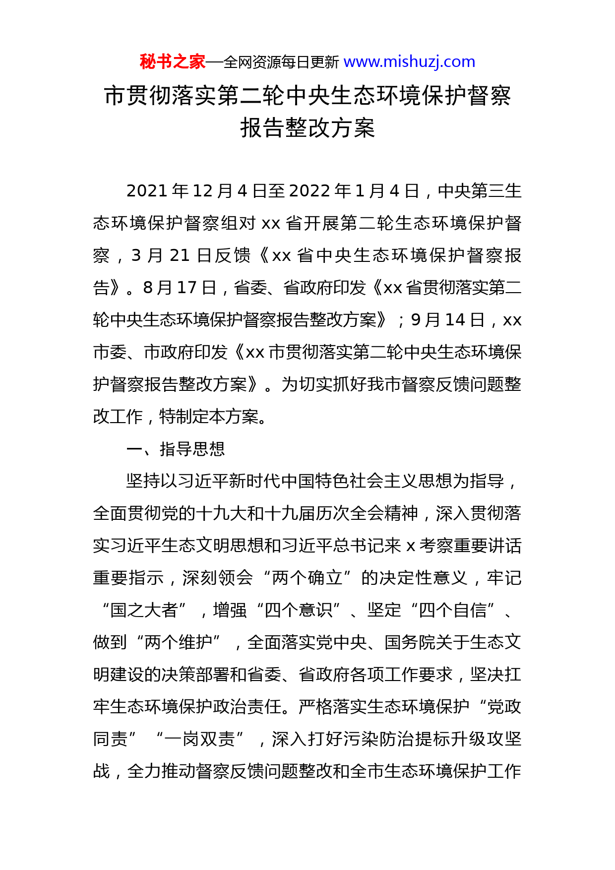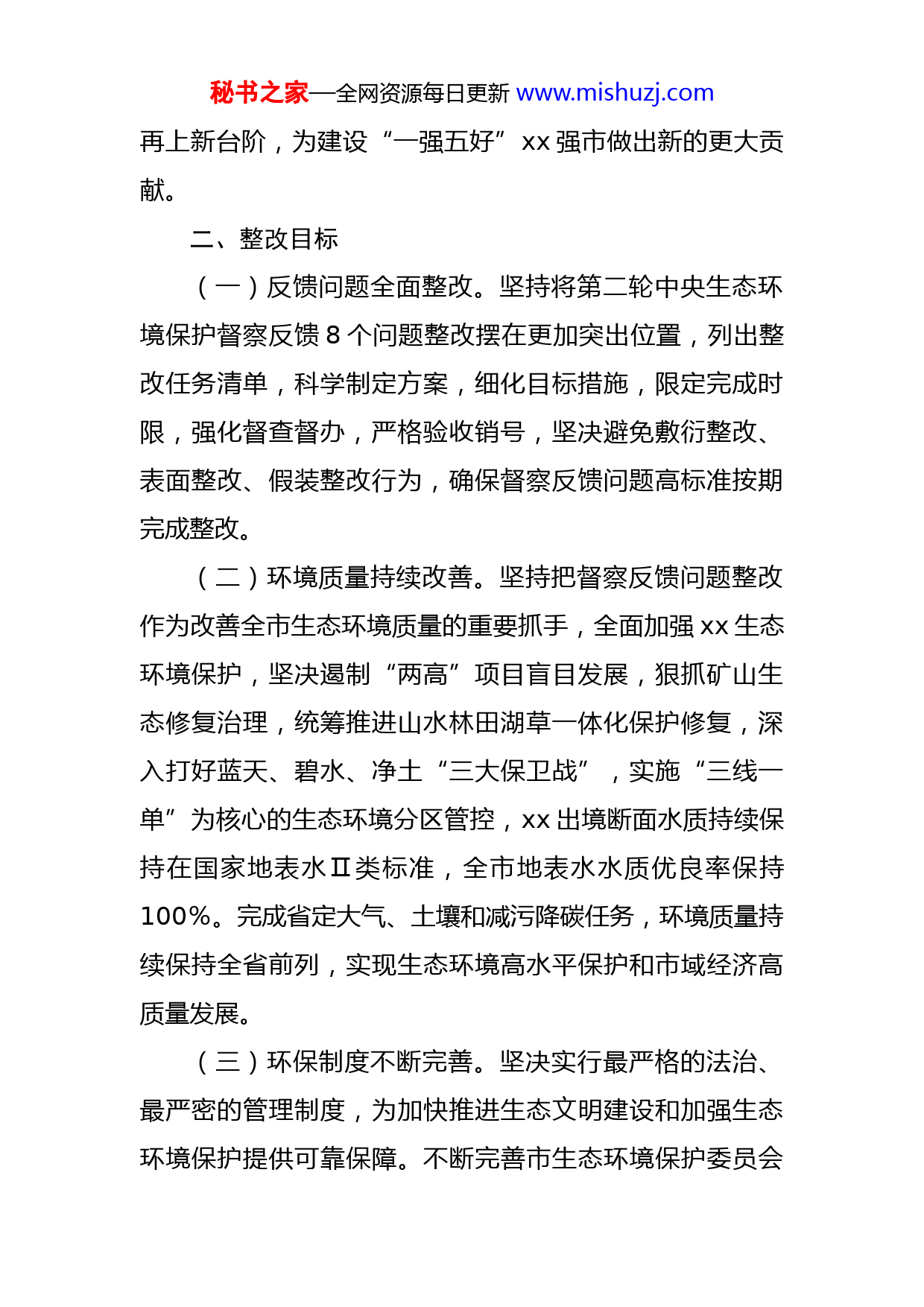 秘书之家—全网资源每日更新www.mishuzj.com市贯彻落实第二轮中央生态环境保护督察报告整改方案2021年12月4日至2022年1月4日,中央第三生态环境保护督察组对xx省开展第二轮生态环境保护督察,3月21日反馈《xx省中央生态环境保护督察报告》。8月17日,省委、省政府印发《xx省贯彻落实第二轮中央生态环境保护督察报告整改方案》;9月14日,xx市委、市政府印发《xx市贯彻落实第二轮中央生态环境保护督察报告整改方案》。为切实抓好我市督察反馈问题整改工作,特制定本方案。一、指导思想坚持以习近平新时代中国特色社会主义思想为指导,全面贯彻党的十九大和十九届历次全会精神,深入贯彻落实习近平生态文明思想和习近平总书记来x考察重要讲话重要指示,深刻领会“两个确立”的决定性意义,牢记“国之大者”,增强“四个意识”、坚定“四个自信”、做到“两个维护”,全面落实党中央、国务院关于生态文明建设的决策部署和省委、省政府各项工作要求,坚决扛牢生态环境保护政治责任。严格落实生态环境保护“党政同责”“一岗双责”,深入打好污染防治提标升级攻坚战,全力推动督察反馈问题整改和全市生态环境保护工作秘书之家—全网资源每日更新www.mishuzj.com再上新台阶,为建设“一强五好”xx强市做出新的更大贡献。二、整改目标(一)反馈问题全面整改。坚持将第二轮中央生态环境保护督察反馈8个问题整改摆在更加突出位置,列出整改任务清单,科学制定方案,细化目标措施,限定完成时限,强化督查督办,严格验收销号,坚决避免敷衍整改、表面整改、假装整改行为,确保督察反馈问题高标准按期完成整改。(二)环境质量持续改善。坚持把督察反馈问题整改作为改善全市生态环境质量的重要抓手,全面加强xx生态环境保护,坚决遏制“两高”项目盲目发展,狠抓矿山生态修复治理,统筹推进山水林田湖草一体化保护修复,深入打好蓝天、碧水、净土“三大保卫战”,实施“三线一单”为核心的生态环境分区管控,xx出境断面水质持续保持在国家地表水Ⅱ类标准,全市地表水水质优良率保持100%。完成省定大气、土壤和减污降碳任务,环境质量持续保持全省前列,实现生态环境高水平保护和市域经济高质量发展。(三)环保制度不断完善。坚决实行最严格的法治、最严密的管理制度,为加快推进生态文明建设和加强生态环境保护提供可靠保障。不断完善市生态环境保护委员会秘书之家—全网资源每日更新www.mishuzj.com职能,加大生态环境保护“三个体系”建设,严格执行考核评价机制,扎实履行生态环境保护责任清单,努力构建党委领导、政府主导、企业主体、社会组织和公众共同参与的生态环境治理体系。三、整改措施(一)切实提高政治站位,牢固树立绿色发展理念1.深入学习习近平生态文明思想。各镇各部门要把习近平生态文明思想、关于生态文明建设的新理念新战略和习近平总书记三次来x考察重要讲话重要指示纳入党史学习教育和党委(党组)理论学习中心组的重要内容,每年专题集中学习不少于4次;组织媒体全方位、宽领域、多角度的宣传报道,深入解读习近平生态文明思想;市委党校将其纳入教学大纲和学习培训计划,通过制度化学习宣讲、多轮次培训研讨,教育引导广大党员干部深刻理解习近平生态文明思想和党中央、国务院关于生态文明建设的重大战略部署,进一步强化领导干部绿色发展理念,增强做好生态环境保护工作、扎实推进生态文明建设的责任感和紧迫感。(市委办、市政府办牵头;各镇党委、政府,市委和市级国家机关各部门,xx高新区管委会配合)2.压实生态环境保护主体责任。各镇党委、政府和市级有关部门对本辖区、本部门生态环境保护工作和生态环境责任落实情况负总责,按照“三管三必须”要求,全面压秘书之家—全网资源每日更新www.mishuzj.com实生态环境保护“党政同责、一岗双责”。各镇各部门主要负责同志作为第一责任人,必须守土有责、守土尽责,部署重点工作、过问重大问题、协调重要环节、督办重大案件,每季度至少研究1次生态环境保护工作,听取工作汇报,研究解决突出问题,制定重要举措。要充分发挥市生态环境保护委员会作用,统筹协调全市生态环境保护工作重大问题。(市生态委办公室牵头;各镇党委、政府,市委和市级国家机关各部门,xx高新区管委会配合)3.强化生态环境保护考核问责。持续加大考核权重,强化指标约束,严格落实《xx省党政领导干部生态损害责任追究实施细则(试行)》,切实解决“重发展、轻环保”“不作为、慢作为、乱作为”等问题。落实好党政领导干部自然资源资产离任审计和生态环境损害责任终身追究制度。细化深化我市污染防治攻坚战成效考核实施细则,落实河(湖)长制考核,强化考核结果运用,作为领导班子和领导干部综合考核评价、奖惩任免、评先评优的重要依据。将生态环境保护督察问题整改作为落实“三项机制”的重要领域,激励广大干部在生态环境保护工作中敢作为、敢担当。对履职不力、监管不严、失职渎职,不作为、慢作为、乱作为的依法依纪追究有关人员的责任。〔市委组织部牵头;市纪委监委、市委督查室(市政府督查室)、市审计局、市自然资源局、市水利局、生态环境秘书之家—全网资源每日更新www.mishuzj.com局xx分局配合)〕4.加强生态环境保护联合执法