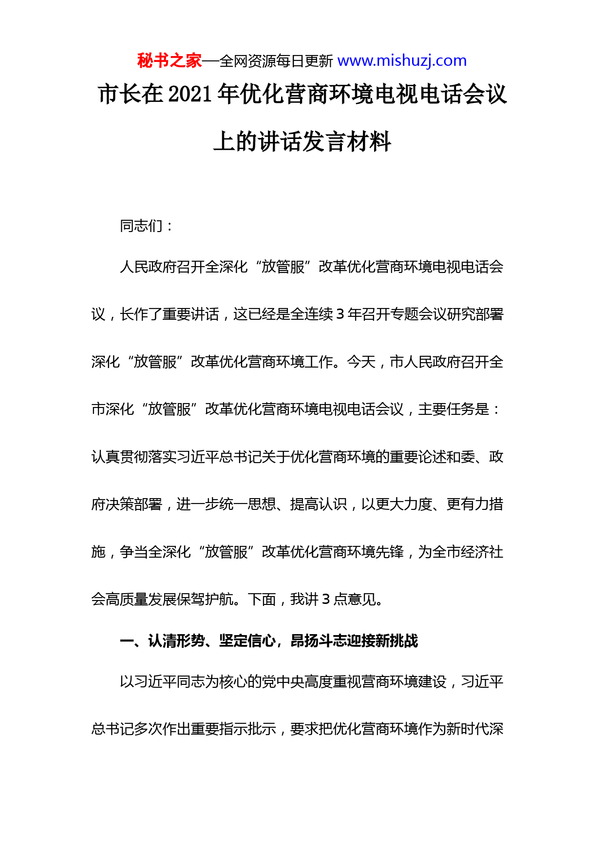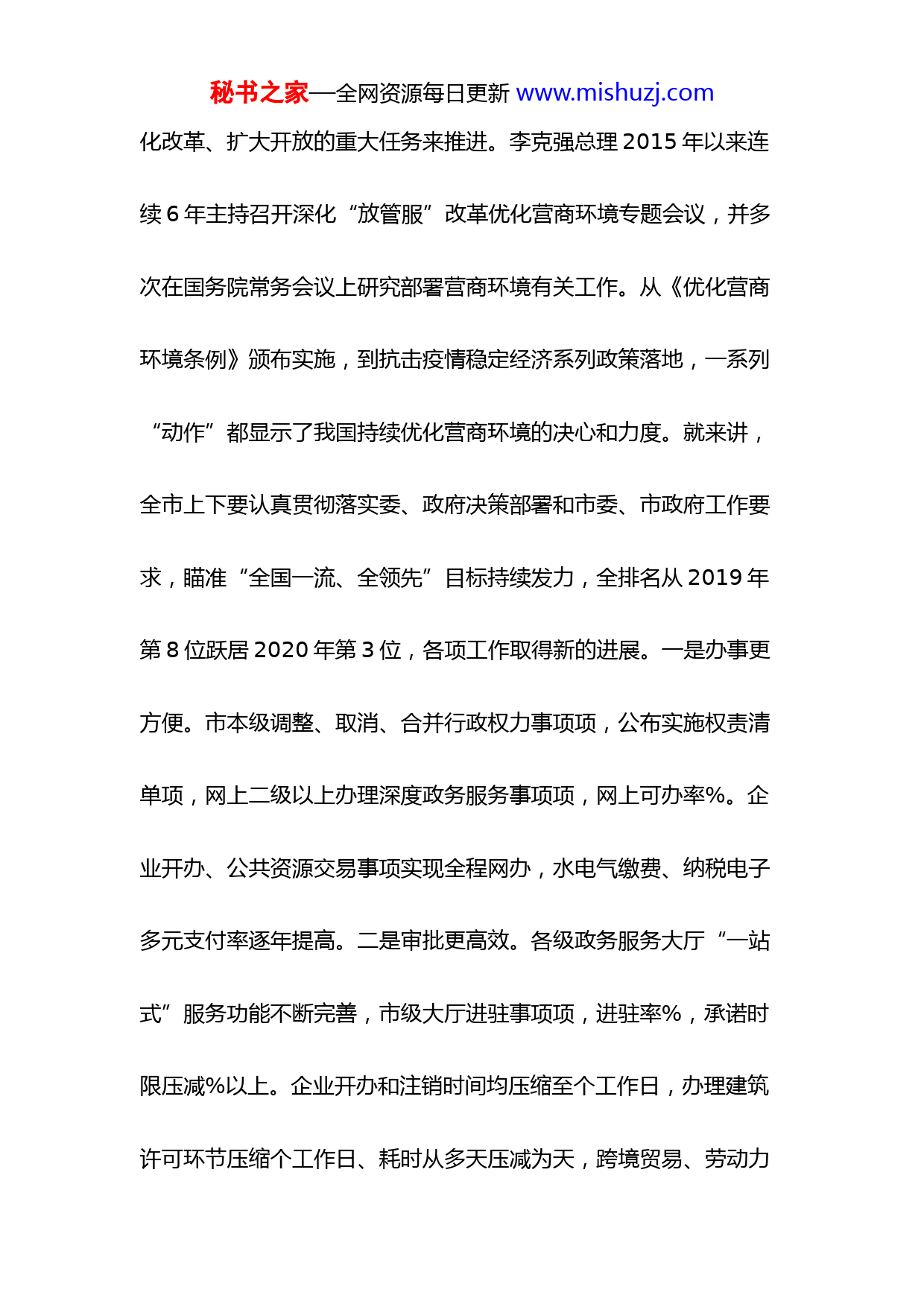 秘书之家—全网资源每日更新www.mishuzj.com市长在2021年优化营商环境电视电话会议上的讲话发言材料同志们:人民政府召开全深化“放管服”改革优化营商环境电视电话会议,长作了重要讲话,这已经是全连续3年召开专题会议研究部署深化“放管服”改革优化营商环境工作。今天,市人民政府召开全市深化“放管服”改革优化营商环境电视电话会议,主要任务是:认真贯彻落实习近平总书记关于优化营商环境的重要论述和委、政府决策部署,进一步统一思想、提高认识,以更大力度、更有力措施,争当全深化“放管服”改革优化营商环境先锋,为全市经济社会高质量发展保驾护航。下面,我讲3点意见。一、认清形势、坚定信心,昂扬斗志迎接新挑战以习近平同志为核心的党中央高度重视营商环境建设,习近平总书记多次作出重要指示批示,要求把优化营商环境作为新时代深秘书之家—全网资源每日更新www.mishuzj.com化改革、扩大开放的重大任务来推进。李克强总理2015年以来连续6年主持召开深化“放管服”改革优化营商环境专题会议,并多次在国务院常务会议上研究部署营商环境有关工作。从《优化营商环境条例》颁布实施,到抗击疫情稳定经济系列政策落地,一系列“动作”都显示了我国持续优化营商环境的决心和力度。就来讲,全市上下要认真贯彻落实委、政府决策部署和市委、市政府工作要求,瞄准“全国一流、全领先”目标持续发力,全排名从2019年第8位跃居2020年第3位,各项工作取得新的进展。一是办事更方便。市本级调整、取消、合并行政权力事项项,公布实施权责清单项,网上二级以上办理深度政务服务事项项,网上可办率%。企业开办、公共资源交易事项实现全程网办,水电气缴费、纳税电子多元支付率逐年提高。二是审批更高效。各级政务服务大厅“一站式”服务功能不断完善,市级大厅进驻事项项,进驻率%,承诺时限压减%以上。企业开办和注销时间均压缩至个工作日,办理建筑许可环节压缩个工作日、耗时从多天压减为天,跨境贸易、劳动力秘书之家—全网资源每日更新www.mishuzj.com市场监管、缴费纳税、政务服务、信用环境等指标全排名靠前。三是政策更优惠。有效实施减税降费、土地出让金分期缴纳、工业用地先租后让、疫情期间阶段性电价优惠等系列政策。这些成绩的取得,与各级各部门认真履职,属驻单位大力支持,以及社会各界共同参与密不可分,充分说明营商环境抓和不抓不一样,只要我们聚焦重点持续发力,就一定能够取得积极成效。在肯定成绩的同时,我们更要清醒看到,我市营商环境与全第1位的相比还有明显不足,还达不到“营商环境全争前列”的要求,还存在不少差距,集中在以下4个方面:一是在落实“一把手”责任上有差距。有的单位仍存在本位主义思想,没有把深化“放管服”改革优化营商环境工作放到全市大局中谋划推动,还存在各自为政、强调自身利益的情况。如:有的牵头单位心存顾虑,不敢理直气壮“一牵到底”;有的配合单位带有“反正不是我们牵头”的敷衍思想,有事不配合,没事不联系。有的事项涉及部门多,信息融合共享和事项协同办理不够,企业和秘书之家—全网资源每日更新www.mishuzj.com群众仍需重复提供材料、反复到各有关部门沟通咨询。有的县(市、区)对营商环境是“一把手工程”的认识还不到位,口头重视多,带头研究少,责任压力向下传导不到位,导致有的县级部门对营商环境不够重视,工作推进不理想,在第三方评价中出现答非所问、无法佐证,甚至规定时间内未完成填答的情况。2020年营商环境评估情况来看,各县(市、区)整体得分偏低,单项指标表现差距更是明显。二是在推动改革发展上有差距。优质的营商环境和经济社会快速发展是辩证统一、相辅相成的关系。一个地方营商环境好了,市场主体自然就来了;否则,无论你讲得天花乱坠,承诺再多优惠条件,市场主体就是不来,投资上不去,营商环境就不好。以为例,、、、等重量级项目为什么要落户上海?因为用实际行动获得了家跨国公司地区总部、家外资研发中心、万户市场主体的认可。“抓营商环境就是为了促进发展”这个导向一定要树牢,否则优化秘书之家—全网资源每日更新www.mishuzj.com营商环境就成了自娱自乐,没有任何意义。从当前全市经济运行情况看,形势异常严峻。三是在提高企业、群众满意率上有差距。政务服务大厅标准化建设滞后,多部门、多事项的并联审批机制还没有真正建立,有的重点事项需要“来回跑、多头跑”等问题未得到根本解决。一些部门主动对接服务企业不多,少数工作人员业务能力跟不上、服务不在状态,导致企业和群众办事满意度不高。“一部手机办事通”、网上缴费小程序、便民服务APP等宣传推广不到位,惠企政策告知不及时,导致企业和群众知晓率、使用率都不高。有些政策要么申请繁琐、要么门槛过高,能享受到的企业不多,融资难、融资贵仍然是企业反映突出的“老大难”问题。一些如涉众金融、民办代课教师、拖欠农民工工资、水库移民、土地租赁等历史遗留问题还没彻底解决,发展中的新问题不断出现,新老问题相互交织。四是在担当创新上有差距。集中表现在,有的干部缺乏“抓铁有痕”的精神,工作中主动研究少,自我加压不足,工作措施缺乏秘书之家—全网资源每日更新www.mishuzj.com针对性