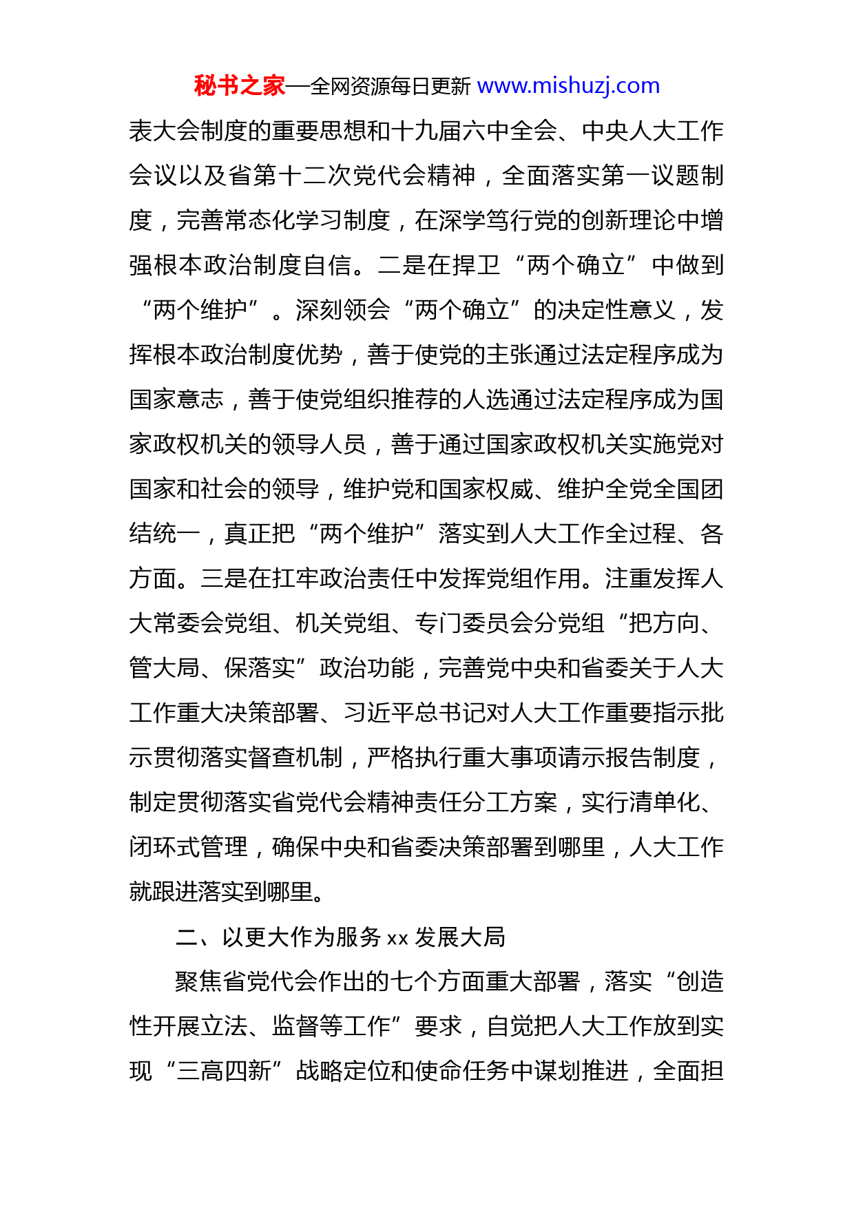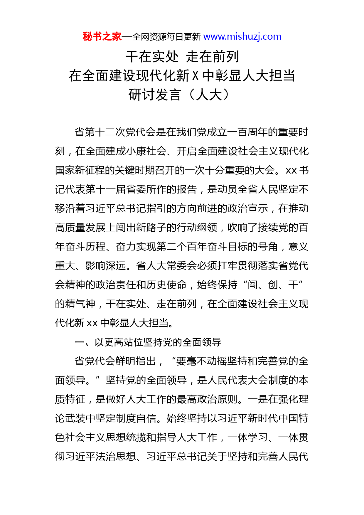 秘书之家—全网资源每日更新www.mishuzj.com干在实处走在前列在全面建设现代化新X中彰显人大担当研讨发言(人大)省第十二次党代会是在我们党成立一百周年的重要时刻,在全面建成小康社会、开启全面建设社会主义现代化国家新征程的关键时期召开的一次十分重要的大会。xx书记代表第十一届省委所作的报告,是动员全省人民坚定不移沿着习近平总书记指引的方向前进的政治宣示,在推动高质量发展上闯出新路子的行动纲领,吹响了接续党的百年奋斗历程、奋力实现第二个百年奋斗目标的号角,意义重大、影响深远。省人大常委会必须扛牢贯彻落实省党代会精神的政治责任和历史使命,始终保持“闯、创、干”的精气神,干在实处、走在前列,在全面建设社会主义现代化新xx中彰显人大担当。一、以更高站位坚持党的全面领导省党代会鲜明指出,“要毫不动摇坚持和完善党的全面领导。”坚持党的全面领导,是人民代表大会制度的本质特征,是做好人大工作的最高政治原则。一是在强化理论武装中坚定制度自信。始终坚持以习近平新时代中国特色社会主义思想统揽和指导人大工作,一体学习、一体贯彻习近平法治思想、习近平总书记关于坚持和完善人民代秘书之家—全网资源每日更新www.mishuzj.com表大会制度的重要思想和十九届六中全会、中央人大工作会议以及省第十二次党代会精神,全面落实第一议题制度,完善常态化学习制度,在深学笃行党的创新理论中增强根本政治制度自信。二是在捍卫“两个确立”中做到“两个维护”。深刻领会“两个确立”的决定性意义,发挥根本政治制度优势,善于使党的主张通过法定程序成为国家意志,善于使党组织推荐的人选通过法定程序成为国家政权机关的领导人员,善于通过国家政权机关实施党对国家和社会的领导,维护党和国家权威、维护全党全国团结统一,真正把“两个维护”落实到人大工作全过程、各方面。三是在扛牢政治责任中发挥党组作用。注重发挥人大常委会党组、机关党组、专门委员会分党组“把方向、管大局、保落实”政治功能,完善党中央和省委关于人大工作重大决策部署、习近平总书记对人大工作重要指示批示贯彻落实督查机制,严格执行重大事项请示报告制度,制定贯彻落实省党代会精神责任分工方案,实行清单化、闭环式管理,确保中央和省委决策部署到哪里,人大工作就跟进落实到哪里。二、以更大作为服务xx发展大局聚焦省党代会作出的七个方面重大部署,落实“创造性开展立法、监督等工作”要求,自觉把人大工作放到实现“三高四新”战略定位和使命任务中谋划推进,全面担秘书之家—全网资源每日更新www.mishuzj.com负起宪法法律赋予的各项职责。一是立足发展需求提升立法质效。抓住提高立法质量这一关键,坚持科学立法、民主立法、依法立法,完善党委领导、人大主导、政府依托、各方参与的立法工作格局。紧扣“为谁立法”“立什么法”“如何立良法”的立法三问,紧盯现代化新xx建设对法治建设提出的新要求,认真落实“十四五”重点立法项目,加强科技创新、公共卫生等重要领域和数字经济、互联网金融等新兴领域立法,推进专项领域“小切口”立法,加快制定一批与依法治省进程相匹配、与改革发展稳定相适应、与人民群众期盼相呼应的地方性法规。二是锚定工作目标强化监督刚性。聚焦党中央和省委重大决策部署,聚焦人民群众所思所盼所愿,统筹运用法定监督方式,实施正确监督、有效监督、依法监督,用好宪法法律赋予人大的监督权;扛牢党中央交给地方人大的重大任务,加强对国有资产管理、财政预算、政府债务的审查监督,织牢织密法律制度“笼子”,为完善经济治理体系提供坚实法治支撑。三是围绕凝心聚力行使重大事项决定权。坚持谋大事、议大事、抓大事,围绕乡村振兴战略实施、区域协调发展战略、平安xx法治xx建设、生态环境保护、促进共同富裕等重大问题,依法作出决议决定,及时把省委关于经济社会发展战略决策转变为地方国家权力机关的意志,转化为全省人民的共同行动。秘书之家—全网资源每日更新www.mishuzj.com三、以更深情怀践行人民至上理念坚决落实省党代会“牢记‘江山就是人民、人民就是江山’的真理,坚持人民主体地位”的要求,不忘初心、牢记使命,用制度体系保障人民当家作主。一是扎实推进“全过程人民民主”的xx实践。在党的领导下不断扩大人民有序政治参与,健全法规草案公开征求意见、立法听证、立法协商、立法后评估机制,发挥基层立法联系点“直通车”功能,完善监督选项、监督过程、监督结果公开机制,确保在决策、执行、监督落实各环节都能听到来自人民的声音、都有人民的参与。二是深入践行“人大代表要更加密切联系群众”的殷殷嘱托。落实好《关于推动全省各级人大代表更加密切联系群众的实施意见》,拓展和深化领导干部代表参加代表小组活动、代表议案建议办理、基层民生实事人大代表票决制工作成效,推动各级人大代表履职更好接地气、察民情、聚民智、惠民生。三是持续助力书写解决群众“急难愁盼”问题的xx答卷。始终把助力解决人民群众“急难愁盼”问题作为出发点、落脚点,紧盯提升就业质量和人民收入水平、办好人民满意教育、健康xx建设、完善社会保障体系、人口长期均