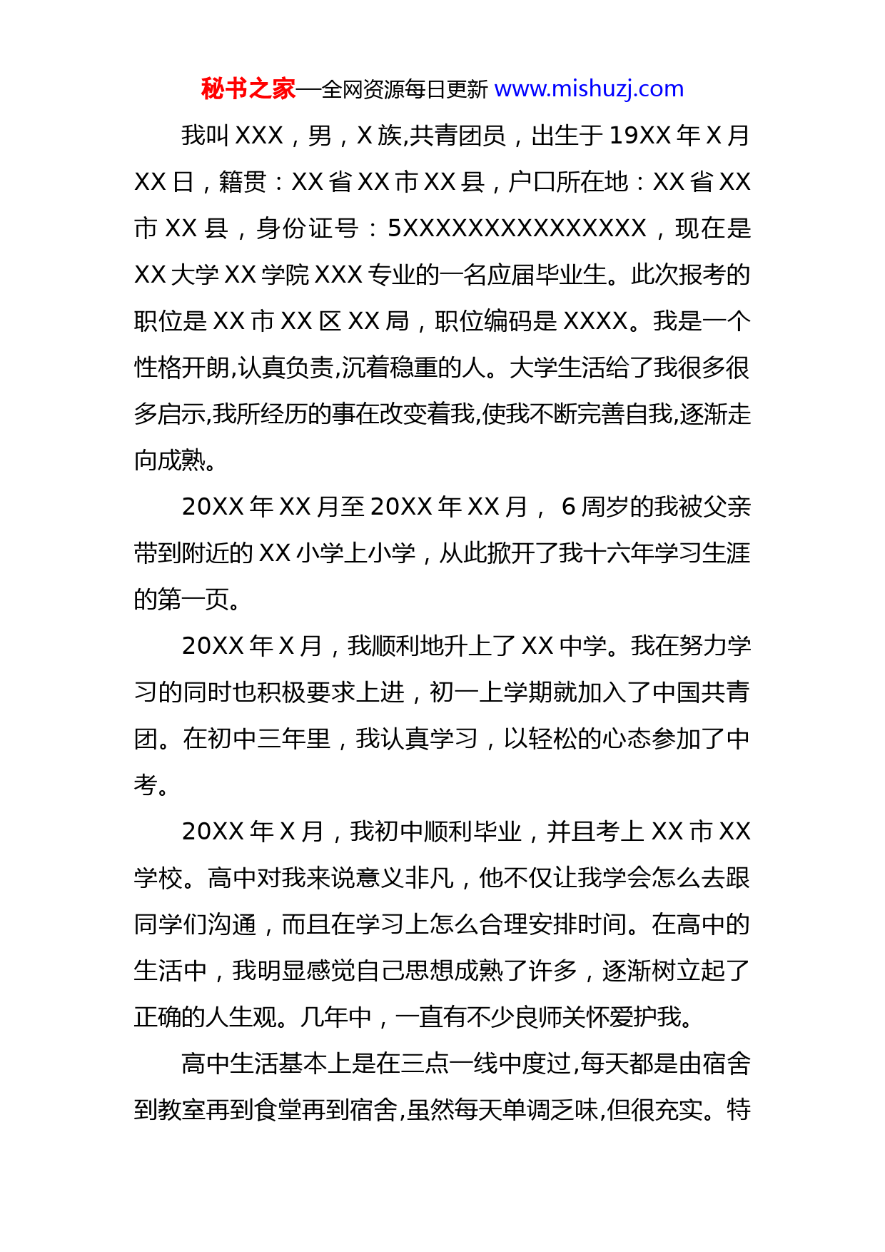 秘书之家—全网资源每日更新www.mishuzj.com我叫XXX,男,X族,共青团员,出生于19XX年X月XX日,籍贯:XX省XX市XX县,户口所在地:XX省XX市XX县,身份证号:5XXXXXXXXXXXXXXX,现在是XX大学XX学院XXX专业的一名应届毕业生。此次报考的职位是XX市XX区XX局,职位编码是XXXX。我是一个性格开朗,认真负责,沉着稳重的人。大学生活给了我很多很多启示,我所经历的事在改变着我,使我不断完善自我,逐渐走向成熟。20XX年XX月至20XX年XX月,6周岁的我被父亲带到附近的XX小学上小学,从此掀开了我十六年学习生涯的第一页。20XX年X月,我顺利地升上了XX中学。我在努力学习的同时也积极要求上进,初一上学期就加入了中国共青团。在初中三年里,我认真学习,以轻松的心态参加了中考。20XX年X月,我初中顺利毕业,并且考上XX市XX学校。高中对我来说意义非凡,他不仅让我学会怎么去跟同学们沟通,而且在学习上怎么合理安排时间。在高中的生活中,我明显感觉自己思想成熟了许多,逐渐树立起了正确的人生观。几年中,一直有不少良师关怀爱护我。高中生活基本上是在三点一线中度过,每天都是由宿舍到教室再到食堂再到宿舍,虽然每天单调乏味,但很充实。特秘书之家—全网资源每日更新www.mishuzj.com别是高三那年,每天都是天不亮就起床,夜深人静了还在挑灯夜战。高中的三年时间里,我没有虚度过任何一节课,一直在努力着,奋斗着,拼搏着!逝者如斯夫,不舍昼夜!三年高中生活弹指一挥间,在历经了六月最难熬的两天后,我坦然了,淡定了。回到家里,等待成绩。20XX年高考,我考了XX分,成绩还算差强人意,考上了XXXX大学XX学专业在学校期间,我虚心求学、刻苦认真、吃苦耐劳,及时总结;注重理论联系实际,培养自己的自学能力以及分析、解决问题的能力。在丰富多彩的大学生活中,为了扩大知识面和培养自己的业余爱好;积极参加校内外的实践活动,重视团队合作精神,有高度的责任心和良好的人际关系。在思想品德上,本人有良好道德修养,并有坚定的政治方向.我热爱祖国,热爱人民,坚决拥护共产党领导和社会主义范文大全制度,遵纪守法,爱护公共财产,团结同学,乐于助人.并以务实求真的精神热心参与学校的公益宣传和爱国主义活动。