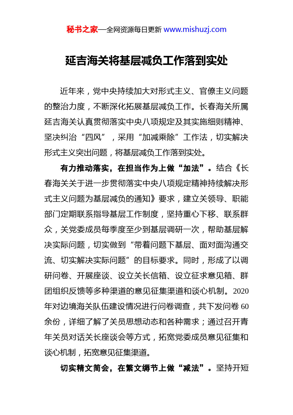 秘书之家—全网资源每日更新www.mishuzj.com延吉海关将基层减负工作落到实处近年来,党中央持续加大对形式主义、官僚主义问题的整治力度,不断深化拓展基层减负工作。长春海关所属延吉海关认真贯彻落实中央八项规定及其实施细则精神、坚决纠治“四风”,采用“加减乘除”工作法,切实解决形式主义突出问题,将基层减负工作落到实处。有力推动落实,在担当作为上做“加法”。结合《长春海关关于进一步贯彻落实中央八项规定精神持续解决形式主义问题为基层减负的通知》要求,建立关领导、职能部门定期联系指导基层工作制度,坚持重心下移、联系群众,关党委成员每季度至少到基层调研一次,帮助基层解决实际问题,切实做到“带着问题下基层、面对面沟通交流、切实解决实际问题”的目标要求。同时,形成了以调研问卷、开展座谈、设立关长信箱、设立征求意见箱、群团组织反馈等多种渠道的意见征集渠道和谈心机制。2020年对边境海关队伍建设情况进行问卷调查,共下发问卷60余份,详细了解了关员思想动态和各种需求;通过召开青年关员对话关长座谈会等方式,拓宽党委成员意见征集和谈心机制,拓宽意见征集渠道。切实精文简会,在繁文缛节上做“减法”。坚持开短秘书之家—全网资源每日更新www.mishuzj.com会、讲短话,力戒空话、套话。在全关会议中严格限定会议发言时间。同时在安排讨论的会议精心设置议题,充分安排讨论时间,提高讨论深度;严格控制全关性会议,能不开的不开,可以合并的合并,主题不明确、不解决实际问题的会议不开。2020年延吉海关关务会由2周1次精简至3周1次;精简文件简报,没有实质内容、可发可不发的文件一律不发,能合并发的要合并发。会议已明确部署的工作任务,一般不再发文。严格控制文件发送范围,减少发文份数。全关性会议减少30%,大型会议领导讲话字数控制在3000字以内,中小型会议控制在2000字以内。文件简报注重质量,突出思想性、针对性和可操作性,做到言之有物、言简意赅。简报重点反映重要动态、典型经验、突出问题和意见建议,做到及时、准确、快捷、高效。探索创新模式,在提高质效上做“乘法”。充分运用电视电话、网络视频等现代信息技术手段改进会议召开形式,提高会议效率,并且电视电话、网络视频会议的主会场和分会场要控制规模。为节约会议成本,延吉海关积极探索,解决技术难题,开通了科级海关网络视频会议系统充分运用视频会议形式,使科级海关在驻地就能同步参加总署、总关召开的视频会议,有效减少外派机构参会往返车辆损耗及油料耗用,节约了大量人力和时间成本。注重实际效果,在督察检查上做“除法”。通过“不秘书之家—全网资源每日更新www.mishuzj.com打招呼、不发通知、直奔现场”的形式,到基层中听意见看效果;聚焦基层干部关心关注的热点难点问题,抓住“关键少数”,突出重点领域,有的放矢开展督察检查,切实将基层减负工作落到实处。