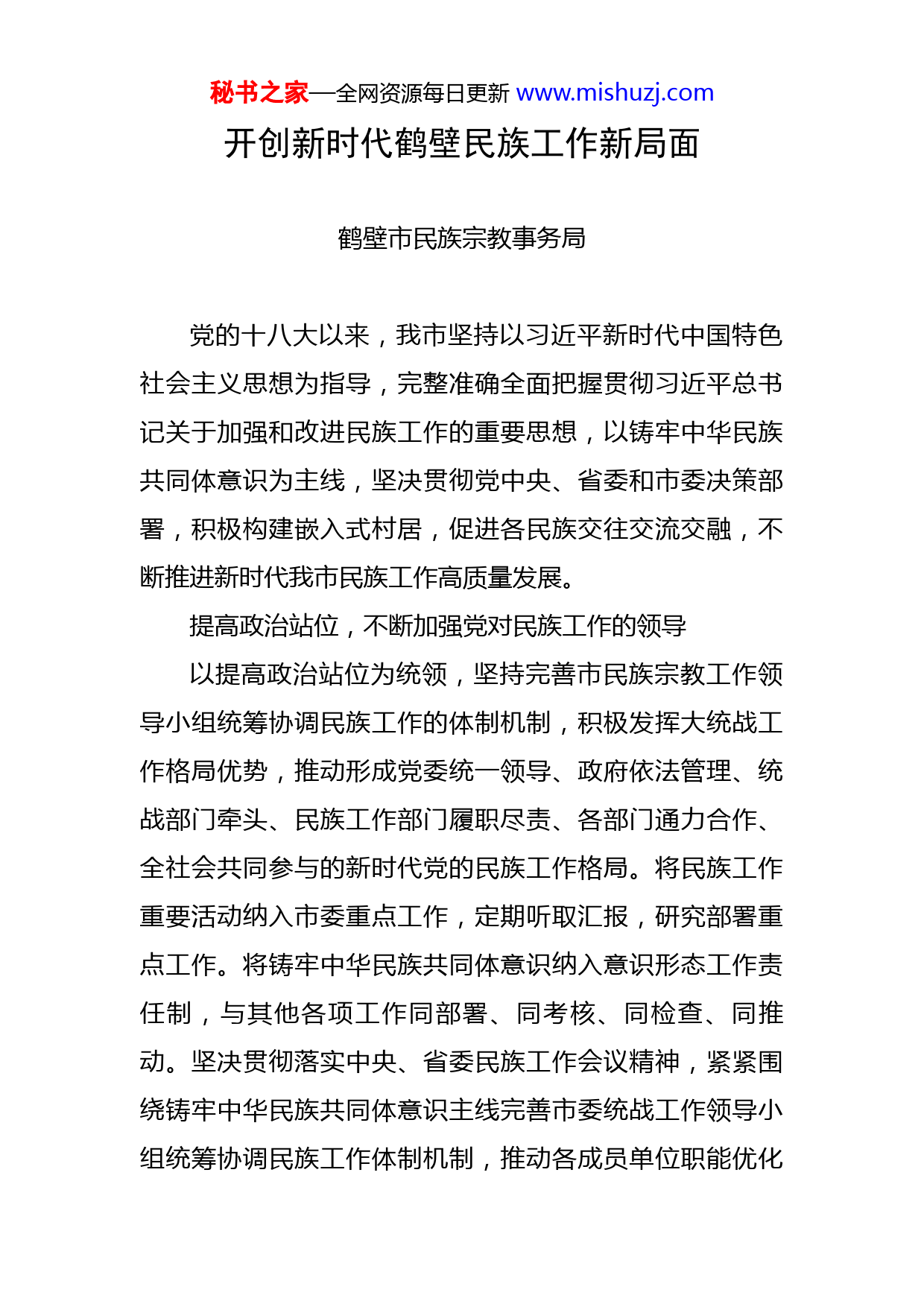 秘书之家—全网资源每日更新www.mishuzj.com开创新时代鹤壁民族工作新局面鹤壁市民族宗教事务局党的十八大以来,我市坚持以习近平新时代中国特色社会主义思想为指导,完整准确全面把握贯彻习近平总书记关于加强和改进民族工作的重要思想,以铸牢中华民族共同体意识为主线,坚决贯彻党中央、省委和市委决策部署,积极构建嵌入式村居,促进各民族交往交流交融,不断推进新时代我市民族工作高质量发展。提高政治站位,不断加强党对民族工作的领导以提高政治站位为统领,坚持完善市民族宗教工作领导小组统筹协调民族工作的体制机制,积极发挥大统战工作格局优势,推动形成党委统一领导、政府依法管理、统战部门牵头、民族工作部门履职尽责、各部门通力合作、全社会共同参与的新时代党的民族工作格局。将民族工作重要活动纳入市委重点工作,定期听取汇报,研究部署重点工作。将铸牢中华民族共同体意识纳入意识形态工作责任制,与其他各项工作同部署、同考核、同检查、同推动。坚决贯彻落实中央、省委民族工作会议精神,紧紧围绕铸牢中华民族共同体意识主线完善市委统战工作领导小组统筹协调民族工作体制机制,推动各成员单位职能优化秘书之家—全网资源每日更新www.mishuzj.com和职责调整,保障机构机制、人员配置和工作条件。指导各县区民族部门完善工作机制,确保基层民族工作有人管、懂政策、善服务。健全完善便民服务机制,提高政务服务水平,树牢人民至上理念。笃行务实重干,全面推进中华民族共有精神家园建设以铸牢中华民族共同体意识为“纲”,全面推进新时代公民道德建设,深入培育和践行社会主义核心价值观,充分发挥民族团结进步示范区示范单位、教育基地教育示范功能,大力弘扬愚公移山精神、红旗渠精神、雷锋精神,教育引导各族群众不断增强“五个认同”,不断铸牢中华民族共同体意识。聚焦学校、社区(村)、民品民贸定点生产企业等重点,以开设专栏、印发宣传资料、集中宣讲等多形式、多层次,深入开展“中华民族一家亲、同心共筑中国梦”等宣传教育活动。近年来,编印《习近平总书记关于民族工作重要论述》3000册、《民族政策法规知识读本》2000册,设置宣传栏40余处,悬挂宣传标语500余条,发放民族团结进步宣传页1万余份。着力增强中华文化认同,推动各民族优秀文化传承保护和创新交融,中原农耕文化、帝辛传说、箕子传说列入我市非物质文化遗产名录,讲好鹤壁故事,促进各族群众对中华文化认同。选树先进典型,促进各民族广泛交往交流交融秘书之家—全网资源每日更新www.mishuzj.com全面深入持久开展民族团结进步创建工作。坚持因地制宜,推动创建工作深入开展,做到少数民族聚居村与周边村(社区)并重,农村与城市社区并重,机关单位与各行各业并重。突出特色,分类实施,注重结合,持续深化创建进机关、进企业、进社区、进乡镇、进学校、进连队、进宗教场所。先后印发了《关于全面深入持久开展民族团结进步创建工作,铸牢中华民族共同体意识的实施方案》《关于进一步做好新形势下民族团结进步创建工作的实施方案》,为创建工作指明了方向、提出了要求、明确了目标。目前,我市有省级民族团结进步教育基地1个,省级民族团结进步示范区示范单位2个,省级民族团结进步宗教活动场所1个,省级民族传统体育项目示范基地1个。国家民族团结进步模范个人2人,省级民族团结进步模范个人1人。做好少数民族流动人口服务管理工作。发挥城市在铸牢中华民族共同体意识和促进各民族交往交流中的重要作用,贯彻落实各族群众融入城市的政策法规,健全完善制度保障。近年来,帮助解决来鹤各族群众社会保障、就学就医、务工经商等实际困难10余件,有力维护了各族群众的合法权益,使之在鹤安心、生活愉悦,主动担起建设高质量富美鹤城的责任。坚持守正创新,坚决防范民族领域风险隐患建立健全由各级统战部门牵头、相关部门参与的协调处置机制,依法妥善处置涉民族因素矛盾秘书之家—全网资源每日更新www.mishuzj.com纠纷。利用多种形式开展民族政策和法律、法规的宣传教育,使各族群众自觉做到不利于民族团结的话不说,不利于民族团结的事不做,提高了守法遵法、依法办事的自觉性。不断提高防范化解风险隐患能力,提升科学化、规范化、精细化水平,加强矛盾纠纷排查调处和安全隐患排查整治,增强工作主动性、联动性、实效性。加强调研指导,落实落细各级民族工作部门维稳工作责任,守好意识形态阵地,妥善应对涉民族因素舆论,坚持疏堵结合,积极发声。充分发挥网络新媒体新技术新业态传播民族团结进步正能量,有效维护我市民族领域安全稳定。