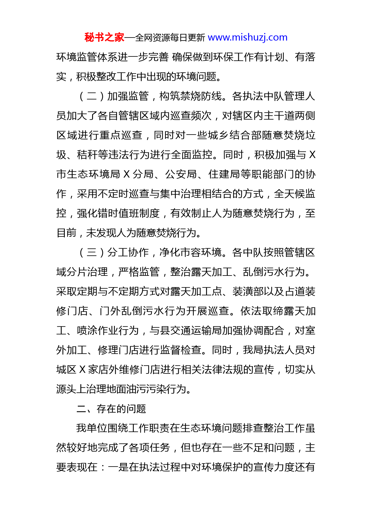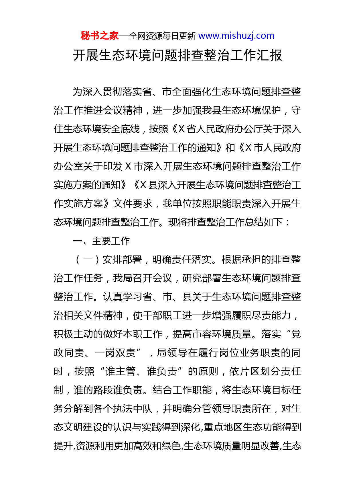 秘书之家—全网资源每日更新www.mishuzj.com开展生态环境问题排查整治工作汇报为深入贯彻落实省、市全面强化生态环境问题排查整治工作推进会议精神,进一步加强我县生态环境保护,守住生态环境安全底线,按照《X省人民政府办公厅关于深入开展生态环境问题排查整治工作的通知》和《X市人民政府办公室关于印发X市深入开展生态环境问题排查整治工作实施方案的通知》《X县深入开展生态环境问题排查整治工作实施方案》文件要求,我单位按照职能职责深入开展生态环境问题排查整治工作。现将排查整治工作总结如下:一、主要工作(一)安排部署,明确责任落实。根据承担的排查整治工作任务,我局召开会议,研究部署生态环境问题排查整治工作。认真学习省、市、县关于生态环境问题排查整治相关文件精神,使干部职工进一步增强履职尽责能力,积极主动的做好本职工作,提高市容环境质量。落实“党政同责、一岗双责”,局领导在履行岗位业务职责的同时,按照“谁主管、谁负责”的原则,依片区划分责任制,谁的路段谁负责。结合工作职能,将生态环境目标任务分解到各个执法中队,并明确分管领导职责所在,对生态文明建设的认识与实践得到深化,重点地区生态功能得到提升,资源利用更加高效和绿色,生态环境质量明显改善,生态秘书之家—全网资源每日更新www.mishuzj.com环境监管体系进一步完善确保做到环保工作有计划、有落实,积极整改工作中出现的环境问题。(二)加强监管,构筑禁烧防线。各执法中队管理人员加大了各自管辖区域内巡查频次,对辖区内主干道两侧区域进行重点巡查,同时对一些城乡结合部随意焚烧垃圾、秸秆等违法行为进行全面监控。同时,积极加强与X市生态环境局X分局、公安局、住建局等职能部门的协作,采用不定时巡查与集中治理相结合的方式,全天候监控,强化错时值班制度,有效制止人为随意焚烧行为,至目前,未发现人为随意焚烧行为。(三)分工协作,净化市容环境。各中队按照管辖区域分片治理,严格监管,整治露天加工、乱倒污水行为。采取定期与不定期方式对露天加工点、装潢部以及占道装修门店、门外乱倒污水行为开展巡查。依法取缔露天加工、喷涂作业行为,与县交通运输局加强协调配合,对室外加工、修理门店进行监督检查。同时,我局执法人员对城区X家店外维修门店进行相关法律法规的宣传,切实从源头上治理地面油污污染行为。二、存在的问题我单位围绕工作职责在生态环境问题排查整治工作虽然较好地完成了各项任务,但也存在一些不足和问题,主要表现在:一是在执法过程中对环境保护的宣传力度还有秘书之家—全网资源每日更新www.mishuzj.com欠缺;二是管理存在盲区,个别区域监管次数少,弹性较大,常态化监管机制不到位,精细化管理还不够到位;三是市民素质参差不齐,乱倒污水、随意焚烧等现象依旧存在,个别经营者环境保护意识欠缺。三、下一步打算一是健全机制,持续开展。针对工作中存在的问题和薄弱环节,采取切实可行有效的措施,充分利用“X城管”公众号、“随手拍”功能、手机App、电子显示屏、新闻媒介等各种宣传媒体,加大生态环境保护宣传力度,健全长效管理机制,细化措施,狠抓落实;加强与生态环境、住建、市场监管等管理部门的协作,形成整治工作合力,确保圆满完成生态环境问题排查整治工作任务。二是强化交流,及时反馈。在执法过程中,各片区执法中队要加强内部交流,及时总结有效经验做法,及时推广应用,对难点重点问题,及时与上级领导沟通协调,将问题整改到位,确保生态环境排查整治工作有序推进。做好录像、录音、拍照、资料收集工作,及时上报。三是依法行政,严格执法。进一步加大执法和处罚力度,加强对辖区内的巡查监管,严格落实错时值班制度,对重点的地段、区域重点管控。对发现的违法行为及时查处、及时制止,并做好相关法律法规的宣传,为市民营造一个干净整洁、优美舒适的生活和工作环境。