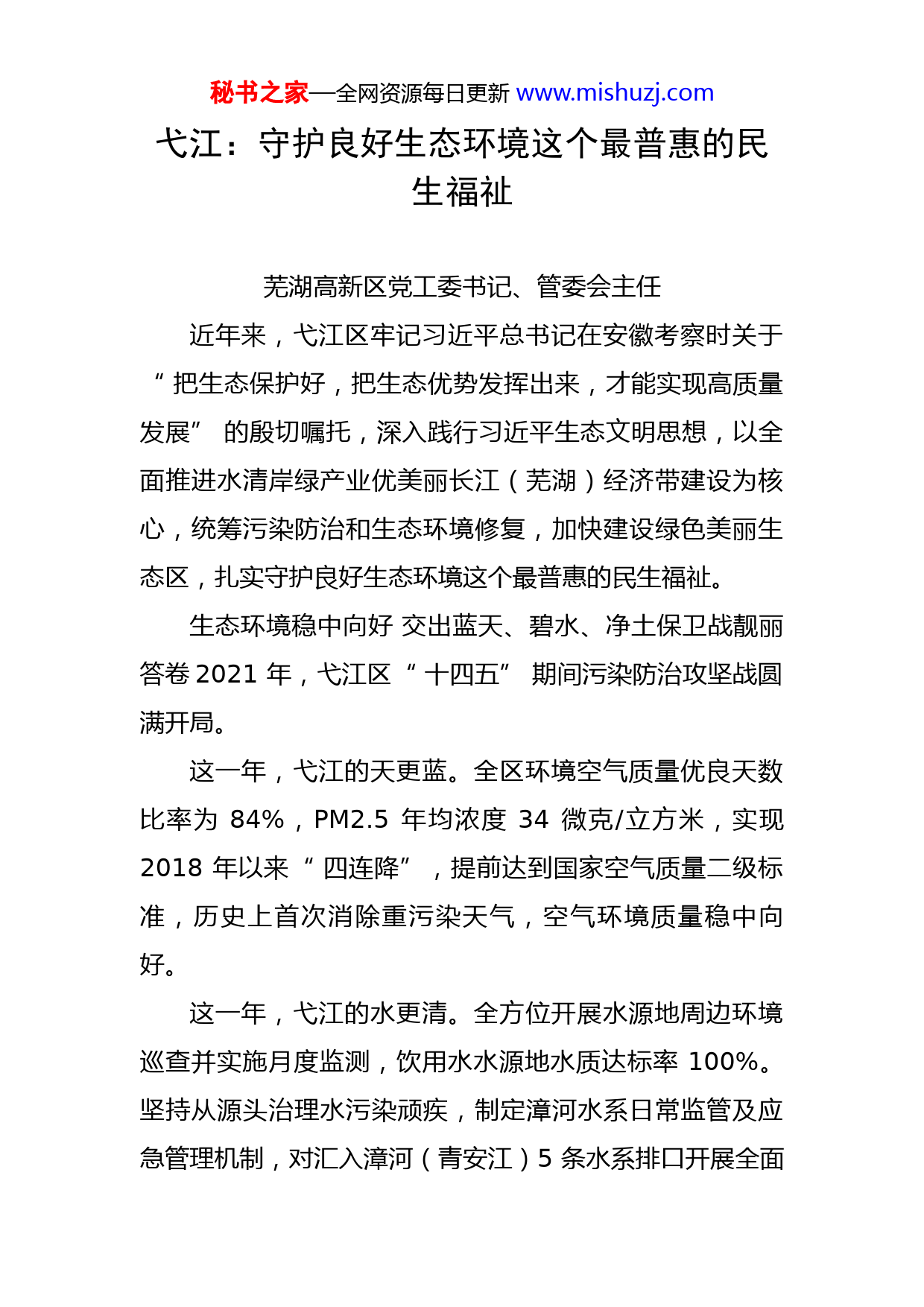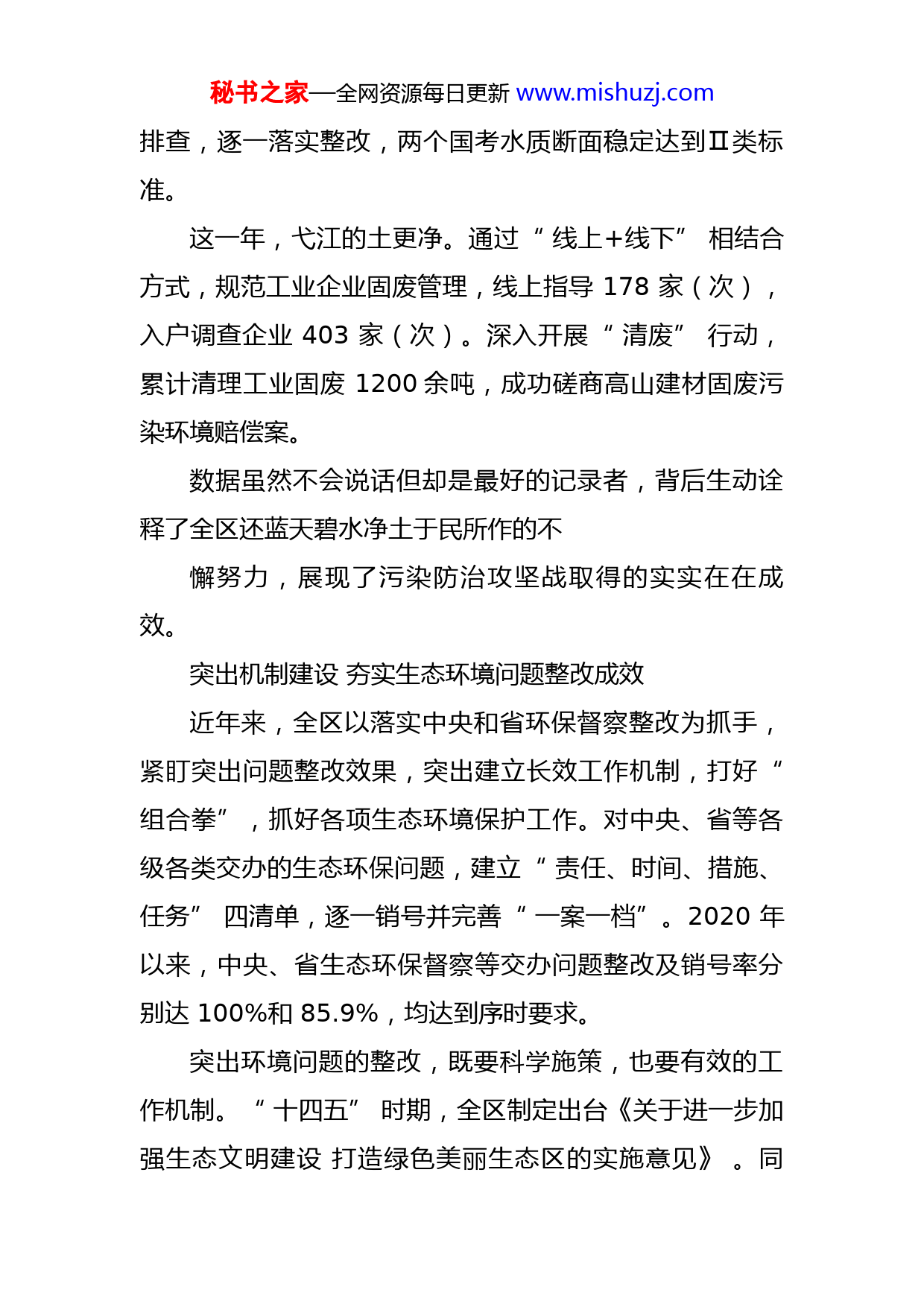 秘书之家—全网资源每日更新www.mishuzj.com弋江:守护良好生态环境这个最普惠的民生福祉芜湖高新区党工委书记、管委会主任近年来,弋江区牢记习近平总书记在安徽考察时关于“把生态保护好,把生态优势发挥出来,才能实现高质量发展”的殷切嘱托,深入践行习近平生态文明思想,以全面推进水清岸绿产业优美丽长江(芜湖)经济带建设为核心,统筹污染防治和生态环境修复,加快建设绿色美丽生态区,扎实守护良好生态环境这个最普惠的民生福祉。生态环境稳中向好交出蓝天、碧水、净土保卫战靓丽答卷2021年,弋江区“十四五”期间污染防治攻坚战圆满开局。这一年,弋江的天更蓝。全区环境空气质量优良天数比率为84%,PM2.5年均浓度34微克/立方米,实现2018年以来“四连降”,提前达到国家空气质量二级标准,历史上首次消除重污染天气,空气环境质量稳中向好。这一年,弋江的水更清。全方位开展水源地周边环境巡查并实施月度监测,饮用水水源地水质达标率100%。坚持从源头治理水污染顽疾,制定漳河水系日常监管及应急管理机制,对汇入漳河(青安江)5条水系排口开展全面秘书之家—全网资源每日更新www.mishuzj.com排查,逐一落实整改,两个国考水质断面稳定达到Ⅱ类标准。这一年,弋江的土更净。通过“线上+线下”相结合方式,规范工业企业固废管理,线上指导178家(次),入户调查企业403家(次)。深入开展“清废”行动,累计清理工业固废1200余吨,成功磋商高山建材固废污染环境赔偿案。数据虽然不会说话但却是最好的记录者,背后生动诠释了全区还蓝天碧水净土于民所作的不懈努力,展现了污染防治攻坚战取得的实实在在成效。突出机制建设夯实生态环境问题整改成效近年来,全区以落实中央和省环保督察整改为抓手,紧盯突出问题整改效果,突出建立长效工作机制,打好“组合拳”,抓好各项生态环境保护工作。对中央、省等各级各类交办的生态环保问题,建立“责任、时间、措施、任务”四清单,逐一销号并完善“一案一档”。2020年以来,中央、省生态环保督察等交办问题整改及销号率分别达100%和85.9%,均达到序时要求。突出环境问题的整改,既要科学施策,也要有效的工作机制。“十四五”时期,全区制定出台《关于进一步加强生态文明建设打造绿色美丽生态区的实施意见》。同秘书之家—全网资源每日更新www.mishuzj.com时,修订了《弋江区各街道及有关部门生态环境保护责任清单》,印发《弋江区“1+1+N”突出生态环境问题整改专项行动实施方案》和《弋江区生态环境领域风险隐患排查整治工作方案》,对2017年以来各级各类生态环境问题进行再排查、再整治,夯实突出环境问题整改成效。突出先行先试做实环境保护专项监督长制度改善生态环境质量,既要有啃硬骨头的决心,也要有扎实有效的新招,如何走出一条生态环境治理的新路径?弋江区在全市率先试点推行生态环境保护专项监督长制度,打通生态环境保护和监管“最后一公里”。谋划出台《弋江区全面推行环境专项监督长制实施方案》,坚持“管行业必须管环保、管业务必须管环保、管生产经营必须管环保”,聚焦生态环境问题多发易发的重点领域,由发改、经信、住交、农水等11个部门主要负责人担任专项行业环境监督长。做好环境保护工作,既要制度保障,也要利器加成。弋江区结合日常工作实际,打造环境监督长制信息监管平台,建立常见生态环境问题处理处置清单,做到生态环境问题及风险隐患排查整治全覆盖。完成智慧环保平台二期建设,充分整合“一库两图五网”中控系统,持续优化现有资源,进一步提升数据使用效率,实现数据浏览和生态环境分析决策交互式、可视化,更好发挥秘书之家—全网资源每日更新www.mishuzj.com信息化技术助力科学治污、精准治污。突出生态修复扎实传播生态文明理念近年来,弋江区坚持山水林田湖草系统治理,致力打造公园城区。保护和修复湖泊水生态系统,实施重要河湖水生植被恢复及生态清淤工程,深化“三湖一坝”水生态修复和综合治理效果,并启动二期项目建设。推进“三山一圩”生态修复与综合开发建设项目,加快建设白马山矿坑公园、元亩塘湿地公园,打造城市生态休闲区。谋划漳河堤岸十里江湾人民公园延伸工程,采用种植植被保护河岸、保持自然堤岸特性护岸,达到“河畅、水清、岸绿、景美”的河湖管理保护目标。生态环境需要全民参与,大众支持,广泛传播生态文明理念必不可少。全区利用政府网站、微信公众号等平台加强宣传工作,全年累计发布新闻稿150余篇,其中“今日芜湖”平台上发布近20余篇,大力宣传生态环境工作重点和先进典型。同时,深入推进结对共建,与志愿者协会、企业、社区、工商联、学校等开展志愿宣传活动,共守绿色生态。突出党建引领切实提升群众满意度、获得感围绕“一个目标、两个核心、三个原则、四项举措、打好五张牌”等内容,积极打造“山青水绿党旗红,智慧生态领先锋”品牌,从管理体制、干部队伍、党员管理、秘书之家—全网资源每日更新www.mishuzj.com硬件建设和基层服务等方面进行大胆探索实践,组织成立蓝天、碧水、净土3支党员先锋队伍,持续开展“周周有夜查、月月有重点”生态环境执法行动,严厉打击生态环境违法犯罪行为,累计检查企业1000余家(次),立案查处22起,解决问题100余个。生态环境