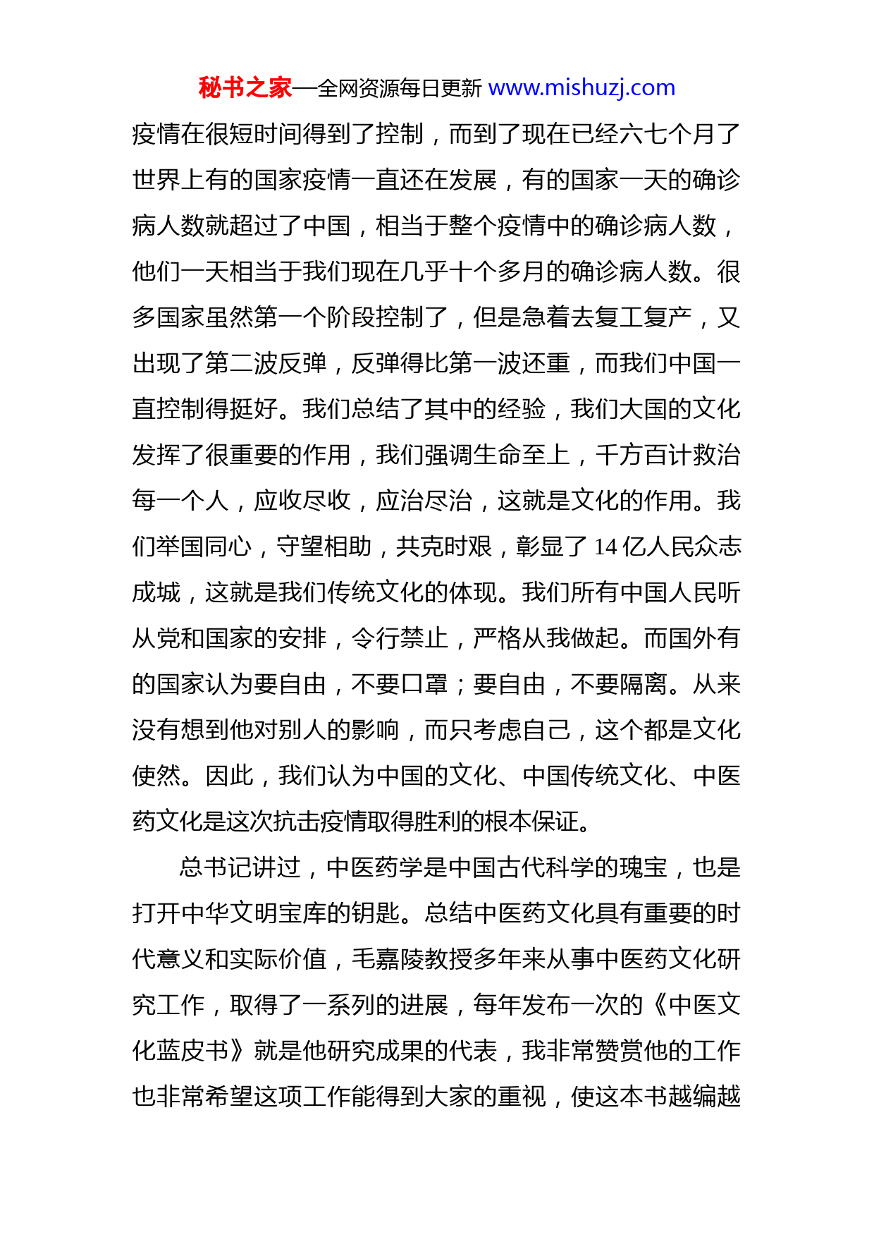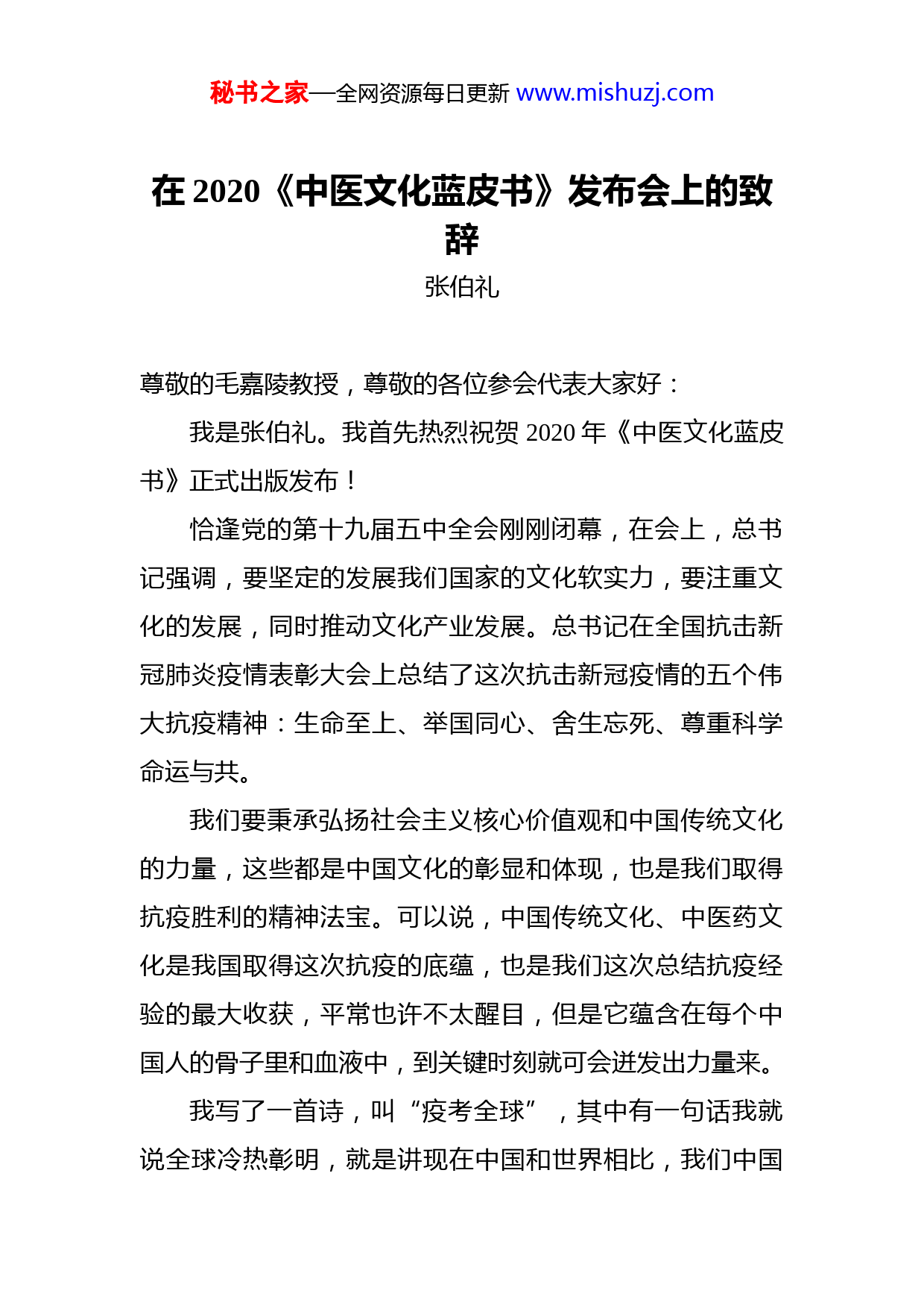 秘书之家—全网资源每日更新www.mishuzj.com在2020《中医文化蓝皮书》发布会上的致辞张伯礼尊敬的毛嘉陵教授,尊敬的各位参会代表大家好:我是张伯礼。我首先热烈祝贺2020年《中医文化蓝皮书》正式出版发布!恰逢党的第十九届五中全会刚刚闭幕,在会上,总书记强调,要坚定的发展我们国家的文化软实力,要注重文化的发展,同时推动文化产业发展。总书记在全国抗击新冠肺炎疫情表彰大会上总结了这次抗击新冠疫情的五个伟大抗疫精神:生命至上、举国同心、舍生忘死、尊重科学命运与共。我们要秉承弘扬社会主义核心价值观和中国传统文化的力量,这些都是中国文化的彰显和体现,也是我们取得抗疫胜利的精神法宝。可以说,中国传统文化、中医药文化是我国取得这次抗疫的底蕴,也是我们这次总结抗疫经验的最大收获,平常也许不太醒目,但是它蕴含在每个中国人的骨子里和血液中,到关键时刻就可会迸发出力量来。我写了一首诗,叫“疫考全球”,其中有一句话我就说全球冷热彰明,就是讲现在中国和世界相比,我们中国秘书之家—全网资源每日更新www.mishuzj.com疫情在很短时间得到了控制,而到了现在已经六七个月了世界上有的国家疫情一直还在发展,有的国家一天的确诊病人数就超过了中国,相当于整个疫情中的确诊病人数,他们一天相当于我们现在几乎十个多月的确诊病人数。很多国家虽然第一个阶段控制了,但是急着去复工复产,又出现了第二波反弹,反弹得比第一波还重,而我们中国一直控制得挺好。我们总结了其中的经验,我们大国的文化发挥了很重要的作用,我们强调生命至上,千方百计救治每一个人,应收尽收,应治尽治,这就是文化的作用。我们举国同心,守望相助,共克时艰,彰显了14亿人民众志成城,这就是我们传统文化的体现。我们所有中国人民听从党和国家的安排,令行禁止,严格从我做起。而国外有的国家认为要自由,不要口罩;要自由,不要隔离。从来没有想到他对别人的影响,而只考虑自己,这个都是文化使然。因此,我们认为中国的文化、中国传统文化、中医药文化是这次抗击疫情取得胜利的根本保证。总书记讲过,中医药学是中国古代科学的瑰宝,也是打开中华文明宝库的钥匙。总结中医药文化具有重要的时代意义和实际价值,毛嘉陵教授多年来从事中医药文化研究工作,取得了一系列的进展,每年发布一次的《中医文化蓝皮书》就是他研究成果的代表,我非常赞赏他的工作也非常希望这项工作能得到大家的重视,使这本书越编越秘书之家—全网资源每日更新www.mishuzj.com好,能够反映中医药发展的进展,能够发现中医药发展中需要解决的问题,也指引我们中医药文化研究走向正确的方向。我希望在十四五规划中,在中医药发展的下一步规划中,将中医药文化纳入进来,我想这样会更有意义。我主编的一套中医药进中小学的课本,在其序言中我提到,我们不是培养小中医,也并不一定要当中医大夫,而是要让学生养成东方思维和中医思维,这种思维至关重要,发挥东方文明的积极影响更加重要,受到很多人、很多老师、很多校长的赞同。教育部领导跟我说,这句话是核心,不是要培养中医,而是要掌握东方思维。我想,这就是中国文化和中医文化的魅力。我希望大家都来重视中医药文化研究工作,努力将它推向更新的高度。最后,我预祝大会圆满成功!祝各位代表身体健康,工作顺利,谢谢大家。